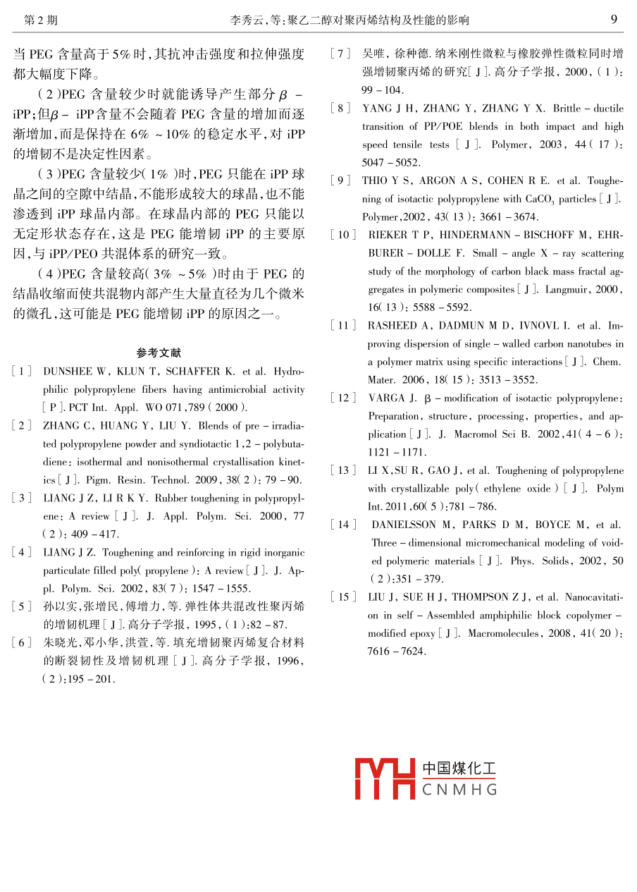 第29卷第2期科技大學(xué)學(xué)報(bào)VoL 29 No. 22014年06月Journal of Southwest University of Science and TechnologyJune 2014聚乙二醇對(duì)聚丙烯結(jié)構(gòu)及性能的影響李秀云黃潔楊莉(西南科技大學(xué)四川省非金屬?gòu)?fù)合與功能材料重點(diǎn)實(shí)驗(yàn)室-省部共建國(guó)家重點(diǎn)實(shí)驗(yàn)室培育基地四川綿陽(yáng)621010)摘要:通過(guò)熔融共混的方法將聚乙烯醇(PEG)與等規(guī)聚丙烯(iP)共混,發(fā)現(xiàn)PEG的加入能提高iP的沖擊強(qiáng)度當(dāng)PEG含量(質(zhì)量分?jǐn)?shù))低于5%時(shí),iPP/PEG共混體系的沖擊強(qiáng)度隨PEG含量的增加而逐漸增加,能達(dá)到純iP的2倍,而拉伸強(qiáng)度只有少量下降;當(dāng)PEG含量超過(guò)5%時(shí),PEG結(jié)晶度增加,其沖擊強(qiáng)度和拉伸強(qiáng)度大幅下降。PEG含量較少時(shí)就能誘導(dǎo)產(chǎn)生β-iPP,其含量一直穩(wěn)定在6%~10%的水平。當(dāng)PEG含量較低時(shí),PEG不能結(jié)晶而只能以無(wú)定形態(tài)嵌入到iP球晶內(nèi)部。當(dāng)PEG含量較高而開(kāi)始結(jié)晶時(shí),由于結(jié)晶收縮而使共混物內(nèi)部產(chǎn)生大量的微孔,這可能是引起iPP抗沖擊強(qiáng)度增加的原因。關(guān)鍵詞:等規(guī)聚丙烯聚乙烯醇結(jié)晶性能增韌中圖分類號(hào):TB332文獻(xiàn)標(biāo)志碼:A文章編號(hào):1671-8755(201402-0005-05Influence of Poly( ethylene glycol )on the Structureand Properties of Isotactic PolypropyleneLI Xiu-yun, HUANG Jie, YANG LiState Key laboratory Cultivation Base for Nonmetal Composite and Functional MaterialsSouthwest University of Science and Technology, Mianyang 621010, Sichuan, ChinaAbstract: Poly( ethylene glycol ) PEG )is used as a modifier to tailor the toughness of isotactic polypro-pylene( iPP ) When the PEG content is lower than 5%, the impact strength of iPP/PEG blends improveswith the increase of PEG content. When the PEG content is higher than 5%, the PEG phase becomescrystallized and the serious phase segregation takes place, resulting in the remarkable decrease in me-chanical properties. PEG is easy to induce B-form PP whose amount varies from 6% to 10%.PEG cannot crystallize and only be as amorphous embedded in iPP spherulites in lower content. The reason for thetoughness of iPP/PEG blends belongs to the large number of micro-porous left in the blends caused bythe crystalline contraction of PEG when the PEG content is higher and begins to crystallize.Key words: Isotactic polypropylene; Poly( ethylene glycol ) Crystallization behavior; Toughening等規(guī)聚丙烯(iPP)由于具有強(qiáng)度高、硬度高、彈方法之性好、密度小、耐熱性好等優(yōu)點(diǎn),已廣泛應(yīng)用于汽車(chē)目前,對(duì)iPP的熔融共混增韌主要包括彈性體配件、家具、家電、包裝等各種領(lǐng)域。但是,PP的增韌、無(wú)機(jī)剛性粒子增韌、橡膠-無(wú)機(jī)剛性粒子同時(shí)抗沖擊強(qiáng)度特別是室溫或者低溫抗沖擊強(qiáng)度比較改性以及添加β-成核劑改變聚丙烯晶型增韌等4低,限制了其更廣領(lǐng)域的應(yīng)用2,因此,通過(guò)各種方種2但田格成彈性體對(duì)P進(jìn)行增韌,只法對(duì)iPP進(jìn)行增韌改性是近年來(lái)研究的熱點(diǎn)。其中有中國(guó)煤化工發(fā)生脆韌轉(zhuǎn)變(BDT)熔融共混是一種簡(jiǎn)單、經(jīng)濟(jì)、有效且很容易產(chǎn)業(yè)化的而CNMH要出現(xiàn)評(píng)P的抗拉強(qiáng)收稿日期:2013-12-03基金項(xiàng)目:國(guó)家高技術(shù)研究發(fā)展計(jì)劃(863計(jì)劃,2009AA035002);西南科技大學(xué)博士研究基金項(xiàng)目(11x7146)作者簡(jiǎn)介:李秀云(1973—),男,副教授。研究方向?yàn)榉墙饘購(gòu)?fù)合材料。E-mail:lixiuyun2002@163.com6度和剛性大幅度降低8。無(wú)機(jī)剛性粒子可以同時(shí)對(duì)力學(xué)性能和結(jié)晶性能的影響及相互作用,并且與對(duì)iPP增強(qiáng)和增韌,但是無(wú)機(jī)剛性粒子粒徑太大容iPP/PEO體系進(jìn)行對(duì)比,分析不同分子量的PEO對(duì)易成為聚合物基體中的缺陷,粒徑太小容易團(tuán)聚,都iPP力學(xué)性能及結(jié)晶性能的影響。達(dá)不到改性目的,并且無(wú)機(jī)粒子與iPP相容性較差而添加量有限,對(duì)PP的改性效果不明顯1B1實(shí)驗(yàn)部分成核劑的加入可使PP由a晶型轉(zhuǎn)變?yōu)棣?晶型,B1.1主要原料晶型iPP結(jié)構(gòu)疏松,在β-晶的多孔結(jié)晶區(qū)域存等規(guī)聚丙烯(iPP),粉料,中國(guó)石油寧夏石化有在大量的連續(xù)分子鏈聯(lián)接形成的擴(kuò)展型鏈段網(wǎng)絡(luò),限公司,熔融指數(shù)8.5g/10min(230℃,2.16kg);在基體受到應(yīng)力作用時(shí)能進(jìn)行有效的應(yīng)力傳遞而消聚乙二醇(PEG),上海聯(lián)盛化工有限公司,分子量除內(nèi)應(yīng)力,同時(shí)β-晶向剛性的a-晶的轉(zhuǎn)變過(guò)程中20000g/mol,熔點(diǎn)58.2℃。也能吸收較多的能量,因此,B-晶型的P具有比1.2樣品的制備α晶型的iPP更高的抗沖擊強(qiáng)度。但是,正是由于BPP和PEG再加上其它加工助劑,按比例混合晶型的iP結(jié)構(gòu)疏松,使其抗拉強(qiáng)度和剛性也大后在雙螺桿擠岀機(jī)(TSSJ-25/32,成都晨光化工幅度降低1。采用橡膠與無(wú)機(jī)粒子同時(shí)改性iPP院)上擠出,擠出機(jī)溫度分別設(shè)定為110,160,195可以使其抗拉強(qiáng)度和抗沖擊強(qiáng)度都增加,但是受到195,195,195和190℃,螺桿轉(zhuǎn)速為120φpm。擠出無(wú)機(jī)粒子的表面狀態(tài)以及詡PP、橡膠與無(wú)機(jī)粒子之的