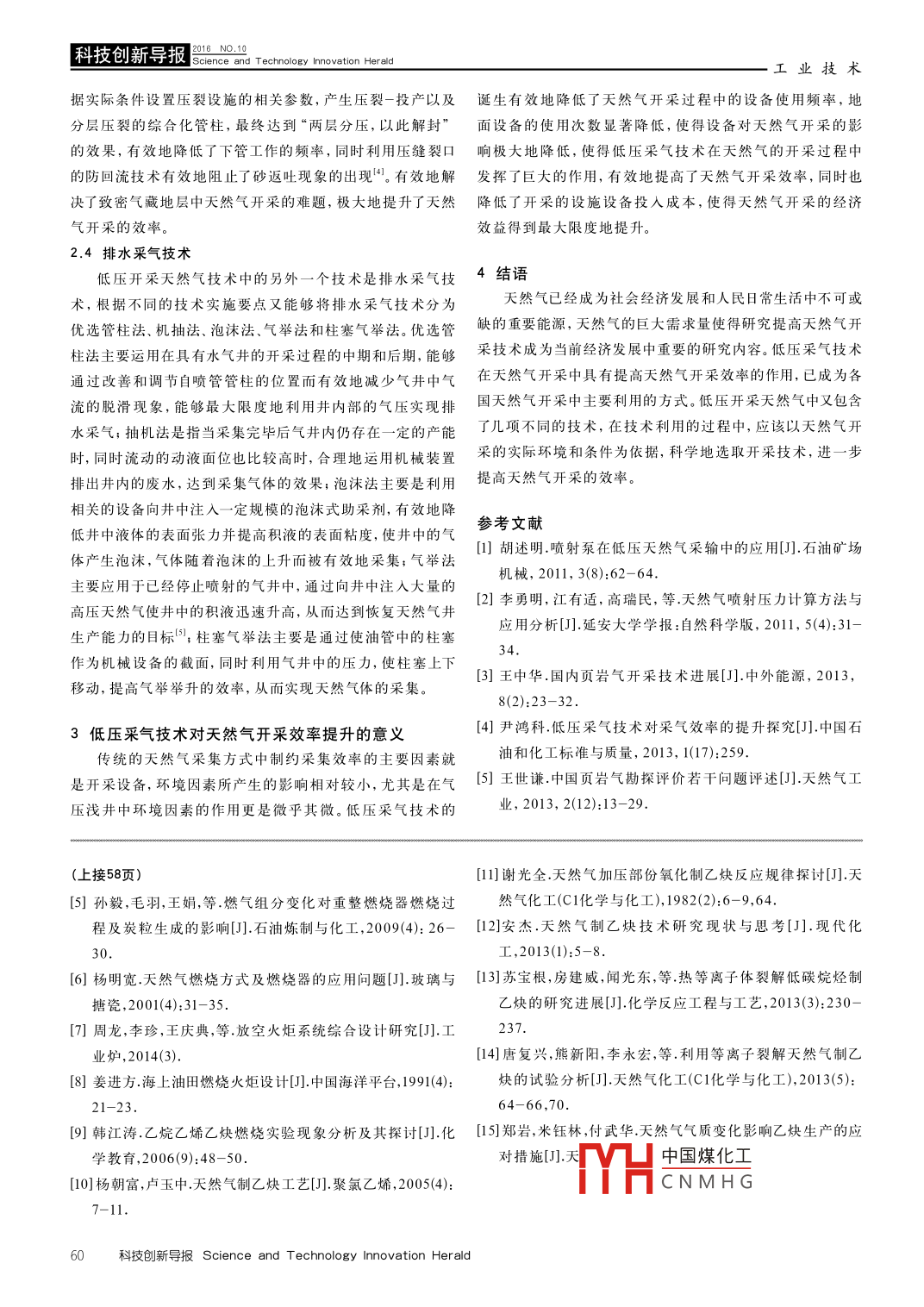 工業(yè)技術(shù)5m8re科技創(chuàng)新導(dǎo)報(bào)DOI:10.16660/j.cnki.1674-098X.2016.10.059低壓天然氣開采技術(shù)的研究胡新原(中國石油化工股份有限公司華北油氣分公司河南鄭州450006)摘要:隨著我國社會(huì)主義經(jīng)濟(jì)的快速發(fā)展以及各項(xiàng)經(jīng)濟(jì)建設(shè)事業(yè)的穩(wěn)步提升,各行業(yè)對天然氣能源的需求量也在快速地增加。因此,要滿足我國經(jīng)濟(jì)發(fā)展以及人民生活對天然氣資源的需求,必須利用現(xiàn)有技術(shù)手段,提升天然氣開采技術(shù),提高我國天然氣能源的開發(fā)效率,滿足我國經(jīng)濟(jì)發(fā)展以及人民生活當(dāng)中多天然氣能源的巨大需求。因而,研究分析低壓采氣技術(shù)在天然氣開采中的應(yīng)用具有重要的經(jīng)濟(jì)意義和現(xiàn)實(shí)意義關(guān)鍵詞:低壓采氣技術(shù)天然氣開采利用方法中圖分類號(hào):TE377文獻(xiàn)標(biāo)識(shí)碼:A文章編號(hào):1674-098X(2016)04(a)-0059-02隨著我國人口壓力的增大和對各種自然資源需求量的2低壓采氣技術(shù)在天然氣開采中的利用不斷上漲,積極硏究新的技術(shù)方法提高我國自然資源的開2.1低壓井噴射引流術(shù)采利用率具有重要的經(jīng)濟(jì)意義和現(xiàn)實(shí)意義。進(jìn)入21世紀(jì)以低壓采氣技術(shù)在天然氣開采中應(yīng)用的主要方式包括低來,隨著人們環(huán)保意識(shí)的不斷增強(qiáng),世界各國紛紛探尋開采壓井噴射引流術(shù),主要是指在天然氣開采過程中,利用高氣和利用新型能源的技術(shù)。天然氣在利用的過程中排放的污壓井中的能量來提高天然氣低氣壓井中的動(dòng)力,使得天然氣染氣體少,對環(huán)境產(chǎn)生的污染較小,因此成為世界各國爭相能夠在不需要借助外力的情況下實(shí)現(xiàn)自動(dòng)采集的開采方式硏究和利用的能源新方向。天然氣在取代煤炭、汽油等傳其主要的技術(shù)原理是利用從高壓井中噴出的高壓氣流在混統(tǒng)的能源中,被長期的實(shí)踐證明具有很高的可行性。因此研合腔中經(jīng)過低壓區(qū)時(shí)實(shí)現(xiàn)物理混壓,之后流向擴(kuò)壓段,當(dāng)壓究天然氣的開采技術(shù),提高天然氣開采效率具有重要的意力升高到一定程度使實(shí)現(xiàn)天然氣的外輸。這種開采技術(shù)的本質(zhì)是利用高壓氣井中的自然高壓來推動(dòng)低壓井中壓力的提高,最終實(shí)現(xiàn)天然氣外輸。該技術(shù)具有設(shè)備裝置小巧、應(yīng)低壓采氣技術(shù)概述用便捷、經(jīng)濟(jì)成本低等優(yōu)勢。同時(shí)該技術(shù)還提供多級(jí)的噴射1.1低壓采氣技術(shù)概念引流,防止一次噴射引流不能發(fā)揮增強(qiáng)壓力的作用時(shí),實(shí)現(xiàn)低壓采氣技術(shù)是針對天然氣、煤氣等天然氣體的埋藏特增壓采氣。點(diǎn)而設(shè)計(jì)研究的新型能源開采方式。天然氣和煤氣在自然環(huán)2.2水平井改造技術(shù)境中埋藏的深度較淺,因而其內(nèi)部氣壓較低,采用傳統(tǒng)的開改造水平井能夠達(dá)到提升天然氣開采效率的目的。天然采方式不能有效地進(jìn)行開采造成天然氣等能源的浪費(fèi),低氣的埋藏環(huán)境各有不同,因此在實(shí)際的開采過程中必須分析壓采氣技術(shù)針對天然氣儲(chǔ)藏的這一特點(diǎn),分析氣體埋藏越天然氣分布的具體環(huán)境來針對性地選取有效的開采方式淺氣體壓力越小的自然規(guī)律后,利用不同的技術(shù)手段增加氣達(dá)到提高開采效率的目的。水平井改造技術(shù)是在長期的天體壓力,使天然氣能夠順利地被采集,并且自采集的過程中然氣開采實(shí)踐中總結(jié)并研發(fā)的高效天然氣開采技術(shù)。水平能夠在最大限度內(nèi)降低開采的成本并提高采集效率,極大井改造技術(shù)綜合分析了天然氣分布環(huán)境中的地形、水位等條地增加了天然氣能源利用的經(jīng)濟(jì)效率。件,實(shí)現(xiàn)了天然氣開采效率的有效提升1.2低壓采氣技術(shù)特點(diǎn)2.3致密低壓氣藏壓裂改造技術(shù)低壓采氣技術(shù)是依據(jù)天然氣儲(chǔ)藏的低壓特點(diǎn)而設(shè)計(jì)的天然氣的儲(chǔ)藏環(huán)境中存在一種比較惡劣的環(huán)境條高效開采方式,在具體的開采利用過程中通常會(huì)根據(jù)所使件—致密氣藏地層,在該儲(chǔ)藏環(huán)境中,天然氣的氣壓層壓用的具體環(huán)境不同而采用不同的開采方式,實(shí)現(xiàn)增壓和氣體力十分低,壓裂的改造難度非常大,同時(shí)儲(chǔ)氣層的物性十分采集的目標(biāo)。具體來說就是增加低壓井中的壓力,使低壓井差,在氣壓層壓裂之后存在著嚴(yán)重的砂返吐現(xiàn)象,因此只能中的天然氣能夠快速地?cái)D壓到地面上天然氣收集裝置中,因通過衰竭式的開中國煤化工造成了嚴(yán)重的破此能夠有效地節(jié)約天然氣抽取設(shè)備,進(jìn)而達(dá)到提高開采效壞。通過應(yīng)用致CNMH夠有效地抵消率并且降低開采成本的目標(biāo)這些不利因素的影響,首先選擇合理的泡沫壓裂液系統(tǒng),依科技創(chuàng)新導(dǎo)報(bào) Science and Technology Innovation Herald科技創(chuàng)新導(dǎo)報(bào)=rmmm-工業(yè)技術(shù)據(jù)實(shí)際條件設(shè)置壓裂設(shè)施的相關(guān)參數(shù),產(chǎn)生壓裂一投產(chǎn)以及誕生有效地降低了天然氣開采過程中的設(shè)