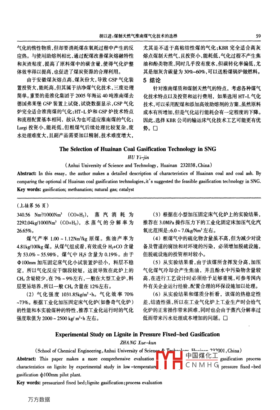 第36卷,第3期安徽化工Vol.36,No.32010年6月ANHUI CHEMICAL INDUSTRYJug.2010煤制天然氣淮南煤氣化技術(shù)的選擇胡以進(jìn)(安徽理工大學(xué),安徽淮南232038)摘要:主要介紹了淮南煤和煤灰的特性,通過(guò)煤氣化技術(shù)比較,選擇煤制天然氣方案中適合淮南煤的氣化技術(shù)。關(guān)鍵詞:氣化;甲烷化;天然氣;催化劑中團(tuán)分類號(hào): TQ546文獻(xiàn)標(biāo)識(shí)碼:B 文章編號(hào):1008 -53X(2010)03 -0057-031淮南煤的特性~ 3%之間;堿性氧化物含量較低,Fe03、CaO含量一般淮南煤田位于華北板塊的南緣,東起郯廬斷裂,西低于5%,Mg0低于1%?;茨厦褐兄饕w礦物有高嶺至麻城阜陽(yáng)斷層,北接蚌埠隆起,南以老人倉(cāng)一壽縣斷石、石英方解石、黃鐵礦等,煤灰中主要晶體礦物有石層與合肥中生代凹陷相鄰。東西長(zhǎng)180km,南北寬15~英硬石膏赤鐵礦等,因而淮南煤的灰熔點(diǎn)(T)普遍較25 km,面積約3200 km2。高(大多數(shù)高于1500C)?;茨系V區(qū)煤的水分在0.8%-~3%,空氣千燥基灰分的2煤制天然氣的技術(shù)特點(diǎn)范圍在7% -38%之間,有利于氣化,碳轉(zhuǎn)化率高,大多數(shù)淮由于合成甲烷要求合成氣中的H/CO為3: 1,且南礦區(qū)煤的揮發(fā)分都很高,在26%- 40%(daf)之間,淮南天然氣中甲烷的含量大于95%,因此煤氣化產(chǎn)生的工藝煤的發(fā)熱量- -般在20~28 MJ.kg-'之間。氣中含有的甲烷也可以被認(rèn)為是有效氣。天然氣的質(zhì)量淮南煤灰中富含SiO2和Al20(> >75%),部分樣品指標(biāo)見(jiàn)表1。Si02和Al2O3含量高達(dá)90%以上;Ti02平均含量在1%表1天然氣國(guó)家質(zhì)標(biāo)準(zhǔn)(GB17820-1999)項(xiàng)目一類高熱值(MU/m)>31.4總硫(以硫計(jì),mg/m)≤100硫化氡(mgm2)≤6二氧化碳(體積,%)≤3水露點(diǎn)(C)在天然氣交接點(diǎn)的壓力和溫度條件下,比最低環(huán)境溫度低5T3煤氣化技術(shù)比較GSP氣化工藝商業(yè)化裝置的最大能力為處理煤煤氣化技術(shù)種類繁多,本文僅介紹適應(yīng)高灰熔點(diǎn)煤720噸1天;神華寧煤煤制烯烴項(xiàng)目的2000/d氣化爐預(yù)氣化特點(diǎn)的煤氣化技術(shù)。計(jì)2010年10月投料開(kāi)車;山西蘭花的化肥項(xiàng)目計(jì)劃3.1 GSP氣化工藝2011年開(kāi)車。GSP粉煤加壓氣化技術(shù)由德國(guó)未來(lái)能源公司開(kāi)發(fā),3.2 HT-L氣化工藝它既有Texaco氣化工藝的特點(diǎn),又有Shell氣化工藝的航天HT-L干煤粉加壓氣化技術(shù)由中國(guó)航天科技特點(diǎn),是水煤漿加壓氣化和Shell粉煤氣化的優(yōu)化組合。集團(tuán)公司下屬的北京航天萬(wàn)源煤化工工程技術(shù)有限公該工藝于20世紀(jì)70年代開(kāi)始研究,1979年建成了司開(kāi)發(fā)。它是吸收國(guó)際上最先進(jìn)的殼牌德士古和德國(guó)3MW和5MW的發(fā)電機(jī)組,1984年在黑水泵建成了CSP爐型的優(yōu)點(diǎn),并結(jié)合國(guó)內(nèi)實(shí)際情況研制而成的具有130MW的發(fā)電機(jī)組,并聯(lián)產(chǎn)10萬(wàn)噸/年甲醇,運(yùn)行穩(wěn)自主知識(shí)產(chǎn)權(quán)的新型干煤粉加壓氣化技術(shù)。定可靠。中國(guó)煤化工及關(guān)鍵閥門等都基fYHCNMHG收稿口期:2010-03-30作者簡(jiǎn)介:胡以進(jìn)( 1970-),男.畢業(yè)于鄭州工業(yè)大學(xué),高級(jí)工程師,安徽理工大學(xué)工程碩士在讀.目前從事化工技術(shù)管理工作,0554 6875863,5330768,13155452162.huyjin2182@163.com。58總第165期2010年第3期(第36卷)安徽化工本實(shí)現(xiàn)國(guó)產(chǎn)化,因而相對(duì)GSP而言投資較低。目前已經(jīng)目前國(guó)內(nèi)廣“東天明電廠已經(jīng)引用該氣化技術(shù)用于開(kāi)車的項(xiàng)目有安徽臨泉化工股份有限公司年產(chǎn)20萬(wàn)噸IGCC發(fā)電項(xiàng)目,該項(xiàng)目由五環(huán)工程公司設(shè)計(jì),單爐投煤甲醇裝置和濮陽(yáng)龍宇化T年產(chǎn)20萬(wàn)噸甲醇裝置。量為2000噸1天(印尼褐煤),計(jì)劃2011年底開(kāi)車。3.3 KBR公司的TRIGM氣化工藝3.4魯奇氣化工藝KBR公司的TRICM氣化技術(shù)在20世紀(jì)90年代由魯奇加壓氣化技術(shù)具有可以使用劣質(zhì)煤氣化且氧美國(guó)能源部資助,由KBR公司和美國(guó)南方電力公司合耗量低等優(yōu)點(diǎn),我國(guó)的原哈爾濱氣化廠、山西化肥廠、義作開(kāi)發(fā),1995年日投煤量為50噸的示范裝置建成運(yùn)氣化廠和云解化等多家企業(yè)使用魯奇氣化技術(shù)。行。輸運(yùn)床氣化( Transport Bed Gasification)是KBR公司煤在較低的溫度下氣化,要求煤具有較弱的粘結(jié)目前推出的煤氣化技術(shù),是在流化床基礎(chǔ)上發(fā)展的一-種性,煤氣中的CH4含量較高;但該工藝產(chǎn)生的高濃度廢新氣化工藝,更確切的說(shuō)是一種改進(jìn)的循環(huán)流化床氣化水水質(zhì)非常復(fù)雜,含有大量酚、氨.CO2、脂肪酸焦油、酮工藝。與傳統(tǒng)循環(huán)流化床技術(shù)相比,輸運(yùn)床氣化的顯著類和胺類等污染物,以目前的處理流程和工藝難以實(shí)現(xiàn)特點(diǎn)是高循環(huán)比率、高氣速和高固氣比,這種氣化方式達(dá)標(biāo)排放。但是由于本項(xiàng)目立足于淮南煤氣化,而淮南的優(yōu)點(diǎn)是生產(chǎn)強(qiáng)度高,床內(nèi)氣固混合均勻,氣固傳熱好,煤的粘結(jié)性較強(qiáng) ,因此采用魯奇氣化爐需要進(jìn)行煤種試較適合于ICCC及多聯(lián)產(chǎn)系統(tǒng)。燒。表2可選用的煤氣化技術(shù)對(duì)比一氣化技術(shù)GSPHT-I.KB