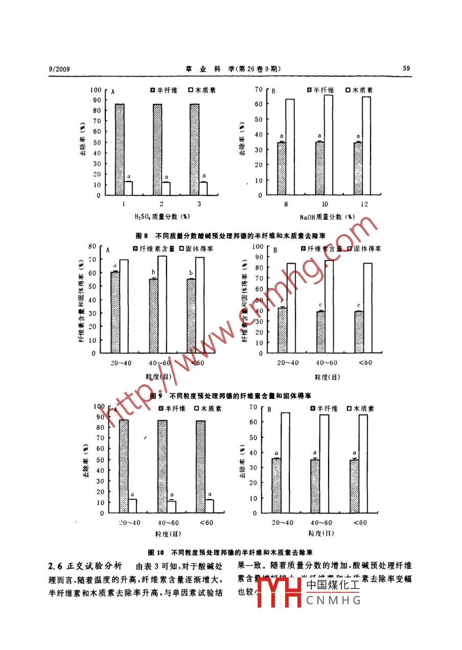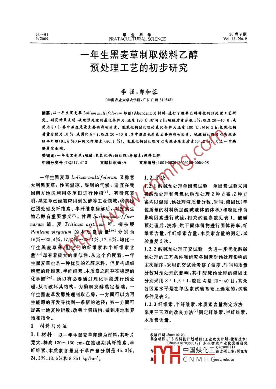 54-61草業(yè)科學(xué)26巷9期9/2009PRATACULTURAL SCIENCEVol 26. No. 9年生黑麥草制取燃料乙醇預(yù)處理工藝的初步研究李強(qiáng),郭和蓉(華南農(nóng)業(yè)大學(xué)農(nóng)學(xué)院,廣東廣州510642)摘要:以一年生黑麥草 Lolium multi florum邦德( Abundant)為材料,進(jìn)行了燃料乙醇特化的預(yù)處理工藝研究。研究結(jié)果表明,硫酸預(yù)處理的最優(yōu)條件為:溫度120℃,時(shí)間2h,硫酸質(zhì)量分?jǐn)?shù)1%粒度20~40目,液圃比8:1其中溫度是最主要的影響因素,氧化鈉預(yù)處理的最優(yōu)條件為溫度100℃,時(shí)間2h氫氧化鈉質(zhì)量分?jǐn)?shù)為10%液因比6:1,粒度20~40目,其中溫度也是最主要的彩響因素,硫酸預(yù)處理可以有效去除半纖維(91.6%)和純化纖維素(60.1%)。氪氧化鈉預(yù)處理可以有效去除木質(zhì)素(64.2%),為進(jìn)一步酶解奠定基礎(chǔ)關(guān)鍵詞:一年生黑麥草;硫酸;氧化鈉;預(yù)處理;纖維素;燃料乙醇中圖分類號(hào):TQ517.4·3文獻(xiàn)標(biāo)識(shí)碼:A文章編號(hào):1001-0629(2009)09005408年生黑麥草 Lolium multiflorum又稱意1.2方法大利黑麥草,性喜溫涼、濕潤(rùn)的氣候,適宜在我1.2.1酸堿預(yù)處理單因素試驗(yàn)單因素試驗(yàn)采用國(guó)南方地區(qū)利用冬閑田進(jìn)行種植口,有研究表硫酸預(yù)處理和氫氧化鈉預(yù)處理2種方案,2種方明,黑麥草已經(jīng)被應(yīng)用到發(fā)酵等工業(yè)領(lǐng)域,將其經(jīng)案均以溫度、預(yù)處理液質(zhì)量分?jǐn)?shù)、時(shí)間、液固比(單過預(yù)處理及纖維素、半纖維素酶解后,對(duì)探索生位質(zhì)量的材料所加酸堿液體的體積)和粒度作為物乙醇有重要意義(2.甘蔗 Saccharum office-影響因素進(jìn)行試驗(yàn),相關(guān)試驗(yàn)參數(shù)見表1.酸堿arwm渣、麥 Triticum aestivum稈、柳枝稷預(yù)處理后,洗滌、烘干固體得物進(jìn)行固體得率、纖Panicum virgatum的木質(zhì)素含量0分別為維素含量、半纖維素含量、木質(zhì)素含量的測(cè)定,試16%~264%、17.7%-234%、17.6%,均比一驗(yàn)重復(fù)2次年生黑麥草高但它們的纖維素和半纖維素含1.2.2酸堿預(yù)處理正交試驗(yàn)為進(jìn)一步優(yōu)化酸堿量4卻有著極大的相似性,從這個(gè)角度看,一年預(yù)處理的工藝條件和研究各因素對(duì)預(yù)處理影響的生黑麥草也是一種優(yōu)質(zhì)的乙醇原料。但是構(gòu)成細(xì)主次順序,采用正交試驗(yàn)考察了溫度時(shí)間和質(zhì)量胞壁的纖維素半纖維素、木質(zhì)素之間存在穩(wěn)定的分?jǐn)?shù)對(duì)預(yù)處理的影響其中酸堿預(yù)處理的液固比化學(xué)鍵0,所以有必要通過理化手段進(jìn)行預(yù)處分別采用8:1,6:1,粒度均是20~40目,其余理,從而破壞其結(jié)構(gòu),為酶解發(fā)酵奠定基礎(chǔ)各因素水平是在單因素試驗(yàn)基礎(chǔ)上選定的,試驗(yàn)?zāi)晟邴湶莅l(fā)酵處理制取乙醇,一方面可以為再條件見表2生能源的開發(fā)尋找到一條新的途徑;另一方面可1.2.3纖維素、半纖維素、木質(zhì)素含量測(cè)定方法提高土地復(fù)種指數(shù),改善土壤結(jié)構(gòu),做到用地和養(yǎng)采用王玉萬(wàn)的改良方法測(cè)定纖維素、半纖維素地相結(jié)合。木質(zhì)素含量材料與方法1.1材料以一年生黑麥草邦德為材料,其葉片稿日期:200902-23金項(xiàng)目;廣東省科技計(jì)劃項(xiàng)目(工業(yè)攻關(guān)計(jì)劃能源技術(shù))寬大,株高120~130cm,在抽穗期其纖維素、半(2006A10703003);廣東生物質(zhì)產(chǎn)業(yè)化發(fā)展研纖維素、木質(zhì)素含量及干草產(chǎn)量分別是45.3%B07090011)在讀碩土生,研究方24.3%、13.6%和8251kg/hrCYHCN MET9/2009草業(yè)科學(xué)(第26卷9期)表1酸堿預(yù)處理單因素試驗(yàn)設(shè)計(jì)硫酸預(yù)處理氫氧化鈉預(yù)處理項(xiàng)目溫度質(zhì)量分?jǐn)?shù)時(shí)間粒度溫度質(zhì)量分?jǐn)?shù)時(shí)間粒度液固比℃)(%)(h)液固比目)℃)(%)(h)801.020~4060102.020~40溫度處理100111110120~408:1102.020~40002.20~40質(zhì)量分?jǐn)?shù)1201.020~40102.020~40處理時(shí)間處理2031111.520~40100102.02.020~4000102.520~406:11001020~40液固比12020~40:100102.01201.010:120~401020~401.08:120~40100102.020~40粒度處理8100108:1100106:1表2酸堿預(yù)處理正交試驗(yàn)設(shè)計(jì)2結(jié)果與分析硫酸預(yù)處理氫氧化鈉預(yù)處理2.1預(yù)處理溫度的影響溫度是影響化學(xué)反試驗(yàn)序號(hào)溫度質(zhì)量分?jǐn)?shù)時(shí)間溫度質(zhì)量分?jǐn)?shù)時(shí)間應(yīng)速率的一個(gè)重要因素。固體得率表示預(yù)處理后(℃)(%)(h)(℃)(%)(h剩余固體殘?jiān)c原料絕干質(zhì)量的比值。固體得率1.5越低,表明處理過程中被溶解部分越多,相應(yīng)的固體殘?jiān)欣w維素含量也越高。相關(guān)性分析表明,60102.038032.060122.5固體得率和纖維素含量為負(fù)相關(guān)(r=-0.85~0.98)。圖1表明,對(duì)于酸堿處理而言,固體得80101.5率均隨處理溫度的升高呈逐漸降低的趨勢(shì),而纖維素含量則呈逐漸上升的趨勢(shì)。這是由于隨著溫12.08082.5度的升高,原料被溶出的部分增加,使得固體得率降低,纖維素相對(duì)被純化。酸預(yù)處理固體得率(69.9%~83.2%)均較堿預(yù)處理(83.912022.0100102.587.6%)低,而酸處理纖維素含量(49.6%~1.2.4數(shù)據(jù)處理和計(jì)算公式釆用SAS8.1和60.1%)則較堿處理(36.2%~42.1%)高Excel2003進(jìn)行統(tǒng)計(jì)分析由圖2可知隨著溫度的升高,酸堿預(yù)處理的