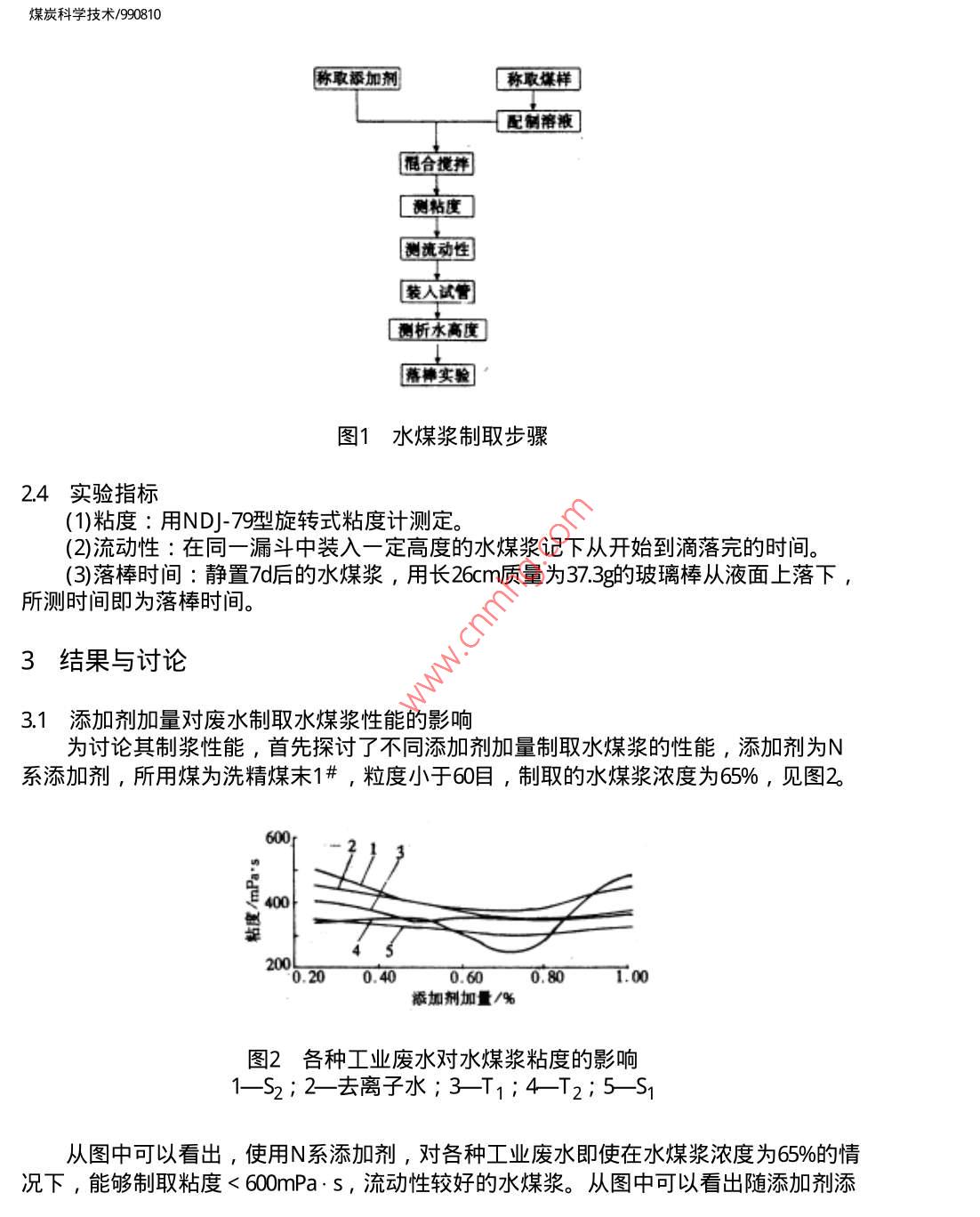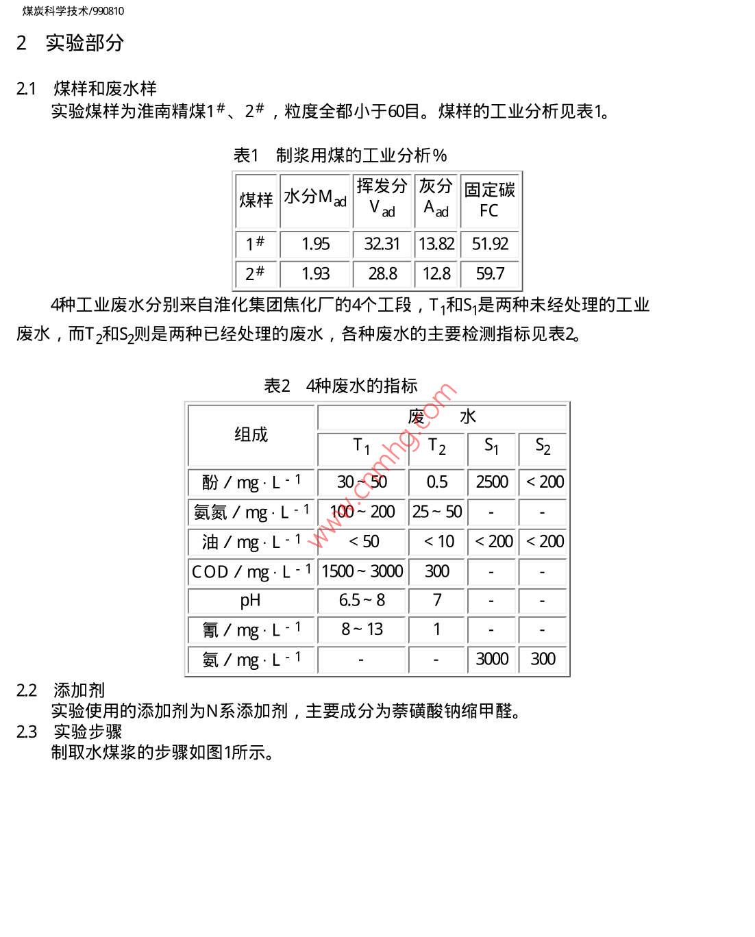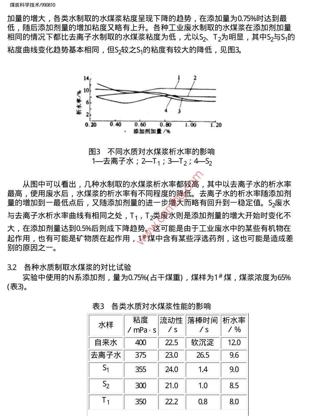 煤炭科學(xué)技術(shù)/990810煤炭科學(xué)技術(shù)舊萬巧數(shù)據(jù)資源系統(tǒng)COAL SCIENCEAND TECHNOLOGY數(shù)化期刊WANFANG DATA CHINAINFo)1999年第27卷第8期Vol,27No81999DIGITIZED PERIODICAL焦化廠工業(yè)廢水對水煤漿性能的影響李寒旭李輝帥應(yīng)泉李軍摘要對蒸餾水、去離子水、自來水和淮化集團焦化廠4種工業(yè)廢水制取水煤漿的性能進行了探討,得出水質(zhì)是影響水煤漿性能的一個不可忽略的因素,所選的工業(yè)廢水可以制岀性能較好的水煤漿,特別是在穩(wěn)定性方面比去離子水和自來水還好。關(guān)鍵詞水煤漿工業(yè)廢水水質(zhì)Industrial Waste Water from Coking PlantAffected to Features of Coal Water MixtureThis paper has discussion on distilled water, ion removing water, tap water andindustrial waste water from coking plant affected to the features of coal water mixture. Theresults shown that a water quality is a disneglected factor affected to the features of caolwater mixture. The industrial waste water from the coking plant can prepare coal watermixture with good features, especially the stability better than ion removing water and tapwater概論為了提高水煤漿的性能,研究人員對不同煤種的濃度、粒度、添加劑進行了探討,且得岀了好的制漿條件。隨著工業(yè)的發(fā)展,工業(yè)對環(huán)境造成的污染已漸漸成為影響人們生活質(zhì)量的重要因素之一。工業(yè)污染中很重要一項就是水質(zhì)污染,這些污染大部分是由于工業(yè)廢水未加處理排放的結(jié)果。工業(yè)廢水的處理增加了生產(chǎn)成本,降低了生產(chǎn)效益。如果用工業(yè)廢水能制取性能良好的水煤漿則既可以減少環(huán)境污染又可以增加制造水煤漿用水來源,具有良好的社會效益和經(jīng)濟效益。雖然人們對水煤漿進行了廣泛研究,但是專門研究水質(zhì)影響的文章不多,因為水煤漿是由大約7%煤某、29%水和1%左右的添加劑制備的煤、固液分散體系,其中2%6的水是影響水煤漿性能的不可忽略的因素。大多數(shù)專家對水煤漿研究是在蒸餾水或去離子水存在的條件下進行的,而實際生產(chǎn)中不可能用如此多的蒸餾水和去離子水來制備水煤漿。水有地表水、地下水、工業(yè)廢水等各種水質(zhì),這些水含有的離子不同、膠體含量不同、水的硬度不同、pH值不同,研究各種水質(zhì)對水煤漿性能的影響可以為工業(yè)應(yīng)用尋找合適的水源。工業(yè)廢水種類繁多,本文著重研究了淮化集團公司焦化廠的4種工業(yè)廢水對水煤漿性能的影響。煤炭科學(xué)技術(shù)/9908102實驗部分2.1煤樣和廢水樣實驗煤樣為淮南精煤1#、2#,粒度全都小于60目。煤樣的工業(yè)分析見表1。表1制漿用煤的工業(yè)分析%揮發(fā)分灰分固定碳煤樣水分 Madvad aafC1#19532.3113825192219328812859.74種工業(yè)廢水分別來自淮化集團焦化廠的4個工段,T1和S1是兩種未經(jīng)處理的工業(yè)廢水,而T2和S2則是兩種已經(jīng)處理的廢水,各種廢水的主要檢測指標見表2表24種廢水的指標廢水組成T酚/mg:L130-50052500<200氨氮/mg:L100~20025~50油/mg·L-1<50<10<200<200COD/mg:L-11500-300030065-87氰/mg:L18-13「氨/mgL-130003002.2添加劑實驗使用的添加劑為N系添加劑,主要成分為萘磺酸鈉縮甲醛。2.3實驗步驟制取水煤漿的步驟如圖1所示。煤炭科學(xué)技術(shù)/990810稱取加劑稱取煤樣制溶液混合攪摔測粘測流動性裝人試管測析水高度落實驗圖1水煤漿制取步驟24實驗指標(1)粘度:用ND-79型旋轉(zhuǎn)式粘度計測定。(2)流動性:在同一漏斗中裝入一定高度的水煤漿記下從開始到滴落完的時間。3)落棒時間∶靜置兀后的水煤漿,用長26τm質(zhì)量為373g的玻璃棒從液面上落下,所測時間即為落棒時間。3結(jié)果與討論3.1添加劑加量對廢水制取水煤漿性能的影響為討論其制漿性能,首先探討了不同添加劑加量制取水煤漿的性能,添加劑為N系添加劑,所用煤為洗精煤末1#,粒度小于60目,制取的水煤漿濃度為65%,見圖2。6004000.200.400.600:801:00添加劑加量/%圖2各種工業(yè)廢水對水煤漿粘度的影響2—去離子水;3T1;4從圖中可以看出,使用N系添加劑,對各種工業(yè)廢水即使在水煤漿濃度為65%的情況下,能夠制取粘度<600mPa·s,流動性較好的水煤漿。從圖中可以看出隨添加劑添煤炭科學(xué)技術(shù)/990810加量的增大,各類水制取的水煤漿粘度呈現(xiàn)下降的趨勢,在添加量為0.巧5%時達到最低,隨后添加劑量的增加粘度又略有上升。各種工業(yè)廢水制取的水煤漿在添加劑加量相同的情況下都比去離子水制取的水煤漿粘度為低,尤以S2T2為明顯,其中S2與S的粘度曲線變化趨勢基本相同,但S2較之S的粘度有較大的降低,見圖3100.200400.600.80101:20添加劑加量/%圖3不同水質(zhì)對水煤漿析水率的影響1—去離子水;2-T1;3-T2:4S2從圖中可以看出,幾種水制取的水煤漿析水率都較高,其中以去離子水的析水率最高,使用廢水后,水煤漿的析水率有不同程度的降低。去離子水的析水率隨添加劑量的增加到一最低點后,又隨添加劑量的進一步增大而略有回升到一穩(wěn)定值。S2廢水與去離子水析水率曲線有相同之處,T1,T2類廢水則是添加劑量的增大開始時變化不大,在添加劑量達到0.5%后則成下降趨勢。這可能是由于工業(yè)廢水中的某些有機物在起作用,也有可能是礦物質(zhì)在起作用,1#煤中含有某些浮選藥劑,這也可能是造成差別的原因之一。3.2各種水質(zhì)制取水煤漿的對比試驗實驗中使用的N系