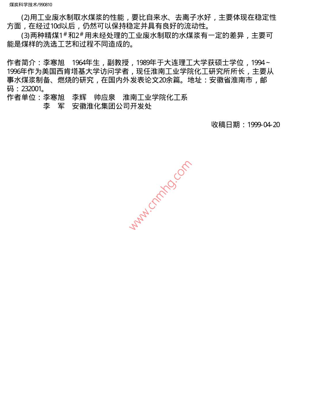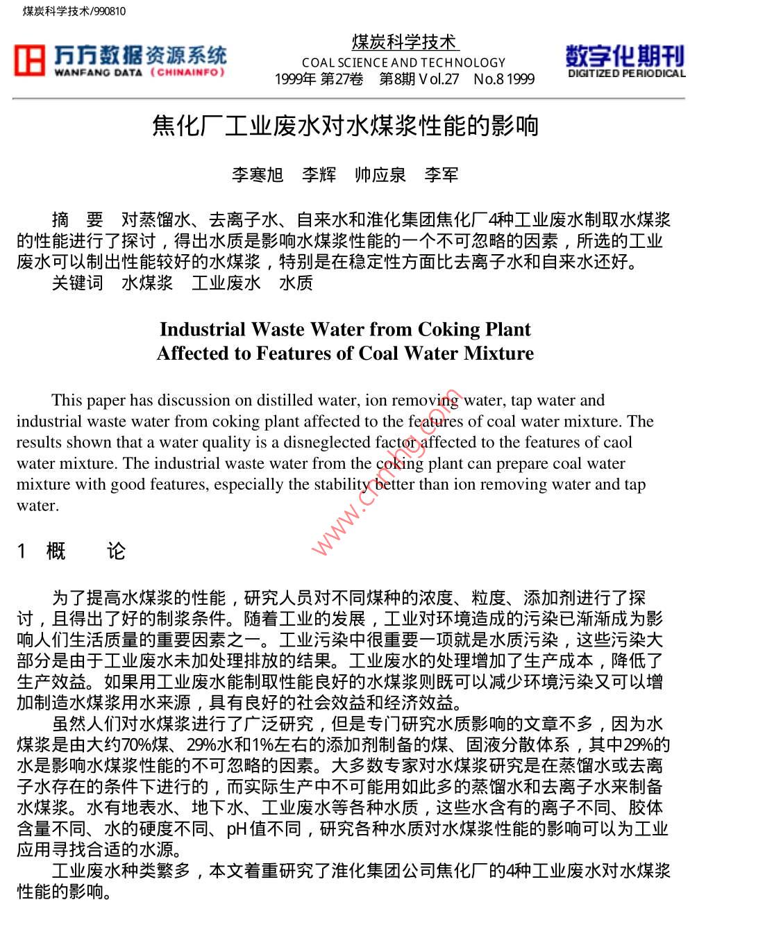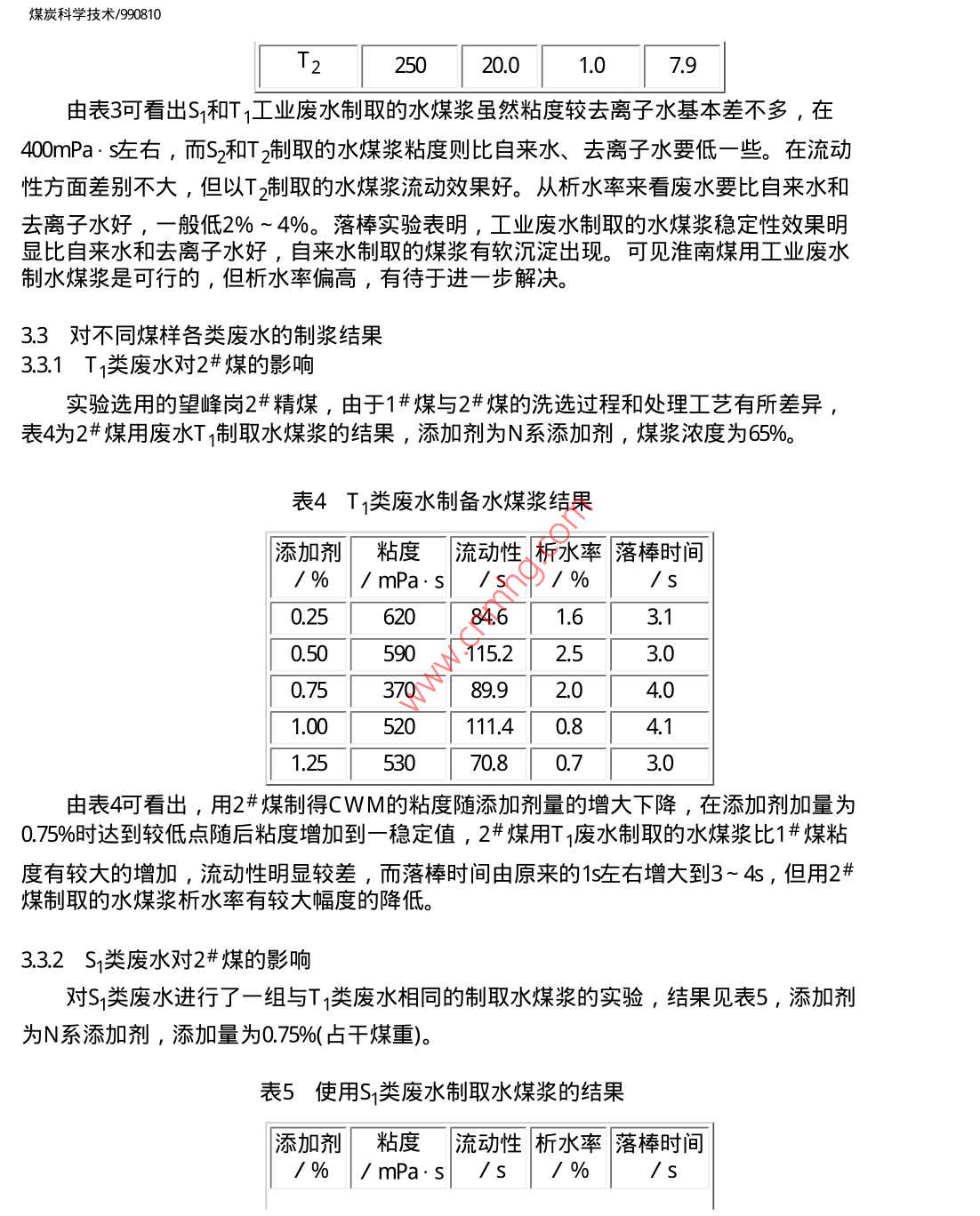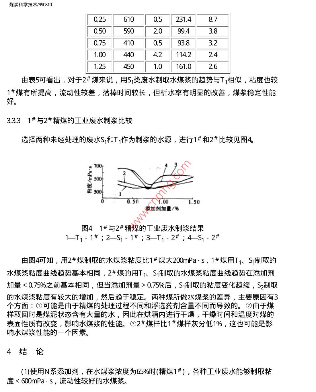 煤炭科學(xué)技術(shù)/990810煤炭科學(xué)技術(shù)舊萬巧數(shù)據(jù)資源系統(tǒng)COAL SCIENCEAND TECHNOLOGY數(shù)化期刊WANFANG DATA CHINAINFo)1999年第27卷第8期Vol,27No81999DIGITIZED PERIODICAL焦化廠工業(yè)廢水對水煤漿性能的影響李寒旭李輝帥應(yīng)泉李軍摘要對蒸餾水、去離子水、自來水和淮化集團焦化廠4種工業(yè)廢水制取水煤漿的性能進行了探討,得出水質(zhì)是影響水煤漿性能的一個不可忽略的因素,所選的工業(yè)廢水可以制岀性能較好的水煤漿,特別是在穩(wěn)定性方面比去離子水和自來水還好。關(guān)鍵詞水煤漿工業(yè)廢水水質(zhì)Industrial Waste Water from Coking PlantAffected to Features of Coal Water MixtureThis paper has discussion on distilled water, ion removing water, tap water andindustrial waste water from coking plant affected to the features of coal water mixture. Theresults shown that a water quality is a disneglected factor affected to the features of caolwater mixture. The industrial waste water from the coking plant can prepare coal watermixture with good features, especially the stability better than ion removing water and tapwater概論為了提高水煤漿的性能,研究人員對不同煤種的濃度、粒度、添加劑進行了探討,且得岀了好的制漿條件。隨著工業(yè)的發(fā)展,工業(yè)對環(huán)境造成的污染已漸漸成為影響人們生活質(zhì)量的重要因素之一。工業(yè)污染中很重要一項就是水質(zhì)污染,這些污染大部分是由于工業(yè)廢水未加處理排放的結(jié)果。工業(yè)廢水的處理增加了生產(chǎn)成本,降低了生產(chǎn)效益。如果用工業(yè)廢水能制取性能良好的水煤漿則既可以減少環(huán)境污染又可以增加制造水煤漿用水來源,具有良好的社會效益和經(jīng)濟效益。雖然人們對水煤漿進行了廣泛研究,但是專門研究水質(zhì)影響的文章不多,因為水煤漿是由大約7%煤某、29%水和1%左右的添加劑制備的煤、固液分散體系,其中2%6的水是影響水煤漿性能的不可忽略的因素。大多數(shù)專家對水煤漿研究是在蒸餾水或去離子水存在的條件下進行的,而實際生產(chǎn)中不可能用如此多的蒸餾水和去離子水來制備水煤漿。水有地表水、地下水、工業(yè)廢水等各種水質(zhì),這些水含有的離子不同、膠體含量不同、水的硬度不同、pH值不同,研究各種水質(zhì)對水煤漿性能的影響可以為工業(yè)應(yīng)用尋找合適的水源。工業(yè)廢水種類繁多,本文著重研究了淮化集團公司焦化廠的4種工業(yè)廢水對水煤漿性能的影響。煤炭科學(xué)技術(shù)/9908102實驗部分2.1煤樣和廢水樣實驗煤樣為淮南精煤1#、2#,粒度全都小于60目。煤樣的工業(yè)分析見表1。表1制漿用煤的工業(yè)分析%揮發(fā)分灰分固定碳煤樣水分 Madvad aafC1#19532.3113825192219328812859.74種工業(yè)廢水分別來自淮化集團焦化廠的4個工段,T1和S1是兩種未經(jīng)處理的工業(yè)廢水,而T2和S2則是兩種已經(jīng)處理的廢水,各種廢水的主要檢測指標見表2表24種廢水的指標廢水組成T酚/mg:L130-50052500<200氨氮/mg:L100~20025~50油/mg·L-1<50<10<200<200COD/mg:L-11500-300030065-87氰/mg:L18-13「氨/mgL-130003002.2添加劑實驗使用的添加劑為N系添加劑,主要成分為萘磺酸鈉縮甲醛。2.3實驗步驟制取水煤漿的步驟如圖1所示。煤炭科學(xué)技術(shù)/990810稱取加劑稱取煤樣制溶液混合攪摔測粘測流動性裝人試管測析水高度落實驗圖1水煤漿制取步驟24實驗指標(1)粘度:用ND-79型旋轉(zhuǎn)式粘度計測定。(2)流動性:在同一漏斗中裝入一定高度的水煤漿記下從開始到滴落完的時間。3)落棒時間∶靜置兀后的水煤漿,用長26τm質(zhì)量為373g的玻璃棒從液面上落下,所測時間即為落棒時間。3結(jié)果與討論3.1添加劑加量對廢水制取水煤漿性能的影響為討論其制漿性能,首先探討了不同添加劑加量制取水煤漿的性能,添加劑為N系添加劑,所用煤為洗精煤末1#,粒度小于60目,制取的水煤漿濃度為65%,見圖2。6004000.200.400.600:801:00添加劑加量/%圖2各種工業(yè)廢水對水煤漿粘度的影響2—去離子水;3T1;4從圖中可以看出,使用N系添加劑,對各種工業(yè)廢水即使在水煤漿濃度為65%的情況下,能夠制取粘度<600mPa·s,流動性較好的水煤漿。從圖中可以看出隨添加劑添煤炭科學(xué)技術(shù)/990810加量的增大,各類水制取的水煤漿粘度呈現(xiàn)下降的趨勢,在添加量為0.巧5%時達到最低,隨后添加劑量的增加粘度又略有上升。各種工業(yè)廢水制取的水煤漿在添加劑加量相同的情況下都比去離子水制取的水煤漿粘度為低,尤以S2T2為明顯,其中S2與S的粘度曲線變化趨勢基本相同,但S2較之S的粘度有較大的降低,見圖3100.200400.600.80101:20添加劑加量/%圖3不同水質(zhì)對水煤漿析水率的影響1—去離子水;2-T1;3-T2:4S2從圖中可以看出,幾種水制取的水煤漿析水率都較高,其中以去離子水的析水率最高,使用廢水后,水煤漿的析水率有不同程度的降低。去離子水的析水率隨添加劑量的增加到一最低點后,又隨添加劑量的進一步增大而略有回升到一穩(wěn)定值。S2廢水與去離子水析水率曲線有相同之處,T1,T2類廢水則是添加劑量的增大開始時變化不大,在添加劑量達到0.5%后則成下降趨勢。這可能是由于工業(yè)廢水中的某些有機物在起作用,也有可能是礦物質(zhì)在起作用,1#煤中含有某些浮選藥劑,這也可能是造成差別的原因之一。3.2各種水質(zhì)制取水煤漿的對比試驗實驗中使用的N系