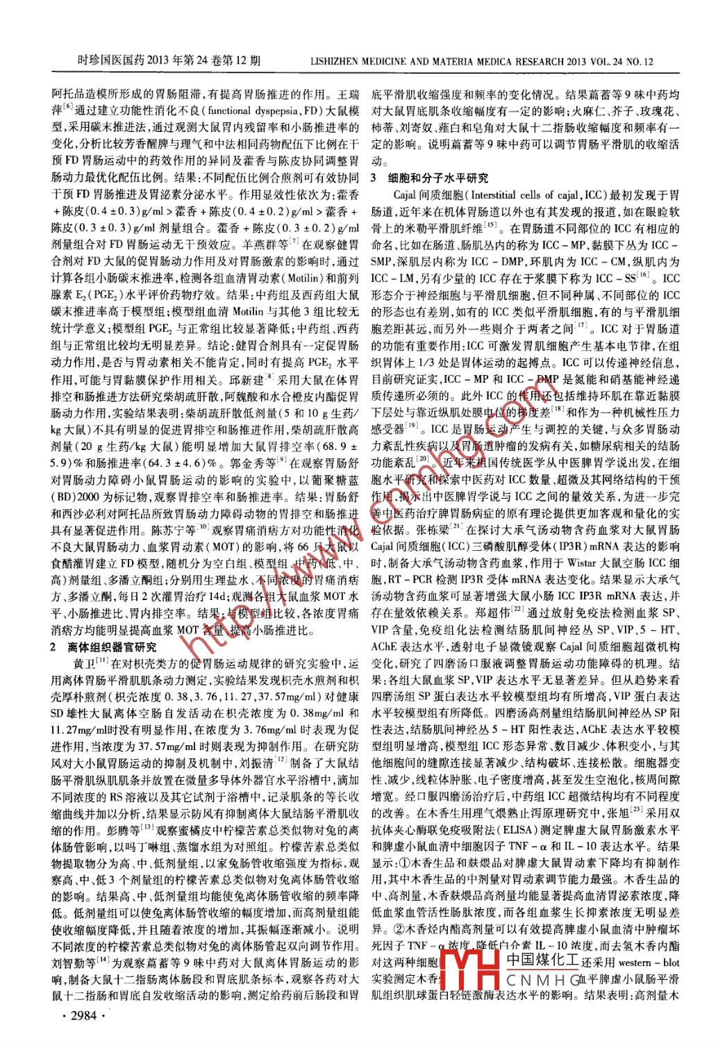 LISHIZHEN MEDICINE AND MATERIA MEDICA RESEARCH 2013 VOL 24 NO 12時珍國醫(yī)國藥2013年第24卷第12期中藥胃腸動力學(xué)研究概況劉慧敏,劉莉·,肖煒,劉強(南方醫(yī)科大學(xué)中醫(yī)藥學(xué)院,廣東廣州510515)摘要:對中藥在胃腸動力學(xué)方面的研究進(jìn)行了文獻(xiàn)整理及分析。胃腸動力障礙在臨床上十分普遍,中藥在治療胃腸動力障礙性疾病中應(yīng)用廣泛,具有促進(jìn)胃腸運動、抑制胃腸運動、雙向調(diào)節(jié)胃腸運動三種基本作用。通過CNK、維普、PubMed等數(shù)據(jù)庫查閱了有關(guān)胃腸動力學(xué)中藥的相關(guān)文獻(xiàn),從整體水平、離體組織器官、細(xì)胞和分子水平對其實驗研究進(jìn)行了分析和總結(jié),指出了胃腸動力中藥研究的優(yōu)勢和不足。關(guān)鍵詞:胃腸動力學(xué);中藥;整體水平;離體組織器官;細(xì)胞和分子水平DOI標(biāo)識:doi:10.3969/j.issn.10080805.2013.12.072中圖分類號:R282.7文獻(xiàn)標(biāo)識碼:A文章編號:10080805(2013)122983403Progress of the Studies on Gastrointestinal Motility Regulation of Chinese MedicineLIU Hul-min, LIU LI XIAO Wel, LIU QiangCollege of TCM, Southern Medical University, Guangzhou 510515, China)Abstract: Objective Literature about gastrointestinal motility of Chinese medicine has been sorted and analyzed. Gastrointestinaldisorder is common in clinic and Chinese medicine is widely applied to treat it. There are three basic functions about the therapywhich are promoting gastrointestinal motility, inhibiting gastrointestinal motility and two-ways regulation of gastrointestinal motility By searching related literature from databases such as CNKI, VIP and PubMed, we analylized the literature and made a conclusion about the present situation of progress of studies on gastrointestinal motility regulation of Chinese medicine from integrated level, isolated tissue and organs level, cellular and molecular level. Also, we analyzed out the advantages and disadvantages of ChiKey words: Gastrointestinal motility; Chinese medicine; Integrated level; Isolated level: Cellular and molecular level近年來隨著胃腸動力研究方法學(xué)的發(fā)展、胃腸動力生理和以疏肝行氣、益氣活血清熱化濕等治法,均取得較好的效果(。病理研究的不斷深入,以及促動力藥物臨床應(yīng)用的推廣,胃腸動隨著對胃腸動力研究的深入,“胃腸動力中藥”這一概念已經(jīng)被力學(xué)得到了迅速發(fā)展。胃腸動力相關(guān)疾病甚多,包括胃食管反流眾學(xué)者廣泛接受。胃腸動力中藥是指具有增強蠕動、促進(jìn)排空、病、食管痙攣、便秘等消化系統(tǒng)常見疾病。除可引起反酸、燒心、降逆止嘔、消痞除滿、疏肝利膽、健脾和胃及攻積導(dǎo)滯等作用的呃逆、堵脹感、排便困難等消化系統(tǒng)癥狀,還可出現(xiàn)咳嗽、咳痰胸類中藥2。研究顯示,對胃腸運動功能有影響的中藥可分為三痛等癥狀。而隨著臨床發(fā)現(xiàn)不少其他系統(tǒng)疾病(如糖尿病、甲類:促進(jìn)胃腸運動抑制胃腸運動雙向調(diào)節(jié)胃腸運動。包括:①亢、肺心病等)都有不同程度的胃腸運動功能紊亂,胃腸動力學(xué)理氣類中藥。如能疏肝理氣的香附、青皮、陳皮,能理氣和胃的蘇越發(fā)受到人們的重視。胄腸動力疾病已成為了目前消化內(nèi)科的梗、木香,能理氣消食導(dǎo)滯的枳實、厚樸、大腹皮等,這些對胃腸都研究熱點,特別是中藥對胃腸動力疾病的研究,由于療效確切,不具有促進(jìn)作用,適宜用于胃腸運動功能亢進(jìn)的氣滯作痛。②活血良反應(yīng)小,臨床應(yīng)用廣泛,被認(rèn)為有廣闊的應(yīng)用前景。藥三棱、莪術(shù)能通過刺激MTL的釋放分泌,提高腸管張力來發(fā)揮胃腸動力是維持人體正常消化功能的一個重要因素,表現(xiàn)為促胃腸動力作用,對于胃腸運動功能降低的瘀血作痛有良好效慢波驅(qū)動下胃腸道節(jié)律性收縮運動,任何影響胃腸道正常收縮與果;健脾藥白術(shù)作用平和,低濃度時有緩和胃腸運動的作用,可舒張的因素皆可導(dǎo)致胃腸動力障礙。胃腸動力障礙屬于中醫(yī)的治療慢性泄瀉較大濃度時能增強胃腸推送能力而幫助消化;③痞證”、“腹?jié)M”、“納呆”、“嘈雜”等疾病范疇。脾胃是人體氣機潤腸通便類或健脾消食類中藥多具有促進(jìn)大小腸運動的作升降的樞紐,脾升胃降是胃腸運動的基本動力。“脾主升清,胃用主降濁”,“脾宜升則健胃宜降則和”,此為脾胃納化之相互依存現(xiàn)代醫(yī)學(xué)檢測手段發(fā)展迅速,能為我中醫(yī)所用。消化界對的關(guān)系。脾胃氣機的升降是胃腸維持“胃滿則腸虛,腸滿則胃胃腸動力方面的生理和病理研究逐漸增多,常用的試驗方法有胃虛,更虛更滿”傳導(dǎo)功能的基本條件。脾胃運納升降的和諧一旦排空率測定,小腸推進(jìn)功能測定,胃腸道腔外電橋式應(yīng)力傳感器遭到破壞,即傳導(dǎo)失司,運化失調(diào)則可直接導(dǎo)致胃腸運動功能障記錄法,胃腸道腔外點擊記錄法,體外胃腸平滑肌肌條動力測定,礙。因此,現(xiàn)代中醫(yī)藥治療胃腸運動功能障礙疾病主要以調(diào)整脾體外胃腸道單個平滑肌細(xì)胞的運動記錄方法等。以現(xiàn)代科學(xué)技胃氣機失常為基本原則,再根據(jù)臨床具體情況辨證分型論治,輔術(shù)為依托,這方面的研究正在呈現(xiàn)出從整體水平到細(xì)胞水平乃至分子水平不斷深入的趨勢收稿日期:20130227;修訂日期:201307-241整體水平研究