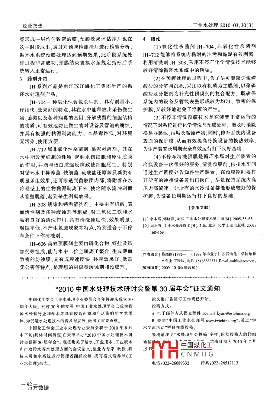 第30卷第3期工業(yè)水處理Vol 30 No.32010年3月Industrial Water TreatmentMar.,2010不停車(chē)清洗預(yù)膜技術(shù)在循環(huán)水場(chǎng)的應(yīng)用葛嫚麗,余維松(1.中石化濟(jì)南分公司,山東濟(jì)南250101;2.江蘇江海化工集團(tuán),江蘇常州213116)摘要]不停車(chē)清洗預(yù)膜技術(shù)在水處理方面是一項(xiàng)比較成熟的技術(shù),作者介紹了不停車(chē)清洗預(yù)膜技術(shù)在循環(huán)水場(chǎng)的應(yīng)用情況,并對(duì)該技術(shù)實(shí)施效果進(jìn)行了分析與評(píng)價(jià)。應(yīng)用實(shí)踐表明,不停車(chē)清洗預(yù)膜方案及技術(shù)有助于循環(huán)水系統(tǒng)的長(zhǎng)周期高效運(yùn)行,也是循環(huán)水系統(tǒng)正常運(yùn)行必不可少的環(huán)節(jié)之一。[關(guān)鍵詞]清洗;預(yù)膜;循環(huán)水中圖分類(lèi)號(hào)]TQ085[文獻(xiàn)標(biāo)識(shí)碼]B[文章編號(hào)]1005-829X(2010)03-008904Application of on-line prefilm cleaning technology to circulating waterplantsGe Manli, Yu Weisong(1.inan Refinery, SINOPEC, Jinan 250101, China;2. Jiangsu Jianghai Chemical Engineering Group, Changzhou 213116, ChinaAbstract: On-line prefilm cleaning technology used for water treatment is a relatively mature technology. The application of prefilm cleaning technology to circulating water plants is introduced. The implement efficiency is analyzedand evaluated. Many practical evidences show that this technology is good for running the projects efficiently inlong period. Also, it's one of the most indispensable links for running circulating water system normallyKey words: cleaning; prefilming; circulating water循環(huán)水系統(tǒng)經(jīng)過(guò)一段時(shí)間的運(yùn)轉(zhuǎn),由于氣候、環(huán)工后仍應(yīng)進(jìn)行清洗。清洗后,整個(gè)系統(tǒng)應(yīng)進(jìn)行預(yù)膜,境、水質(zhì)及其他方面的影響,使冷卻器和系統(tǒng)管網(wǎng)內(nèi)即在所有冷卻器及管道的金屬表面形成一層非常薄產(chǎn)生了一些生物黏泥、鹽類(lèi)沉積物和腐蝕產(chǎn)物等,影而致密的抗腐蝕保護(hù)膜,延長(zhǎng)設(shè)備使用壽命響換熱效果及長(zhǎng)周期運(yùn)行。為方便檢修和為下一周2007年10月中石化濟(jì)南分公司停工檢修,供期生產(chǎn)創(chuàng)造條件,需在循環(huán)水系統(tǒng)停工前進(jìn)行清洗。排水車(chē)間根據(jù)各生產(chǎn)裝置的停工和開(kāi)工時(shí)間,制定生產(chǎn)裝置及循環(huán)水場(chǎng)檢修后,冷卻器及相應(yīng)循環(huán)水了詳細(xì)的停工清洗和開(kāi)工預(yù)膜方案。為了節(jié)約費(fèi)用系統(tǒng)內(nèi)可能留有一些機(jī)械雜質(zhì)、腐蝕產(chǎn)物等,為保證降低藥劑消耗,檢修前循環(huán)水場(chǎng)只進(jìn)行了小型的清設(shè)備長(zhǎng)周期運(yùn)轉(zhuǎn),提髙換熱效率,因此在裝置檢修開(kāi)洗工作,清洗預(yù)膜工作主要在大檢修后進(jìn)行。各循環(huán)+“+“十“““““““十+十+十十+“++十+“+“+“十業(yè)水處理,2004,24(6):52-55大學(xué),2005[8]馬小隆劉曉東周廣柱電鍍廢水處理存在的問(wèn)題及解決方案[].[14彭義華絡(luò)合銅廢水預(yù)處理技術(shù)探討[J]重慶環(huán)境科學(xué),2003,25山東科技大學(xué)學(xué)報(bào):自然科學(xué)版,2005,24(1):107-11l(5):31-35[9] Kurniawan a, Chan g Y s,LowH,etl. Physico-chemical[5]雷鳴,田中于也,廖柏寒,等.硫化物沉淀法處理含EDTA的重heavy metals [J]金屬?gòu)U水[環(huán)境科學(xué)研究,2008,21(1):150-155Chemical Engineering Journal, 2006, 118(1/2): 83-98[10]DB4426-2001廣東省地方標(biāo)準(zhǔn)水污染物排放限值[S[GB8978-1996污水綜合排放標(biāo)準(zhǔn)[S]作者簡(jiǎn)中國(guó)煤化工境科學(xué)與工程學(xué)院環(huán)境2]國(guó)家環(huán)保局.水和廢水的監(jiān)測(cè)分析方法[M].3版.北京:中國(guó)CNMHG: 15922012302, e-mail環(huán)境科學(xué)出版社,1989:350-3803]戎馨亞化學(xué)鍍鎳廢液的處理及資源回收利用[D]蘇州:蘇州[收稿日期120001025(修改稿經(jīng)驗(yàn)交流工業(yè)水處理2010-03,30(3)水場(chǎng)在檢修期間,對(duì)涼水塔和清水池進(jìn)行了全面清非氧化性殺菌劑100mg/,繼續(xù)循環(huán)12h,補(bǔ)加100理,在裝置開(kāi)工后,4個(gè)循環(huán)水場(chǎng)都進(jìn)行了清洗預(yù)mg/L。膜,現(xiàn)以五循為例,闡述不停車(chē)淸洗預(yù)膜技術(shù)在循環(huán)(5)殺菌剝離過(guò)程中,如產(chǎn)生大量泡沫,分批投水場(chǎng)的應(yīng)用情況。加JH-604消泡劑質(zhì)量濃度10-15mg/L1清洗預(yù)膜技術(shù)路線(xiàn)和實(shí)施方案(6)殺菌剝離過(guò)程中做好黏泥含量、濁度與時(shí)間1.1系統(tǒng)參數(shù)曲線(xiàn)來(lái)確定切換最佳點(diǎn)中石化濟(jì)南分公司第五循環(huán)水場(chǎng)系統(tǒng)設(shè)計(jì)水量(7)殺菌處理后,進(jìn)行大排大補(bǔ)直至濁度<1512000mh,實(shí)際水量92009300m/h,系統(tǒng)保有水mg/或者生物黏泥量<3mg/,轉(zhuǎn)人黏泥剝離處理。量3000m,向二催化、二加氫、焦化、制氫、重整加1.5除銹垢及油污處理氫、二動(dòng)力等生產(chǎn)裝置提供循環(huán)水,循環(huán)水溫差5~通過(guò)有機(jī)酸對(duì)三氧化二鐵、碳酸鈣、磷酸鈣等污8℃,水冷器材質(zhì)主要為碳鋼,少量為不銹鋼材質(zhì)。垢作用生成易溶于水的離子,經(jīng)過(guò)置換排放出系統(tǒng)1.2系統(tǒng)狀態(tài)使水冷器表面恢復(fù)原有狀態(tài),為預(yù)膜及正常運(yùn)行創(chuàng)根據(jù)
