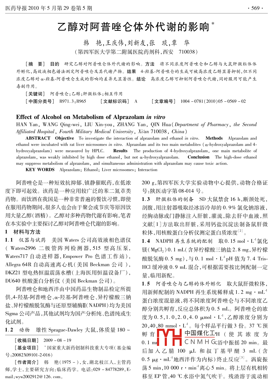 醫(yī)藥導(dǎo)報2010年5月第29卷第5期乙醇對阿普唑侖體外代謝的影響韓艷,王慶偉,劉新友,張琰,覃華(第四軍醫(yī)大學(xué)第二附屬醫(yī)院藥劑科,西安710038[摘要]目的研究乙醇對阿普唑侖體外代謝的影響。方法將不同濃度阿普唑侖和乙醇與大鼠肝微粒體體外孵化,高效液相色譜法測定阿普唑侖及其代謝產(chǎn)物。結(jié)果4-羥基-阿普唑侖的生成可被高濃度乙醇顯著抑制,但不同濃度乙醇對α-羥基-阿普唑侖生成的影響均差異無顯著性。結(jié)論高濃度♂醇可抑制阿普唑侖代謝,同時服用可能產(chǎn)生毒副作用。[關(guān)鍵詞]阿普唑侖;乙醇;肝微粒體;相互作用[中圖分類號]R971.3;R965文獻標(biāo)識碼]A[文章編號]1004-0781(2010)05-0569-02Effect of Alcohol on Metabolism of Alprazolam in vitroHAN Yan, WANG Qing-wei, LIU Xin-you, ZHANG Yan, QIN Hua( Department of Pharmacy, the SecondAfiliated Hospital, Fourth Military Medical University, Xian 710038, ChinaABSTRACt Objective To investigate the interaction of alprazolam and ethanol in vitro. Methods Alprazolam andethanol were incubated with rat liver microsomes in vitro. Alprazolam and its two main metabolites(a-hydroxyalprazolam and 4hydroxyalprazolam) were measured by HPLC. Results The production of 4-hydroxyalprazolam, one main metabolite ofalprazolam, was weakly inhibited by high dose ethanol, but not a-hydroxyalprazolam. Conclusion The high-dose ethanolmay suppress metabolism of alprazolam, and simultaneous administration with alprazolam may cause toxic actionKEY WORDS Alprazolam; Ethanol; Liver microsomes; Interaction阿普唑侖是一種短效抗抑郁、鎮(zhèn)靜催眠藥,在低濃200g,第四軍醫(yī)大學(xué)實驗動物中心提供,動物合格證度下即可起效。該藥是一種應(yīng)用較廣泛的苯二氮草類號:陜醫(yī)動字第08-014號。藥物。而飲酒在我國是一種非常普遍的餐飲習(xí)慣,即使1.3肝微粒體的制備SD大鼠禁食16h,斷頸處死,在服用藥物期間,很多人也會由于聚會或節(jié)慶等原因飲剖腹,用注射器吸取經(jīng)冰浴冷卻的0.9%氯化鈉溶液用大量乙醇(酒精)。乙醇對多種藥物代謝有影響,筆者經(jīng)胸動脈或門靜脈注入肝臟,灌流,除去肝中血液,照在本實驗中主要探討乙醇對阿普唑侖代謝的影響。文獻[1]方法取出肝臟,采用鈣鹽沉淀法制備鼠肝微1材料與方法粒體用核酸蛋白分析儀測定蛋白質(zhì)濃度?分鼠肝微1.1儀器與試藥美國 Waters公司高效液相色譜儀1.4 NADPH再生系統(tǒng)的配制取0.15mol·L氯化(waes2996二極管陣列檢測器,515型高壓泵,鎂(MsCl)0.1mL(含異檸檬酸三鈉鹽2.8mg,異檸檬Waters717自動進樣器, Empower Pro色譜工作站),酸脫氫酶0.5mg),與0.1mol·LpH值為74TriAllegra64R自動高速離心機(美國 Beckman公司)HCl緩沖液0.9mL混合,可根據(jù)需要按比例配制一定DKZ21型電熱恒溫震蕩水槽(上海醫(yī)用恒溫設(shè)備廠),量,臨用新配DU640核酸蛋白分析儀(美國 Beckman公司)。1.5阿普唑侖與乙醇的體外孵化取大鼠肝微粒體阿普唑侖和地西泮由中國藥品生物制品檢定所提用新鮮配制的 NADPH再生系統(tǒng)稀釋成1.2mg·mL鹽異檸檬酸脫氫酶與還原型輔酶Ⅱ( NADPH)均為美國蛋白濃度混懸液,將不同濃度阿普唑侖與不同濃度乙供,4-羥基-阿普唑侖、α-羥基-阿普唑侖、異檸檬酸三鈉醇分別共孵育,反應(yīng)總體積為0.5mL。阿普唑侖的濃Sigma公司產(chǎn)品,其他試劑均為國產(chǎn)分析純、色譜純或生化試劑。度為0.5,1.0,2.0,4.0mol·L,乙醇濃度分別為1.2動物雄性 Sprague- Dawley大鼠,體質(zhì)量18020,40,80mmol·L。每個樣品平行做3份。37℃預(yù)孵育中國煤化工H(使其濃度為[收稿日期]2009-08-190.1CNMHG浴中振搖20min。最基金項目]·國家重大新藥創(chuàng)制科技重大專項(基金編號:20082X09101-2-016)后加入乙腈100μ和叔丁基甲醚3mL(含[作者簡介]韓艷(1975-),女,湖北枝江人,主管藥0.5g:mL地西洋作為內(nèi)標(biāo))終止反應(yīng)。渦旋振師,學(xué)士,主要研究方向:臨床藥學(xué)。電話:029-84778289,E蕩5min,10000r·min離心5min。將上層有機相轉(zhuǎn)mailwyw2002912@126.como移至EP管,40℃水浴中氮氣吹干。殘渣溶于流動相570Herald of Medicine Vol 29 No 5 May 2010200μ,取50μL進樣和日內(nèi)精密度均<6%,回收率均>97%。1.6阿普唑侖及其代謝產(chǎn)物的測定色譜條件:C11.7統(tǒng)計學(xué)方法所有結(jié)果均用均數(shù)±標(biāo)準(zhǔn)差反相柱(150mm×4.6mm,5wm),美國 Waters公司;(x±s)表示,組間比較用 ANOVA檢驗,P<0.05表示流動相:20mmol·L磷酸二氫鉀(KH2PO4)-甲醇-乙差異有顯著性。腈(40:20:30,VWV);流速:0.6mL·min;檢測波2結(jié)果長:254m;柱溫30℃。α-羥基-阿普唑侖、4-羥基測定結(jié)果見表1,不同濃度(20,40,80mmol·L)阿普唑侖、阿普唑侖和地西泮的保留時間分別為9.6,乙醇對α-羥基-阿普唑侖生成無明顯影響,而高濃度乙10.5,15.0,25.0min。ax-羥基-阿普唑侖、4羥基阿普醇(80mmol·L)對4羥基阿普唑侖生成有一定抑唑侖的定量限分別為50和25ng:mL,日間精密度制作用(P<0.01)。表1乙醇對肝微粒體中阿普唑侖代謝的影響Tab 1 Effect of alcohol on the metabolism of alprazolam in hepatic microsome nmol. min.mg, x*s, n=3而日0.5umL1.0pml:L20pmL.0pmd.t-OH4-OH4-OH4-OH4-OH乙醇20mmol·L-112.2±4.124.8±4.514.4±3.956.7±6.714.3±3.5120.2±13.326.3±5.1211.1±33.440mmol·L-114.2±4.422.7±2.2112.9±2.954.8±7.211.9±2.6110.8±23.126.8±3.2199.5±4180mmol·L14.8±5.319.8±3.1*213.5±4.247.8±6.0*213.8±2.88±14.7*225.6±3.7201.8±20對照組11.7±3.827.6±5.912.8±3.359.1±4.912.7±1.9118.1±23.427.0±4.7254.8±43.3αOH:α-羥基-阿普唑倉;4-OH:4-羥基-阿普唑侖;與對照