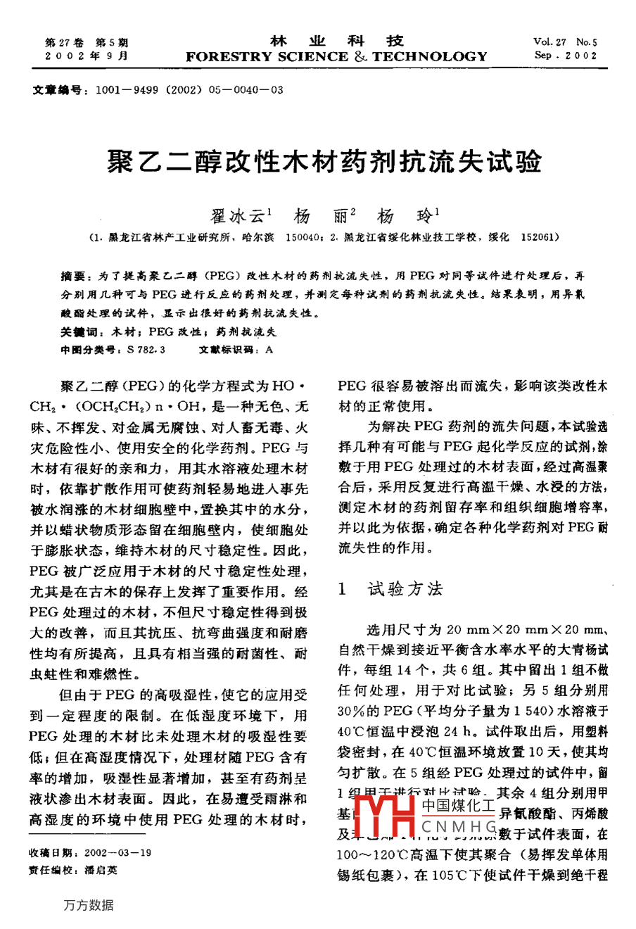 第27卷第5期林業(yè)科技VoL 27 No 52002年9月FORESTRY SCIENCE & TECHNOLOGYsep,2002文章編號(hào):1001-9499(2002)05-0040—03聚乙二醇改性木材藥劑抗流失試驗(yàn)翟冰云1楊麗2楊玲1(1.黑龍江省林產(chǎn)工業(yè)研究所,哈爾濱150040;2.黑龍江省綏化林業(yè)技工學(xué)校,緩化152061)摘要:為了提高聚乙二醇(PEG)改性木樹(shù)的藥劑抗流失性,用PEG對(duì)同等試件進(jìn)行處理后,再分別用幾種可與PEG進(jìn)行反應(yīng)的藥劑處理,并測(cè)定每種試劑的藥劑抗流失性。結(jié)采表明,用異氰酸酯處理的試件,顯示出很好的藥劑抗流失性。關(guān)犍詞:木材;PEG改性;藥劑抗流失中圖分類號(hào):S782.3文獻(xiàn)標(biāo)識(shí)碼:A棗乙二醇(PEG)的化學(xué)方程式為HPEG很容易被溶出而流失,影響該類改性木CH2·(OCH2CH2)n·OH,是一種無(wú)色、無(wú)材的正常使用味、不揮發(fā)、對(duì)金屬無(wú)腐蝕、對(duì)人畜無(wú)毒、火為解決PEG藥劑的流失問(wèn)題,本試驗(yàn)選災(zāi)危險(xiǎn)性小、使用安全的化學(xué)藥劑。PEG與擇幾種有可能與PEG起化學(xué)反應(yīng)的試劑涂木材有很好的親和力,用其水溶液處理木材敷于用PEG處理過(guò)的木材表面,經(jīng)過(guò)高溫聚時(shí),依靠擴(kuò)散作用可使藥劑輕易地進(jìn)人事先合后,采用反復(fù)進(jìn)行高溫干燥、水浸的方法,被水潤(rùn)漲的木材細(xì)胞壁中,置換其中的水分,測(cè)定木材的藥劑留存率和組織細(xì)胞增容率并以蠟狀物質(zhì)形態(tài)留在細(xì)胞壁內(nèi),使細(xì)胞處并以此為依據(jù),確定各種化學(xué)藥劑對(duì)PEG耐于膨脹狀態(tài),維持木材的尺寸穩(wěn)定性。因此,流失性的作用。PEG被廣泛應(yīng)用于木材的尺寸穩(wěn)定性處理,尤其是在古木的保存上發(fā)揮了重要作用。經(jīng)1試驗(yàn)方法PEG處理過(guò)的木材,不但尺寸穩(wěn)定性得到極大的改善,而且其抗壓、抗彎曲強(qiáng)度和耐磨選用尺寸為20mm×20mm×20mm性均有所提高,且具有相當(dāng)強(qiáng)的耐菌性、耐自然干燥到接近平衡含水率水平的大青楊試蟲(chóng)蛀性和難燃性件,每組14個(gè),共6組。其中留出1組不做但由于PEG的高吸濕性,使它的應(yīng)用受任何處理,用于對(duì)比試驗(yàn);另5組分別用到一定程度的限制。在低濕度環(huán)境下,用30%的PEG(平均分子量為1540)水溶液于PEG處理的木材比未處理木材的吸濕性要40℃恒溫中浸泡24h。試件取出后,用塑料低;但在高濕度情況下,處理材隨PEG含有袋密封,在40℃恒溫環(huán)境放置10天,使其均率的增加,吸濕性顯著增加,甚至有藥劑呈勻擴(kuò)散。在5組經(jīng)PEG處理過(guò)的試件中,留液狀滲出木材表面。因此,在易遭受雨淋和時(shí)比計(jì)驗(yàn).其余4組分別用甲高濕度的環(huán)境中使用PEG處理的木材時(shí),基中國(guó)煤化工異氰酸酯、丙烯酸及CNMH敷于試件表面,在收稿日期;2002-03-19100~120℃高溫下使其聚合(易揮發(fā)單體用資任編校:潘啟英錫紙包裹),在105℃下使試件干燥到絕干程笫5期翟冰云等:聚乙二醇改性木材藥劑抗流失試驗(yàn)度。將以上6組試件,同時(shí)進(jìn)行24h水浸水浸、干燥處理后,異氰酸脂涂敷過(guò)的試件(10℃)和20h干燥(105℃)試驗(yàn),反復(fù)5比未處理過(guò)的試件藥物留存率高81.29%次。并測(cè)定每次水浸、干燥后重量變化和體而用其他藥劑處理的試件,藥物留存率經(jīng)5積變化情況,測(cè)算出每組試件的藥劑留存率次水浸、干燥后,均比最初降低80%以上。由和木材細(xì)胞增容率的變化情況。此說(shuō)明,用異氰酸酯涂敷可有效阻止PEG藥劑的溶出(見(jiàn)表1,圖1)。2結(jié)果和分析35經(jīng)檢測(cè),用異氰酸酯處理的試件,其藥劑抗流失性有明顯的改善。試驗(yàn)結(jié)果表明,用25-PEG異氰酸酯異氰酸酯涂敷過(guò)的試件,其藥物留存率最初是38.25%,經(jīng)5次水浸、干燥后降為PEG丙烯酸17.93%;未用異氰酸酯涂敷而單用PEG處e一PEG萃乙烯10理的試件,其藥物留存率最初為30.61%經(jīng)55次水浸、干燥后降為9.89%。相比之下,最初涂敷過(guò)異氰酸酯的試件初始留存率比未處初始1次2次3次4次5次理試件的藥物初始留存率高249%,經(jīng)5次圖1藥物留存率褒1經(jīng)5次水沒(méi)、干燥處理藥物留存率變化情況1次次4次PEG30.6119.8415.6213.139.89PEG十異氧酸酯22.1119.6PEG+MMA33.5219.8810.788.216.53PEG十丙烯酸37.1814.6710,.838.146.16PEG十苯乙烯36.2820.9314.1510.177.515.72從木材細(xì)胞的增容率看,用PEG處理的18試件,其細(xì)胞增容率最初是1271%,經(jīng)5次16水沒(méi)、干燥后降為4.72%;而用PEG處理后14PEG再用異氰酸酯涂敷的試件,其細(xì)胞增容率最12PEG異氰酸酯初是16.34%,經(jīng)5次水浸、干燥后降為10PEGMMAPEG丙烯酸9.10%。涂敷與未涂敷的試件相比,最初涂PEG苯乙烯敷過(guò)的試件比未涂敷試件的細(xì)胞增容率高428.56%;經(jīng)5次水浸、干燥處理后,涂敷過(guò)2的試件比未涂敷試件的細(xì)胞增容率高初始1次2次3次4次5次2.8%。結(jié)果同樣說(shuō)明,用異氰酸酯涂敷可中國(guó)煤化工有效阻止PEG藥劑的溶出(見(jiàn)表2,圖2)CNMHG容率42林業(yè)科技第27卷表2經(jīng)5次水浸、千燥處理的細(xì)胞增容率變化情況初始2次3次4次5次PEG8.84PEG+異氰酸酯16.3412.8211,489.10PEG+MMA12.638.664,793.83PEG十丙烯酸12.388.47PEG十苯乙烯12.536.995.46試驗(yàn)結(jié)果證明,異氯酸酯對(duì)PEG改性木1983,38(5)材來(lái)說(shuō),是一種很好的藥劑抗流