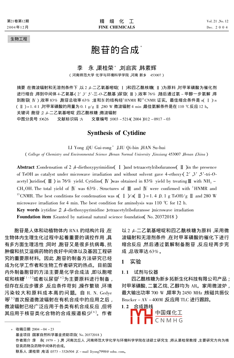 第21卷第12期精細(xì)化工Vol.21 ,No. 122004年12月FINE CHEMICALS .Dee. 2004生物工程胞苷的合成李永渠桂榮*,劉啟賓韓素輝(河南師范大學(xué)化學(xué)與環(huán)境科學(xué)學(xué)院河南新鄉(xiāng)453007 )摘要在微波輻射和無溶劑條件下,以2 4-二乙氧基嘧啶( I )和四乙酰核糖( II )為原料對(duì)甲苯磺酸為催化劑進(jìn)行縮合得到中間體4-乙氧基{2' 3' 5'-=-0-乙酰基)尿苷( I )收率76%隨后通過氨一甲醇一步氨解得到胞苷( IV )收率83%胞苷總收率63% ;Il 和IV的結(jié)構(gòu)經(jīng)HNMR和"CNMR證實(shí)。最佳縮合條件是n( I ):n( I )=1.4:1對(duì)甲苯磺酸的用量為0.1 g/g I 280 W微波輻射4 min最佳氨解條件是在110 C反應(yīng)12 h。關(guān)鍵詞胞苷2 A-二乙氧基嘧啶四乙酰核糖微波輻射中圖分類號(hào):0626文獻(xiàn)標(biāo)識(shí)碼:A文章編號(hào):1003-5214( 2004 )012 -0917 -03Synthesis of CytidineLI Yong QU Gui-rong* LIU Qi-bin ,HAN Su-hui( Collge of Chemistry and Environmental Science ,Henan Normal University ,Xinxiang 453007 ,Henan ,China )Abstract :Condensation of 2 A4-diethoxypyrimidind( I )and tetraacetylribofuranose( I )in the presenceof TsOH as catalyst under microwave irradiation and without solvent gave 4-ethoxy( 2' ,3' 5'tri-O-acetyl )uridine( I ) in 76% yield. Cytidine( IV )was obtained in 83% yield by treating I with NH3 -CH.OH. The total yield of IV was 63%. Structures of II and IV were confirmed with' HNMR and'CNMR. The best conditions for condensation wasn( I )n( II )=1.4 0.1 g TsOH/g II and 280 Wmicrowave irradiation for 4 min. The best condition for aminolysis was 110 C for 12 h.Key words cytidine 2 A -diethoxypyrimidine tetraacetylribofuranose ;microwave irradiationFoundation item :Granted by national natural science foundation( No. 20372018 )胞苷是人體和動(dòng)植物體內(nèi)RNA的結(jié)構(gòu)片段在以24-二乙氧基嘧啶和四乙酰核糖為原料,采用微生物體內(nèi)生理生化過程中起著重要的調(diào)控作用具波輻射和無溶劑條件,在對(duì)甲苯磺酸的催化下進(jìn)行有多方面生理活性;同時(shí),胞苷又是很多抗病毒、抗縮合反應(yīng)然后通過氨解制備胞苷,反應(yīng)經(jīng)兩步完腫瘤和抗艾滋病藥物的良好中間體以及基因工程研成總收率達(dá)63%。究的重要原材料。因此,胞苷的制備方法研究已經(jīng)1實(shí)驗(yàn)成為化學(xué)工作者和生物工作者研究的熱點(diǎn)。目前國內(nèi)外制備胞苷的方法主要是化學(xué)合成法,即以胞嘧1.1 試劑與儀器啶和核糖1~3]或者以尿苷41為主要原料進(jìn)行制備,四乙酰核糖為新鄉(xiāng)拓新生化科技有限公司產(chǎn)品;但存在反應(yīng)步驟多,反應(yīng)條件苛刻操作繁瑣環(huán)境對(duì)甲苯磺酸、二氯乙烷、乙醇均為AR。家用微波爐,污染較大和原料成本高的問題。自R.N.Gedye最大輸出功率700 W頻率為2450 MHz核磁共振儀等S]首次報(bào)道微波輻射在有機(jī)合成中的應(yīng)用之后,Brucker - AV -400M反應(yīng)用TLC進(jìn)行跟蹤。微波輻射已經(jīng)廣泛應(yīng)用于各類有機(jī)合成反應(yīng),但將1.2_ 合成路線其應(yīng)用于核苷類化合物的合成報(bào)道極少61。作者中國煤化工MHCNMHG*收稿日期 2004 -04 -23基金項(xiàng)目國家自然科學(xué)基金資助項(xiàng)目( No. 20372018 )作者簡介李永( 1979- )男河南沈丘人河南師范大學(xué)化學(xué)與環(huán)境科學(xué)學(xué)院在讀碩士研究生師從渠桂榮教授主要研究方向?yàn)楹塑疹愃幬锛八幬镏虚g體的合成。聯(lián)系人渠桂榮電話0373 -3326504 E - mail diyong7998@ sohu. com。,918精細(xì)化工FINE CHEMICALS第21卷0EtNH2CH,C00~ .0C0CH,CHC00l0<0一OTs0HMierowave110COFtCH,C0O0C0CH3CHCOO0C0CH, .(山)(I)(M)(IV)1.3 合成方法到0.1g時(shí),收率達(dá)到最高76%。如果繼續(xù)增加1.3.1 2 4-二乙氧基嘧啶的制備TsOH的用量原料將開始炭化,而得不到產(chǎn)品。參照文獻(xiàn)7 ]制備。表1催化劑 TsOH用量對(duì)縮合收率的影響1.3.2 4-乙氧基( 2' ,3' ,5'三-0-乙?;?尿苷Table 1 Effeet of TsOH amount on the condensation yield( II )的合成催化劑TsOH/g將0.5 gI、1.0 gII和0.1 g對(duì)甲苯磺酸0.03).050.070.1 0.12( TsOH )投入50 mL圓底燒瓶中加入15 mL1 2-二縮合收率/%-5676炭化氯乙烷充分?jǐn)嚢枞芙鈸]發(fā)干溶劑后置于微波爐中設(shè)定功率為280 W加熱4 min。反應(yīng)完畢,加入202.2原料配比對(duì)縮合收率的影響mL熱乙醇冷卻結(jié)晶過濾得白色晶體II0.. 96 g收采用1.3.2節(jié)的步驟,催化劑的用量、微波輻射率76%。' HNMR( DMSO-d。 ,δ ):1.299( t ,3H ,功率及輻射時(shí)間不變 調(diào)節(jié)原料的比例結(jié)果見表2。CH3CH2)2. 037 ~2. 080( m 9H CH,CO ) A4.233( t,表2原料配比對(duì)縮 合收率的影響2H 5'-H)4.277( q ,2H ,0CH2 ),4.361( t ,1H ,4'-Table2 Effect ofn( I )/n( I )on the condensation yieldH),5.361( t 1H 3'-H )5.487( q ,H 2'-H ) 5.926()(I)(d ,1H 1'-H )6.097( d ,1H ,5-H) 8.004( d ,1H ,6-0.91.11.31.41.5 1.8H )。I3CNMR( DMSO-d。δ ):15.00( CH,CH2 ) 21.26縮合收率/% 2558777~21. 52( CH,CO ) ,63. 65( OCH, ) ,63. 96( 5'-C ) ,70. 84( 3'-C)73. 53(2'-C) 80.18(4'-C)91. 13( 1'-可以看出,由于I為液體在微波加熱下蒸發(fā)散C) ,96.73( 5-C ),146.57( 6-C ),155.47( 2-C ),失,因此不同的原料配比對(duì)縮合收率有很大影響。170. 32( 4-C) ,170. 35 ~172.18( COCH; )。原料配比n(I)/n(II)=1.1時(shí),縮合收率只有1.3.3 胞苷( IV )的合成58%增至1.4 時(shí),收率為76% ;繼續(xù)增大比值,則將3.0g中間體溶于50mL氨-甲醇溶液0縮合收率沒有明顯增加。因此,在實(shí)驗(yàn)中采用nC飽和)然后置于不銹鋼封管中密封,油浴加熱至( I )1( II )=
