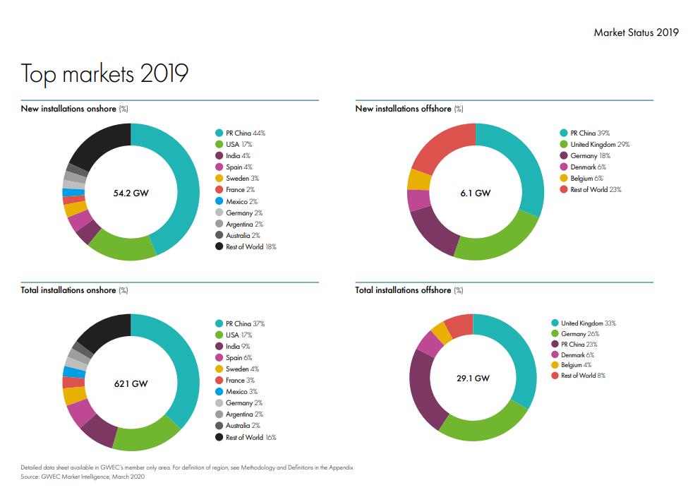 "The global installed wind capacity in 2019 was 60.4GW, an increase of 19% over 2018 and the second best year in the history of wind power. 2. Currently, the cumulative installed capacity of global wind energy is over 651GW, an increase of 10% over 2018. 3. China and the us remain the world's largest onshore wind markets, accounting for more than 60% of new installations in 2019. 4. Offshore wind power is playing an increasingly important role in driving global wind power installation, with a record 6.1GW of installed capacity in 2019, accounting for 10% of new installations. 5. The report identifies two key tools for further accelerating wind energy growth: the focus to support the long-term sustainability of the wind and renewable energy industries shifts from leveling the cost of kilowatt hour (LCOE) to the energy markets being built; And the adoption of emerging technological solutions, such as hybrid technology and green hydrogen (production), opens up new opportunities for the industry. 6.2020 is expected to be a record year for wind power, with GWEC forecasting 76GW of new installations. However, the full impact of covid-19 on wind installations remains unknown. GWEC will revise its 2020-2024 forecast based on COVID 19's potential impact on the global economy and energy markets, and will release an updated market outlook in the second quarter of 2020.