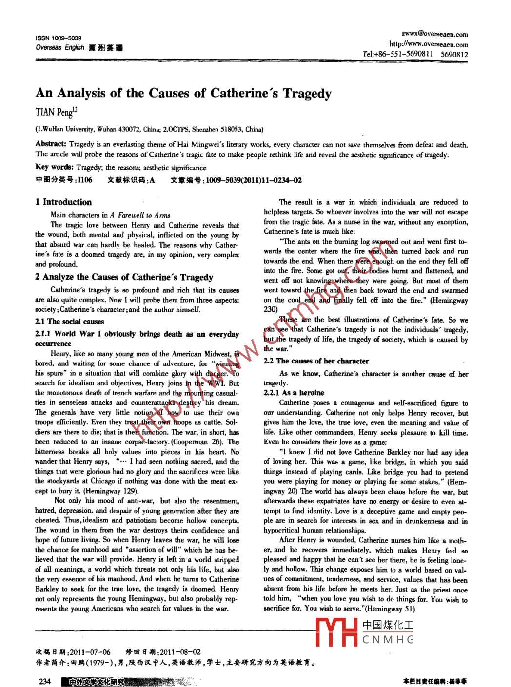 zwwx@overseaen.comISSN 1009 -5039http://www.overseaen.comOverseas EnglishTel:+86- -551-5690811 5690812An Analysis of the Causes of Catherine 's TragedyTIAN Peng'2(1.WuHan University. Wuhan 430072, China; 2.0CTPS, Shenzhen 518053, China)Abstract: Tragedy is an everlasting theme of Hai Mingwei's literary works, every character can not save themselves from defeat and death.The aricle will probe the reasons of Catherine's tragic fate to make people rethink life and reveal the aesthetic signifcance of tragedy.Key words: Tragedy; the reasons; aesthetic signifcance中圖分類號:1106文獻標(biāo)識碼:A文章編號:1009- 503920111-0234 -021 IntroductionThe result is a war in which individuals are reduced tohelpless targets. So whoever involves into the war will not escapeThe tragic love between Henry and Catherine reveals thatfrom the tragic fate. As a nurse in the war, without any exception,Catherine's fate is much like:the wound, both mental and physical, inficted on the young by“The ants on the buming log swarmed out and went first to-that absurd war can hardly be healed. The reasons why Cather-wards the center where the fire was, then turmed back and runine's fate is a doomed lragedy are, in my opinion, very complexand profound.towards the end. When there were enough on the end they fell ofinto the fire. Some got out, their bodies bumt and flattened, and2 Analyze the Causes of Catherine's Tragedywent off not knowing where they were going. But most of themCatherine's tragedy is B0 profound and rich that its causeswent toward the fire and then back toward the end and swarmedare also quite complex. Now I will probe them from three aspects:on the cool end and finally fell off into the fire." (Hemingway8ociely ;Catherine '8 character;and the author himself.230)2.1 The social causesThese are the best ilustrations of Catherine's fate. So wecan see that Catherine's tragedy is not the individuals' tragedy,2.1.1 World War I obvously brings death as an everydaybut the tragedy of life, the tragedy of society, which is caused byoccurrencethe war."Henry, like so many young men of the American Midwest, isbored, and waiting for some chance of adventure, for“winning2.2 The causes of ber characterhis spurs" in a situation that will combine glory with danger. ToAs we know, Catherine's character is another cause of hersearch for idealism and objectives, Henry joins in the WW1. Buttragedy.the monotonous death of trench warfare and the mounting casual-2.2.1 As a heroineties in senseless attacks and counterattacks destroy his dream,Catherine poses a courageous and selr-acrificed figure toThe generals have very lttle notion of how to use their ownour understanding. Catherine not only helps Henry recover, buttroops eficiently. Even they treat their own troops us cattle. Sol-gives him the love, the true love, even the meaning and value ofdiers are there to die; that is their function. The war, in short, haslife. Like other commanders, Henry seeks pleasure to kill time.been reduced to an insane corpse-factory. (Coopemman 26), TheEven he considers their love as a game:bittermess breaks all holy values into pieces in his heart. No“I knew I did not love Catherine Barkley nor had any ideawander that Henry says,“... I had seen nothing sacred, and theof loving her. This was a game, like bridge, in which you saidthings that were glorious had no glory and the sacrifices were likethings instead of playing cards. Like bridge you had to pretendthe stockyards at Chicago if nothing was done with the meat ex-you were playing for money or playing for some stakes." (Hem-cept to bury it. (Hemingway 129).ingway 20) The world has always been chaos before the war, butNot only his mood of anti-war, but also the resentment,afterwards these expatriates have no energy or desire to even at-hatred, depression. and despair of young generation after they aretempt to find identity. Love is a deceptive game and empty peo-cheated. Thus , idealim and patriotism become hollow concepts.ple are in search for interests in sex and in drunkenness and inThe wound in them from the war destroys theirs confidence andhypoeritical human relationships.hope of future living. So when Henry leaves the war, he will loseAfter Henry is wounded, Catherine nurses him like a moth-the chance for manhood and "asertion of will" which he has be-er, and he recovers immediately, which makes Henry feel solieved that the war will provide. Henry is left in a world strippedpleased and happy that he can't see her there, he is feeling lone-of all meanings, a world which threats not only his life, but alsoly and hollow. This change exposes him to a world basedthe very essence of his manhood, And when he turs to Catherineues of commitment, tendemess, and service, values that has beenBarkley to seek for the true love, the tragedy is doomed. Henryabsent from his life before he meets her. Just as the priest oncenot only represents the young Hemingway, but also probably rep-told him,“ when you love you wish to do things for. You wish toresents the young Americans who search for values in the war.sacrifice for. You wish to serve. "(Hemingway 51)中國煤化工MHCNMH G收稿日期:2011-07-06修回日期:2011-08-02作者簡介:因鵬(1979-),男,陜西漢中人,英語教師,學(xué)士,主要研究方向為英語教育。.234■ 申腦 文化研克年。本欄目責(zé)任編輯:桶莘事2011年11月Overseas English 海外葬語What Catherine has said reveals the highest apex of love.shadow to many things, such as love, mary, family.. .Without herThat is to say love unies against the blows of life, and the spiritdeath, Henry cannot have a piece of mind to think about theand physical, even at the departure. This signifies that Henry hasworld and the life. It is sbe who provides a perfect complement totaken the final step in his remarkable growth from authoritativethe atitude of Henry. It is she who makes a noteworthy contribu-spotter of conventional wisdom to understale. It i