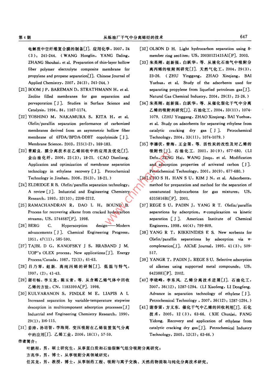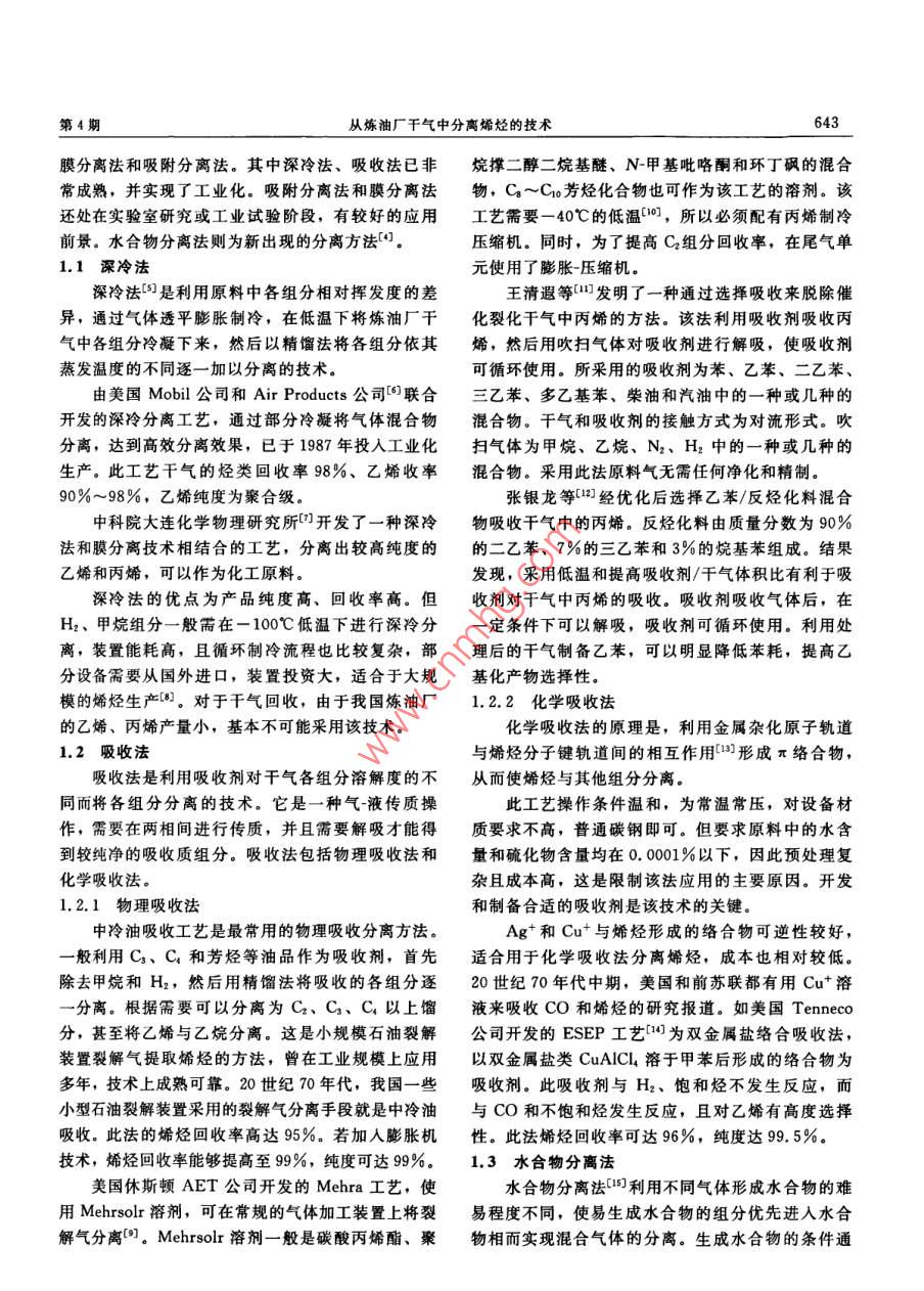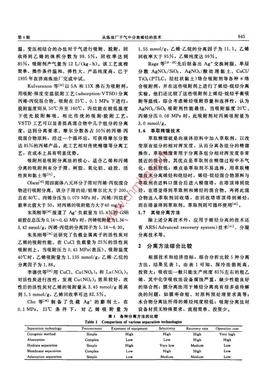 石油學報(石油加T)2010年8月ACTA PETROLEI SINICA (PETROLEUM PROCESSING SECTION)第26卷第4期文章編號: 1001-8719(2010)04-0642-06從煉油廠干氣中分離烯烴的技術(shù)葉鵬程,方兆華,任其龍(浙江大學化學工程與生物工程學系,斷江杭州310027)摘要:介紹了煉油廠干氣中目前使用的深冷法、吸收法、水合物分離法、膜分離法、吸附分離法等烯烴分離技術(shù)。其中深冷法和吸收法投資大,生產(chǎn)成本高;水合法得到的產(chǎn)品純度低;膜分離法中使用的膜的壽命通常少于1年;變樂吸附法具有清潔、低能耗等優(yōu)點,適合煉油廠干氣中烯烴的分離,具有良好的應用前景.關(guān)鍵詞:丙烯;乙烯;分離;氣中圖分類號: TQ028. 1+5文獻標識碼: A doi; 10. 3969/j. issn. 1001-8719. 2010. 04. 027TECHNOLOGIES OF SEPARATING ALKENE FROM REFINERY DRY GASYE Pengcheng, FANG Zhaohua, REN Qilong(Depar/ment of Chemical and Biological Engineering, Zhejiang University, Hangzhou 310027, China)Abstract: Technologies used for separating alkene from dry gas are reviewed, which includecryogenic method, absorption, hydrate separation, membrane separation and adsorption separation.The investment of ceryogenic method and absorption is comparatively high. The purity of productobtained from hydrate separation process is low. Life of membrane used in membrane separationprocess is usually less than one year. The pressure swing adsorption considered as a clean and lowcost technology is a promising technology applied in alkene separation from dry gas.Key words: propylene; ethylene; separation; dry gas2005年,我國丙烯總生產(chǎn)能力達到8.18Mt/a,乙烷、丙烯和CO2,其中H2和甲烷占50%~60%但是丙烯消費量達到79.2 Mt.丙烯主要用于生產(chǎn)(體積分數(shù)),乙烯占7%~15%(體積分數(shù)),丙烯聚丙烯°]。2005、 2006年我國聚丙烯進口量均超過占1%~3%(體積分數(shù))。2003 年,我國催化裂化能3 Mt,占國內(nèi)消費的34. 6%。2006年,我國乙烯生力約71 Mt/a,總乙烯潛含量近0.8 Mt/a,丙烯近產(chǎn)能力達到9. 67 Mt/a,'但是乙烯消費量達到0.07 Mt/a.煉油廠干氣通常被送人瓦斯管網(wǎng)用作18.7 Mt/a[2]。我國乙烯、丙烯供需缺口大,各石燃料氣,造成了資源的浪費。通過分離回收干氣中油化工企業(yè)紛紛尋求增加乙烯、丙烯產(chǎn)量的新技術(shù),的乙烯和丙烯,制得高品位烯烴,余下的氣體依然包括乙烷催化氧化脫氫、石腦油催化裂解、甲烷氧具有 較高的熱值,可供燃料氣使用。這是一條充分化偶聯(lián)等技術(shù)。石油化工企業(yè)已處于增產(chǎn)烯烴和發(fā)利用干氣價值的有效途徑。展烯烴衍生物生產(chǎn)的最好機遇期,而低成本回收烯1從煉油廠干氣分離乙烯丙烯的方法烴更具有顯著的經(jīng)濟效益。煉油廠干氣主要來自重油催化裂化、熱裂化、目前,從煉油廠干氣等混合氣中提取乙烯和丙延遲焦化等),主要成分為H2、N2.甲烷、乙烯、烯的技術(shù)主要有深冷法、 吸收法、水合物分離法、收稿日期: 2009-03-17通訊聯(lián)系人:任其龍,Tel: 0571-87952773; E-mail; renql@zj. edu. cn第4期從煉油廠千氣中分離烯烴的技術(shù)643膜分離法和吸附分離法。其中深冷法、吸收法已非烷撐二醇二烷基醚、N-甲基吡咯酮和環(huán)丁砜的混合常成熟,并實現(xiàn)了工業(yè)化。吸附分離法和膜分離法物,Cg~Co芳烴化合物也可作為該工藝的溶劑。該還處在實驗室研究或工業(yè)試驗階段,有較好的應用工藝需要-40^C的低溫0],所以必須配有丙烯制冷前景。水合物分離法則為新出現(xiàn)的分離方法[4。壓縮機。同時,為了提高Cr組分回收率,在尾氣單1.1深冷法元使用了膨脹-壓縮機.深冷法[1]是利用原料中各組分相對揮發(fā)度的差王清遐等[1發(fā)明了一種通過選擇吸收來脫除催異,通過氣體透平膨脹制冷,在低溫下將煉油廠干化裂化干氣中丙烯的方法。該法利用吸收劑吸收丙氣中各組分冷凝下來,然后以精餾法將各組分依其烯,然后用吹掃氣體對吸收劑進行解吸,使吸收劑蒸發(fā)溫度的不同逐一加以分離的技術(shù)??裳h(huán)使用。所采用的吸收劑為苯、乙苯、二乙苯、由美國Mobil公司和Air Products公司[0)聯(lián)合三乙苯、多乙基苯、柴油和汽油中的一種或幾種的開發(fā)的深冷分離工藝,通過部分冷凝將氣體混合物混合物。千氣和吸收劑的接觸方式為對流形式。吵分離,達到高效分離效果,已于1987 年投入工業(yè)化掃氣體為甲烷、 乙烷、N2、 H2中的一種或幾種的生產(chǎn)。此工藝干氣的烴類回收率98%、乙烯收率混合物。采用此法原料氣無需任何凈化和精制。90%~98%,乙烯純度為聚合級。張銀龍等([12經(jīng)優(yōu)化后選擇乙苯/反烴化料混合中科院大連化學物理研究所[開發(fā)了一種深冷物吸收干氣中的丙烯。反烴化料由質(zhì)量分數(shù)為90%法和膜分離技術(shù)相結(jié)合的工藝,分離出較高純度的的二乙苯、7%的三乙苯和3%的烷基苯組成。結(jié)果乙烯:和丙烯,可以作為化工原料。發(fā)現(xiàn),采用低溫和提高吸收劑/干氣體積比有利于吸深冷法的優(yōu)點為產(chǎn)品純度高、回收率高。但收劑對于氣中丙烯的吸收。吸收劑吸收氣體后,在H2、甲烷組分一般需在一100C低溫下進行深冷分一定條件下可以解吸,吸收劑可循環(huán)使用。利用處離,裝置能耗高,且循環(huán)制冷流程也比較復雜,部理后的干氣制備乙苯,可以明顯降低苯耗,提高乙分設(shè)備需要從國外進口,裝置投資大,適合于大規(guī)基化產(chǎn)物選擇性.模的烯烴生產(chǎn)舊。對于干氣