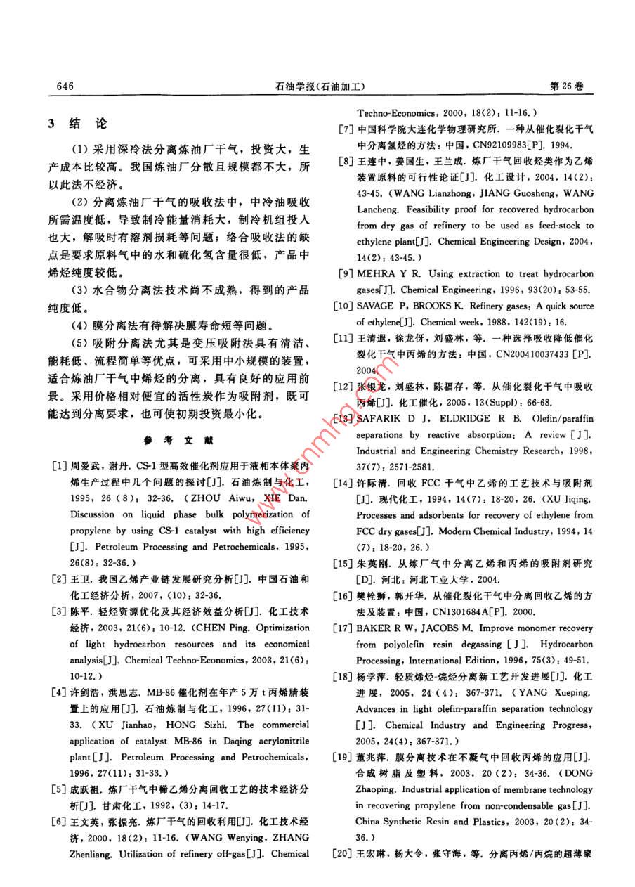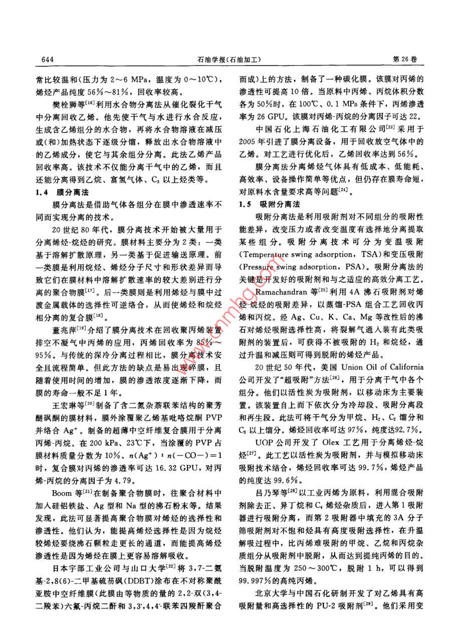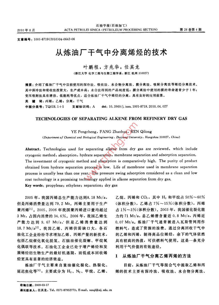 石油學報(石油加T)2010年8月ACTA PETROLEI SINICA (PETROLEUM PROCESSING SECTION)第26卷第4期文章編號: 1001-8719(2010)04-0642-06從煉油廠干氣中分離烯烴的技術(shù)葉鵬程,方兆華,任其龍(浙江大學化學工程與生物工程學系,斷江杭州310027)摘要:介紹了煉油廠干氣中目前使用的深冷法、吸收法、水合物分離法、膜分離法、吸附分離法等烯烴分離技術(shù)。其中深冷法和吸收法投資大,生產(chǎn)成本高;水合法得到的產(chǎn)品純度低;膜分離法中使用的膜的壽命通常少于1年;變樂吸附法具有清潔、低能耗等優(yōu)點,適合煉油廠干氣中烯烴的分離,具有良好的應用前景.關(guān)鍵詞:丙烯;乙烯;分離;氣中圖分類號: TQ028. 1+5文獻標識碼: A doi; 10. 3969/j. issn. 1001-8719. 2010. 04. 027TECHNOLOGIES OF SEPARATING ALKENE FROM REFINERY DRY GASYE Pengcheng, FANG Zhaohua, REN Qilong(Depar/ment of Chemical and Biological Engineering, Zhejiang University, Hangzhou 310027, China)Abstract: Technologies used for separating alkene from dry gas are reviewed, which includecryogenic method, absorption, hydrate separation, membrane separation and adsorption separation.The investment of ceryogenic method and absorption is comparatively high. The purity of productobtained from hydrate separation process is low. Life of membrane used in membrane separationprocess is usually less than one year. The pressure swing adsorption considered as a clean and lowcost technology is a promising technology applied in alkene separation from dry gas.Key words: propylene; ethylene; separation; dry gas2005年,我國丙烯總生產(chǎn)能力達到8.18Mt/a,乙烷、丙烯和CO2,其中H2和甲烷占50%~60%但是丙烯消費量達到79.2 Mt.丙烯主要用于生產(chǎn)(體積分數(shù)),乙烯占7%~15%(體積分數(shù)),丙烯聚丙烯°]。2005、 2006年我國聚丙烯進口量均超過占1%~3%(體積分數(shù))。2003 年,我國催化裂化能3 Mt,占國內(nèi)消費的34. 6%。2006年,我國乙烯生力約71 Mt/a,總乙烯潛含量近0.8 Mt/a,丙烯近產(chǎn)能力達到9. 67 Mt/a,'但是乙烯消費量達到0.07 Mt/a.煉油廠干氣通常被送人瓦斯管網(wǎng)用作18.7 Mt/a[2]。我國乙烯、丙烯供需缺口大,各石燃料氣,造成了資源的浪費。通過分離回收干氣中油化工企業(yè)紛紛尋求增加乙烯、丙烯產(chǎn)量的新技術(shù),的乙烯和丙烯,制得高品位烯烴,余下的氣體依然包括乙烷催化氧化脫氫、石腦油催化裂解、甲烷氧具有 較高的熱值,可供燃料氣使用。這是一條充分化偶聯(lián)等技術(shù)。石油化工企業(yè)已處于增產(chǎn)烯烴和發(fā)利用干氣價值的有效途徑。展烯烴衍生物生產(chǎn)的最好機遇期,而低成本回收烯1從煉油廠干氣分離乙烯丙烯的方法烴更具有顯著的經(jīng)濟效益。煉油廠干氣主要來自重油催化裂化、熱裂化、目前,從煉油廠干氣等混合氣中提取乙烯和丙延遲焦化等),主要成分為H2、N2.甲烷、乙烯、烯的技術(shù)主要有深冷法、 吸收法、水合物分離法、收稿日期: 2009-03-17通訊聯(lián)系人:任其龍,Tel: 0571-87952773; E-mail; renql@zj. edu. cn第4期從煉油廠千氣中分離烯烴的技術(shù)643膜分離法和吸附分離法。其中深冷法、吸收法已非烷撐二醇二烷基醚、N-甲基吡咯酮和環(huán)丁砜的混合常成熟,并實現(xiàn)了工業(yè)化。吸附分離法和膜分離法物,Cg~Co芳烴化合物也可作為該工藝的溶劑。該還處在實驗室研究或工業(yè)試驗階段,有較好的應用工藝需要-40^C的低溫0],所以必須配有丙烯制冷前景。水合物分離法則為新出現(xiàn)的分離方法[4。壓縮機。同時,為了提高Cr組分回收率,在尾氣單1.1深冷法元使用了膨脹-壓縮機.深冷法[1]是利用原料中各組分相對揮發(fā)度的差王清遐等[1發(fā)明了一種通過選擇吸收來脫除催異,通過氣體透平膨脹制冷,在低溫下將煉油廠干化裂化干氣中丙烯的方法。該法利用吸收劑吸收丙氣中各組分冷凝下來,然后以精餾法將各組分依其烯,然后用吹掃氣體對吸收劑進行解吸,使吸收劑蒸發(fā)溫度的不同逐一加以分離的技術(shù)??裳h(huán)使用。所采用的吸收劑為苯、乙苯、二乙苯、由美國Mobil公司和Air Products公司[0)聯(lián)合三乙苯、多乙基苯、柴油和汽油中的一種或幾種的開發(fā)的深冷分離工藝,通過部分冷凝將氣體混合物混合物。千氣和吸收劑的接觸方式為對流形式。吵分離,達到高效分離效果,已于1987 年投入工業(yè)化掃氣體為甲烷、 乙烷、N2、 H2中的一種或幾種的生產(chǎn)。此工藝干氣的烴類回收率98%、乙烯收率混合物。采用此法原料氣無需任何凈化和精制。90%~98%,乙烯純度為聚合級。張銀龍等([12經(jīng)優(yōu)化后選擇乙苯/反烴化料混合中科院大連化學物理研究所[開發(fā)了一種深冷物吸收干氣中的丙烯。反烴化料由質(zhì)量分數(shù)為90%法和膜分離技術(shù)相結(jié)合的工藝,分離出較高純度的的二乙苯、7%的三乙苯和3%的烷基苯組成。結(jié)果乙烯:和丙烯,可以作為化工原料。發(fā)現(xiàn),采用低溫和提高吸收劑/干氣體積比有利于吸深冷法的優(yōu)點為產(chǎn)品純度高、回收率高。但收劑對于氣中丙烯的吸收。吸收劑吸收氣體后,在H2、甲烷組分一般需在一100C低溫下進行深冷分一定條件下可以解吸,吸收劑可循環(huán)使用。利用處離,裝置能耗高,且循環(huán)制冷流程也比較復雜,部理后的干氣制備乙苯,可以明顯降低苯耗,提高乙分設(shè)備需要從國外進口,裝置投資大,適合于大規(guī)基化產(chǎn)物選擇性.模的烯烴生產(chǎn)舊。對于干氣