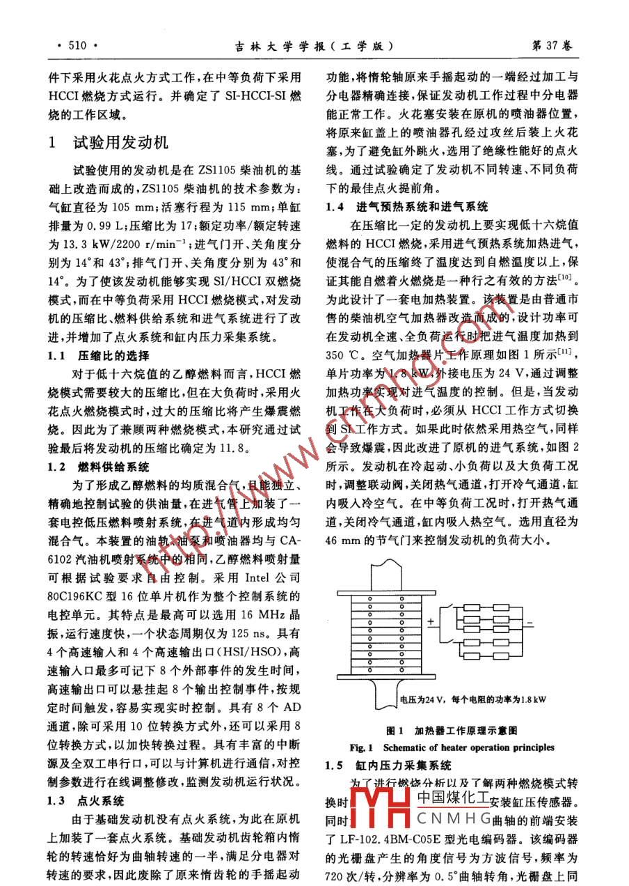 第37卷第3期吉林大學(xué)學(xué)報(bào)(工學(xué)版)Vol 37 No. 32007年5月Journal of Jilin University( Engineering and Technology Edition)May 2007乙醇燃料 SI-HCCⅠSI燃燒模式發(fā)動機(jī)的工作區(qū)域彭亞平,郭英男,劉金山,黃為釣,譚滿志,許艷軍(吉林大學(xué)汽車工程學(xué)院,長春130022)摘要:為了研究火花點(diǎn)火和均質(zhì)壓燃兩種燃燒方式的轉(zhuǎn)換,在一臺ZS1105柴油發(fā)動機(jī)的基礎(chǔ)上通過改變壓縮比、燃料供給方式和進(jìn)氣系統(tǒng),采用進(jìn)氣預(yù)熱成功實(shí)現(xiàn)了HCCI和SI兩種燃燒方式的轉(zhuǎn)換。試驗(yàn)結(jié)果表明:所開發(fā)的雙燃燒模式發(fā)動機(jī)運(yùn)行可靠,可方便地實(shí)現(xiàn)火花點(diǎn)火和均質(zhì)壓燃兩種燃燒方式的轉(zhuǎn)換,可作為研究這兩種燃燒方式轉(zhuǎn)換的平臺。確定了乙醇燃料HCCⅠ工作區(qū)域的上、下邊界判斷方法,得到了乙醇燃料 SI-HCCI-SI燃燒的工作區(qū)域。關(guān)鍵詞:動力機(jī)械工程;發(fā)動機(jī);乙醇;雙燃燒模式;工作區(qū)域中圖分類號:TK46文獻(xiàn)標(biāo)識碼:A文章編號:1671-5497(2007)03-050904Operation region of ethanol SI-HCCI-SI combustion mode enginePeng Ya-ping, Guo Ying-nan, Liu Jin-shan, Huang Wei-jun, Tan Man-zhi, Xu Yan-junCollege of Automotive Engineering, Jilin University, Changchun 130022, China)Abstract: In order to investigate the engine combustion mode switchover between the spark ignition(SI) combustion and the homogeneous charge compression ignition(HCCI) combustion, a test enginewas developed from refitting the ZS1105 series production diesel engine by modification of thecompression ratio, the fuel supply system, and the intake system. By means of the adjustment of theintake charge preheating, the dual combustion mode switchover was realized smoothly on the testengine, which can be used as a platform for investigation of such combustion mode switchover. Thecriteria to distinguish the upper and lower boundaries of HCCi combustion were defined and theoperation regions of the ethanol si-HCCi-si combustion modes were obtainedKey words: power machinery and engineering; engine; ethanol; dual combustion mode; operation region均質(zhì)壓燃(HCCⅠ綜合了點(diǎn)燃和壓燃兩種燃容易發(fā)生失火;而發(fā)動機(jī)處于大負(fù)荷時,由于混合燒方式的優(yōu)點(diǎn),取消了節(jié)氣門,泵氣損失小,采用氣加濃,過快的化學(xué)反應(yīng)速度將產(chǎn)生爆震燃燒。均質(zhì)稀混合氣壓燃著火,燃燒溫度低,因此NO2因此在全工況范圍內(nèi)實(shí)現(xiàn)HCCI燃燒非常困和碳煙排放極低。研究表明,均質(zhì)壓燃燃燒的化難。為了能使發(fā)動機(jī)在全工況范圍內(nèi)運(yùn)行,在學(xué)反應(yīng)速度主要由混合氣的化學(xué)反應(yīng)動力學(xué)控小負(fù)荷、大負(fù)荷工況下采用SI方式,在中等負(fù)荷制1-,燃燒幾乎是同步的,控制HCCI著火燃燒工況下采用HCCI方式是切實(shí)可行的方法的方法之一是使用稀混合氣。但過稀的混合基于此,作者介紹了一套雙燃燒模式的發(fā)動氣在小負(fù)荷時發(fā)動機(jī)難以形成穩(wěn)定的著火條件,機(jī)系V凵中國煤化工荷以及大負(fù)荷條收稿日期:2006-04-03CNMHG基金項(xiàng)目:“973”國家重點(diǎn)基礎(chǔ)研究發(fā)展規(guī)劃資助項(xiàng)目(2001CB209206);國家自然科學(xué)基金資助項(xiàng)目(50476007)作者簡介:彭亞平(1980-),男博士研究生研究方向:內(nèi)燃機(jī)新能源與代用燃料技術(shù)Emal:sinai2002@163.com通訊聯(lián)系人:劉金山(1963-),男,教授研究方向:內(nèi)燃機(jī)新能源及代用燃料E-mail:jiandingzhan@)jlu.edu.cn510吉林大學(xué)學(xué)報(bào)(工學(xué)版)第37卷件下采用火花點(diǎn)火方式工作,在中等負(fù)荷下采用功能將情輪軸原來手搖起動的一端經(jīng)過加工與HCCI燃燒方式運(yùn)行。并確定了 SI-HCCI-SI燃分電器精確連接,保證發(fā)動機(jī)工作過程中分電器燒的工作區(qū)域。能正常工作。火花塞安裝在原機(jī)的噴油器位置,1試驗(yàn)用發(fā)動機(jī)將原來缸蓋上的噴油器孔經(jīng)過攻絲后裝上火花塞,為了避免缸外跳火,選用了絕緣性能好的點(diǎn)火試驗(yàn)使用的發(fā)動機(jī)是在ZS1105柴油機(jī)的基線。通過試驗(yàn)確定了發(fā)動機(jī)不同轉(zhuǎn)速、不同負(fù)荷礎(chǔ)上改造而成的,ZS1105柴油機(jī)的技術(shù)參數(shù)為:下的最佳點(diǎn)火提前角。氣缸直徑為105mm;活塞行程為115mm;單缸1.4進(jìn)氣預(yù)熱系統(tǒng)和進(jìn)氣系統(tǒng)排量為0.99L;壓縮比為17;額定功率/額定轉(zhuǎn)速在壓縮比一定的發(fā)動機(jī)上要實(shí)現(xiàn)低十六烷值為13.3kW/2200/min-1;進(jìn)氣門開、關(guān)角度分燃料的HCCI燃燒,采用進(jìn)氣預(yù)熱系統(tǒng)加熱進(jìn)氣別為14°和43°;排氣門開、關(guān)角度分別為43°和使混合氣的壓縮終了溫度達(dá)到自燃溫度以上,保14°。為了使該發(fā)動機(jī)能夠?qū)崿F(xiàn)SI/HCCI雙燃燒證其能自燃著火燃燒是一種行之有效的方法0。模式,而在中等負(fù)荷采用HCCⅠ燃燒模式,對發(fā)動為此設(shè)計(jì)了一套電加熱裝置。該裝置是由普通市機(jī)的壓縮比、燃料供給系統(tǒng)和進(jìn)氣系統(tǒng)進(jìn)行了改售的柴油機(jī)空氣加熱器改造而成的,設(shè)計(jì)功率可進(jìn),并增加了點(diǎn)火系統(tǒng)和缸內(nèi)壓力采集系統(tǒng)。在發(fā)動機(jī)全速、全負(fù)荷運(yùn)行時把進(jìn)氣溫度加熱到1.1壓縮比的