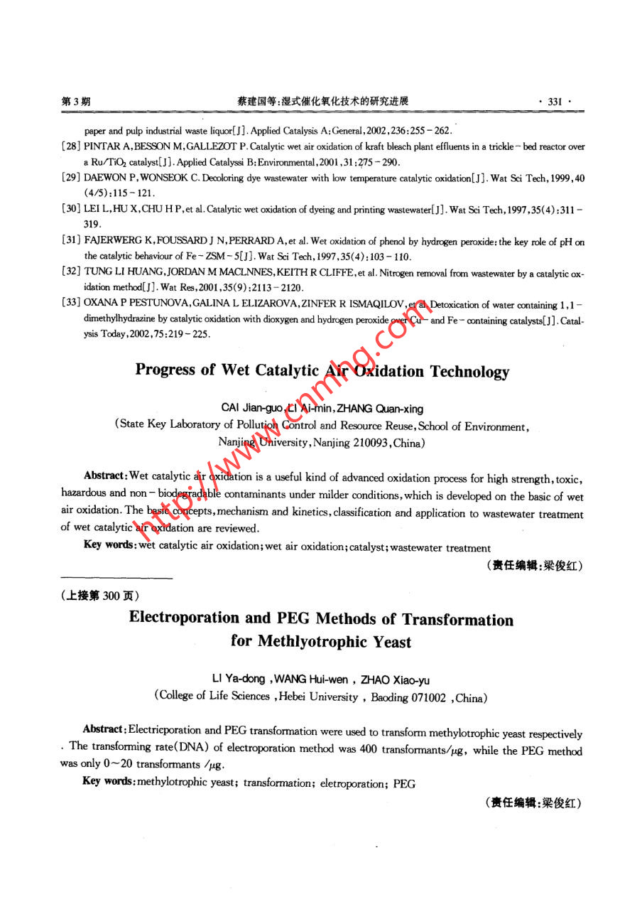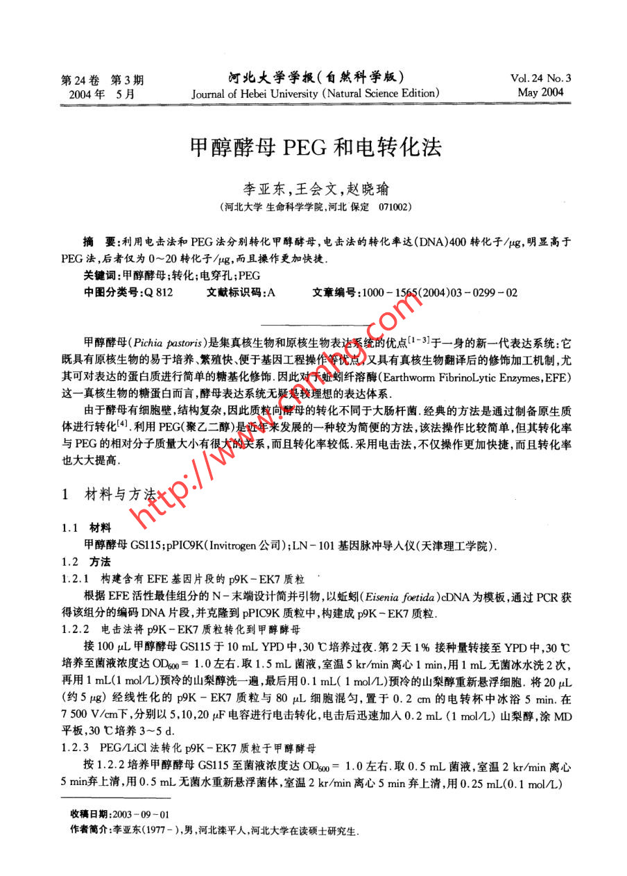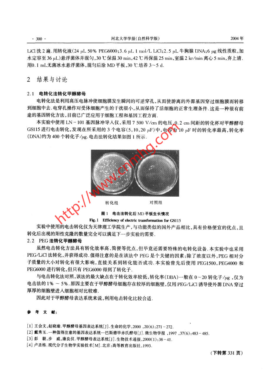 第24卷第3期河北大學學報(自然科學版)Vol.24 No.32004年5月Journal of Hebei University (Natural Science Edition)May 2004甲醇酵母PEG和電轉化法李亞東,王會文,趙曉瑜(河北大學生命科學學院,河北保定07102)摘要:利用電擊法和PEG法分別轉化甲醇酵母,電擊法的轉化率達(DNA)400轉化子/rg,明顯高于PEG法,后者僅為0~20轉化子/pg,而且操作更加快捷.關鍵詞:甲醇酵母;轉化;電穿孔;PEG中圖分類號:Q 812文獻標識碼:A文章編號:1000- 1565(2004)03 - 0299-02甲醇酵母( Pichia pastoris )是集真核生物和原核生物表達系統(tǒng)的優(yōu)點[41-3]于- -身的新- -代表達系統(tǒng):它既具有原核生物的易于培養(yǎng)繁殖快、便于基因工程操作等優(yōu)點,又具有真核生物翻譯后的修飾加工機制,尤其可對表達的蛋白質進行簡單的糖基化修飾.因此對于蚯蚓纖溶酶( Earthworm FibrinoLytie Enzymes, EFE)這-真核生物的糖蛋白而言,酵母表達系統(tǒng)無疑是較理想的表達體系.由于酵母有細胞壁,結構復雜,因此質粒向酵母的轉化不同于大腸桿菌.經(jīng)典的方法是通過制備原生質體進行轉化[41.利用PEG(聚乙二醇)是近年來發(fā)展的- -種較為簡便的方法,該法操作比較簡單,但其轉化率與PEG的相對分子質量大小有很大的關系,而且轉化率較低.采用電擊法,不僅操作更加快捷,而且轉化率也大大提高.1材料與方法1.1 材料甲醇酵母GS115;pPIC9K( Iitrogen公司);LN- 101基因脈沖導入儀(天津理I學院).1.2方法1.2.1構建含有 EFE基因片段的p9K-EK7質粒根據(jù)EFE活性最佳組分的N-末端設計簡并引物,以蚯蚓( Eisenia foetida )cDNA為模板,通過PCR獲得該組分的編碼DNA片段,并克隆到pPIC9K質粒中,構建成p9K - EK7質粒.1.2.2 電擊法將p9K - EK7質粒轉化到甲醇酵母接100 μ甲醇酵母GS115于10 mL YPD中,30 C培養(yǎng)過夜.第2天1%接種量轉接至YPD中,30 C培養(yǎng)至菌液濃度達ODo0= 1.0左右.取1.5 mL菌液,室溫5 kr/min離心1 min,用1 mL無菌冰水洗2次,再用1 mL(1 mol/L)}預冷的山梨醇洗-遍,最后用0.1 mL( 1 mol/L)預冷的山梨醇重新懸浮細胞.將20山(約5ug)經(jīng)線性化的p9K- EK7質粒與80 uL細胞混勻,置于0.2 cm的電轉杯中冰浴5 min. 在7 500 V/cm下,分別以5,10,20 pF電容進行電擊轉化,電擊后迅速加入0.2 ml (1 mol/L)山梨醇,徐MD平板,30 C培養(yǎng)3~5 d.1.2.3 PEG/LiCl 法轉化p9K- EK7質粒于甲醇酵母按1.2.2培養(yǎng)甲醇酵母GS115至菌液濃度達0D00= 1.0左右.取0.5 mL菌液,室溫2 kr/min離心5min棄上清,用0.5mL無菌水重新懸浮菌體,室溫2kr/min離心5min棄上清,用0.25mL(0.1mol/L)收稿日期:2003 -09 -01作者簡介:李亞東(1977- ),男,河北灤平人,河北大學在讀碩:士研究生.第3期蔡建國等:濕式催化氧化技術的研究進展●331peper and pulp industrial waste liquor[J]. Applied Catalysis A:General,2002 ,236:255 - 262.[28] PINTAR A,BESSON M,GALLEZOT P.Catalytic wet air oxidation of kraft bleach plant efluents in a trickle - bed reactor overa Ru/TiO2 catalyst[J]. Applied Catalyssi B: Enironmental,2001 ,31 :275 - 290.[29] DAEWON P,WONSEOK C. Decoloring dye wastewater with low temperature catalytic oxidation[J]. Wat Sci Tech, 199,40(4/5):115- 121.[30] LEI L,HU X,CHU H P,et al. Catalytic wet oxidation of dyeing and printing wastewater[]. Wat Sci Tech, 1997, 35(4):311-319.[31] FAJERWERG K,FOUSSARD J N,PERRARD A,et al. Wet oxidation of phenol by hydrogen peroxide:the key role of pH on .the catalytic behaviour of Fe- ZSM - 5[J]. Wat Sci Tech, 1997 ,35(4):103- 110.[32] TUNG LI HUANG,JORDAN M MACLNNES,KEITH R CLIFFE,et al. Nitrogen removal from wastewater by a catalytic ox-idation method[J]. Wat Res, 2001 ,35(9):2113- 2120.[33] 0XANA P PESTUNOVA,GALINA L ELIZAROVA,ZINFER R ISMAILOV ,et al. Detorication of water cntaining1,1-dimethyIhydrazine by ctalyic oxidation with dioxygen and hydrogen peroxide over Cu- and Fe- ontaing calyts[J]. Catal.ysis Today ,2002,75:219 - 225.Progress of Wet Catalytic Air Oxidation TechnologyCAI Jian-guo,LI Ai-min,ZHANG Quan-xing(State Key Laboratory of Pllution Control and Resource Reuse, School of Environment,Nanjing University , Nanjing 210093,China)Abstract:Wet catalytic air oxidation is a useful kind of advanced oxidation process for high srength, toxic,hazardous and non- biodegradable contaminants under milder conditions, which is developed on the basic of wetair oxidation. The basic concepts,mechanism and kinetis, cssicationn and aplication to wastewater treatmentof wet catalytic air oxidation are reviewed.Key words:wet catalytic air oxidation; wet air oxidation;catalyst; wastewater treatment(責任編輯:梁俊紅)(上接第300頁)Electroporation and PEG Methods of Transformationfor Methlyotrophic YeastLI Ya-dong ,WANG Hui-wen,ZHAO Xiao-yu(Colle of Life Sciences ,Hebei University , Baoding 071002 ,China)Astrat:letricporation and PEG transformation were used to transform methylotrophic yest rspetively .The ransforming rate(DNA) of etroporation method was 400 tasomants/ug, while the PEG methodwas only 0~ 20 transformants /pg.Key words:methylotrophic yeast; transformation; eletroporation; PEG