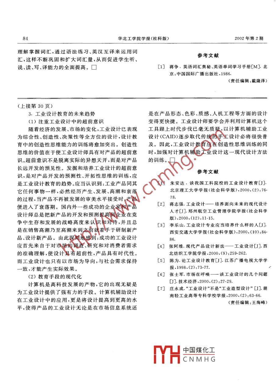 華北工學(xué)院學(xué)報(bào)(社科版)8JOURNAL OF NORTH CHINA INSTITUTE OF TECHNOLOGY(Social Sciences)2002年第2期工業(yè)設(shè)計(jì)與工業(yè)設(shè)計(jì)教育王俊元王旭東段能全(華北工學(xué)院機(jī)械工程系.山西太原030051)摘要:針對(duì)我國(guó)工業(yè)領(lǐng)域?qū)I(yè)設(shè)計(jì)的模糊認(rèn)識(shí),闡述了工業(yè)設(shè)計(jì)的產(chǎn)生、內(nèi)涵。在此基礎(chǔ)上,指出工業(yè)設(shè)計(jì)的本質(zhì)是產(chǎn)品設(shè)計(jì),產(chǎn)品設(shè)計(jì)應(yīng)遵循實(shí)用、經(jīng)濟(jì)、美觀的設(shè)計(jì)原則。其次,論述了工業(yè)設(shè)計(jì)的作用。最后,結(jié)合進(jìn)行工業(yè)設(shè)計(jì)專業(yè)建設(shè)的實(shí)際,分析了工業(yè)設(shè)計(jì)教育的發(fā)展過(guò)程、教育特征、教育模式和未來(lái)趨勢(shì)。關(guān)鍵詞:工業(yè)設(shè)計(jì);產(chǎn)品設(shè)計(jì):工業(yè)設(shè)計(jì)教育中圖分類(lèi)號(hào):TB47文獻(xiàn)標(biāo)識(shí)碼:A文章編號(hào): 1009-4520(2002)02-0028-04Industrial Design and Industrial Designing EducationWANG Jun-yuan, WANG Xu-dong &. DUAN Neng quan(Dept. of Mechanical Engineering, North China instiute of Technology, 030051 Taiyuan)Abstract: To clarify the obscure cognition of industrial design in industry field, this paper discusses thegeneration and intension of industrial design. As the essence of industrial design,product design must obey thepractical, economical and beautiful rules. Besides, it discusses the efect of industrial design. Combining thepractices of constructing industrial design major, it analyzes the development,characteristics, patterns and fu-ture trends of industrial designing education.Keywords : industrial design; product design; industrial designing education引言設(shè)計(jì)教育,這是已經(jīng)開(kāi)設(shè)和正在建立該專業(yè)的工科越來(lái)越多的人認(rèn)識(shí)到:未來(lái)的競(jìng)爭(zhēng)是高科技的院校所共同關(guān)心的問(wèn)題。筆者結(jié)合近年來(lái)進(jìn)行工業(yè)競(jìng)爭(zhēng)。高科技只有通過(guò)工業(yè)設(shè)計(jì)才能變成商品,才有設(shè)計(jì)專業(yè)建設(shè)的體會(huì),就工業(yè)設(shè)計(jì)及其教育談幾點(diǎn)競(jìng)爭(zhēng)力。而工業(yè)設(shè)計(jì)人才的培養(yǎng)在于工業(yè)設(shè)計(jì)的教個(gè)人的認(rèn)識(shí)與看法。育。從這一點(diǎn)看,一個(gè)國(guó)家的工業(yè)設(shè)計(jì)教育水平如何一、工業(yè)設(shè)計(jì)的產(chǎn)生將直接影響到這個(gè)國(guó)家的工業(yè)設(shè)計(jì)的發(fā)展。在18世紀(jì)末和19世紀(jì)初的產(chǎn)業(yè)革命以后,隨工業(yè)設(shè)計(jì)教育進(jìn)人我國(guó)的年頭還不長(zhǎng),較有規(guī)著生產(chǎn)制造方式的變革,工業(yè)設(shè)計(jì)應(yīng)運(yùn)而生.工業(yè)設(shè)模地開(kāi)展工業(yè)設(shè)計(jì)教育僅有十多年。國(guó)家教育部對(duì)計(jì)是一門(mén)專門(mén)研究工業(yè)產(chǎn)品在“人一機(jī)(產(chǎn)普通高校專業(yè)目錄的調(diào)整使許多院校為了機(jī)械類(lèi)學(xué)品)--環(huán)境 ”系統(tǒng)中如何尋求最優(yōu)化的學(xué)科。它把科的發(fā)展,把目光對(duì)準(zhǔn)了工業(yè)設(shè)計(jì)專業(yè),又一次掀起產(chǎn)品置于“人、社會(huì)環(huán)境和自然環(huán)境”的設(shè)計(jì)環(huán)境中,了建立工業(yè)設(shè)計(jì)專業(yè)的高潮。工業(yè)設(shè)計(jì)是技術(shù)與藝探求中國(guó)煤化工t會(huì)的需求和自然環(huán)術(shù)相交匯的一個(gè)學(xué)科,可在工科院校里開(kāi)設(shè),也可在境的YHCNMHG藝術(shù)院校里開(kāi)設(shè)。在我國(guó)工科院校應(yīng)如何開(kāi)展工業(yè)工業(yè)設(shè)計(jì)產(chǎn)生的主要目的是針對(duì)工業(yè)化以來(lái)存收稿日期:2001-12-04作者簡(jiǎn)介:王俊元(1968-),男,山西繁峙人,在讀工學(xué)博士,講師。2002年第2期工業(yè)設(shè)計(jì)與工業(yè)設(shè)計(jì)教育(王俊元等)29在的“以機(jī)器為本”和“以無(wú)限享受”為目的的生產(chǎn)方- - ,美觀第二,經(jīng)濟(jì)是約束條件,但這并不是說(shuō)美觀式的弊病和缺陷,提出“以人為本”和“以自然為本”就不重要,因?yàn)槊缹?shí)在是一.種擋不住的誘惑;除非產(chǎn)的技術(shù)哲學(xué)觀,探索人與物的關(guān)系,規(guī)劃設(shè)計(jì)未來(lái)的品在市場(chǎng)上供不應(yīng)求,只要有一點(diǎn)選擇余地,人們就工作概念、生活概念、交通概念、能源概念,在這種長(zhǎng)會(huì)貨比三家,選擇精致、耐用、美觀的產(chǎn)品。遠(yuǎn)規(guī)劃的考慮下設(shè)計(jì)各種具體產(chǎn)品和環(huán)境。(3)產(chǎn)品設(shè)計(jì)必須以人為中心.隨著科技的發(fā)展和社會(huì)的進(jìn)步,工業(yè)設(shè)計(jì)在現(xiàn)早在20世紀(jì)初,工業(yè)設(shè)計(jì)的創(chuàng)始人瓦爾特●格代社會(huì)中的作用日趨重要。羅皮烏斯就提出“設(shè)計(jì)的目的是人而不是產(chǎn)品”的基二、工業(yè)設(shè)計(jì)的內(nèi)涵本原則,人體尺寸是工業(yè)設(shè)計(jì)最重要的參考系。不同工業(yè)設(shè)計(jì)的對(duì)象是工業(yè)機(jī)械化生產(chǎn)出來(lái)的批量國(guó)家和地區(qū)人體尺寸不同,因此在設(shè)計(jì)和引進(jìn)國(guó)外產(chǎn)品,不是手工業(yè)生產(chǎn)的產(chǎn)品;設(shè)計(jì)的
