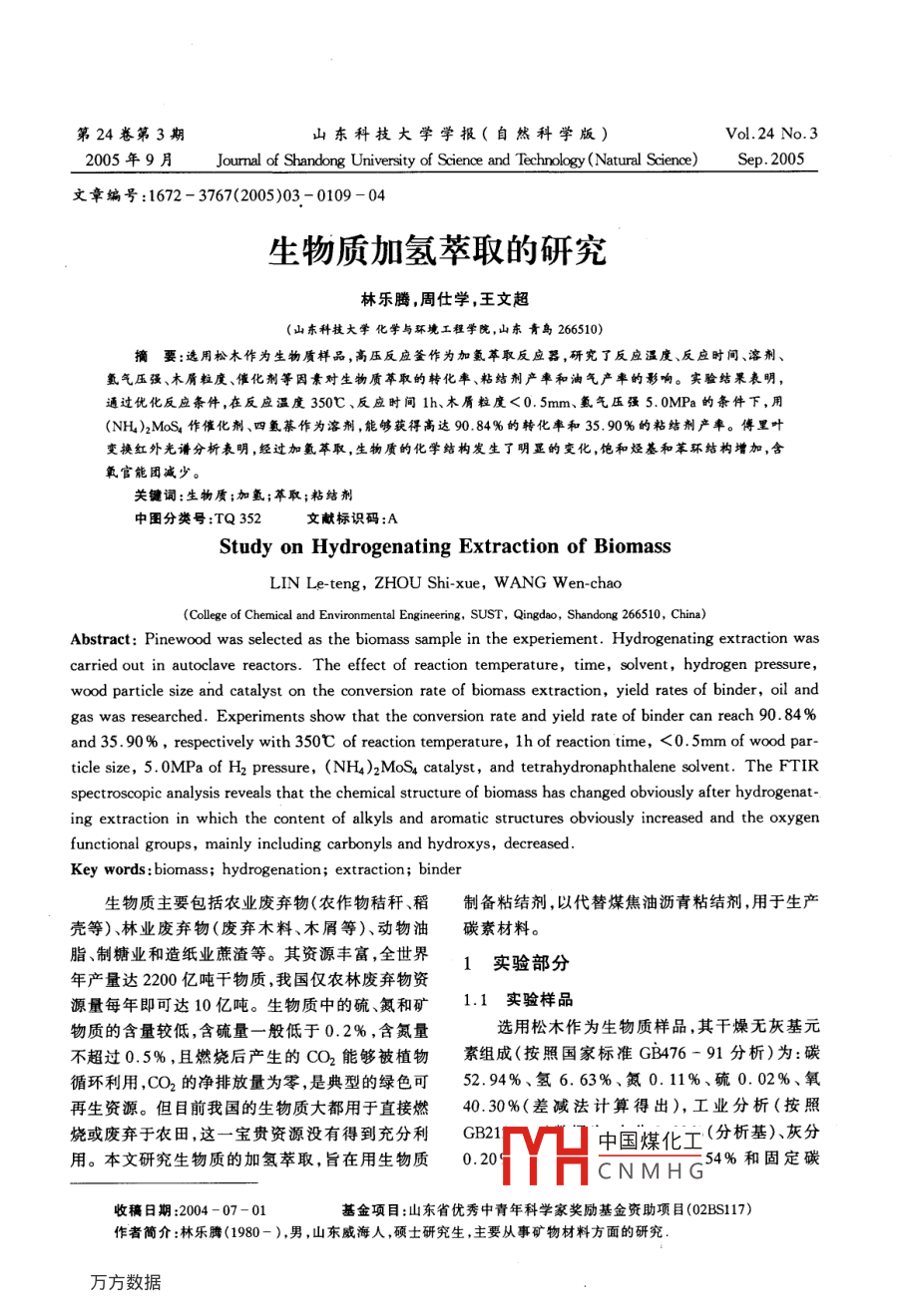 第24卷第3期山東科技大學(xué)學(xué)報(自然科學(xué)版)Vol. 24 No. 32005 49 a Journal of Shandong University of Science and Technology( Natural Science)ep.2005文章編號:1672-3767(2005)03-0109-04生物質(zhì)加氫萃取的研究林樂騰,周仕學(xué),王文超(山東科技大學(xué)化學(xué)與環(huán)境工程學(xué)院,山東青島266510摘要:選用松木作為生物質(zhì)樣品,高壓反應(yīng)釜作為加氨萃取反應(yīng)器,研究了反應(yīng)溫度、反應(yīng)時間、溶劑、氫氣壓強、木屑粒度、催化劑等因素對生物質(zhì)革取的轉(zhuǎn)化率、粘結(jié)劑產(chǎn)率和油氣產(chǎn)率的影響。實驗結(jié)果表明,通過優(yōu)化反應(yīng)條件,在反應(yīng)溫度350℃、反應(yīng)時間1h、木屑粒度<0.5mm、氣壓強5.0MPa的條件下,用(NH)2MoS4作催化劑、四氫幕作為溶劑能夠獲得高達9.84%的轉(zhuǎn)化率和35.90%的粘結(jié)劑產(chǎn)率。傅里葉變換紅外光譜分析表明,經(jīng)過加氬萃取,生物質(zhì)的化學(xué)結(jié)構(gòu)發(fā)生了明罡的變化,飽和烴基和環(huán)結(jié)構(gòu)增加,含氧官能團減少。關(guān)鍵詞:生物質(zhì);加;革取;粘結(jié)劑中圖分類號:TQ352文獻標(biāo)識碼:AStudy on Hydrogenating Extraction of BiomassLIN Le-teng, ZHOU Shi-xue, WANG Wen-chaocollege of Chemical and Environmental Engineering, SUST, Qingdao, Shandong 266510, China)Abstract: Pinewood was selected as the biomass sample in the experiement. Hydrogenating extraction wascarried out in autoclave reactors. The effect of reaction temperature, time, solvent, hydrogen pressure,wood particle size and catalyst on the conversion rate of biomass extraction, yield rates of binder, oil andgas was researched. Experiments show that the conversion rate and yield rate of binder can reach 90.84%6and 35.90%, respectively with 350C of reaction temperature, Ih of reaction time, <0. 5mm of wood particle size, 5.OMPa of H2 pressure,(NH4) MoS4 catalyst, and tetrahydronaphthalene solvent. The FTIRspectroscopic analysis reveals that the chemical structure of biomass has changed obviously after hydrogenatng extraction in which the content of alkyls and aromatic structures obviously increased and the oxygenfunctional groups, mainly including carbonyls and hydroxy, decreasedKey words: biomass; hydrogenation; extraction; binder生物質(zhì)主要包括農(nóng)業(yè)廢棄物(農(nóng)作物秸稈、稻制備粘結(jié)劑,以代替煤焦油瀝青粘結(jié)劑,用于生產(chǎn)殼等)、林業(yè)廢棄物(廢棄木料、木屑等)動物油碳素材料。脂、制糖業(yè)和造紙業(yè)蔗渣等。其資源豐富,全世界1實驗部分年產(chǎn)量達2200億噸干物質(zhì),我國僅農(nóng)林廢棄物資源量每年即可達10億噸。生物質(zhì)中的硫、氮和礦1.1實驗樣品物質(zhì)的含量較低,含硫量一般低于0.2%,含氮量選用松木作為生物質(zhì)樣品,其干燥無灰基元不超過05%,且燃燒后產(chǎn)生的CO2能夠被植物素組成(按照國家標(biāo)準(zhǔn)GB476-91分析)為:碳循環(huán)利用,CO2的凈排放量為零,是典型的綠色可52.94%、氫6.63%、氮0.11%、硫002%、氧再生資源。但目前我國的生物質(zhì)大都用于直接燃40.30%(差減法計算得出),工業(yè)分析(按照燒或廢棄于農(nóng)田,這一寶貴資源沒有得到充分利GB21中國煤化工(分析基)灰分用。本文研究生物質(zhì)的加氫萃取,旨在用生物質(zhì)0.20CNMHG54%和固定碳收稿日期:2004-07-01基金項目:山東省優(yōu)秀中青年科學(xué)家獎勵基金資助項目(02BS117)作者簡介:林樂騰(1980-),男,山東威海人,碩士研究生,主要從事礦物材料方面的研究110山東科技大學(xué)學(xué)報(自然科學(xué)版)第24卷20.26%(千燥無灰基)下,有利于生物質(zhì)中大分子碳氫化合物的裂解,使1.2實驗方法其轉(zhuǎn)變成小分子氣體,從而獲得較高的轉(zhuǎn)化率和實驗采用100mL的高壓反應(yīng)釜作為反應(yīng)器,油氣產(chǎn)率;此外,高溫下萃取產(chǎn)物中的游離基具有用流化床沙浴加熱,用垂直震蕩器進行攪拌(攪拌較高的化學(xué)活性,發(fā)生劇烈的縮聚反應(yīng),從而導(dǎo)致速度為240次/min)。反應(yīng)產(chǎn)物用正己烷和四氫粘結(jié)劑產(chǎn)率降低。本研究中,粘結(jié)劑是主要的目呋喃溶劑在索氏抽提器內(nèi)進行分離,得到油和粘的產(chǎn)物,可選取350℃作為最佳反應(yīng)溫度。反應(yīng)結(jié)劑組分,并計算轉(zhuǎn)化率粘結(jié)劑產(chǎn)率、油氣(氣體時間對木屑的轉(zhuǎn)化沒有明顯的影響(表1),表明和正己烷可溶物)產(chǎn)率。所有實驗都進行了重復(fù)萃取轉(zhuǎn)化為快速的化學(xué)反應(yīng),但考慮到粘結(jié)劑化操作,以確保數(shù)據(jù)的可靠性轉(zhuǎn)化率和產(chǎn)率的偏差學(xué)結(jié)構(gòu)的穩(wěn)定性反應(yīng)時間選取60mn比較合適。范圍為±3%一轉(zhuǎn)化率為了獲得較高的粘結(jié)劑產(chǎn)率和轉(zhuǎn)化率,實驗油氣產(chǎn)率粘結(jié)劑產(chǎn)率對以下條件進行了探索:溫度(250℃~400℃)、反應(yīng)時間(20~100min)、溶劑種類(四氫萘、甲苯和00000喹啉)、氫氣壓強(0~7MPa)、木屑粒度(0.0750.5mm)、催化劑(FeSO4·7H2O、(NH4)2MS4和K2MoS4)。采用傅里葉變換紅外光譜儀FTIR(型號為溫度℃Thermo- Nicolet Nexus670)對松木和加氫萃取產(chǎn)物的正己烷不溶物進行了分析,被測樣本由圖1反應(yīng)溫度對萃取結(jié)果的影響Fig 1 Effect of reaction temperature on extracting results0.3g的溴化鉀晶體和0.0003g樣品混合研磨后壓片制得。表1反應(yīng)時間對萃取結(jié)果的影響Table 1 Effect of reaction time on extr