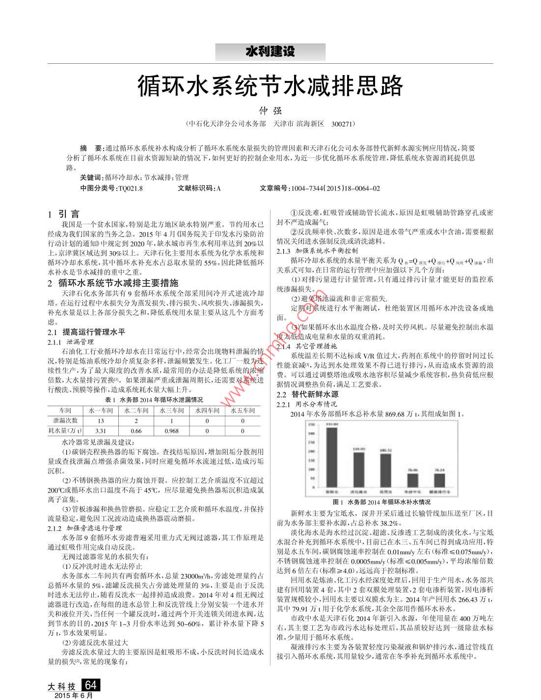 水利建設(shè)循環(huán)水系統(tǒng)節(jié)水減排思路仲強(qiáng)(中石化天津分公司水務(wù)部天津市濱海新區(qū)300271)摘要:通過循環(huán)水系統(tǒng)補(bǔ)水構(gòu)成分析了循環(huán)水系統(tǒng)水量損失的管理因素和天津石化公司水務(wù)部替代新鮮水源實(shí)例應(yīng)用情況,簡要分析了循環(huán)水系統(tǒng)在目前水資源短缺的情況下,如何更好的控制企業(yè)用水,為近一步優(yōu)化循環(huán)水系統(tǒng)管理,降低系統(tǒng)水資源消耗提供思關(guān)鍵詞:循環(huán)冷卻水;節(jié)水誠排:管理中圖分類號:TQ021.8文獻(xiàn)標(biāo)識碼:A文章編號:1004-7344(2015)8-006401引言①反洗難,虹吸管或輔助管長流水,原因是虹吸輔助管路穿孔或密我國是一個貧水國家特別是北方地區(qū)缺水特別嚴(yán)重。節(jié)約用水已封不嚴(yán)造成漏氣經(jīng)成為我們國家的當(dāng)務(wù)之急。2015年4月《務(wù)院關(guān)于印發(fā)水污染防治②反洗頻率快、次數(shù)多,原因是進(jìn)水帶氣嚴(yán)重或水中含油,需要根據(jù)行動計(jì)劃的通知》中規(guī)定到2020年,缺水城市再生水利用率達(dá)到2%以情況關(guān)閉進(jìn)水強(qiáng)制反洗或清洗濾料。上,京津冀區(qū)域達(dá)到3%以上。天津石化主要用水系統(tǒng)為化學(xué)水系統(tǒng)和213加強(qiáng)系統(tǒng)水平街控制循環(huán)冷卻水系統(tǒng),其中循環(huán)水補(bǔ)充水占總?cè)∷康?5%,因此降低循環(huán)循環(huán)冷卻水系統(tǒng)的水量平衡關(guān)系為Q。三Q+Q作+Q+Q函,由水補(bǔ)水是節(jié)水減排的重中之重。關(guān)系式可知,在日常的運(yùn)行管理中應(yīng)加強(qiáng)以下幾個方面2循環(huán)水系統(tǒng)節(jié)水減排主要措施(1)對排污量進(jìn)行計(jì)量管理,只有通過排污計(jì)量才能更好的監(jiān)控系天津右化水務(wù)部其有9套循環(huán)水系統(tǒng)全部采用間冷開式逆流冷卻統(tǒng)滲漏攪失塔。在運(yùn)行過程中水損失分為蒸發(fā)損失、排污損失、風(fēng)吹損失、滲漏損失,(2)避免塔池溢流和非正常損失補(bǔ)充水量是以上各部分損失之和,降低系統(tǒng)用水量主要從這幾個方面考定期對系統(tǒng)進(jìn)行水平衡測試,杜絕裝置區(qū)用循環(huán)水沖洗設(shè)備或地2.1提高運(yùn)行管理水平(3)如果循環(huán)水出水溫度合格,及時關(guān)停風(fēng)機(jī)。盡量避免控制出水溫2.1.1泄漏管理度太低造成電量和水量的雙重消耗石油化工行業(yè)循環(huán)冷卻水在日常運(yùn)行中,經(jīng)常會出現(xiàn)物料泄漏的情2.14其它管理措施況,特別是煉油系統(tǒng)冷卻介質(zhì)復(fù)雜多樣,泄漏頻繁發(fā)生?;S一般為連系統(tǒng)溫差長期不達(dá)標(biāo)或VR值過大,藥劑在系統(tǒng)中的停留時間過長續(xù)性生產(chǎn),為了最太限度的改水屬最常用的辦法是降低系統(tǒng)的濃縮費(fèi),可以通過調(diào)整培泡成吸水池容積盡量減少系容積,熱負(fù)荷低應(yīng)根倍數(shù),大水量排污置換,如果泄漏嚴(yán)重或泄漏周期長還諾要對系統(tǒng)進(jìn)據(jù)情況調(diào)整熱負(fù)街,滿足工藝要求行酸洗、預(yù)膜等操作,造成系統(tǒng)耗水量大幅上升。2.2替代新鮮水源表1水務(wù)部2014年循環(huán)水泄漏情況22.1用水分布情況車間水一車間水二車間水三車間水四車間水五車間014年水務(wù)部循環(huán)水總補(bǔ)水量869.68萬t,其組成如圖1泄漏次數(shù)耗水量O萬D)3310.968水冷器常見泄漏及建議1)碳鋼殼程換熱器的垢下腐蝕。査找結(jié)垢原因,增加阻垢分散劑用量或査找泄漏點(diǎn)増強(qiáng)殺菌效果,同時應(yīng)避免循環(huán)水流速過低,造成污垢(2)不銹鋼換熱器的應(yīng)力腐蝕開裂。應(yīng)控制工藝介質(zhì)溫度不宜超過200℃或循環(huán)水出口溫度不高于45℃,應(yīng)盡量避兔換熱器垢沉積造成氯圖1水務(wù)部2014年循環(huán)水補(bǔ)水情況(3)管板滲漏和換熱管磨損。應(yīng)穩(wěn)定工藝介質(zhì)和循環(huán)水溫度,并保持流量穩(wěn)定,避免因工況波動造成換熱器震動磨損。新鮮水主要為寶坻水,深井開采后通過長輸管線加壓送至廠區(qū),目2.1.2加強(qiáng)旁濾運(yùn)行管理前為水務(wù)部主要補(bǔ)水源,占總補(bǔ)水382%水務(wù)部套循環(huán)水旁濾普遍采用重力式無閥過濾器,其工作原理是水混合補(bǔ)充到循環(huán)水系統(tǒng)中,目前已在水三、五車間已得到成功應(yīng)用特通過虹吸作用完成自動反洗無閥過濾器常見的水損失有:別是水五車間,碳鋼腐蝕速率控制在001mmy左右(標(biāo)準(zhǔn)≤0.075mmy)(1)反沖洗時進(jìn)水無法停止不銹鋼腐蝕速率控制在0.0005my(標(biāo)準(zhǔn)≤0005mm/y),平均濃縮倍數(shù)水務(wù)部水二車間共有兩套循環(huán)水,總量23000mh,旁濾處理量約占達(dá)到6倍左右(標(biāo)準(zhǔn)≥40),遠(yuǎn)遠(yuǎn)高于控制標(biāo)準(zhǔn)。回用水是煉油、化工污水經(jīng)深度處理后,回用于生產(chǎn)用水,水務(wù)部共總循環(huán)水量的5%,濾罐反洗損失占旁濾處理量的3%,主要是由于反洗建有回用裝置4套,其中2套雙膜處理裝置,2套電滲析裝置,因電滲析時進(jìn)水無法停止隨著反洗水一起排掉造成浪費(fèi)。2014年對4組無閥過裝置規(guī)模較小,回用水主要以雙膜水為主。2014年產(chǎn)回用水2643萬濾器進(jìn)行改造,在每組的進(jìn)水總管上和反洗管線上分別安裝一個進(j