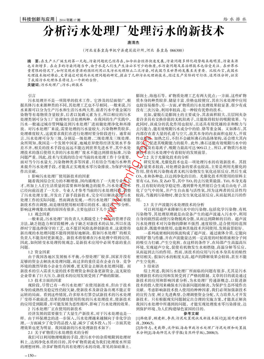 科技創(chuàng)新與應(yīng)用|2014年第17期給水排水分析污水處理廠處理污水的新技術(shù)唐清杰(河北省秦皇島市撫寧縣建筑設(shè)計所,河北秦皇島066300摘要:在生產(chǎn)工廠誕生的第一夭起,污染問題就已經(jīng)存在,如今社會經(jīng)濟快速發(fā)展,污染問題多樣化趨勢越來越明顯,污染來源也日漸増多。在眾多的污染問題當(dāng)中,由于水是人們生產(chǎn)生活必不可少的物質(zhì),水污染問題及其治理技術(shù)也倍受關(guān)注。在世界水量有限的情況下,如何實現(xiàn)水資源的循環(huán)利用以及污水處理防止二次污染,對我囯乃至世界的發(fā)展至關(guān)重要。比較而言,我囯水處理技術(shù)相對滯后,文章通過對國內(nèi)水處理問題的研究,提出了幾種污水處理新技術(shù),經(jīng)過生產(chǎn)實際的可行性、適用性分析,證實了我國污水處理體系將邁上一個新的臺階。關(guān)鍵詞:污水處理廠;污水;新技術(shù)膨潤土、海泡石等。礦物質(zhì)處理工藝有兩大優(yōu)點:一方面,這些礦物污水處理并不是一項簡單的技術(shù)工作,它涉及的層面很廣,根質(zhì)本身的種類較多、儲量豐富、價格也較便宜,其在污水處理中應(yīng)用據(jù)具體污水來源種類的不同,其處理工藝也不盡相同。一般來說,污也較容易操作;另一方面,礦物質(zhì)的污水處理效果較顯著,很少有或水來源可以分為生產(chǎn)污水和生活污水兩大類,前者污水中重金屬污沒有二次污染,利用率較高,是一種較有優(yōu)勢的技術(shù)染物等有毒物質(zhì)含量較多,后者以氮磷元素為主,所以相應(yīng)的污水比如,蒙脫石是膨潤土的主要成分,其表面積較大,且層間夾雜處理類別可分為工廠處理和生活處理兩種。在我國的生產(chǎn)實踐中,著許多具有交換價值的無機陽離子,且能取得較好的吸附效果。與放。對污水處理廠來說,需要處理的污水量較大、污染物種類較多,去污能力,能有效吸附污水成分中的鉛、鉻等重金屬。又如沸石,其處理難度較大,這就要求我們在進行處理時要分階段進行。通常而內(nèi)部存在著大量的孔道與空穴,故其本身的內(nèi)表面積也較大,開放言,污水處理可分為三級,分別是一級處理、二級處理及三級處理。性也較強。加熱之后,不但不會破壞沸石的晶體架構(gòu),還會增大其內(nèi)眾所周知,我國是一個發(fā)展中國家,地域差異使得經(jīng)濟發(fā)展水平參部空穴,促進其吸附能力的提升。此外,沸石還能有效吸附污水中的差不齊,相關(guān)的技術(shù)手段也遠遠不能達到世界先進水平,其中水處重金屬及有毒離子,吸附力最高可達90%以上。所以,礦物質(zhì)污水處理技術(shù)的落后使得大多的污水處理廠廢水不能達到排放標準,污染理技術(shù)在污水處理中有著較好的發(fā)展前景。問題嚴重。因此,技術(shù)與實踐的結(jié)合對當(dāng)前的水處理工作十分重要,22關(guān)于光催化技術(shù)的分析面對當(dāng)今污水量大、污染物種類多等因素,只有結(jié)合當(dāng)?shù)匚鬯N類研究發(fā)現(xiàn),光催化技術(shù)也是一項處理污水的有效新技術(shù)。其技來提升污水處理手段,才能真正實現(xiàn)廢水零污染排放,為保護環(huán)境術(shù)含量要求較高,對處理設(shè)備的要求也較高,主要是利用光催化的作出貢獻作用,使有機污染物或者無機污染物發(fā)生氧化還原反應(yīng),然后生成1影響污水處理廠使用新技術(shù)的因素CO2水和各種鹽,以達到凈化的目的。光催化技術(shù)所使用的原料主隨著我國綜合實力的不斷增強,國內(nèi)涌現(xiàn)出了一大批專業(yè)性人要有Cd3、TO2及ZnO等,其中TiO2的去污效果最強。TiO2本身無毒才,再加上人們生活質(zhì)量的需要和環(huán)保概念的提升,污水處理技術(shù)性,且有較好的化學(xué)穩(wěn)定性,遇到紫外光照射后會生成自由電子,活已經(jīng)向前邁進了一大步。專業(yè)人才參考當(dāng)前的污水處理問題,調(diào)整化了空氣中的氧,并產(chǎn)生自由基與活性氧,因為這兩者的反活性均了污水處理方案,開發(fā)出了新手段新技術(shù),完全可以解決我國污水較高,當(dāng)遇到污染物時,便會發(fā)生氧化還原反應(yīng),從而起到去污的作處理工作的實際問題。然而調(diào)查發(fā)現(xiàn),一些污水處理廠并沒有根據(jù)用新技術(shù)作出調(diào)整,而是繼續(xù)使用相對滯后的技術(shù)。通過進一步分析關(guān)于聲波能污水處理技術(shù)的分析影響這種現(xiàn)象出現(xiàn)的原因有很多,主要包括以下幾個方面可以利用超聲來降解污水中的污染物,包括化學(xué)污染物、有機1.1觀念因素污染物等,其處理原理就是由設(shè)備產(chǎn)生的超聲波通入污水中,利用般來說,污水處理廠的負責(zé)人大都接受上個世紀的管理手段自身的劇烈震動使污染物脫離分散,從而達到降解的目的。超聲波方法,缺乏創(chuàng)造力和冒險精神,由于缺乏對新技術(shù)的認知,所以在選污水處理技術(shù)對污染物的降解不強烈、速度較快,適合使用的范圍擇時寧愿選擇保守的工藝,也不愿冒風(fēng)險選擇創(chuàng)新技術(shù),這就使得也較多,既能單獨使用,也能和其他技術(shù)共同使用,發(fā)展前景較好。新出現(xiàn)的水處理問題不能得到很好地解決。假如污水處理廠的相關(guān)系列疏密相間的縱波構(gòu)成了超聲波。通過液體介質(zhì),它能向負責