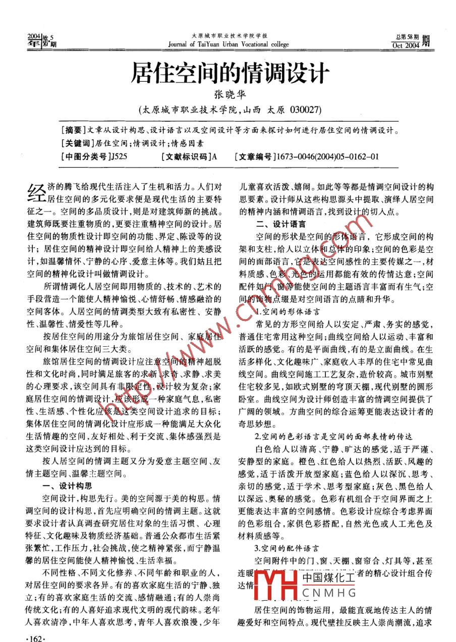 太原城市職業(yè)技術(shù)學(xué)院學(xué)報(bào)總第8期期Jourmal of TaiYuan Urban Vocational collegeOet 2004為居住空間的情調(diào)設(shè)計(jì)張曉華(太原城市職業(yè)技術(shù)學(xué)院,山西太原030027)[摘要]文章從設(shè)計(jì)構(gòu)思、設(shè)計(jì)語(yǔ)言以及空間設(shè)計(jì)等方面來探討如何進(jìn)行居住空間的情調(diào)設(shè)計(jì)。[關(guān)鍵詞]居住空間;情調(diào)設(shè)計(jì);情感因素[中圖分類號(hào)]J525[文獻(xiàn)標(biāo)識(shí)碼]A[文章編號(hào)]1673- 0046(2004)05 -0162 -01以濟(jì)的騰飛給現(xiàn)代生活注人了生機(jī)和活力。人們對(duì)兒童喜歡活潑、嬉鬧。如此等等都是情調(diào)空間設(shè)計(jì)的構(gòu)居住空間的多元化要求便是現(xiàn)代生活的主要特 思要素。設(shè)計(jì)師從這些構(gòu)思源頭中提取.演繹人居空間征之一??臻g的多品質(zhì)設(shè)計(jì),則是對(duì)建筑師新的挑戰(zhàn)。的精神內(nèi)涵和情調(diào)語(yǔ)言,找到設(shè)計(jì)的切入點(diǎn)。建筑師既要注重物質(zhì)的,更要注重精神空間的設(shè)計(jì)。居二、設(shè)計(jì)語(yǔ)言住空間的物質(zhì)性設(shè)計(jì)即空間的功能界定、陳設(shè)等的設(shè)空間的形狀是空間的形體語(yǔ)言,它形成空間的構(gòu)計(jì);居住空間的精神設(shè)計(jì)即空間給人精神上的美感設(shè)架和支柱,給人以立體和總體的印象;空間的色彩是空計(jì),如溫馨情懷、寧?kù)o的心序、愛意主體等。我們姑且把間的面部語(yǔ)言,它是表達(dá)空間感性的主要傳媒之一,材空間的精神化設(shè)計(jì)叫做情調(diào)設(shè)計(jì)。料質(zhì)感、色彩、光色的運(yùn)用都能有效的傳情達(dá)意;空間所謂情調(diào)化人居空間即用物質(zhì)的、技術(shù)的、藝術(shù)的配件如門、窗等能使空間的主題語(yǔ)言豐富而有生氣;空手段營(yíng)造一個(gè)能使人精神愉悅、心情舒暢、情感融洽的間的飾物點(diǎn)綴是對(duì)空間語(yǔ)言的點(diǎn)睛和升華??臻g客體。人居空間的情調(diào)類型大致有私密性、安靜1.空間的形體語(yǔ)言.性、溫馨性、情愛性等幾種。常見的方形空間給人以安定、嚴(yán)肅、務(wù)實(shí)的感覺,按居住空間的用途分為旅館居住空間、家庭居住普通住宅常用這種空間;曲線空間給人以運(yùn)動(dòng)、豐富和空間和集體居住空間三大類。活躍的感覺。有的是平面曲線,有的是立面曲線。在生旅館居住空間的情調(diào)設(shè)計(jì)應(yīng)注意空間的精神超脫活多樣化、文化趣味廣、家庭收人豐厚的住宅中常見曲性和文化時(shí)尚,同時(shí)滿足旅客的求新、求奇、求靜、求美線空間。曲線空間施工工藝復(fù)雜,造價(jià)較高。城市別墅的心理要求,該空間具有非限定性,設(shè)計(jì)較為復(fù)雜;家住宅較多見,如歐式別墅的穹頂天棚,現(xiàn)代別墅的圓形.庭居住空間的情調(diào)設(shè)計(jì),應(yīng)該形成一種家庭氣息,私密臥室。曲線空間為設(shè)計(jì)師創(chuàng)造豐富的情調(diào)空間提供了性、生活感、個(gè)性化應(yīng)該是這類空間設(shè)計(jì)追求的目標(biāo);廣闊的領(lǐng)域。方曲空間的綜合運(yùn)籌更能表達(dá)設(shè)計(jì)者的集體居住空間的情調(diào)化設(shè)計(jì)應(yīng)形成一種能滿足大眾化奇思妙想。生活情趣的空間,友好相處、利于交流、集體感強(qiáng)烈是2.空間的色彩語(yǔ)言是空間的面部表情的傳達(dá)這類空間設(shè)計(jì)應(yīng)達(dá)到的目標(biāo)。白色給人以清高、寧?kù)o、曠達(dá)的感覺,適于嚴(yán)謹(jǐn)、按人居空間的情調(diào)主題又分為愛意主題空間、友安靜型的家庭。橙色、紅色給人以熱烈、活躍、風(fēng)趣的情主題空間、溫馨主題空間。感覺,適于活潑開放型家庭;藍(lán)色給人以深沉、思考、一、設(shè)計(jì)構(gòu)思親切的感覺,適于學(xué)術(shù)、思考型家庭;灰色、黑色給人空間設(shè)計(jì),構(gòu)思先行。美的空間源于美的構(gòu)思。情以深遠(yuǎn).奧秘的感覺。色彩有機(jī)組合于空間界面之上調(diào)空間的設(shè)計(jì)構(gòu)思,首先應(yīng)明確空間的情調(diào)主題。這就更能表達(dá)豐富的空間感情。色彩設(shè)計(jì)應(yīng)綜合考慮界面要求設(shè)計(jì)者認(rèn)真調(diào)查研究居住對(duì)象的生活習(xí)慣、心理的色彩組合,家俱色彩搭配,自然光色或人工光色及特征、文化趣味及物質(zhì)經(jīng)濟(jì)基礎(chǔ)。普通公眾都市生活緊材料質(zhì)感等。張繁忙,工作壓力,社會(huì)挑戰(zhàn),使之精神緊張,而寧?kù)o溫3.空間的配件語(yǔ)言馨的居住空間能使人精神愉悅、生活幸福。空間附件中的門、窗、天棚、窗簾合、燈具等,甚至.不同性格、不同文化修養(yǎng)、不同年齡和職業(yè)的人,連 暖中國(guó)煤化工者的精心設(shè)計(jì)組合傳對(duì)居住空間的要求各異。有的喜歡家庭生活的寧?kù)o、獨(dú)達(dá)情立;有的喜歡家庭生活的交流、感情融通;有的人崇尚*YTHCNMH G傳統(tǒng)文化;有的人喜好追求現(xiàn)代文明的現(xiàn)代韻味。老年居住空間的飾物運(yùn)用,最能直觀地傳達(dá)主人的情人喜歡清凈,中年人喜歡思考,青年人喜歡浪漫,少年趣愛好和空間特點(diǎn)。現(xiàn)代壁掛反映主人崇尚潮流,追求.162.太原城市職業(yè)技術(shù)學(xué)院學(xué)報(bào)Joumal of TaiYua