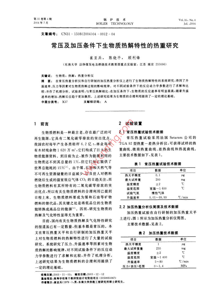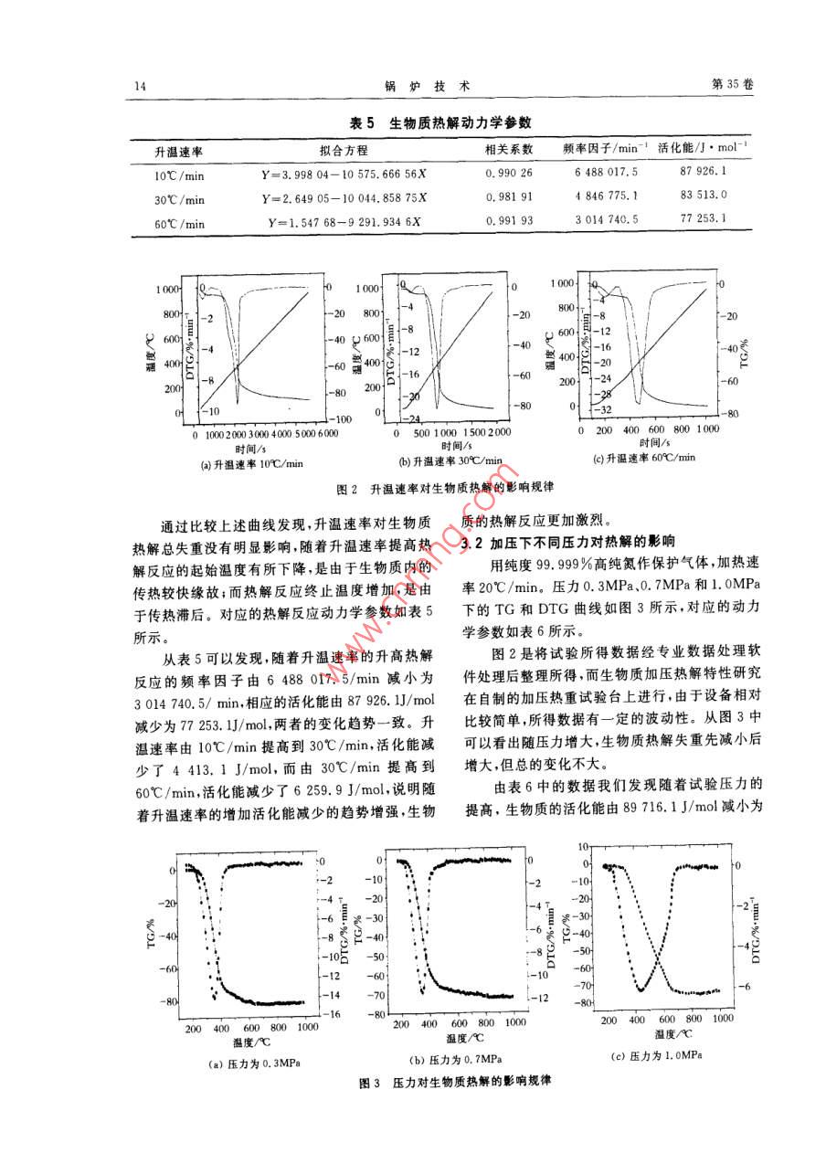 第35卷第1期鍋爐技術(shù)Vol. 35,No. 42004年7月BOILER TECHNOLOGYJul. ,2004文章編號: CN31 - 1508(2004)04 - 0012 -04常壓及加壓條件下生物質(zhì)熱解特性的熱重研究崔亞兵,陳曉平,顧利鋒(東南大學(xué)潔凈煤發(fā)電及燃燒技術(shù)教育部重點(diǎn)實(shí)驗(yàn)室,江蘇南京210096)關(guān)鍵詞:生物質(zhì):熱解;熱重分析儀摘要:在常壓熱重分析儀和自行研制的加壓熱重分析儀上進(jìn)行了生物質(zhì)熱解特性的系統(tǒng)研究,得到了升溫速率、壓力等因索對生物質(zhì)熱解過程的影響規(guī)律。對不同試驗(yàn)條件下的反應(yīng)動(dòng)力學(xué)參數(shù)進(jìn)行了求解和比較,并作了機(jī)理分析。試驗(yàn)表明:與常壓熱解相比,在加壓條件下,生物質(zhì)的反應(yīng)速率有明顯提高;隨著升溫速率的增加,熱解反應(yīng)趨于更加激烈。上述研究結(jié)果為生物質(zhì)的合理利用提供了一定的理論基礎(chǔ)。中團(tuán)分類號: X37文獻(xiàn)標(biāo)識碼: A1前言2試驗(yàn)裝置生物質(zhì)燃料是一-種最古老、存在最廣泛的可2.1常壓熱重試驗(yàn)技術(shù)數(shù)據(jù)再生能源,它具有二氧化碳零排放的突出優(yōu)點(diǎn)。常壓熱重試驗(yàn)采用法國Setaram 公司的我國農(nóng)村每年產(chǎn)生各類秸稈6.2億t,林業(yè)每年TGA92型熱重一差熱分析儀,可獲得試樣的熱有木材殘余物1 620萬m' ,它們構(gòu)成了巨大的生重曲線、微商熱重曲線、差熱曲線和熱流曲線。物質(zhì)能源資料。到目前為止,被作為能源利用的主要技術(shù)數(shù)據(jù)如下,見表1。生物質(zhì)還不到其總量的1%,但它們卻已提供了表1常壓熱重試驗(yàn)技術(shù)數(shù)據(jù)世界總能耗的15%”。由于煤、石油和天然氣等項(xiàng)目,數(shù)據(jù)單位不可再生資源儲量的日益減少,以及世人對燃料熱天平精度0.1μ燃燒后生成的溫室效應(yīng)氣體CO2的日趨關(guān)注,而最大試樣量200m溫度精度土2C生物質(zhì)燃料有其所特有的二氧化碳零排放的突出優(yōu)點(diǎn),所以有關(guān)生物質(zhì)燃料的合理利用已提到溫度范圍室溫~1 600試驗(yàn)氣氛情性氣體日程上來。生物質(zhì)燃料要成為煤和石油等礦物升溫速率0.01~99. 99C /min燃料的替代品,其關(guān)鍵之處是將低品位的生物質(zhì)2.2加壓熱重分析儀簡圖及技術(shù)數(shù)據(jù)能轉(zhuǎn)換成高品位的能源(21。因而,研究生物質(zhì)的加壓熱重試驗(yàn)在自行研制的加壓熱重天平熱解及氣化特性顯得尤為重要。目前,國內(nèi)有關(guān)生物質(zhì)熱解及氣化特性研究上進(jìn)行,圖1所示為加壓熱重分析儀簡圖。.的報(bào)道雖已有一-定數(shù)量,但基本都是常壓的。本主要技術(shù)數(shù)據(jù),見表2。文在常壓熱重天平和自行研制的加壓熱重天平表2加壓熱重技術(shù)數(shù)據(jù)上對生物質(zhì)燃料的熱解特性進(jìn)行了大量的試驗(yàn)項(xiàng)目研究。系統(tǒng)研究了壓力、升溫速率等因素對生物熱天平精度 .1g質(zhì)熱解的影響規(guī)律,對不同試驗(yàn)條件下的反應(yīng)動(dòng)最大試樣重量250力學(xué)參數(shù)進(jìn)行了求解和比較,并作了機(jī)理分析。室溫~1 400.上述研究結(jié)果為生物質(zhì)燃料的合理利用提供了5~80一定的理論基礎(chǔ)。壓力(表壓)范圍0~1.4MPa收稿日期:2003-11-03;修回日期:2003-12-12基金項(xiàng)目:高等學(xué)校骨f教師資助計(jì)劃資助項(xiàng)目(3150051047)作者簡介:崔亞兵(1979 -).男,東南大學(xué)熱能工程研究所碩士研究生。第4期崔亞兵,等:常壓及加壓條件下生物質(zhì)熱解特性的熱重研究32.3試驗(yàn)樣品_3試驗(yàn)所用的樣品是多種生物質(zhì)的混合物。26先將它們涼干濃縮,然后再壓制成塊狀。試驗(yàn)時(shí)1將其研磨到直徑小于1mm小碎末。其成分如表3所示。由表3中可以看出,生物質(zhì)的氫含量非常9高,揮發(fā)分的比例很大,其熱值也較高,而含硫量和含氮量非常少,其燃燒釋放的污染氣體比較少,可見生物質(zhì)燃料是-種較為理想的能源。102.4試驗(yàn)條件(見表4)2.5反應(yīng)動(dòng)力學(xué)參數(shù)的測定16/ 15/ 14 1312\ 11熱重曲線反應(yīng)了生物質(zhì)在熱解氣化過程中1-.金屬軟管:2-上高壓容器:3-迷官:4-電渦流位移傳感器,重量的變化過程,用下面的公式求出反應(yīng)動(dòng)力學(xué)5-彈簧片16-吊籃;7-氣氛調(diào)節(jié)系統(tǒng):8-下高壓容器:9-雙鉑參數(shù)!8!。銠熱電偶;10-溫度控制系統(tǒng)11-硅碳管:12- -鎳鉻-鎳硅熱電偶;13-電動(dòng)推桿:14-剛玉15-保溫材料16-數(shù)據(jù)采集系統(tǒng)任意時(shí)刻的失重率為:圖1加壓熱重分析儀簡圖a=(W。- . W)/(W。- W;)X 100%表3生物質(zhì)試樣成分分析成分/%名稱揮發(fā)分1%熱值/MJj.kg全水分析水灰分全硫氫空氣干燥基0.431. 340.08 45.23 6.63 0.26 46.0383. 3317. 07干燥基1. 350. 0845.436.66 0.2646.23干燥無灰基0.0846.046.75 0. 2646. 86收到基8.51.230.0741.56 6.09 0.2442.3076.69表4試驗(yàn)條件于是得到公式=A(1-a)"e-ERT項(xiàng)目數(shù)捷單位常壓~6mg把升溫速率β=工代人上式中加壓~85保護(hù)氣體(高純氮?dú)?99. 999%用積分法可得近似方程氣體流量ml/ min若a→0,化學(xué)反應(yīng)級數(shù)n為零,則方程變成常壓下升溫速率10,30.60C /minE加壓下升溫速率20C/minlo(號)=log[能(1-1 )]-2.3RT加壓下壓力0.3.0.7.1.0MPa用log(號)對工作圖的斜率可求出活化能,式中,W。為樣本初重,W為反應(yīng)中每時(shí)刻樣由截距
