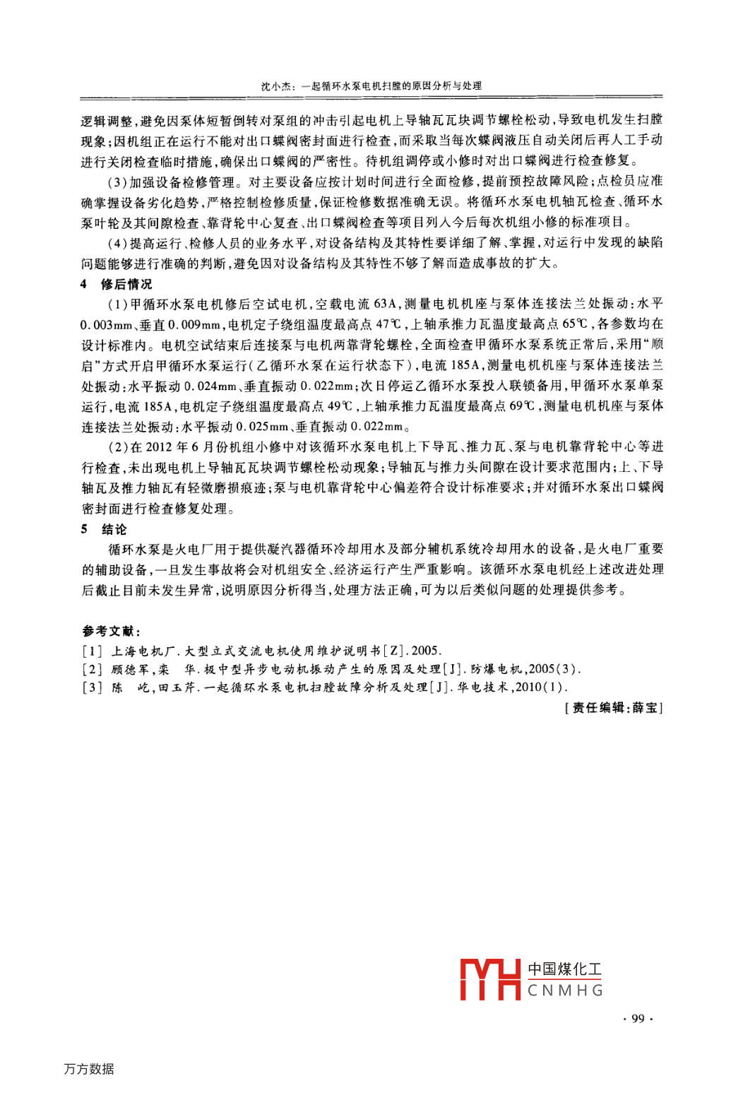第十八卷第一期安徽電氣工程職業(yè)技術(shù)學院學報2013年3月Vol. 18,No. 1JOURNAL OF ANHUI ELECTRICAL ENGINEERING PROFESSIONAL TECHNIQUE COLLECE March 2013一-起循環(huán)水泵電機掃膛的原因分析與處理沈小杰(大唐淮北發(fā)電廠,安徽淮北235000)摘要:針對一起循環(huán)水泵 電機導軸瓦調(diào)節(jié)螺栓松動,造成電機定子、轉(zhuǎn)子動靜部分碰磨的情況,進行原因分析,提出具體改進措施并實施后,取得了較好的效果。關(guān)鍵詞:立式電機;掃膛;動靜碰磨中圖分類號: TK264.2文獻標識碼: B文章編號: 1672-9706 (2013 )01-0097-03Circulating Pump Motor Sweep Chamber Analysis and ProcessingSHEN Xiao-jie( Datang Huaibei Power Plant, Huaibei 235000, China)Abstract: With circulation pump motor guide bearing adjusting bolt loose, causing the motor, rotor andstator rubbing, through cause analysis, specific improvement measures are put and implemented, and a-chieved good results.Key words :vertical motors; sweep chamber; rotor and stator rubbing0引言某廠一臺210MW機組于2005年9月投人運行,該機組配備兩臺日立泵制造(無錫)有限公司生產(chǎn)的1500HDC-23型抽芯導葉立式混流泵作為循環(huán)水泵,配套電機為上海電機廠生產(chǎn)的YLKS800-10型三相異步電動機,其額定電流200A,電壓等級6000V,電機轉(zhuǎn)速595r/ min,電機功率1700kW。電機結(jié)構(gòu)帶有上、下機架,上、下滑動式導瓦及推力瓦。循環(huán)水泵是火電廠用于提供凝汽器循環(huán)冷卻用水及部分輔機系統(tǒng)冷卻用水的設(shè)備,是火電廠重要的輔助設(shè)備。1事故經(jīng)過 .2011年8月27日運行巡檢人員發(fā)現(xiàn)甲循環(huán)水泵運行中電機上部圖1 電機轉(zhuǎn)子磨損情況聲音異常,檢查甲循泵電流、電機線圈及各軸承溫度無異常,就地測量甲循泵電機機座與泵體連接法蘭處振動:水平0.04mm、垂直0.043mm(標準:定子機座處≤0.08mm)未超標,立即切換至乙循泵運行,登錄甲循環(huán)水泵運行中聲音異常的缺陷。次日,會同各相關(guān)檢修單位對甲循環(huán)水泵出現(xiàn)的異常聲音再次啟動甲循環(huán)水泵檢查判斷情況,泵運行3分鐘左右泵組振動突然增大,未來得及對各參數(shù)進行測量就發(fā)現(xiàn)電機上部溫度測點接線盒處有油煙冒出,緊急停運甲循環(huán)水泵,隨即對甲.循環(huán)水泵電機進行檢修。解體過程中發(fā)現(xiàn)電機上導軸瓦松動,上導軸瓦與推力頭間隙嚴重超標、調(diào)節(jié)螺栓松動等缺陷,將電機轉(zhuǎn)子抽出發(fā)現(xiàn)圖2電機定子磨損情況電機定子內(nèi)膛與轉(zhuǎn)子表面有大面積磨損現(xiàn)象,立即返廠處理。電機轉(zhuǎn)中國煤化工收稿日期:2013-01-08作者簡介:沈小杰(1976-),男,安徽六安人,本科,工程師,從事汽輪機檢修|.MYHCNMHG●97●沈小杰:-起循環(huán)水泵電機掃膛的原因分析與處理邏輯調(diào)整,避免因泵體短暫倒轉(zhuǎn)對泵組的沖擊引起電機上導軸瓦瓦塊調(diào)節(jié)螺栓松動,導致電機發(fā)生掃膛現(xiàn)象;因機組正在運行不能對出口蝶閥密封面進行檢查,而采取當每次蝶閥液壓自動關(guān)閉后再人工手動進行關(guān)閉檢查臨時措施,確保出口蝶閥的嚴密性。待機組調(diào)停或小修時對出口蝶閥進行檢查修復。(3)加強設(shè)備檢修管理。對主要設(shè)備應按計劃時間進行全面檢修,提前預控故障風險;點檢員應準確掌握設(shè)備劣化趨勢,嚴格控制檢修質(zhì)量,保證檢修數(shù)據(jù)準確無誤。將循環(huán)水泵電機軸瓦檢查、循環(huán)水泵葉輪及其間隙檢查、靠背輪中心復查.出口蝶閥檢查等項目列人今后每次機組小修的標準項目。(4)提高運行、檢修人員的業(yè)務(wù)水平,對設(shè)備結(jié)構(gòu)及其特性要詳細了解、掌握,對運行中發(fā)現(xiàn)的缺陷問題能夠進行準確的判斷,避免因?qū)υO(shè)備結(jié)構(gòu)及其特性不夠了解而造成事故的擴大。4修后情況(1)甲循環(huán)水泵電機修后空試電機,空載電流63A,測量電機機座與泵體連接法蘭處振動:水平0.003mm、垂直0.009mm,電機定子繞組溫度最高點47C,上軸承推力瓦溫度最高點65C,各參數(shù)均在設(shè)計標準內(nèi)。電機空試結(jié)束后連接泵與電機兩靠背輪螺栓,全面檢查甲循環(huán)水泵系統(tǒng)正常后,采用“順啟”方式開啟甲循環(huán)水泵運行(乙循環(huán)水泵在運行狀態(tài)下),電流185A,測量電機機座與泵體連接法蘭處振動:水平振動0.024mm、垂直振動0.022mm;次日停運乙循環(huán)水泵投人聯(lián)鎖備用,甲循環(huán)水泵單泵運行,電流185A,電機定子繞組溫度最高點49C,上軸承推力瓦溫度最高點69C,測量電機機座與泵體連接法蘭處振動:水平振動0.025mm、垂直振動0.022mm。(2)在2012年6月份機組小修中對該循環(huán)水泵電機上下導瓦、推力瓦、泵與電機靠背輪中心等進行檢查,未出現(xiàn)電機上導軸瓦瓦塊調(diào)節(jié)螺栓松動現(xiàn)象;導軸瓦與推力頭間隙在設(shè)計要求范圍內(nèi);上、下導軸瓦及推力軸瓦有輕微磨損痕跡;泵與電機靠背輪中心偏差符合設(shè)計標準要求;并對循環(huán)水泵出口蝶閥密封面進行檢查修復處理。5結(jié)論循環(huán)水泵是火電廠用于提供凝汽器循環(huán)冷卻用水及部分輔機系統(tǒng)冷卻用水的設(shè)備,是火電廠重要的輔助設(shè)備,- -旦發(fā)生事故將會對機組安全、經(jīng)濟運行產(chǎn)生嚴重影響。該循環(huán)水泵電機經(jīng)上述改進處理后截止目前未發(
