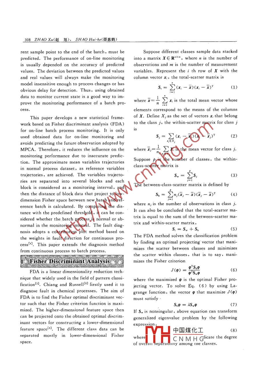 Journal of Shanghai jiaotong University(Science),Vol. E-11.No. 3,2006,307 ~312Article ID:1007-1172(2006)03 0307-06On-line Batch Process Monitoring and Diagnosing Basedon Fisher Discriminant AnalysisZHAO Xu*(趙旭), SHAO Hui-he(邵惠鶴)(Dept. of Automation, Shanghai Jiaotong Univ. ,Shanghai 200030, China)Abstract: A new on-line batch process monitoring and diagnosing approach based on Fisher disciminant analysis(FDA) was proposed. This method does not need to predict the future observations of variables, so it is more sen-sitive to fault detection and stronger implement for monitoring. In order to improve the monitoring performance,the variables tajectres of batch proes are separated into several blocks. The key to the proposed approach foron-line monitoring is to caleulate the distance of block data that projet to low dimension Fisher space between newbatch and reference batch. Comparing the distance with the predefine threshold, it can be considered whether thebatch process is normal or abnormal. Fault diagnosis is performed based on the weights in fault direction calculatedby FDA. The proposed method was aplied to the simulation model of fed-bach peicillin fermentation and the re-sults were compared with those obtained using MPCA. The simulation results clearly show that the on-line moni-toring method based on FDA is more eficient than the MPCA.Key words: batch proces on-ie process monitoring; fault dingnosis; Fisher discriminant analysis (FDA); mul-tiway principal component analysis (MPCA)CLC number: TP 277Document code: Aany corrective actionI. An alternative approach isintroductionto monitor the batch process variables. The devia-Nowadays, it has been paying more attentiontion in process variables can provide informationto the batch or semi-batch process which producedabout product properties before the completion of athe high added value and high quality products inbatch. The batch process variables usually followchemical industry, such as polymer, pharmaceuti-certain specified trajectories operated under normalcondition, so faults can be detected based on thecal and semiconductor industry.deviation of process variables trajectory. EarlyThe aim of the batch process monitoring is tofault detection is advantageous for taking correctkeep the product quality uniform and consistentaction before the batch process accomplished andunder batch-to-batch process and meet specifica-preventing fault occurred in subsequent batches.tion limits. The direct approach is to monitor cru-The multivariate statistical analysis methodscial product quality variables in batch process. .have been widely used in the modeling and analysisHowever , quality variables cannot be examined un-of the batch process. For batch process monitor-til the batch is finished. If the quality variables in-ing,Nomikos and MacGregorfa.3 proposed thespected of-line in a laboratory do not satisfy a de-multiway principal component analysis (MPCA )fined criterion, it is too late to fix the process andmethod, which uses a principal component modelthe bad products have been made. Furthermore,developed from a certain number of normal batchwhat the causes were and when the upset occurredprocess data to monitor a new batch operation. Itcannot be recognized in the past batch process andis limited that complete batch process data is indis-another batch process would be carried out withoutpensable while the MPCA is applied in batch pro-cess中國(guó)煤化工cess monitoring ofReceived date: 2005- 07-06a nerent sample point. E-mail :cherid@sjtu. edu. encan:HCNM H Gia, from theeur-308 ZHAO Xu(趙旭), SHAO Hui-he( 邵惠鶴)rent sample point to the end of the batch, must beSuppose different classes sample data stackedpredicted. The performance of on-line monitoringinto a matrix X∈R"Xm,where n is the number ofis usually depended on the accuracy of predictedobservations and m is the number of measurementvalues. The deviation between the predicted valuesvariables. Represent the i th row of X with theand real values will always make the monitoringcolumn vector x, the total-scatter matrix ismodel insensitive enough to process changes or hass,=乞(x,- x)(x,- 8)T (1)obvious delay for detection. Thus ,using obtaineddata to monitor current state is a good way to im-where x=一2 x is the total mean vector whoseprove the monitoring performance of a batch pro-cess.elements correspond to the means of the columnsThis paper develops a new statistical frame-of X. Define Xjas the set of vectors x; that belongwork based on Fisher discriminant analysis (FDA)to the class j, the within-scatter matrix for class jfor on-line batch process monitoring. It is onlyisused obtained data for on-line monitoring ands,= 2(x,- ,)(x,- ,)(2)avoids predicting the future observation adopted byMPCA. Therefore, it reduces the influence on thewhere x=一x; is the mean vector for class j.”ex;monitoring performance due to inaccurate predic-Suppose p is the number of classes, the within-tion. The approximate mean variables trajectoriesin normal process dataset, as reference variablesclass-scatter matrix istrajectories, are achieved. The variables trajecto-s.=之s,(3)ries are separated into several blocks and eachblock is considered as a monitoring interval, andThe between-class scatter matrix is defined bythen the distance of block data that project to low-s。=它川在一對(duì)(一對(duì)dimension Fisher space between new batch and ref-erence batch is calculated. By comparing the dis-where nj is the number of observations in class j.tance with the predefined threshold, it can be con-It can also be concluded that the total-scatter ma-sidered whether the. batch process is normal or ab-trix is equal to the sum of the between-scatter ma-normal in the monitoring interval. The fault diag-trix and within-scatter matrix,S,=Sw+Sb(5)nosis adopts a contribution plot method based onthe weights in fault direction for continuous pro-The FDA method solves the classification problemcess