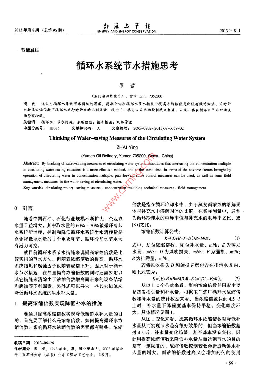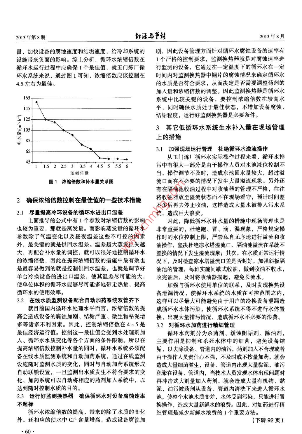 針諑占節(jié)2013年第8期(總第95期)ENERGY AND ENERGY CONSERVATION2013年8月節(jié)能減排循環(huán)水系統(tǒng)節(jié)水措施思考翟營(玉門油田煉化總廠,甘肅玉門735200)摘要:通過對循環(huán)水系統(tǒng)節(jié)水措施的思考,簡單介紹在循環(huán)水節(jié)水措施中提高濃縮倍數(shù)是比較有效的方法,同時針對較高濃縮倍數(shù)下循環(huán)水運行時帶來的不利因素,提出了一些可以采用的控制技術措施,以及一些在循環(huán)水節(jié)水中的現(xiàn)場管理措施。關鍵詞:循環(huán)水;節(jié)水措施;濃縮倍數(shù);技術措施;現(xiàn)場管理中圖分類號:TE685文獻標識碼:A文章編號:2095-0802-(201308-009-02Thinking of Water-saving Measures of the Circulating Water SystemZHAI Ying( Yumen Oil Refinery, Yumen 735200, Gansu, China)Abstract: By thinking of water-saving measures of circulating water system, introduces that increasing the concentration multiplein circulating water saving measures is a more effective method, and at the same time, in terms of the adverse factors brought byoperation of circulating water in concentration multiple, puts forward some control measures can be used, as well as some fieldKey words: circulating water; saving measures; concentration multiple; technical measures; field management0引言倍數(shù)是指在循環(huán)冷卻水中,由于蒸發(fā)而濃縮的溶解固體與補充水中溶解固體的比值。在實際測量中,通常隨著中國石油、石化行業(yè)規(guī)模不斷擴大,企業(yè)取為循環(huán)冷卻水的電導率值與補充水的電導率之比,或水量日益增大,其中取水量的60%~70%被循環(huán)冷卻K+之比。水系統(tǒng)所消耗,控制和降低循環(huán)水系統(tǒng)生水消耗量是濃縮倍數(shù)計算公式:企業(yè)降低取水量的1個重要環(huán)節(jié),循環(huán)冷卻水節(jié)水大K=(E+B++D)/B=MIB(1)有潛力可挖。式中,K為濃縮倍數(shù);M為補水量,m沿h;E為蒸發(fā)就目前循環(huán)水系節(jié)水措施來說提高濃縮倍數(shù)是比水量,mh;D為風吹損失,mh;F為漏損,m}h;較實用的節(jié)水方法,但隨著濃縮倍數(shù)的提高,循環(huán)水B為排污量,m沿h系統(tǒng)結垢和腐蝕因子也隨著成倍上升,因此對于循環(huán)若將風吹損失D和漏損F都包含在排污水B內(nèi),水節(jié)水措施,在盡量提高濃縮倍數(shù)的同時還需要附以則上式變?yōu)槠渌胧﹣硐捎跐饪s倍數(shù)增高而帶來的設備結垢K=(E+B)B=M(M-E)=1/(1-EM)。(2)和腐蝕等不利因素,另外還可以尋求一些其它措施來從以上2個公式來看,影響濃縮倍數(shù)的因素主要降低循環(huán)水系統(tǒng)的生水補入量是蒸發(fā)損失量和補水量。根據(jù)玉門煉廠循環(huán)水濃縮倍數(shù)和補水量的統(tǒng)計數(shù)據(jù)來看,當濃縮倍數(shù)達到45以提高濃縮倍數(shù)實現(xiàn)降低補水的措施上時,補水量下降程度基本保持平穩(wěn),變化幅度不要通過提高濃縮倍數(shù)實現(xiàn)降低新鮮水補入量的目大。具體情況見圖1。的,首先要了解什么是濃縮倍數(shù)、如何提高循環(huán)水濃從圖1變化來看,提高循環(huán)水濃縮倍數(shù)對降低補縮倍數(shù)、影響循環(huán)水濃縮倍數(shù)的因素都有哪些。濃縮水量從而實現(xiàn)節(jié)水是有很好效果的,但當濃縮倍數(shù)超過45后,補水量變化趨緩,甚至基本沒有變化,因收稿日期:2013-0626此用提高濃縮倍數(shù)來降低補水量從而達到節(jié)水的目的作者簡介:翟營,1978年生,男,河北唐山人,2003年畢業(yè)是有一定限度的,濃縮倍數(shù)控制較低會造成新鮮水補于中國石油大學(華東)化學工程與工藝專業(yè),工程師入量的增大,而濃縮倍數(shù)過高又會增加藥劑的使用2013年第8期與節(jié)線2013年8月量,加快設備的腐蝕速度和結垢速度,給冷卻系統(tǒng)的劇,因此設備管理方面針對循環(huán)水腐蝕設備的速率有設施帶來負面的影響。綜上分析,循環(huán)水濃縮倍數(shù)在1個嚴格的控制要求,監(jiān)測換熱器就是對腐蝕速率進循環(huán)水運行過程中應確保1個最佳值,就玉門煉廠循行監(jiān)測的設備,它通過在一定溫度下的循環(huán)水在一定環(huán)水系統(tǒng)來說,通過圖1可知,濃縮倍數(shù)應該控制在時間內(nèi)對監(jiān)測換熱器中銅片的腐蝕情況來確定循環(huán)水45左右為最佳。的水質(zhì)是否符合要求,從而決定是否需要調(diào)整藥劑的加入量和濃縮倍數(shù)的調(diào)整。因此監(jiān)測換熱器是循環(huán)水系統(tǒng)中比較關鍵的設備,要控制濃縮倍數(shù)在較高水平,同時確保水質(zhì)處于最佳狀態(tài),不增加設備腐蝕125結垢程度,運行好監(jiān)測換熱器是必要條件。3其它低循環(huán)水系統(tǒng)生水補入量在現(xiàn)場管理長85上的措施3.1加強現(xiàn)場運行管理杜絕循環(huán)水溢流操作從玉門煉廠循環(huán)水實際操作過程來看,循環(huán)水排522.533.544.555.56污中有很大一部分是由于操作人員對水池液位控制不濃縮倍數(shù)當,操作調(diào)節(jié)不及時,造成東池回水量較大,超過溢圖1濃縮倍數(shù)和補水量關系圖流口而在不必要的情況下發(fā)生大量溢流現(xiàn)象。另外還有在隔油池收油過程中對收油器的管理不嚴格,往往2確保濃縮倍數(shù)控制在最佳值的一些技術措施將收油器放至溢流狀態(tài)而不在現(xiàn)場看守,預計時間差不多后再去停止收油,這樣造成大量水被排入污水系21盡量提高冷環(huán)設備的循環(huán)水進出口溫差統(tǒng),造成巨大