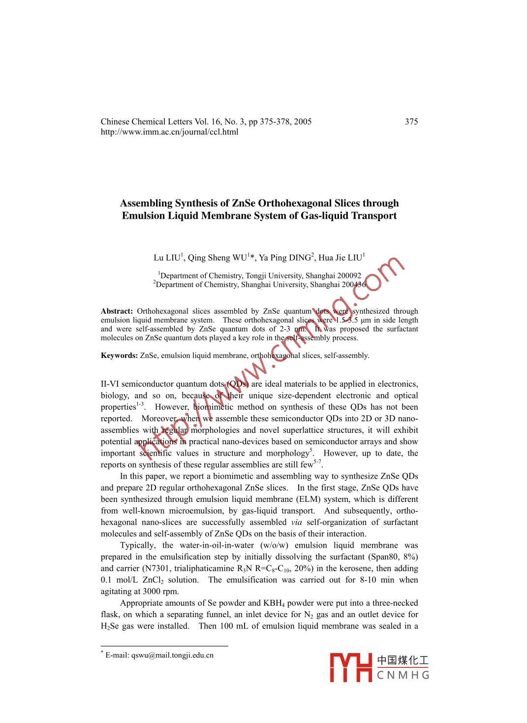 Chinese Chemical Letters Vol. 16, No.3, pp 375-378, 2005375http://www.imm.ac.cn/journal/ccl.htmlAssembling Synthesis of ZnSe Orthohexagonal Slices throughEmulsion Liquid Membrane System of Gas-liquid TransportLu LIU', Qing Sheng WU'*, Ya Ping DING, Hua Jie LIU''Department of Chemistry, Tongji University, Shanghai 200092^Department of Chemistry, Shanghai University, Shanghai 200436Abstract: Orthohexagonal slices assembled by ZnSe quantum dots were synthesized throughemulsion liquid membrane system. These orthohexagonal slices were 1.5-3.5 pum in side lengthand were self-assembled by ZnSe quantum dots of 2-3 nm. It was proposed the surfactantmolecules on ZnSe quantum dots played a key role in the self-assembly process.Keywords: ZnSe, emulsion liquid membrane, orthohexagonal slices, self-assembly.II-VI semiconductor quantum dots (QDs) are ideal materials to be applied in electronics,biology, and so on, because of their unique size-dependent electronic and opticalproperties'However, biomimetic method on synthesis of these QDs has not beenreported. Moreover, when we assemble these semiconductor QDs into 2D or 3D nano-assemblies with regular morphologies and novel superlattice structures, it will exhibitpotential applications in practical nano-devices based on semiconductor arrays and showimportant scientific values in structure and morphology'. However, up to date, thereports on synthesis of these regular assemblies are still few .In this paper, we report a biomimetic and assembling way to synthesize ZnSe QDs .and prepare 2D regular orthohexagonal ZnSe slices. In the first stage, ZnSe QDs havebeen synthesized through emulsion liquid membrane (ELM) system, which is differentfrom well-known microemulsion, by gas-liquid transport. And subsequently, ortho-hexagonal nano-slices are successfully assembled via self-organization of surfactantmolecules and self-assembly of ZnSe QDs on the basis of their interaction.Typically, the water-n-oil-in-water (w/o/w) emulsion liquid membrane wasprepared in the emulsification step by initially dissolving the surfactant (Span80, 8%)and carrier (N7301, trialiphaticamine R;N R=Cg-C10, 20%) in the kerosene, then adding0.1 mol/L ZnCl2 solution. The emulsification was carried out for 8-10 min whenagitating at 3000 rpm.Appropriate amounts of Se powder and K BH4 powder were put into a three-neckedflask, on which a separating funnel, an inlet device for N2 gas and an outlet device forH2Se gas were installed. Then 100 mL of emulsion liquid membrane was sealed in a*E-mail: qswu@mail.#edu.cn中國煤化工MHCNMH G.376Lu LIU et al.conical flask to compose a set of reaction system. With the N2 protection, a dilutesolution of HCI (pH 4) was dropped into the flask at the rate of 2 mL/min undermagnetic agitation, and gentle stream N2 took off H2Se gas from the reaction system,which was absorbed by NaOH solution. After Se powder was dissolved, the reactionwas kept for 10 min and then ceased.The emulsion liquid membrane was demulsified by centrifuge. The obtainedprecipitate was washed several times with absolute ethanol until CS determinator (LecoCS-400) showed the surfactant remains were about 0.3-0.4%. The sample was kept inethanol.The mechanism of reaction of Se(I) and Zn(I) in ELM is demonstrated as follows.(1) Se powder is reduced by KBH4 powder in acid solution under the protection ofN2 atmosphere. H2Se gas is generated in this step.(2) As shown in Figure 1, organic base N7301 is chosen as carrier in ELM systemto form complex compound (R;N)2:H2Se with H2Se. That is to say that with the help ofcarrier N7301, Se(I) can be transported from external-aqucous phase to internal-aqueousphase.(3) ZnCl2 in intemal-aqueous phase of ELM system reacts with (RzN)2H2Se toobtain ZnSe sample.In this stage, HCl solution is used to promote the reaction between Se and KBH4.The faster the HCI solution is dropped into, the faster the output speed of H2Se is.However, if output speed of H2Se is too fast, ELM system can be destroyed. Theexperimental results revealed that the best acidity is pH 4 and addition rate of HCl is 2mL/min.An XRD (X-ray diffraction, Philips Pw 1700) pattern of the as-prepared sample isshown in Figure 2, all the peaks in the pattern can be identified to cubic stilleite structureof ZnSe (PDF 37-1463). The measured lattice parameter is a= 5.715 A, which isconsistent with reported value.Figure 1 Coupled processes of transporting (R;N)2: H2Se and forming ZnSe QDsexternal phase| membrane phase internal phaseR.NZnCijH2Se(R:N2rH,Se|)ZnSeFigure 2 XRD pattern of as- prepared sample02030 40507020(°)中國煤化工MHCNMH G.Assembling Synthesis of ZnSe Orthohexagonal Slices377Figure 3 TEM images of as- prepared productsb)100 nm2um[c)d) .(a) initial ZnSe QDs (b) several orthohexagonal ZnSe slices (C) one orthohexagonal ZnSe slice(d) ED pattern of ZnSe slices (e) high-magnification image of ZnSe slicesFigure 3a shows the TEM (tansmission electron microscope, Hitachi H-800)image of fresh products just separated from ELM, indicating the initial as-preparedsample only consists of well dispersed ZnSe QDs with diameters of 2-3 nm. Togenerate the 2D ZnSe structures, we disperse these QDs adsorbing 0.3-0. 4% surfactant inabsolute ethanol to form a ZnSe sol, then aging for 24 h. Surprisingly, Figure 3b and3c reveal that in the final products there are a lot of regular orthohexagonal slices with1.5-3.5 um in side length and their thickness are about 10 nm according to semi-transparent appearance and the transmittable result of routine electron-beam, and someunassembled ZnSe QDs still existed. The ED (electron diffraction) pattern (Figure3d) shows single crystalline diffraction dots. To learn more about the microstructure ofthese slices, magnification TEM image is shown in Figure 3e. The self assemblynature of these ZnSe nanoparticles is obviously observed from the slices assembledregularly by nanoparticles. However, these ZnSe nanoparticles with diameters of 15-30nm are larger than the initial Zn