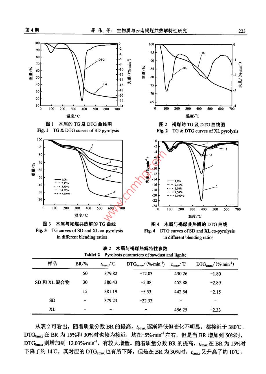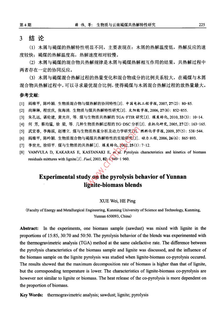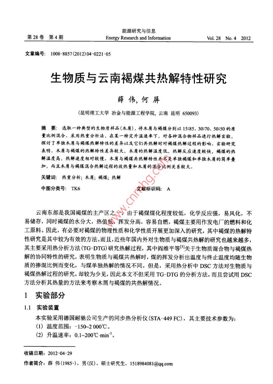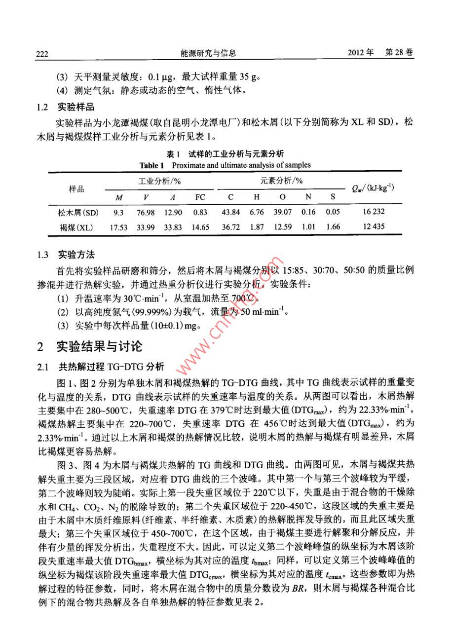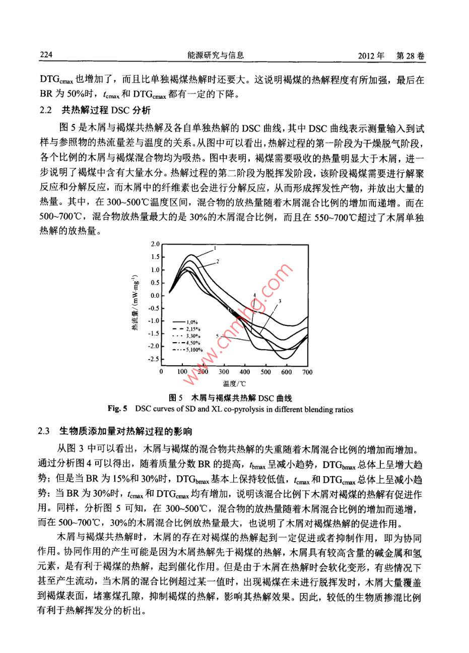 能源研究與信息第28卷第4期Energy Research and InformationVoL.28 No. 42012文章編號: 1008 8857 (2012)04- 0221- 05生物質(zhì)與云南褐煤共熱解特性研究薛偉,何屏(昆明理工大學冶金與能源工程學院,云南昆明650093)摘要:選取一種典型的生物質(zhì)樣品(木屑),將木屑與褐煤分別以15:85. 30:70、 50:50的質(zhì)量比例混合。采用熱重分析法,在某一-特定升溫速率下,對各種混合物樣品進行熱解實驗,探討了單獨木屑與褐煤熱解特性的差異以及它們共熱解時對褐煤熱解過程的影響。實驗研究表明,木屑與褐煤的熱解特性差異較大,木屑的熱解溫度低,熱解反應速度較快,褐煤的熱解溫度高,熱解速度相對較慢。木屑與褐煤共熱解特性并不是單獨褐煤和單獨木屑的簡單疊加,而且木屑與褐煤混合熱解過程的放熱量和木屑的混合比例關(guān)系較大。關(guān)鍵詞:熱重分析; 木屑;褐煤;熱解中圖分類號: TK6文獻標識碼: A云南東部是我國褐煤的主產(chǎn)區(qū)之一。由于褐煤煤化程度較低,化學反應強,易風化,不易儲存,同時褐煤的水分大,熱值低,揮發(fā)分高,容易自燃,褐煤主要用作發(fā)電廠的燃料和化工原料。因此,有必要對褐煤的物理性質(zhì)和化學性質(zhì)開展更加深入的研究,其中褐煤的熱解特性研究是其中較為有效的方法。而且,近些年國內(nèi)外對生物質(zhì)與褐煤共熱解的研究也越來越多,其主要采用熱分析方法(TG DTG)研究熱解過程,其中閻維平等凹"關(guān)于生物質(zhì)混合物與褐煤熱解的協(xié)同特性的研究,表明生物質(zhì)與褐煤共熱解時,煤的揮發(fā)分析出溫度與終止溫度均隨生物質(zhì)的摻混比例而變化,與煤單獨熱解的情況不同。但是,采用熱分析中DSC方法對生物質(zhì)與褐煤熱解過程的研究,卻較為少見,因此本文不但采用TG DTG的分析方法,而且嘗試用DSC方法分析其熱量的方法來考察木屑與褐煤的共熱解情況。1實驗部分1.1實驗裝置本實驗采用德國耐馳公司生產(chǎn)的同步熱分析儀(STA- -449 FC),其主要技術(shù)參數(shù)為:(1)溫度范圍: -150~2 000C。(2) 升溫速率: 0.1~200C :min'。收稿日期: 2012-04-29作者簡介:薛偉(1985-), 男(漢), 碩士研究生,1518984081@qq.com222能源研究與信息2012年第28 卷(3)天平測量靈敏度: 0.1 μg,最大試樣重量35 g。(4)測定氣氛:靜態(tài)或動態(tài)的空氣、惰性氣體。1.2 實驗樣品實驗樣品為小龍?zhí)逗置?取自昆明小龍?zhí)峨姀S)和松木屑(以下分別簡稱為XL和SD),松木屑與褐煤煤樣工業(yè)分析與元素分析見表1。表1試樣的工業(yè)分析 與元素分析Table 1 Proximate and ultimate analysis of samples工業(yè)分析/%元素分析/%樣品Qn/(kJkg^") .MAFCCH0N松木屑(SD)9.376.98 12.90 0.8343.84 6.76 39.07 0.16 0.0516 232褐煤(XL)17.53 33.99 33.83 14.6536.72 1.87 12.59 1.01 1.6612 4351.3實驗方法首先將實驗樣品研磨和篩分,然后將木屑與褐煤分別以15:85、 30:70、 50:50 的質(zhì)量比例摻混并進行熱解實驗,并通過熱重分析儀進行實驗分析。實驗條件:(1)升溫速率為30C min',從室溫加熱至700°C。(2)以高純度氮氣 99.999%)為載氣,流量為50 ml:min'。(3)實驗中每次樣品量(10+0.1) mg。2實驗結(jié)果與討論2.1共熱解過程 TG-DTG分析圖1、圖2分別為單獨木屑和褐煤熱解的TG- DTG曲線,其中TG曲線表示試樣的重量變化與溫度的關(guān)系,DTG曲線表示試樣的失重速率與溫度的關(guān)系。從兩圖可以看出,木屑熱解主要集中在280- -500C,失重速率DTG在379C時達到最大值(DTGmax),約為22.33%min'。褐煤熱解主要集中在220~700C, 失重速率DTG在456°C時達到最大值(DTGmax),約為2.33% min'。通過以上木屑和褐煤的熱解情況比較,說明木屑的熱解與褐煤有明顯差異,木屑比褐煤更容易熱解。圖3、圖4為木屑與褐煤共熱解的TG曲線和DTG曲線。由兩圖可見,木屑與褐煤共熱解失重主要為三段區(qū)域,對應著DTG曲線的三個波峰。其中第-一個與第三個波峰較為平緩,第二個波峰則較為陡峭。實際上第一-段失重區(qū)域位于 220C以下,失重是由于混合物的干燥除水和CH4、CO2、N2的脫除導致的;第二個失重區(qū)域位于220- 450C,這段區(qū)域的失重主要是由于木屑中木質(zhì)纖維原料(纖維素、半纖維素、木質(zhì)素)的熱解脫揮發(fā)導致的,而且此區(qū)域失重最大:第三個失重區(qū)域位于450 _700°C,在這個區(qū)域,由于褐煤主要進行解聚和分解反應,并伴有少量的揮發(fā)分析出,失重程度不大。因此,可以定義第二個波峰峰值的縱坐標為木屑該階段失重速率最大值DTGomax,橫坐標為其對應的溫度tomax;同樣,可以定義第三個波峰峰值的縱坐標為褐煤該階段失重速率最大值DTGcmax, 橫坐標為其對應的溫度lemo這些參數(shù)即為熱解過程的特征參數(shù),同時,將木屑在混合物中的質(zhì)量分數(shù)設為BR,則木屑與褐煤各種混合比例下的混合物共熱解及各自單獨熱解的特征參數(shù)見表2。第4期薛偉,等:生物質(zhì)與云南褐煤共熱解特性研究22320--295-30 t, DTG07oR 85+,DTG50-105o t-14 海I0 tTG4-1654-180t-2020 F100 200 300400500600700100200300400500600700溫度/C溫度/C .圖1木屑的TG及DTG曲線圖圖2褐煤的TG及DTG曲線圖Fig. 1 TG & DTG curves of SD pyrolysisFig.2 TG & DTG curves of XL pyrolysis109080|。70-6050-40--16-1830.... 5100%020100 200 300 400 500600700100 200 300 400 500 600 700圖3木屑 與褐煤共熱解的TG曲線圖4木屑與褐煤共熱解的 DTG曲線Fig.3 TG curves of SD and XL co-pyrolysisFig.4 DTG curves of SD and XL co-pyrolysisin different blending ratiosin dfferent blending ratios表2木屑與