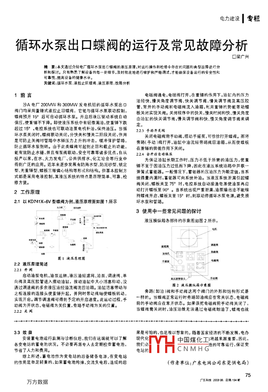 電力建設(shè)|專欄循環(huán)水泵出口蝶閥的運(yùn)行及常見(jiàn)故障分析口梁廣興摘要:本文通過(guò)介紹 電廠循環(huán)水泵出口蝶閥的液壓原理,對(duì)運(yùn)行操作和檢修中存在的問(wèn)題和典型故障進(jìn)行分析和探討。只有熟悉了解設(shè)備的每一處細(xì)節(jié),及時(shí)徹底地進(jìn)行維護(hù)和嚴(yán)格調(diào)試,才能確保沒(méi)備運(yùn)行的安全性和可靠性,提高設(shè)備的健康水平。關(guān)鍵詞:循環(huán)水泵:液控止回蝶閥;液壓原理;故障分析1前言電磁閥通電,電磁閥打開(kāi),在重錘的作用下,油缸內(nèi)的壓力沙A電廠200MW和300MW發(fā)電機(jī)組的循環(huán)水泵出口油經(jīng)快、慢關(guān)角度調(diào)節(jié)閥、快關(guān)調(diào)節(jié)閥,慢關(guān)調(diào)節(jié)閥及高壓膠閥門均采用重錘式液控止回蝶閥,它能與循環(huán)水泵聯(lián)動(dòng)控制,管、常開(kāi)的手動(dòng)閥和電磁閥流入油箱,利用重錘的勢(shì)能帶動(dòng)蝶蝶閥頇開(kāi)15°后可啟動(dòng)循環(huán)水泵。開(kāi)啟后液壓驅(qū)動(dòng)系統(tǒng)自動(dòng)板關(guān)閉實(shí)現(xiàn)關(guān)閥。關(guān)閥程序中的快關(guān),慢關(guān)時(shí)間和快、慢關(guān)角度保壓,使重錘不下降。即使液壓系統(tǒng)中有輕微漏油,使重錘下跌定由油缸的快關(guān)調(diào)節(jié)閥,慢關(guān)調(diào)節(jié)閥和快、慢關(guān)角度調(diào)節(jié)閥來(lái)調(diào)超過(guò)15° ,電控系統(tǒng)也可聯(lián)動(dòng)油泵電機(jī)補(bǔ)油,保持油壓。當(dāng)循223手動(dòng)開(kāi)美閥環(huán)水泵關(guān)閉時(shí),蝶閥聯(lián)動(dòng)關(guān)閉,分快關(guān)和慢關(guān)二階段關(guān)閉,作用關(guān)閉電磁閥前手動(dòng)閥,擺動(dòng)手搖泵,可徐徐打開(kāi)蝶閥。而將是可防止關(guān)閥時(shí)管路中水錘壓力上升的沖擊,緩沖保護(hù)管路,旁路(手動(dòng))閥打開(kāi),油缸中油流經(jīng)旁路隔回油箱,從而使蝶板防止循環(huán)水泵倒轉(zhuǎn)。由于此類蝶閥可起到止回和截止的功能,在重錘的勢(shì)能作用下關(guān)閉。能有效防止水錘,并且有泵閥聯(lián)動(dòng),安全可靠等諸多優(yōu)點(diǎn),自從22.4全開(kāi)后自動(dòng)保壓投產(chǎn)以來(lái),在水、火力發(fā)電廠、 公共供排水、化工冶金等行業(yè)中為保證油缸長(zhǎng)期工作時(shí),壓力不低于所需的油壓力,使重得到廣泛的應(yīng)用。近年來(lái)逐步發(fā)展有防海水型、防泥砂型鎖定錘不至于因油壓力過(guò)低而下降,因此在波壓系統(tǒng)油路中并聯(lián)一型、無(wú)重錘型、蝶板三維偏心結(jié)構(gòu)等形式和結(jié)構(gòu)。但基本控制方彈簧式蓄能器。一般情況下,蓄能器的壓油壓力為額定值,當(dāng)系式都是采用電液控制,其液壓系統(tǒng)的特點(diǎn)是原理簡(jiǎn)單、可靠檢統(tǒng)微量?jī)?nèi)漏時(shí),蓄能器可向系統(tǒng)補(bǔ)油。當(dāng)液壓系統(tǒng)泄漏引起蝶修方便。閥關(guān)閉,蝶板關(guān)至75°時(shí),電控系統(tǒng)自動(dòng)接通電源使油泵再啟動(dòng)打開(kāi)蝶板至90°。當(dāng)系統(tǒng)出現(xiàn)嚴(yán)重泄漏,油泵輸出油不能維2工作原理持蝶茂開(kāi)啟,蝶板關(guān)至15°時(shí),則聯(lián)動(dòng)停循環(huán)水泵電源。避免損2.1以KD741X- 6V型蝶閥為例,液壓原理圖如圖1所示壞水泵和管路。3使用中一些常見(jiàn)問(wèn)題的探討↓國(guó)網(wǎng)液壓操縱箱各部件的示意圖如圖2所示。凱調(diào)速西旁路網(wǎng)加神孔圖1液壓原理圍電疆酒2.2液壓原理簡(jiǎn)述2.2.1 開(kāi)閥啟動(dòng)油泵電機(jī),油泵運(yùn)轉(zhuǎn),液壓油經(jīng)濾網(wǎng)、油泵、調(diào)速閥、單平動(dòng)圖向閥及高壓膠管進(jìn)入擺動(dòng)油缸,推動(dòng)油缸中大小活塞稱動(dòng),沒(méi)圖2液壓操縱箱示意圍通過(guò)調(diào)速閥的多余液壓油經(jīng)溢流閥流回油箱。油缸活塞帶動(dòng)與之相連接的連接頭使重錘升起,并同時(shí)帶動(dòng)閥軸使蝶板轉(zhuǎn)動(dòng),旁路(卸油)閥和手動(dòng)閥這兩個(gè)閥門的外形和結(jié)構(gòu)形式是實(shí)現(xiàn)開(kāi)啟。調(diào)節(jié)調(diào)速閥可得到予定的開(kāi)啟速度。此運(yùn)動(dòng)過(guò)程,手-樣的。當(dāng)?shù)y正常運(yùn)行時(shí)旁路卸油閥應(yīng)在常關(guān)狀態(tài),電磁閥動(dòng)閥為開(kāi)狀態(tài),電磁閥為關(guān)位置,旁路手動(dòng)閥為關(guān)的位置。前的手動(dòng)閥應(yīng)在常開(kāi)狀態(tài)。如果誤把電磁閥前手動(dòng)閥關(guān)閉了,當(dāng)?shù)y需關(guān)閉時(shí),油壓油就無(wú)法通過(guò)電磁閥卸油了,蝶閥也就2.2.2關(guān)閩3.3效益果是可怕的,也是難以想象的。隨著國(guó)家經(jīng)濟(jì)的不斷發(fā)展,電辦安裝蓄電池運(yùn)行監(jiān)測(cè)與診斷儀后,我們?cè)谶h(yuǎn)端就可以了解現(xiàn)代化中國(guó)煤化工3將越來(lái)越重要,因此,各變電站的蓄電池狀況,不必要再派專人去定期檢查蓄電池,我們必池的可靠運(yùn)行,保證變節(jié)省了人力和費(fèi)用。電站的YHCNMHG綜上所述,蓄電池作為變電站的后備儲(chǔ)備電源,在變電站的作用是舉足輕重的,如果蓄電池垮掉,交流失電后,造成的后(作者單位:廣東電網(wǎng)公司東莞供電局)75廣東科技200808. 匈第194期專欄|電力建設(shè)無(wú)法自動(dòng)關(guān)閉。.厚度可