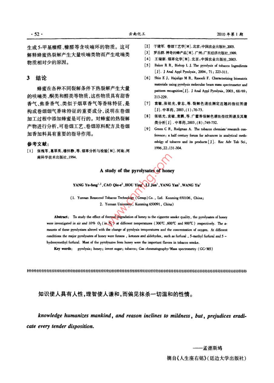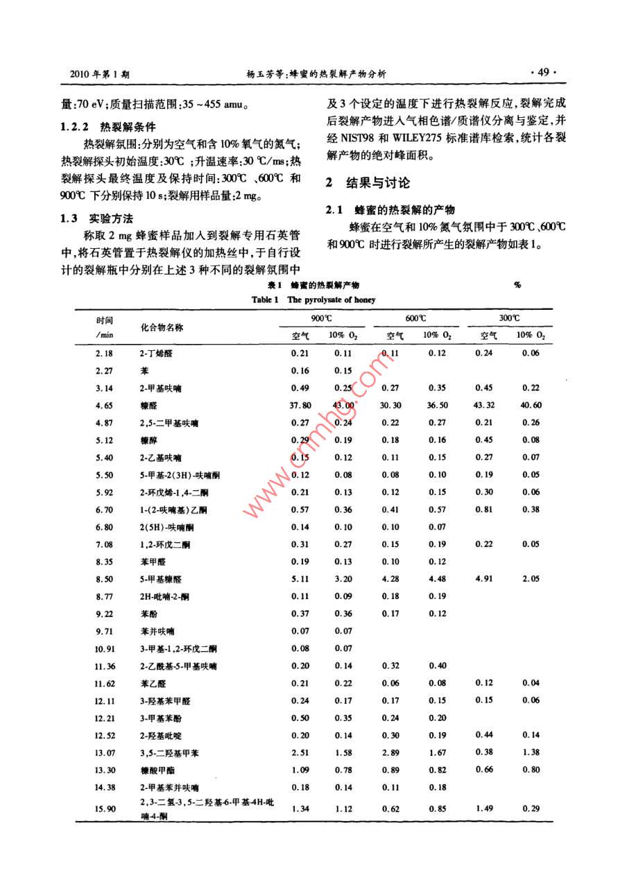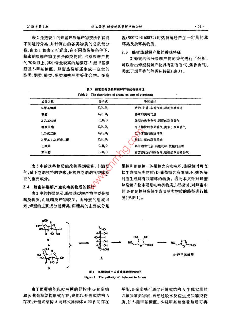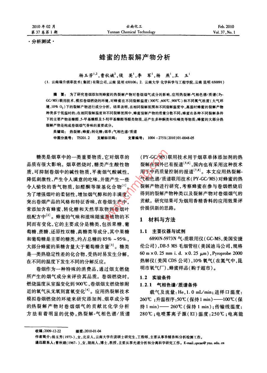 2010年02月云南化工Feb.2010第37卷第1期Yunnan Chemical TechnologyVol, 37. No. 1·分析測試·蜂蜜的熱裂解產(chǎn)物分析楊玉芳2,曹秋娥2,侯英',李軍,楊燕,王玉1(1.云南瑞升煙草技術(shù)(集團)有限公司,云南昆明650106;2.云南大學(xué)化學(xué)科學(xué)與工程學(xué)院,云南昆明65001)摘要:為了研究卷煙添加劑蜂蜜的熱裂解產(chǎn)物對卷煙煙氣成分的影響應(yīng)用熱裂解氣相色譜/質(zhì)譜(PyGCMs)聯(lián)用技術(shù)模擬卷煙燃燒的環(huán)境對蜂蜜在不同裂解溫度(300℃、600℃900℃)和不同氧氣濃度(大氣環(huán)境、10%O2)下的裂解產(chǎn)物進行成分分析。結(jié)果表明,在相同裂解氛圍和不同裂解溫度中,高溫時蜂蜜的裂解產(chǎn)物種類多于低溫時的;在相同裂解溫度和不同裂解氛圍中蜂蜜裂解產(chǎn)物的質(zhì)量分數(shù)不同;蠊在各種不同裂解條件下的主要產(chǎn)物是糠醛5-甲基楝醛及5羥甲基糠醛等醛類物質(zhì)還產(chǎn)生多種酮類和呋喃類等物質(zhì);蜂蜜的大部分熱裂解產(chǎn)物是構(gòu)成卷煙煙氣香味的重要成分。關(guān)鍵詞:熱裂解;蜂蜜;轉(zhuǎn)化糖:煙草;氣相色諧/質(zhì)譜中圍分類號:T201.2文獻標識碼編號:1004-275X(2010)01004805糖類是煙草中的一類重要物質(zhì),它對煙草的(PYGC/MS)聯(lián)用技術(shù)用于煙草單體添加劑的熱品質(zhì)有很大影響。煙草燃燒時,糖類產(chǎn)生酸性物裂解在國外已有報道6,國內(nèi)也有采用這種技術(shù)質(zhì),可抑制卷煙中的堿性物質(zhì),平衡煙氣酸堿性,用于中藥質(zhì)量控制的報道。本文應(yīng)用熱裂解降低刺激性,產(chǎn)生令人滿意的吃味,并能產(chǎn)生一些氣相色譜/質(zhì)譜聯(lián)用技術(shù)(PYGC/MS)對蜂蜜的熱令人愉快的香氣物質(zhì),如醛酮等羰基化合物"。裂解產(chǎn)物進行研究,考察蜂蜜在參與卷煙燃燒后為了增強煙葉的柔韌性增加煙氣醇和的豐滿度,得到的裂解產(chǎn)物種類以及裂解產(chǎn)物對卷煙煙氣的突出卷煙產(chǎn)品的風格和特征香味在卷煙生產(chǎn)中,貢獻。研究結(jié)果可為煙用香精香料的應(yīng)用效果評常添加含有蜂蜜、轉(zhuǎn)化糖和天然萃取物到卷煙葉價提供新的思路。組配方中(2。蜂蜜的氣味和滋味隨蜜源植物的不1材料與方法同而有變化,它的主要成分是糖類,包括果糖、葡萄糖、蔗糖、還原性雙糖、高糖類等成分,其中果糖11主要儀器與試劑和葡萄糖是主要的糖類,約占總糖的85%~95%6890N5973N氣-質(zhì)聯(lián)用儀(CC-MS,美國安捷大部分蜂蜜的果糖含量大于葡萄糖含量3。糖類倫公司),DB5MS毛細管柱(美國迪馬公司,規(guī)格是一類熱穩(wěn)定性差的化合物,受熱時易發(fā)生分解,60mx0.25mmi.d.x0.25μm), Pyroprobe200在不同的溫度下發(fā)生不同的分解反應(yīng)。熱解儀(美國CDS公司),10%氧氣(在氮氣中,昆卷煙作為一種特殊的消費品,通過煙支燃燒明市氧氣廠),蜂蜜樣品(購于超市)。所產(chǎn)生的煙氣成分來評價其品質(zhì)。卷煙燃燒時,1.2實驗條件燃燒溫度從室溫變化到900℃,卷煙煙支燃燒錐附1.2.1氣相色譜/質(zhì)譜條件近的氧氣從無氧到富氧變化。應(yīng)用熱裂解技術(shù)載氣及流量:He,1.0mL/min;進樣口溫度模擬卷煙燃燒的環(huán)境來研究添加劑、煙草成分等260℃;升溫程序:50℃(保持lmin—-100℃(保的熱裂解產(chǎn)物對卷煙煙氣的貢獻比化學(xué)分析持1min)—260℃(保持1min);傳輸線溫度:方法有著明顯的優(yōu)勢。熱裂解氣相色譜/質(zhì)譜280℃;電噴霧離子源(EI)溫度:250℃;電離能收稿:20091222接受:201001404作者簡介:楊玉芳(1973-),女北京人,云南大學(xué)在讀碩士研究生,工程師主要從事香精香料分析檢測工作。迅聯(lián)系人;曹秋娥(1967-),女湖南人,博士教授,主要從事光譜分析和分離科學(xué)研究工作。E-mil: qecao@ ynu,du,cm2010年第1期楊玉芳等:蜂蜜的熱裂解產(chǎn)物分析量:70eV;質(zhì)量掃描范圍:35~455amu及3個設(shè)定的溫度下進行熱裂解反應(yīng),裂解完成1.2.2熱裂解條件后裂解產(chǎn)物進入氣相色譜/質(zhì)譜儀分離與鑒定,并熱裂解氛圍:分別為空氣和含10%氧氣的氮氣經(jīng)NST98和 WILEY275標準譜庫檢索,統(tǒng)計各裂熱裂解探頭初始溫度:30℃;升溫速率:30℃/m;熱解產(chǎn)物的絕對峰面積。裂解探頭最終溫度及保持時間:30℃、60和2結(jié)果與討論900℃下分別保持10s;裂解用樣品量2mg1.3實驗方法2.1蜂蜜的熱裂解的產(chǎn)物稱取2mg蜂蜜樣品加入到裂解專用石英管蜂蜜在空氣和10%氮氣氛圍中于300℃、600℃C中,將石英管置于熱裂解儀的加熱絲中,于自行設(shè)和900℃時進行裂解所產(chǎn)生的裂解產(chǎn)物如表1。計的裂解瓶中分別在上述3種不同的裂解氛圍中衰1蜂蜜的熱裂解產(chǎn)物Table 1 The pyrolysate of honey時間900℃300℃/min化合物名稱空氣10%02丁烯醛0.210.120.240.060.490.250.270.350.450.2237.8043.0030.3036.5043.3240.2,5-二甲基呋喃0.275.402乙基呋喃0.1555甲基2(3H)呋喃酮0.120.080.052環(huán)戊烯1,4二酮0.211-(2呋喃基)乙酮0.570.360.8l2(5H)-呋喃酮0.147.081,2環(huán)戊二酮0.310.2205甲基糠醛8.772H吡喃2酮0.110.370.17苯并呋哺10.913甲基-1,2-環(huán)戊二酮11.362乙?;?甲基呋喃0.2011.62苯乙醛0.2100.120.043-羥基苯甲醛0.240.17l2.213-甲基苯酚12.522-羥基吡啶0.200.140.300.190.40.143,5-二羥基甲苯1.38糠酸甲酯0.820.802甲基苯并呋喃0.1415.902,3-二氫3,5-二羥基6甲基4H吡0.620.85喃4-酮1.341.12云南化工2010年第1期續(xù)表1時間900℃600℃300℃化合物名稱16.292,5