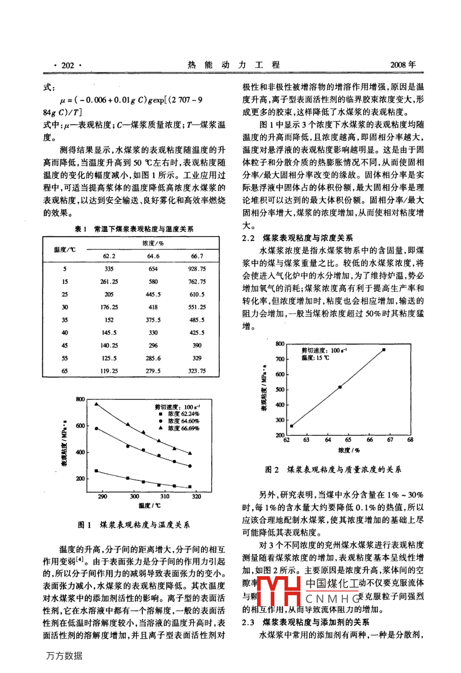 第23卷第2期熱能力工程Vol 23, N2008年3月JOURNAL OF ENGINEERING FOR THERMAL ENERGY AND POWERhar.,2008文章編號:1001-2060(2008)0-001-05高濃皮水煤漿流變特性和穩(wěn)定性試驗硏究趙國華,段鈺鋒,徐峰,王秋粉(東南大學潔凈煤發(fā)電及燃燒技術教育部重點實驗室,江蘇南京21009%6)摘要:水煤漿是由液兩相組成的非牛頓流體流變性和性較好的兗州煤水煤漿,濃度分別為62.2%、64.6%穩(wěn)定性十分復雜,影響因素也很多,其流變特性和穩(wěn)定特性和667%進行試驗研究。添加劑采用外購添加劑,對管道輸送和燃燒性能起著決定性的作用。借助于水媒漿煤漿采用大同煤粉自行配置成漿,分別配置了濃度粘度計對質量濃度為60%以上的水煤漿進行流變性測量為602%含有添加劑和不含添加劑的漿體進行實研究了溫度、濃度和添加劑對煤漿流變性的影響,水煤漿的驗。流變性實驗采用國產NXS-4C型旋轉粘度計、表觀粘度隨溫度的升高而降低,隨濃度增加而增大,添加劑的加入大大改善水煤漿的流變特性。通過對水煤漿穩(wěn)定HS-4型恒溫浴槽和烘箱等設備進行測量。的研究,得出了水煤漿的穩(wěn)定性隨濃度增加而增加,與煤種研究水煤漿的穩(wěn)定性及影響因素,采用200ml有關,適量的添加劑能改善德定性,穗定性隨溫度升高而降的廣口瓶測定水煤漿的析水率。將待測的一定濃度低。從榆遂水煤漿慈體經濟角度看,水煤漿的輸送溫度在樣品置于廣口瓶中將水煤漿靜置一定時間后煤漿20~40℃為宜中煤顆粒的沉降,水煤漿分成兩部分,用玻璃管吸出關鍵詞:水煤漿;流變性;穩(wěn)定性;影響因素瓶中表面的水,并用標準量筒(20ml)測定其體積。隨靜置時間的不同,可測出析水率隨時間的變化關中圖分類號:TQ534.4文獻標識碼:A系。靜置時間分別為:4、8、12、24、36、48、60和72h引言配制不同質量濃度的大同煤水煤漿進行實驗,研究濃度對穩(wěn)定性的影響,采用大同煤和神華煤研究煤我國煤炭資源豐富油氣匱乏煤炭在能源結構種對穩(wěn)定性的影響通過加入和不加入添加劑研究中仍占主導地位。發(fā)展?jié)崈裘杭夹g,提高我國煤炭穩(wěn)定性的影響在溫度分別為17、40、52℃下進行實利用率減少煤炭燃燒帶來的環(huán)境污染,需要大力發(fā)驗,研究溫度對穩(wěn)定性的影響展大規(guī)模煤氣化技術。開發(fā)水煤漿氣化技術是煤氣化技術的一個重要分支。發(fā)展該技術的目標是達到2高濃度水煤漿流變特性的研究更高的日處理能力和碳轉化率,這就決定了所使用的水煤漿要具有較好的可泵性和燃燒特性,而這些2.1煤漿表觀粘度與溫度關系特性又直接取決于水煤漿的流變性和穩(wěn)定性-21表觀粘度是在剪切速率一定情況下(通常是因此開展高濃度水煤漿流變特性和穩(wěn)定性的基礎100時)測出來的粘度。對濃度為622%、64.6%研究具有重要的理論意義和實用價值。影響水煤漿和66.7%煤漿,測量其不同溫度下的表觀粘度,數流變性和穩(wěn)定性的因素很多,本文主要分析溫度、濃據如表1所示。文獻[3]對牛頓流體的粘度研究表度及添加劑對高濃度水煤漿流變性的影響和濃度、明,其粘度隨溫度的升高而降低,且近似的服從Ar煤種、添加劑及溫度對水煤漿穩(wěn)定性的影響。rhenius關系式:u=Aexp(-B/T)試驗方法及試驗物料式中:T—絕對溫度;A和B-流體常數。把這個公式應用到具有非牛頓流體性研究溫度、濃度和添加劑對水煤漿粘度的影響質的中國煤化工慮濃度的影響關規(guī)律,在5~65℃的溫度范圍內進行實驗,選擇穩(wěn)定系可CNMHG度通用經驗關系收稿日期:2007-04-13;修訂日期:200-05-21基金項目:國家重點基礎研究發(fā)展計劃(973)基金資助項目(200CB21701)作者簡介:趙國華(1983-),男江蘇如奉人,東南大學碩士研究生202熱能動力工程2008年式極性和非極性被增溶物的增溶作用增強,原因是溫p=(-0.006+0.01gC)gep[(2707-9度升高,離子型表面活性劑的臨界膠束濃度變大,形84g C)/T]成更多的膠束,這樣降低了水煤漿的表觀粘度。式中:μ-表觀粘度;C一煤漿質量濃度;T—煤漿溫圖1中顯示3個濃度下水煤漿的表觀粘度均隨度。溫度的升高而降低,且濃度越高,即固相分率越大測得結果顯示,水煤漿的表觀粘度隨溫度的升溫度對懸浮液的表觀粘度影響越明顯。這是由于固高而降低,當溫度升高到50℃左右時,表觀粘度隨體粒子和分散介質的熱膨脹情況不同,從而使固相溫度的變化的幅度減小,如圖1所示。工業(yè)應用過分率/最大固相分率改變的緣故。固體相分率是實程中,可適當提高漿體的溫度降低高濃度水煤漿的際懸浮液中固體占的體積份額,最大固相分率是理表觀粘度,以達到安全輸送、良好霧化和高效率燃燒論堆積可以達到的最大體積份額。固相分率/最大的效果。固相分率增大,煤漿的濃度增加,從而使相對粘度增表1常溫下煤漿表觀粘度與溫度關系大濃度/%2.2煤漿表觀粘度與濃度關系溫度/℃水煤漿濃度是指水煤漿物系中的含固量,即煤928.75漿中的煤與煤漿重量之比。較低的水煤漿濃度,將會使進入氣化爐中的水分增加,為了維持爐溫,勢必261.25762,75445,5增加氧氣的消耗;煤漿濃度高有利于提高生產率和轉化率但濃度增加時,粘度也會相應增加,輸送的阻力會增加,一般當煤粉濃度超過50%時其粘度猛增剪切速度:100125.5285.6溫度:15℃323,75濃度6460%▲濃度666%濃度/%圖2煤漿表觀粘度與質量濃度的關系另外,研究表明,當煤中水分含量在1%~30%溫度/℃時,每1%的含水量大