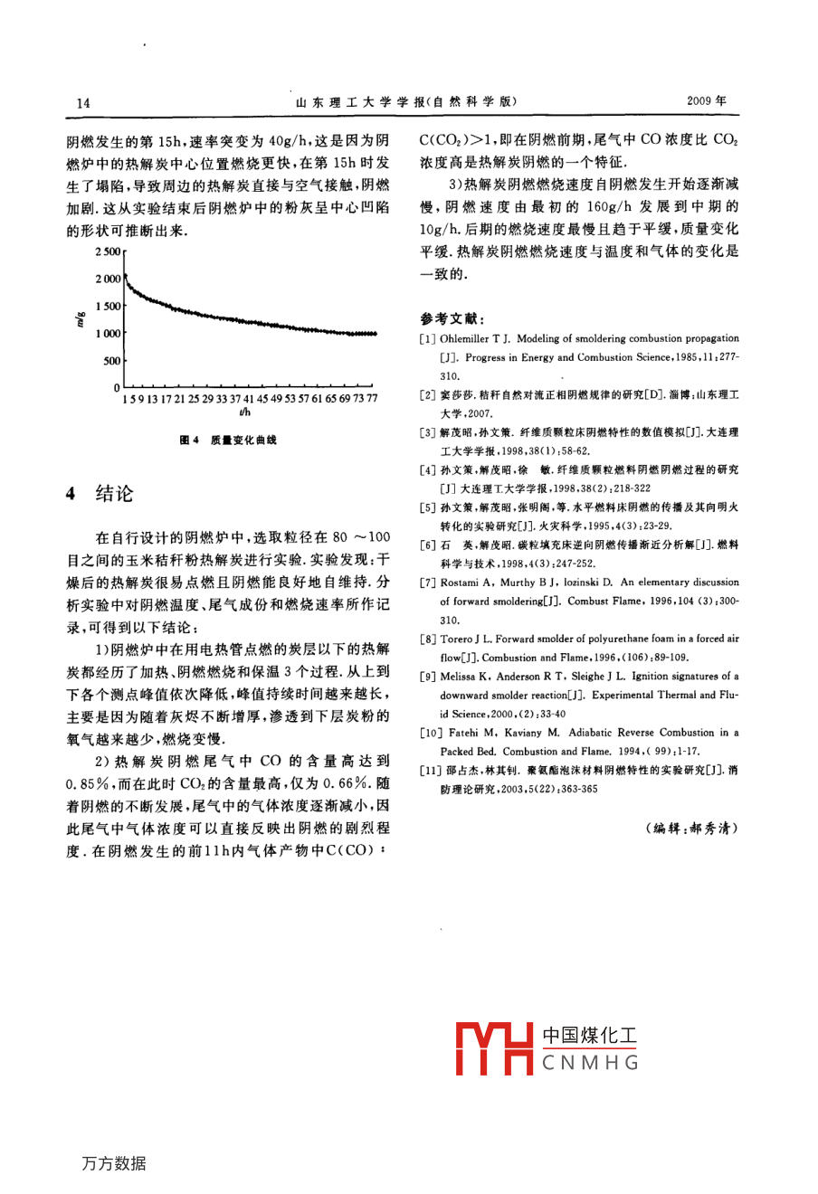 第23卷第4期山東理工大學(xué)學(xué)報(自然科學(xué)版)Vol. 23 No 42009年7月Journal of Shandong University of Technology(Natural Science Edition)文章編號:1672-6197(209)04-0011熱解炭陰燃特性的實驗研究徐攀,何芳(山東理工大學(xué)輕工與農(nóng)業(yè)工程學(xué)院,山東淄博255049)摘要:為了研究熱解炭陰燃特性,在自行設(shè)計的炭粉陰燃實驗臺上對玉米秸稈粉熱解殘?zhí)筷幦继匦灾械臏囟取⑽矚夂腿紵俣冗M(jìn)行研究,實驗結(jié)果表明:隨著陰燃前鋒下移,各溫度測點峰值逐漸下降,峰值持續(xù)時間增長;在陰燃發(fā)生的前11h內(nèi),氣體產(chǎn)物中C(CO):C(CO2)>1;陰燃初期的陰燃速度最快,隨后逐漸減慢關(guān)鍵詞:熱解;炭;陰燃中圖分類號:TQ91文獻(xiàn)標(biāo)識碼:AExperimental investigation in smoldering characteristics of pyrolytic charcoalXU Pan, HE Fang(School of Light Industry and Agricultural Engineering, Shandong University of Technology, Zibo 255049, ChinaAbstract: The smoldering characteristic of pyrolytic charcoal made from the powder of corn stalkwas studied on a smoldering stove which was designed by ourselves. The smoldering temperature, the flue gases and smoldering speed were recorded online during the experiments. Experimental results show that, with the smoldering front descending, the peak values of these thermo-couples gradually decline and last for a longer time. Within 1l hours from the beginning, the mo-lar ratio of Co to CO, in flue gases is more than 1. There is a peak value of the smoldering speedduring the initial stage of smoldering, but with the smoldering front descending, the smolderingspeed declines gradually.Key words: pyrolysis; charcoal smoldering陰燃是一種基本的燃燒方式,是指材料依靠氧粒徑均勻,因此熱解炭的陰燃過程同聚氨酯泡沫秸氣直接接觸其凝聚相表面氧化釋放的熱量進(jìn)行自維稈等物料的陰燃實驗過程相比有較好的可重復(fù)性持的緩慢低溫?zé)o焰的燃燒方式.從20世紀(jì)50年干燥后的熱解炭水份含量低,內(nèi)部結(jié)構(gòu)疏松,有利于代開始至今的50多年間國內(nèi)外學(xué)者對陰燃進(jìn)行了熱解炭陰燃過程自維持此外,生物質(zhì)熱裂解產(chǎn)生的許多實驗研究2-,這些研究對于認(rèn)識陰燃具有重殘?zhí)空嘉锪腺|(zhì)量一定比例,若對其不加以處理就可要的參考價值.經(jīng)分析發(fā)現(xiàn):這些研究使用的陰燃物能發(fā)生陰燃.熱解炭陰燃的研究對生物質(zhì)熱裂解也料化學(xué)性質(zhì)復(fù)雜,陰燃過程影響因素眾多,且各因素有一定的參考價值相互作用,實驗可重復(fù)性差用生物質(zhì)熱解殘?zhí)窟M(jìn)行陰燃實驗具有可重復(fù)性1實驗臺的設(shè)計好、次要影響因素少的優(yōu)點,能為陰燃的理論分析提供可靠的實驗數(shù)據(jù).熱解炭主要成分是碳和粉灰,其實驗臺如圖1所示,主要包括電路控制、陰燃燃中國煤化工收稿日期:2008-12-29CNMHG基金項目:山東省自然科學(xué)基金資助項目(2004ZX21)作者簡介;徐攀(1984-),男,碩士研究生.E-mail:xpan5l@126.com1山東理工大學(xué)學(xué)報(自然科學(xué)版)2009年燒爐爐體數(shù)據(jù)采集系統(tǒng)三部分集系統(tǒng)1.1電路控制部分集系統(tǒng)主要由電子秤、紅外線氣體分析電路控制部分是指在電控箱里控制炭粉的點儀、溫度監(jiān)控組件和計算機組成電子秤的最大量程燃尾氣加熱的溫度,電子秤、紅外線氣體分析儀、溫為60kg分度值0.002kg尾氣分析采用的是武漢度檢測設(shè)備以及數(shù)據(jù)采集系統(tǒng)的電源供給等四方光電科技有限公司生產(chǎn)的 Gasboard3000氣體1.2陰燃爐爐體部分分析儀.溫度監(jiān)測選用中泰力控監(jiān)控組態(tài)軟件,可以爐體部分是炭粉陰燃實驗裝置的主體,由陰燃對測試的溫度實時監(jiān)測能對數(shù)據(jù)進(jìn)行管理統(tǒng)計和燃燒爐、點火裝置、熱電偶組和煙罩等組成查詢計算機中的數(shù)據(jù)采集程序?qū)崿F(xiàn)數(shù)據(jù)的同步定1)陰燃燃燒爐時采集陰燃燃燒爐是用直徑為316mm、深度為280mm的陶瓷保溫桶放在內(nèi)徑為390mm、高為2材料與方法350mm的不銹鋼圓桶中,四周和底端的中空部分用礦渣棉填充而成.2.1實驗材料2)點火裝置山東理工大學(xué)清潔能源中心玉米秸稈粉熱參考文獻(xiàn)[6],經(jīng)過多次預(yù)實驗后最終確定點燃裂解后的殘?zhí)繛槲锪?本實驗所用的熱解炭是在熱炭粉溫度為500℃.自制的不銹鋼電熱管點火裝置解溫度為475C下得到的熱解后的炭粉溫度很高是用管徑為10mm的電熱管在一水平面上盤繞4圈若直接置于空氣中會發(fā)生陰燃,所以先把炭粉放入而成,外徑為360m,管間距為40m,測試得到點密封瓶中,等溫度降下來再裝進(jìn)編織袋實驗選用的炭粉粒徑范圍是80~100目之間.分別用WZR1T火裝置的功率為2.4kW.熱值儀和馬弗爐測定熱解炭的熱值和含碳量,經(jīng)測3)熱電偶組采用4枝不同長度的直徑為1mm的鎧裝K型定,實驗所選用熱解炭的平均高位熱值是20267.173kJ/kg,含碳量為60.83%,詳見表熱電偶.最短的熱電偶長為140mm,依次遞增表1熱解炭含碳量50mm.用合適的聚四氟模壓管切割成片然后鉆孔固定好熱電偶即可得到熱電偶組熱解炭灰分質(zhì)量碳的質(zhì)量含碳量平均值質(zhì)量/g/g4)煙罩自制的煙罩邊緣是用鐵皮做成的直徑為1.1070.4290.67861.20mm,高為100mm的圓桶;距離圓桶上邊緣0.601200mm處是直徑為90mm的煙囪連接部分,直接與1.0760.65560.8實驗室現(xiàn)有的煙囪相連;用鐵皮把圓桶部分和煙囪的連接部分焊接