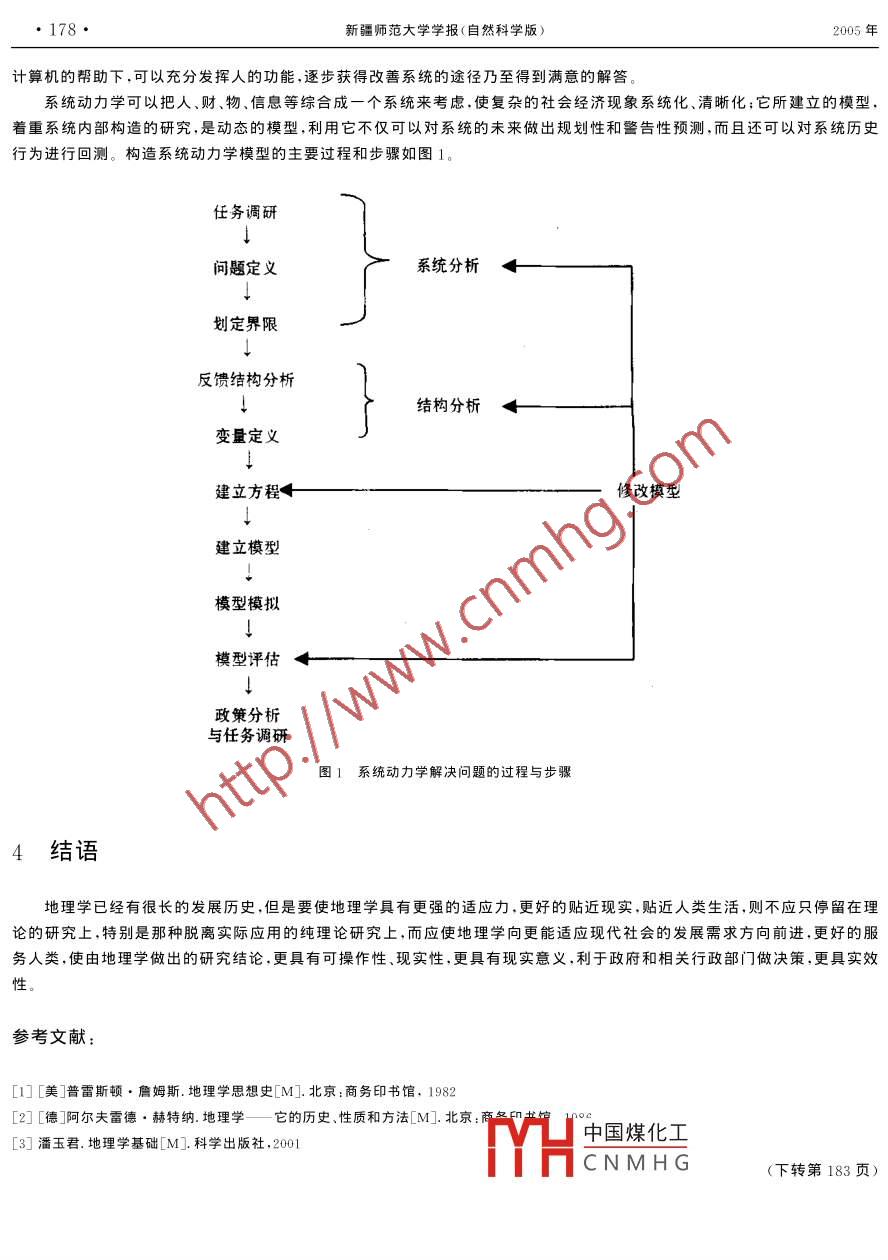 第24卷第3期新疆師范大學(xué)學(xué)報》(自然科學(xué)版Vol 24. No. 32005年9月Journal of Xinjiang Normal Universityp.2005(Natural sciences edition)淺談地理工程與系統(tǒng)動力學(xué)邢永建,趙梅,唐湘玲,龍海麗(新疆師范大學(xué)生命與環(huán)境科學(xué)學(xué)院,新疆烏魯木齊830053)摘要:地理學(xué)的發(fā)展從古典時期到近代時期到現(xiàn)代地理學(xué),經(jīng)過了漫長過程,可以說自從人類誕生以來,地理學(xué)就產(chǎn)生了,并且不斷發(fā)展壯大,為社會的發(fā)展進步做出了很大的貢獻。隨著社會的進步,應(yīng)用地理學(xué)也隨之產(chǎn)生,它的產(chǎn)生使地理學(xué)更加貼近現(xiàn)實,更能符合人類社會的需求,使地理學(xué)更具生命力。文章所說的地理工程及系統(tǒng)動力學(xué)就是基于更好地為社會服務(wù),為人類服努的目的,通過借助計算機技術(shù),工程原理,模型化等使地理學(xué)更加適應(yīng)現(xiàn)代化建設(shè)需要,也使地理學(xué)具有更寬廣的發(fā)展空關(guān)鍵詞:地理學(xué);地理學(xué)應(yīng)用;地理工程;系統(tǒng)動力學(xué)中圖分類號:P9文獻標識碼:A文章編號:10089659-(2005)-03-017603地理學(xué)具有相當長的發(fā)展史,可以說有了人類,地理學(xué)也就隨之誕生了,而且地理學(xué)的研究范團也特別寬廣,似乎與各:科都有一定聯(lián)系和各研究領(lǐng)域都有一定聯(lián)系,有人說地理學(xué)好比萬金油,哪里都用得上,可惜就是沾邊,不能比各更具體的學(xué)科研究得深刻,應(yīng)用得自如,比如地理學(xué)中的水文學(xué)不如水利部門的水文技術(shù),地理學(xué)的氣象知識不如氣象部門氣象專業(yè)知識,這樣很多地理學(xué)工作者就會發(fā)現(xiàn)地理學(xué)所涵蓋的知識很廣,但比相應(yīng)專業(yè)學(xué)科來得膚淺,特別是當面對政府,行政部門索要具體措施,實施步驟時更是無從下手。從這個角度上,地理學(xué)在實際上的應(yīng)用就勢必呈現(xiàn)一定問題,有人甚至提出地理學(xué)無用武之地的謬說,鑒于此已有許多地理工作者在研究地理學(xué)的出路問題1地理工程的產(chǎn)生及設(shè)計原則地理工程就在這樣一種情況下,應(yīng)運而生了,地理學(xué)要獨樹一幟,要在實際應(yīng)用中占有一席之地,更好地服務(wù)于現(xiàn)代化建設(shè)與工程結(jié)合確實是一條極好的道路。地理工程相當于地段設(shè)計,這在地理學(xué)的發(fā)展道路上走岀重要的一步,是地理學(xué)發(fā)展史上空前的壯舉更符合現(xiàn)代社會實際應(yīng)用的需要。地理工程相當于其他專業(yè)工程部門的工程設(shè)計,要求有很強的可操作性和規(guī)范性,人們在對地球表層空間系統(tǒng)進行有目的開發(fā)、保護、利用和改造時,有總體目標并按照一定的步驟和順序分階段,分項目進行,在這個過程中各階段和各項目的工作具有特殊性,但是這些工作必須在總體上相互協(xié)調(diào),以達到總體目標的實現(xiàn),做到“理論——設(shè)計——實施”地理工程是人為事物,是人類與地理環(huán)境的共生物,其設(shè)計應(yīng)符合系統(tǒng)工程原理,應(yīng)遵循社會安定優(yōu)化原則,環(huán)境穩(wěn)健控制原則和區(qū)域發(fā)展與優(yōu)化原則1.1系統(tǒng)設(shè)計從地理工程目標,構(gòu)成和協(xié)調(diào)方面來完成地理工程的設(shè)計大致包括以下三個方面(1)總體目標確定和方案選擇(2)總體結(jié)構(gòu)確定與子項目的確定(3)系統(tǒng)反饋中國煤化工1.2參數(shù)設(shè)計CNMH個確定的子頂目提出科學(xué)的、語義清楚的、可供實施的措施來如上任⊥言盟以爹效選定那樣,明確細致,毫無疑義,在地理學(xué)中選址問題應(yīng)該屬于這個范疇?!吧鷳B(tài)設(shè)計”工作屬于“參數(shù)”設(shè)計,它的結(jié)論可以被實施部門直接引用,過去我們對水土流失問題只講“種草種樹”,“宜農(nóng)則農(nóng),宜牧則牧”,但對種什么草,種在什么地方,什么季節(jié)種,什么地方宜農(nóng),什么地收璃百數(shù)據(jù)-3-9作者簡介:邢永建(1976—),男,漢族,在讀碩士研究生,主要從事GIs與地理學(xué)方向的研究第3期邢永建等淺談地理工程與系統(tǒng)動力學(xué)·177方宜牧,適宜程度如何,并不明確,結(jié)果不能付諸實施。地理學(xué)“戰(zhàn)略論”者,往往就是在這一點上趨于失敗,不提岀具體措施規(guī)劃,被實施部門拒絕或者擱置一邊,因為實施部門的領(lǐng)導(dǎo)者不知如何實現(xiàn)這種規(guī)劃,只能停留在“紙中畫畫,墻上掛掛”階段要做好參數(shù)設(shè)計,必須有科學(xué)根據(jù),必須基于對對象的深刻研究上,對于地理學(xué)而言,這個深刻研究的結(jié)論,一方面可以從其他學(xué)科吸取,另一方面,根據(jù)地學(xué)的區(qū)域性特點,應(yīng)把注意力放到中小尺度地理問題上,從而得到科學(xué)的“參數(shù)”,使我們在實施工程時,可以實現(xiàn)“參數(shù)”選擇和“參數(shù)”設(shè)計3決策分析與立法研究地理問題的復(fù)雜性在于可能同時存在幾種實施方案,并且各有優(yōu)劣,因此需要開展決策分析,決策分析內(nèi)容包括兩個方面,其一是基于地理工程的三個基本原則:對各方案直接的經(jīng)濟效益,生態(tài)效益,社會效益做出評價;其二是利用預(yù)測方法對地理工程的環(huán)境、社會、地緣效應(yīng)做岀較長期的