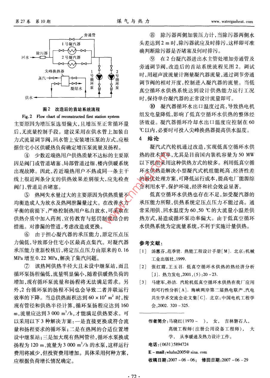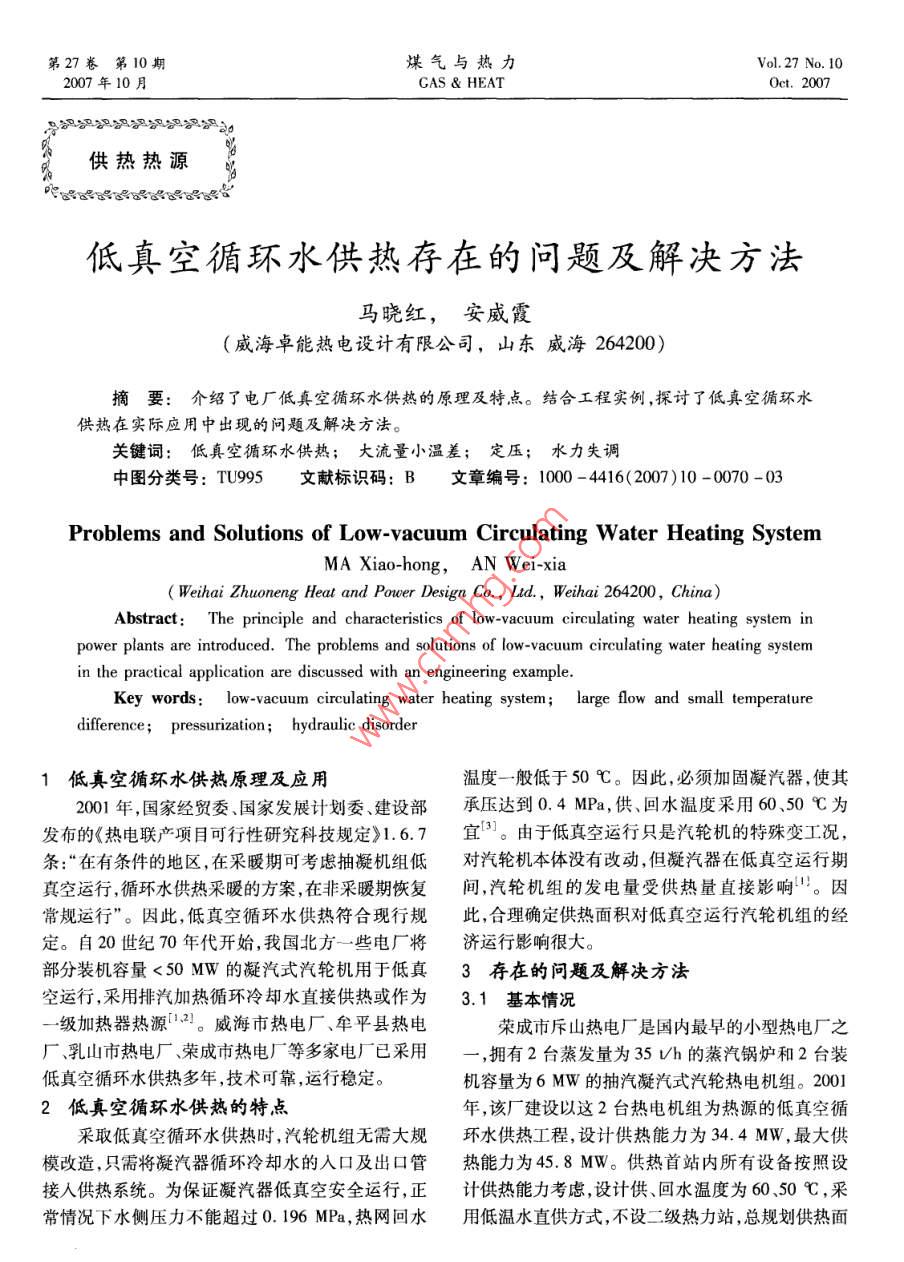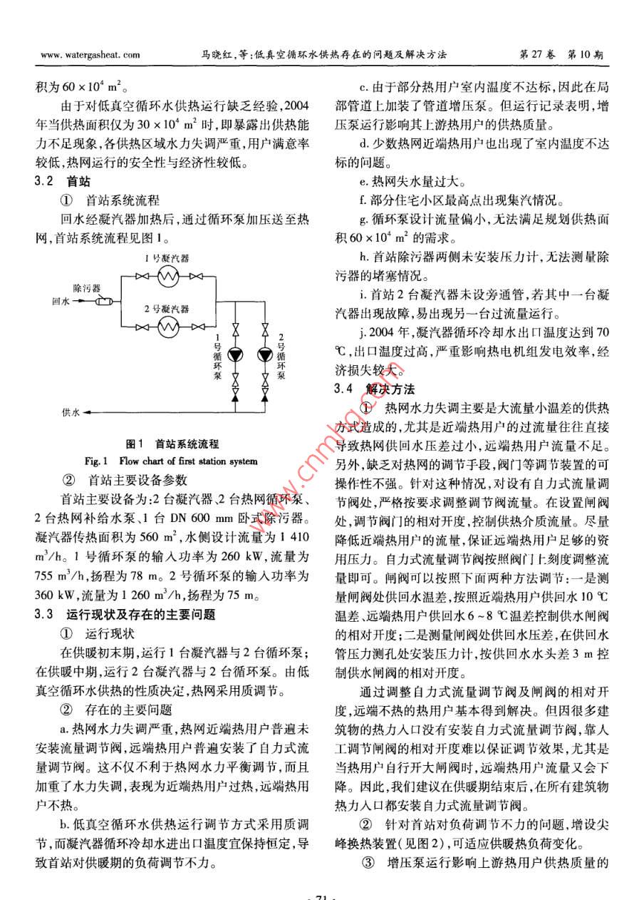 第27卷第10期煤氣與熱力Vol, 27 No. 102007年10月Gas heatOct,2007及》》》》A6公供熱熱源低真空循環(huán)水供熱存在的問題及解決方法馬曉紅,安威霞威海卓能熱電設(shè)計有限公司,山東威海264200)摘要:介紹了電廠低真空循環(huán)水供熱的原理及特點。結(jié)合工程實例,探討了低真空循環(huán)水供熱在實際應(yīng)用中出現(xiàn)的問題及解決方法。關(guān)鍵詞:低真空循環(huán)水供熱;大流量小溫差;定壓;水力失調(diào)中圖分類號:TU995文獻標(biāo)識碼:B文章編號:1000-4416(2007)10-0070-03Problems and Solutions of Low-vacuum Circulating Water Heating SystemMA Xiao-hong, AN Wei-xiaWeihai Zhuoneng Heat and Power Design Co, Lid, Weihai 264200, China)Abstract: The principle and characteristics of low-vacuum circulating water heating system inpower plants are introduced. The problems and solutions of low-vacuum circulating water heating systemin the practical application are discussed with an engineering exampleKey words: low-vacuum circulating water heating system; large flow and small temperaturedifference; pressurization; hydraulic disorder1低真空循環(huán)水供熱原理及應(yīng)用溫度一般低于50℃。因此,必須加固凝汽器,使其2001年,國家經(jīng)貿(mào)委、國家發(fā)展計劃委、建設(shè)部承壓達到0.4MPa,供、回水溫度采用60、50℃為發(fā)布的《熱電聯(lián)產(chǎn)項目可行性研究科技規(guī)定》1.6.7宜3。由于低真空運行只是汽輪機的特殊變工況,條:“在有條件的地區(qū),在采暖期可考慮抽凝機組低對汽輪機本體沒有改動,但凝汽器在低真空運行期真空運行,循環(huán)水供熱采暖的方案,在非采暖期恢復(fù)間,汽輪機組的發(fā)電量受供熱量直接影響。因常規(guī)運行”。因此,低真空循環(huán)水供熱符合現(xiàn)行規(guī)此,合理確定供熱面積對低真空運行汽輪機組的經(jīng)定。自20世紀70年代開始,我國北方一些電廠將濟運行影響很大。部分裝機容量<50MW的凝汽式汽輪機用于低真3存在的問題及解決方法空運行,采用排汽加熱循環(huán)冷卻水直接供熱或作為3.1基本情況級加熱器熱源2。威海市熱電廠、牟平縣熱電榮成市斥山熱電廠是國內(nèi)最早的小型熱電廠之廠、乳山市熱電廠、榮成市熱電廠等多家電廠已采用,擁有2臺蒸發(fā)量為35Uh的蒸汽鍋爐和2臺裝低真空循環(huán)水供熱多年,技術(shù)可靠,運行穩(wěn)定機容量為6MW的抽汽凝汽式汽輪熱電機組。20012低真空循環(huán)水供熱的特點年,該廠建設(shè)以這2臺熱電機組為熱源的低真空循釆取低真空循環(huán)水供熱時,汽輪機組無需大規(guī)環(huán)水供熱工程,設(shè)計供熱能力為34.4MW,最大供模改造,只需將凝汽器循環(huán)冷卻水的入口及出口管熱能力為45.8MW。供熱首站內(nèi)所有設(shè)備按照設(shè)接人供熱系統(tǒng)。為保證凝汽器低真空安全運行,正計供熱能力考慮,設(shè)計供、回水溫度為6050℃,采常情況下水側(cè)壓力不能超過0.196MPa,熱網(wǎng)回水用低溫水直供方式,不設(shè)二級熱力站,總規(guī)劃供熱面www.watergasheat.com馬曉紅,等:低真空循環(huán)水供熱存在的問題及解決方法第27卷第10期積為60×104m2。c.由于部分熱用戶室內(nèi)溫度不達標(biāo),因此在局由于對低真空循環(huán)水供熱運行缺乏經(jīng)驗,2004部管道上加裝了管道增壓泵。但運行記錄表明,增年當(dāng)供熱面積僅為30×10′m2時,即暴露出供熱能壓泵運行影響其上游熱用戶的供熱質(zhì)量。力不足現(xiàn)象,各供熱區(qū)域水力失調(diào)嚴重,用戶滿意率d.少數(shù)熱網(wǎng)近端熱用戶也出現(xiàn)了室內(nèi)溫度不達較低,熱網(wǎng)運行的安全性與經(jīng)濟性較低。標(biāo)的問題。3.2首站e.熱網(wǎng)失水量過大。①首站系統(tǒng)流程f.部分住宅小區(qū)最高點出現(xiàn)集汽情況。回水經(jīng)凝汽器加熱后,通過循環(huán)泵加壓送至熱g.循環(huán)泵設(shè)計流量偏小,無法滿足規(guī)劃供熱面網(wǎng),首站系統(tǒng)流程見圖1。積60×10m2的需求。號凝汽h.首站除污器兩側(cè)未安裝壓力計,無法測量除污器的堵塞情況。除污器首站2臺凝汽器未設(shè)旁通管,若其中一臺凝2號凝汽器汽器出現(xiàn)故障,易出現(xiàn)另一臺過流量運行。j.2004年,凝汽器循環(huán)冷卻水出口溫度達到70循℃,出口溫度過高,嚴重影響熱電機組發(fā)電效率,經(jīng)濟損失較大。3.4解決方法①熱網(wǎng)水力失調(diào)主要是大流量小溫差的供熱方式造成的,尤其是近端熱用戶的過流量往往直接圖1首站系統(tǒng)流程導(dǎo)致熱網(wǎng)供回水壓差過小,遠端熱用戶流量不足。Fig. 1 Flow chart of first station system另外,缺乏對熱網(wǎng)的調(diào)節(jié)手段,閥門等調(diào)節(jié)裝置的可②首站主要設(shè)備參數(shù)操作性不強。針對這種情況,對設(shè)有自力式流量調(diào)首站主要設(shè)備為:2臺凝汽器、2臺熱網(wǎng)循環(huán)泵、節(jié)閥處,嚴格按要求調(diào)整調(diào)節(jié)閥流量。在設(shè)置閘閥2臺熱網(wǎng)補給水泵、1臺DN600m臥式除污器。處,調(diào)節(jié)閥門的相對開度,控制供熱介質(zhì)流量。盡量凝汽器傳熱面積為560m2,水側(cè)設(shè)計流量為1410降低近端熱用戶的流量,保證遠端熱用戶足夠的資m/h。1號循環(huán)泵的輸入功率為260kW,流量為用壓力。自力式流量調(diào)節(jié)閥按照閥門上刻度調(diào)整流755m3/h,揚程為78m。2號循環(huán)泵的輸入功率為量即可。閘閥