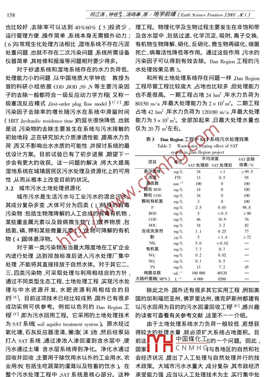 第8卷第1期地學(xué)前緣(中國地質(zhì)大學(xué)北京)Vol.8 No.12001 年3月Earth Science Frontiers ( China University of Geosciences Beijing )Mar.2001污水土地處理技術(shù)與污水資源化何江濤鐘佐湯鳴皋 陳鴻漢(中國地質(zhì)大學(xué)水資源與環(huán)境工程系北京1003 )摘要土地處理作為一種生態(tài)處理技術(shù)以其設(shè)備簡單、投資少、操作管理方便、能耗低以及凈化效果良好而具有廣闊的發(fā)展前景。文中系統(tǒng)總結(jié)了污水土地處理系統(tǒng)國內(nèi)外研究現(xiàn)狀結(jié)合當(dāng)前中國城市供、排水以及用水的特點提出了在城市水循環(huán)中應(yīng)用土地處理技術(shù)實現(xiàn)污水資源化的三個方向城鎮(zhèn)居民區(qū)生活污水資源化、城市污水土地處理資源化、微污染原水給水預(yù)處理。其中城鎮(zhèn)居民區(qū)生活污水資源化所采用的砂濾系統(tǒng)及濕地系統(tǒng)存在的主要問題是水力負(fù)荷低、處理能力低。如何解決這一問題是一個具有實用意義的研究方向。城市污水集中土地處理所采用的技術(shù)目前已經(jīng)比較成熟存在的問題是占地面積太大。因此必須根據(jù)各地區(qū)的實際情況,因地制宜地選用。應(yīng)用土地處理技術(shù)進(jìn)行微污染給水預(yù)處理是--個新的研究方向,它為解決生物預(yù)處理技術(shù)所不能解決的Ames試驗陽性提供了可能,同時也不失為--種廉價有效的方法。關(guān)鍵詞污水土地處理污水資源化中圖分類號:X52文獻(xiàn)標(biāo)識碼 :A文章編號 :005 2321( 2001 )010155 08水是人類生存的基本條件,又是國民經(jīng)濟(jì)的生已達(dá) 560600億m3其中80%以上的污水未經(jīng)處理命線。隨著人口和經(jīng)濟(jì)的增長,-方面人類對水的直接排入水域 90%以上的城市水域污染嚴(yán)重。全需求量和品質(zhì)要求越來越高另一方面水污染的范國因污染而不能飲用的地表水占全部監(jiān)測水體的圍和程度也越來越大這一對日益嚴(yán) 重的矛盾已成40% 流經(jīng)城市的河段中78%不適合作為飲用水為制約社會、經(jīng)濟(jì)和環(huán)境可持續(xù)發(fā)展的主要因素。源50%的地下水受到污染64%的人正在使用不合如何合理有效地解決這一問題,成為世界各國共同格的水源。因此水污染是造成多數(shù)城市缺水的重要關(guān)注的問題。原因。所謂污水資源化即將污水視為-種資源通過1污水資源化是 解決我國水資源短缺各種處理技術(shù) ,使其凈化達(dá)到某種用水標(biāo)準(zhǔn)從而實的必由之路現(xiàn)大部分凈化水的循環(huán)再利用,同時減少污水排放對環(huán)境造成的不良影響的這樣一個過程。 在解決水我國是世界上I3個貧水國家之一人均水量僅資源短缺的對策中應(yīng)當(dāng)將節(jié)水和污水資源化放到為世界人均水平的四分之一居世界 149個國家的首位。 通過節(jié)水可以減少不必要的浪費通過實施110位。目前在全國600多座建制市中,有400 座污水資源化 實現(xiàn)水資源的重復(fù)利用,從而緩解水資城市缺水其中缺水嚴(yán)重的城市達(dá)130 多個。全國源緊張問題。 所以筆者認(rèn)為污水資源化是解決我城市每年缺水60億m' ,日缺水量已超過1 600萬國水資源短缺的必由之 路。m3 ,且呈增長趨勢。事實上,很多地區(qū)不是沒有水,而是無可用之水。據(jù)水利部組織的全國6大流域的2中國煤化工在我國的發(fā)展前入河排污口抽樣調(diào)查推算,目前全國年排放污水量MYHCNMHG收稿日期2000-09- 28 ;修訂日期2000- 12- 22污水土地處理系統(tǒng)可以定義為利用土壤-微生基金項目國家自然科學(xué)基金資助項目( 49832005 )作者簡介:何江濤( 1974- )男 ,博士研究生,水文學(xué)及水資源物-植物系統(tǒng)的陸地生態(tài)系統(tǒng)的自我調(diào)控機(jī)制和對專業(yè),目前主要從事污水土地處理研究。污染物的綜合凈化功能處理城市污水及一些工業(yè)廢156何江濤,鐘佐菜,湯鳴皋等/地學(xué)前緣( Earth Science Frontiers )2001 ,81 )水使水質(zhì)得到不同程度改善實現(xiàn)廢水資源化與無為 飲用水和雜用水兩類。其中飲用水水質(zhì)要求達(dá)到害化的常年性生態(tài)系統(tǒng)工程1。土地處理作為生態(tài)飲用水標(biāo)準(zhǔn) 主要用途為飲用、盥洗和洗浴等。雜用學(xué)處理方法,實際上是追求土壤、含水層和植物的水水質(zhì) 要求較低主要用于廁所便器沖洗、居民區(qū)綠處理”與利用”兩個功能的總體實現(xiàn)。土壤被視為化、 洗車、掃除等。目前我國絕大部分城市的居民區(qū)“活的過濾器”作為工程系統(tǒng)進(jìn)行污水處理。污染物沒有 實現(xiàn)清污分流不管是飲用水還是雜用水全部在這-系統(tǒng)中通過物理的過濾吸附、揮發(fā)、淋溶、化以飲用水供應(yīng) 造成了水資源嚴(yán)重浪費。如果居民學(xué)的分解與轉(zhuǎn)化、植物的吸收與微生物的降解、吸收區(qū)的生活污水能夠就地處理實現(xiàn)中水回用補(bǔ)充部等作用由復(fù)雜變?yōu)楹唵?由大分子變?yōu)樾》肿佑芍卜蛛s用水 將可大量節(jié)約水資源避免浪費。目前,物、微生物不可利用變?yōu)榭衫谩⑽者M(jìn)行不斷的國內(nèi)中水處理工藝根據(jù)中水原水的水量、水質(zhì)和中更新和循環(huán)再生。從而實現(xiàn)污水的充分凈化和水、水使用要求等因素 ,可分為物化處理(優(yōu)質(zhì)雜排水和肥