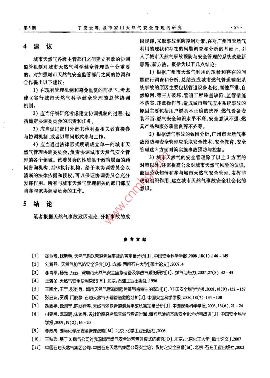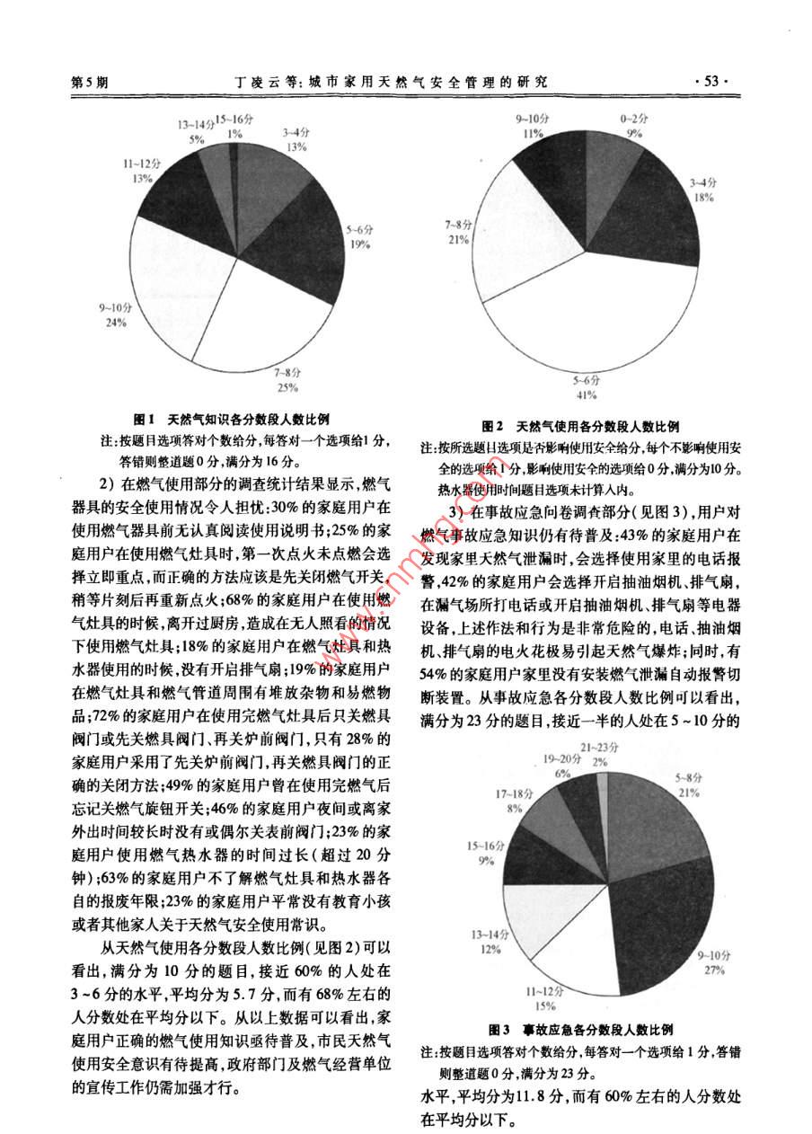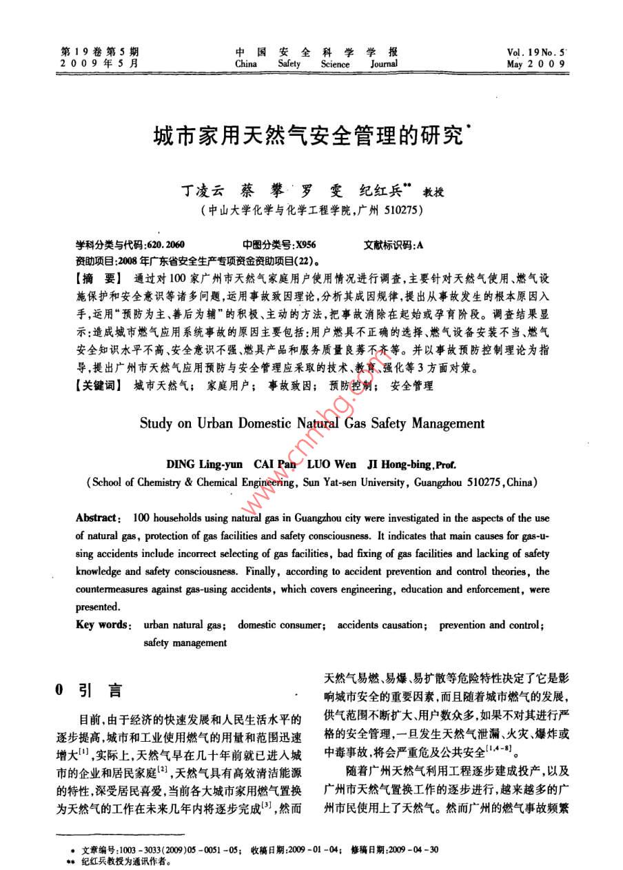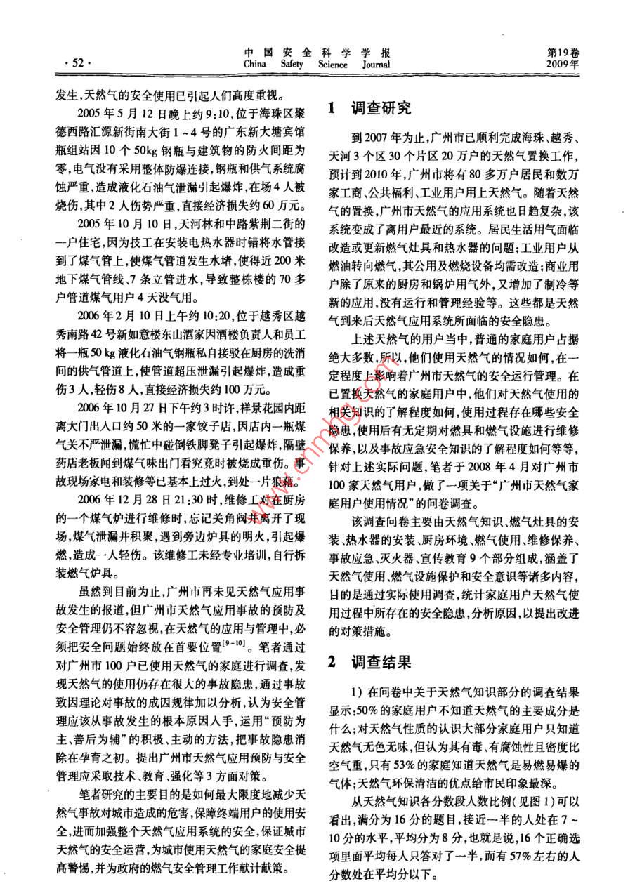 第19卷第5期安全科學學報Vol 19 No 52009年5月May 200 9城市家用天然氣安全管理的研究丁凌云蔡攀¨羅雯紀紅兵”教授(中山大學化學與化學工程學院,廣州510275)學科分類與代碼:620.2060中圖分類號:8956文獻標識碼:A資助項目:1008年廣東省安全生產(chǎn)專項資金資助項目(22)?!菊客ㄟ^對100家廣州市天然氣家庭用戶使用情況進行調(diào)查,主要針對天然氣使用、燃氣設施保護和安全意識等諸多問題,運用事故致因理論,分析其成因規(guī)律,提出從事故發(fā)生的根本原因入手,運用“預防為主、善后為輔”的積極、主動的方法,把事故消除在起始或孕育階段。調(diào)查結(jié)果顯示:造成城市燃氣應用系統(tǒng)事故的原因主要包括:用戶燃具不正確的選擇、燃氣設備安裝不當、燃氣安全知識水平不高、安全意識不強、燃具產(chǎn)品和服務質(zhì)量良券不齊等。并以事故預防控制理論為指導提出廣州市天然氣應用預防與安全管理應采取的技術(shù)、教育、強化等3方面對策?!娟P(guān)鍵詞】城市天然氣;家庭用戶;事故致因;預防控制;安全管理Study on Urban Domestic Natural Gas Safety ManagementDING Ling-yun CAI Pan LUO Wen JI Hong-bing, Prof.School of Chemistry Chemical Engineering, Sun Yat-sen University, Guangzhou 510275, China)Abstract: 100 households using natural gas in Guangzhou city were investigated in the aspects of the useof natural gas, protection of gas facilities and safety consciousness. It indicates that main causes for gas-using accidents include incorrect selecting of gas facilities, bad fixing of gas facilities and lacking of safetyknowledge and safety consciousness. Finally, according to accident prevention and control theories, thecountermeasures against gas-using accidents, which covers engineering, education and enforcement, werepresentedKeydomestic consumer; accidents causation; prevention and control;safety management天然氣易燃、易爆、易擴散等危險特性決定了它是影0引言響城市安全的重要因素,而且隨著城市燃氣的發(fā)展,目前,由于經(jīng)濟的快速發(fā)展和人民生活水平的供氣范圍不斷擴大用戶數(shù)眾多如果不對其進行嚴逐步提高城市和工業(yè)使用燃氣的用量和范圍迅速格的安全管理,一旦發(fā)生天然氣泄漏、火災、爆炸或增大,實際上,天然氣早在幾十年前就已進入城中毒事故將會嚴重危及公共安全市的企業(yè)和居民家庭2,天然氣具有高效清潔能源隨著廣州天然氣利用工程逐步建成投產(chǎn),以及的特性,深受居民喜愛,當前各大城市家用燃氣置換廣州市天然氣置換工作的逐步進行,越來越多的廣為天然氣的工作在未來幾年內(nèi)將逐步完成,然而州市民使用上了天然氣。然而廣州的燃氣事故頻繁·文章編號:1003-303(2009)05-0051-05;收稿日期:200-01-04;修稿日期:2000-04-30率紀紅兵教授為通訊作者。中國安全科學學報第19卷52·China Safety Science Journal009年發(fā)生天然氣的安全使用已引起人們高度重視。005年5月12日晚上約9:10,位于海珠區(qū)聚Ⅰ調(diào)查研究德西路匯源新街南大街1-4號的廣東新大塘賓館到2007年為止,廣州市已順利完成海珠越秀瓶組站因10個50kg鋼瓶與建筑物的防火間距為天河3個區(qū)30個片區(qū)20萬戶的天然氣置換工作,零電氣沒有采用整體防爆連接,鋼瓶和供氣系統(tǒng)腐預計到2010年,廣州市將有80多萬戶居民和數(shù)萬蝕嚴重,造成液化石油氣泄漏引起爆炸在場4人被家工商、公共福利、工業(yè)用戶用上天然氣。隨著天然燒傷,其中2人傷勢嚴重直接經(jīng)濟損失約60萬元。氣的置換,廣州市天然氣的應用系統(tǒng)也日趨復雜該200年0月10日,天河林和中路紫判二街的系統(tǒng)變成了離用戶最近的系統(tǒng)。居民生活用氣面臨戶住宅,因為技工在安裝電熱水器時錯將水管接改造或更新燃氣灶具和熱水器的問題:工業(yè)用戶從到了煤氣管上使煤氣管道發(fā)生水堵使得近200米燃油轉(zhuǎn)向燃氣其公用及燃燒設備均需改造商業(yè)用地下煤氣管線、7條立管進水,導致整棟樓的0多戶除了原來的廚房和鍋爐用氣外,又增加了制冷等戶管道煤氣用戶4天沒氣用。新的應用沒有運行和管理經(jīng)驗等。這些都是天然200年2月10日上午約10:20,位于越秀區(qū)越氣到來后天然氣應用系統(tǒng)所面臨的安全隱患。秀南路42號新如意樓東山酒家因酒樓負責人和員工上述天然氣的用戶當中,普通的家庭用戶占據(jù)將一瓶50kg液化石油氣鋼瓶私自接駁在廚房的洗消絕大多數(shù)所以,他們使用天然氣的情況如何,在間的供氣管道上,使管道超壓泄漏引起爆炸造成重定程度上影響著廣州市天然氣的安全運行管理。在傷3人,輕傷8人,直接經(jīng)濟損失約100萬元。已置換天然氣的家庭用戶中,他們對天然氣使用的200年10月27日下午約3時許祥景花園內(nèi)距相關(guān)知識的了解程度如何使用過程存在哪些安全離大門出入口約S0米的一家餃子店,因店內(nèi)一瓶煤隱患使用后有無定期對燃具和燃氣設施進行維修氣關(guān)不嚴泄漏慌忙中碰倒鐵腳凳子引起爆炸隔壁保養(yǎng),以及事故應急安全知識的了解程度如何等等,藥店老板聞到煤氣味出門看究競時被燒成重傷。事針對上述實際問題,筆者于2008年4月對廣州市故現(xiàn)場家電和裝修等已基本上過火,到處一片狼藉。10家天然氣用戶,做了一項關(guān)于“廣州市天然氣家2000年2月28日21:30時維修工對在廚房庭用戶使用情況”的問卷調(diào)查。的一個煤氣爐進行維修時,忘記關