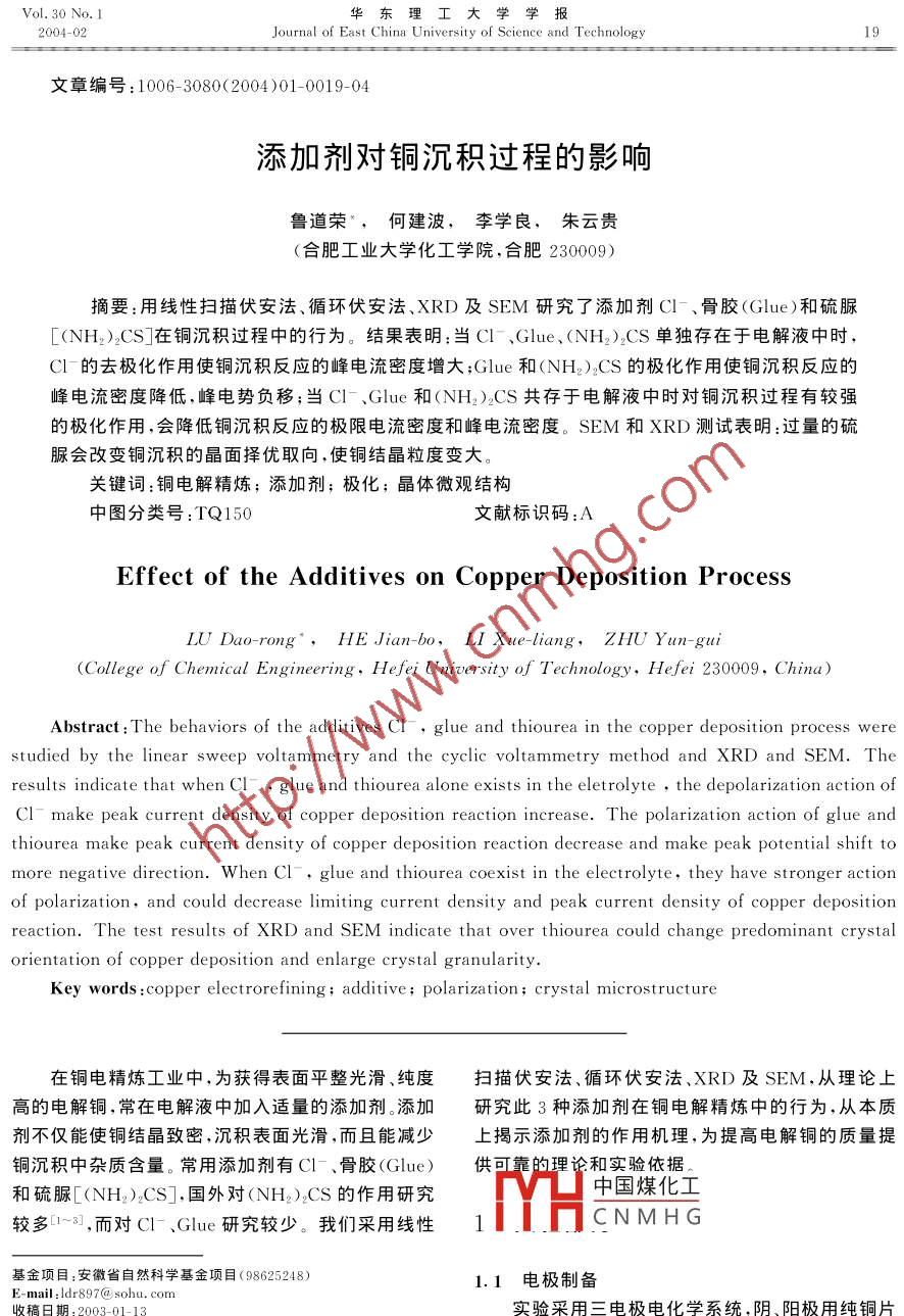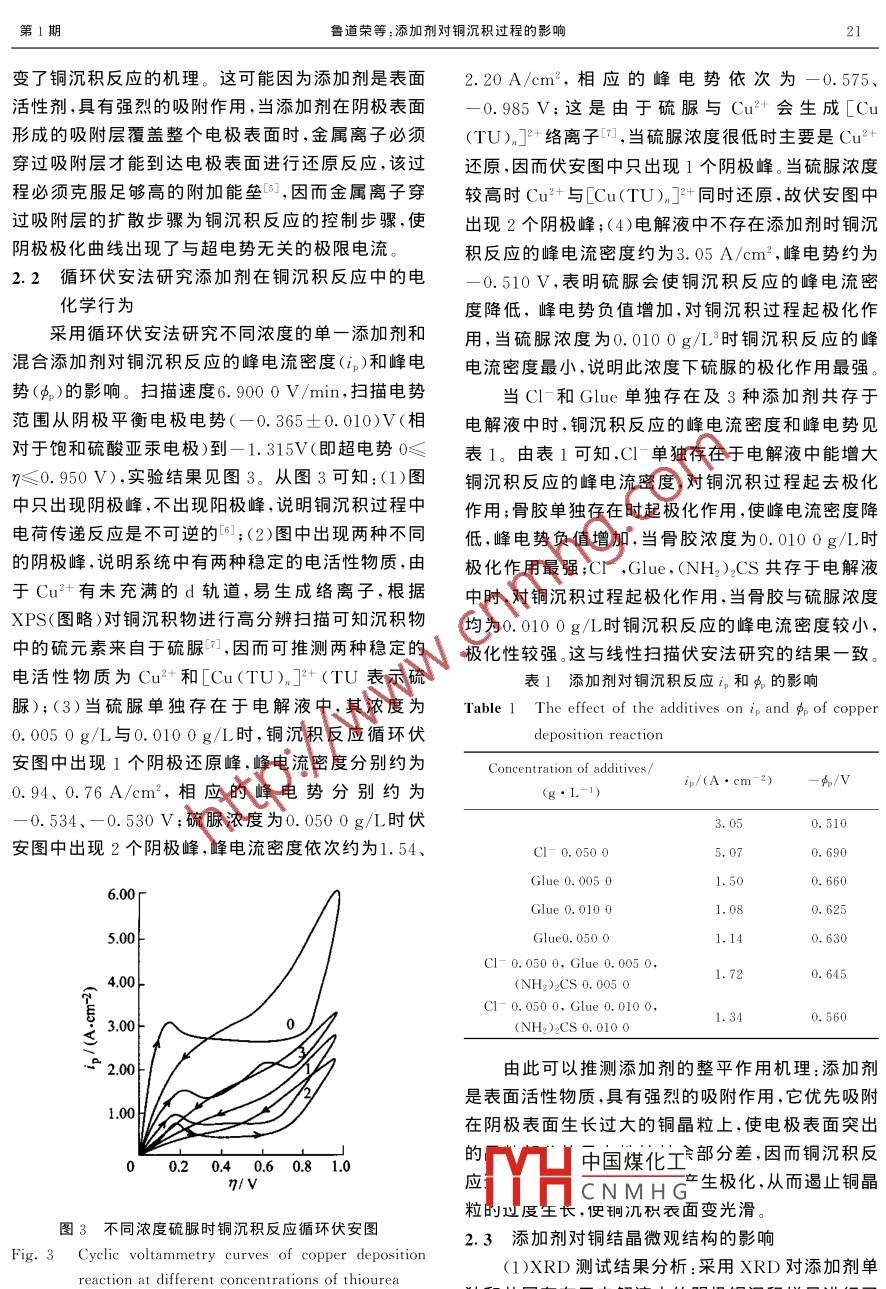 Vol. 30 No. 1華東理工大學(xué)學(xué)報(bào)2004-02Journal of East China University of Science and Technology19文章編號(hào): 1006- 3080( 2004)01-0019-04添加劑對(duì)銅沉積過程的影響魯?shù)罉s",何建波,李學(xué)良,朱云貴(合肥工業(yè)大學(xué)化工學(xué)院,合肥230009)摘要:用線性掃描伏安法、循環(huán)伏安法.XRD及SEM研究了添加劑Cl-、骨膠(Glue)和硫脲[(NH2)2CS]在銅沉積過程中的行為。結(jié)果表明:當(dāng)CI-、Glue、(NH2)2CS單獨(dú)存在于電解液中時(shí),CI-的去極化作用使銅沉積反應(yīng)的峰電流密度增大;Glue和(NH2)2CS的極化作用使銅沉積反應(yīng)的峰電流密度降低,峰電勢(shì)負(fù)移;當(dāng)C1-、Glue和(NH2)2CS共存于電解液中時(shí)對(duì)銅沉積過程有較強(qiáng)的極化作用,會(huì)降低銅沉積反應(yīng)的極限電流密度和峰電流密度。SEM和XRD測(cè)試表明:過量的硫脲會(huì)改變銅沉積的晶面擇優(yōu)取向,使銅結(jié)晶粒度變大。關(guān)鍵詞:銅電解精煉;添加劑;極化;晶體微觀結(jié)構(gòu)中圖分類號(hào):TQ150文獻(xiàn)標(biāo)識(shí)碼:AEffect of the Additives on Copper Deposition ProcessLU Dao-rong* ,HE Jian-bo,LI Xue -liang,ZHU Yun-gui(College of Chemical Engineering, Hefei University of Technology, Hefei 230009, China)Abstract: The behaviors of the additives CI,glue and thiourea in the copper deposition process werestudied by the linear sweep voltammetry and the cyclic voltammetry method and XRD and SEM. Theresults indicate that when CI,glue and thiourea alone exists in the eletrolyte , the depolarization action ofCI- make peak current density of copper deposition reaction increase. The polarization action of glue andthiourea make peak current density of copper deposition reaction decrease and make peak potential shift to .more negative direction. When Cl-,glue and thiourea coexist in the electrolyte, they have stronger actionof polarization, and could decrease limiting current density and peak current density of copper depositionreaction. The test results of XRD and SEM indicate that over thiourea could change predominant crystalorientation of copper deposition and enlarge crystal granularity. .Key words :copper electrorefining; additive; polarization; crystal microstructure在銅電精煉工業(yè)中,為獲得表面平整光滑、純度掃描伏安法、循環(huán)伏安法、XRD及SEM,從理論上高的電解銅,常在電解液中加入適量的添加劑。添加研究此3種添加劑在銅電解精煉中的行為,從本質(zhì)劑不僅能使銅結(jié)晶致密,沉積表面光滑,而且能減少上揭示添加劑的作用機(jī)理,為提高電解銅的質(zhì)量提銅沉積中雜質(zhì)含量。常用添加劑有C1-、 骨膠(Glue)供可靠的理論和實(shí)驗(yàn)依據(jù).中國(guó)煤化工和硫脲[(NH2)2CS],國(guó)外對(duì)(NH2)2CS的作用研究較多[1~8], ,而對(duì)CI一、Glue 研究較少。我們采用線性MHCNMH G基金項(xiàng)目:安徽省自然科學(xué)基金項(xiàng)目(98625248)1.1 電極制備E-mail :ldr897@ sohu. com收稿日期: 2003-01-13實(shí)驗(yàn)采用三電極電化學(xué)系統(tǒng),陰、陽極用純銅片作者簡(jiǎn)介:魯?shù)罉s(1953-),女,安徽和縣人,教授,研究方向:電化學(xué)(含銅99.98%)制取,電極面積為1 cmX1 cm(線性基礎(chǔ)理論、電解、電鍍與電源。20華東理工大學(xué)學(xué)報(bào)第30卷掃描伏安法)、0.4 cmX0.4 cm(循環(huán)伏安法),參比度降低,產(chǎn)生強(qiáng)烈的極化。實(shí)驗(yàn)還發(fā)現(xiàn),當(dāng)硫脲濃度電極選用飽和硫酸亞汞電極。電解前用不同型號(hào)的增至0.0200g/L時(shí),其極化作用反而減弱;在陰極金相砂紙將電極表面磨光,并用丙酮和w=0.10的超電勢(shì)0.100V≤η≤0.200V范圍內(nèi),硫脲使銅沉稀硫酸溶液分別浸泡,除去電極表面的油漬和氧化積反應(yīng)產(chǎn)生極限電流(圖略)。物。5001.2實(shí)驗(yàn)條件電解溫度60 C;電解液組成(g/L):CuSO.●4005H2O 165、H2SO, 200、KCl 0.105 0、Glue 0.005 0~300%40.050 0、(NH2)2CS 0. 005 0~0.050 0;所用試劑均V4為分析純,電解液用二次蒸餾水配制。線性掃描伏安二200t法掃描速度0.0060 V/min;循環(huán)伏安法掃描速度100 F6. 900 0V /min。XRD測(cè)試采用銅靶,管電壓40 kV,管電流0.10 A,步進(jìn)2*/min。023451.3 實(shí)驗(yàn)儀器η/ 10~2vHDV-7B型晶體管恒電位儀,DCG-2型多功能圖1單一添加劑存在于電解液陰極極化曲線程序給定器,LZg型x-y函數(shù)記錄儀,C4型mA mVFig.1 Cathode polarization curves when additives by one-電表(0.2級(jí)),超級(jí)恒溫槽,雙管電解池,日本理學(xué)公self in the electrolyte司D/max YB型X射線衍射儀,日本日立公司X-Concentration of additives/(g ●L-1);1- -Glue 0.0100; 2- Glue .650型掃描電子顯微鏡等。0. 0050;3- -(NH2):CS 0.0100; 4-(NH2):CS 0. 005 0;5- -CI-1.4 測(cè)試樣品制備.0. 050 0; 0- Without additives電解電流密度200 A/m2,電解液循環(huán)流速約當(dāng)CI-、Glue、(NH2)2CS共存于電解液中時(shí),陰6X10-*L/min,電解時(shí)間24 h,制得的樣品用蒸餾極銅沉積反應(yīng)慢掃描極化曲線見圖2。從中可知,在陰極超電勢(shì)η≤0. 200 V時(shí),CI-、Glue 及(NH2)2CS水洗凈后立即用N2吹干置于真空干燥器中。對(duì)銅沉積反應(yīng)起較強(qiáng)的極化作用,其極化程度隨添加劑濃度增加而加強(qiáng),使銅沉積反應(yīng)產(chǎn)生了由擴(kuò)散.2結(jié)果與討論控制的極限電流,其極限電流密度is隨添加劑濃度2.1線性掃描伏安法研究添加劑在銅沉積反應(yīng)中增加而降低。由此可知,添加劑共存時(shí)會(huì)使銅沉積反應(yīng)由電化學(xué)反應(yīng)步驟控制變?yōu)