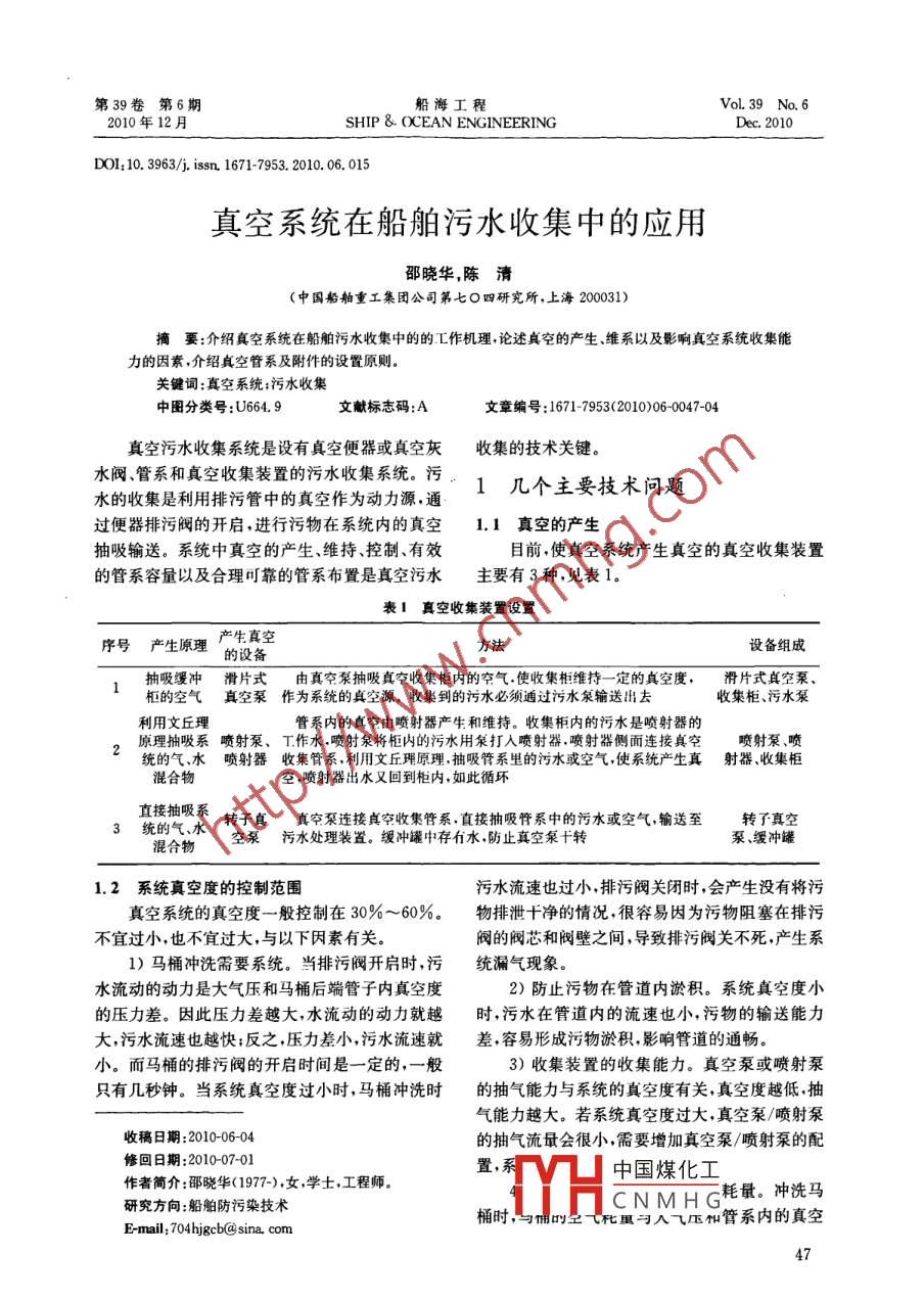 第39卷第6期船海工程Vol. 39 No. 62010年12月.SHIP & OCEAN ENGINEERINGDec. 2010DOI: 10.3963/j. issn. 1671-7953. 2010. 06. 015真空系統(tǒng)在船舶污水收集中的應用邵曉華,陳清(中國船舶重工集團公司第七O四研究所,上海200031)摘要:介紹 真空系統(tǒng)在船舶污水收集中的的工作機理,論述真空的產(chǎn)生、維系以及影響真空系統(tǒng)收集能力的因素,介紹真空管系及附件的設(shè)置原則。關(guān)鍵詞:真空系統(tǒng);污水收集中圖分類號:U664.9文獻標志碼:A文章編號:1671- 7953(2010)06-0047-04真空污水收集系統(tǒng)是設(shè)有真空便器或真空灰收集的技術(shù)關(guān)鍵。水閥、管系和真空收集裝置的污水收集系統(tǒng)。污1幾個主要技術(shù)問題水的收集是利用排污管中的真空作為動力源,通.過便器排污閥的開啟,進行污物在系統(tǒng)內(nèi)的真空1.1真空的產(chǎn)生抽吸輸送。系統(tǒng)中真空的產(chǎn)生、維持、控制、有效目前,使真空系統(tǒng)產(chǎn)生真空的真空收集裝置的管系容量以及合理可靠的管系布置是真空污水主要有3種,見表1。表1真空收集裝置設(shè)置序號產(chǎn)生原理產(chǎn)生真空.方法設(shè)備組成的設(shè)備抽吸緩沖滑片式 由 真空泵抽吸真空收集柜內(nèi)的空氣.使收集柜維持- -定的真空度,滑片式真空泵、柜的空氣真空泵 作為系統(tǒng)的真空源。 收集到的污水必須通過污水泵輸送出去收集柜、污水泵.利用文丘理管系內(nèi)的貞空由噴射器產(chǎn)生和維持。收集柜內(nèi)的污水是噴射器的原理抽吸系噴射泵、T作水.噴射泵將柜內(nèi)的污水用泵打入噴射器.噴射器側(cè)面連接真空噴射泵、噴統(tǒng)的氣.水噴射器 收集管 系,利用文丘理原理,抽吸管系里的污水或空氣,使系統(tǒng)產(chǎn)生真射器 、收集柜混合物空,噴射器出水又回到柜內(nèi),如此循環(huán)直接抽吸系轉(zhuǎn)子真真空泵連接真空收集管系.直接抽吸管系中的污水或空氣,輸送至轉(zhuǎn)子真空空泵污水處理裝置。 緩沖罐中存有水,防止真空泵f轉(zhuǎn)泵、緩沖罐1.2 系統(tǒng)真空度的控制范圍污水流速也過小,排污閥關(guān)閉時,會產(chǎn)生沒有將污真空系統(tǒng)的真空度一般控制在30% ~60%.物排泄十凈的情況,很容易因為污物阻塞在排污不宜過小,也不宜過大,與以下因素有關(guān)。閥的閥芯和閥壁之間,導致排污閥關(guān)不死,產(chǎn)生系1)馬桶沖洗需要系統(tǒng)。當排污閥開啟時,污統(tǒng)漏氣現(xiàn)象。水流動的動力是大氣壓和馬桶后端管子內(nèi)真空度2)防止污物在管道內(nèi)淤積。系統(tǒng)真空度小的壓力差。因此壓力差越大,水流動的動力就越時,污水在管道內(nèi)的流速也小,污物的輸送能力大,污水流速也越快;反之,壓力差小,污水流速就差,容易形成污物淤積,影響管道的通暢。小。而馬桶的排污閥的開啟時間是一定的,一般3)收集裝置的收集能力。真空泵或噴射泵只有幾秒鐘。當系統(tǒng)真空度過小時,馬桶沖洗時的抽氣能力與系統(tǒng)的真空度有關(guān),真空度越低,抽氣能力越大。若系統(tǒng)真空度過大,真空泵/噴射泵收稿日期:2010-06-04的抽氣流最會很小,需要增加真空泵/噴射泵的配修回日期:2010-07-01置,系中國煤化工作者簡介:邵曉華(1977-).女,學士.工程師。研究方向:船舶防污染技術(shù)[HCNMHG三耗量。沖洗馬桶時,與傭的空七化重與入氣壓和管系內(nèi)的真空E-mail; 704hjgcb@ sina. com47第6期船海工程第39卷壓力差有關(guān),真空度低時,空氣耗量小,真空度高真空調(diào)節(jié)量的計算公式如下:時,空氣耗量大。若系統(tǒng)真空度大于60%時,馬Vz=VX30%(2)桶的空氣耗量將成倍增加,提高了真空泵/噴射泵式中:V:-系統(tǒng)真空調(diào)節(jié)量;的抽氣要求。30%--系統(tǒng)真空度從 60%下降到30%的5)控制馬桶沖洗時產(chǎn)生過大的噪聲。真空差值;度越大馬桶沖洗時動能越大,同時產(chǎn)生的噪聲也V一系統(tǒng)真空容量,L,V= V系+V器越大,所以需控制系統(tǒng)的真空度不大于60%。其中:V省系管系的容積,L;1.3 系統(tǒng)真空容A適配性Vsm-真空 容器的容積,L。真空系統(tǒng)的收集能力主要與真空泵、噴射泵②同時起動馬桶次數(shù)。是指在較短的時間抽吸空氣的能力有關(guān);真空系統(tǒng)的運行穩(wěn)定性與內(nèi)(一般為3~5 s)同時按下馬桶的數(shù)量。其設(shè)置收集系統(tǒng)的管系容量有關(guān),管系容量越大,真空系值參見表2。.統(tǒng)運行越穩(wěn)定。表2系統(tǒng)內(nèi)同時起動馬桶次數(shù)的設(shè)置值真空收集系統(tǒng)的真空建立能力的確定,需從系統(tǒng)馬桶總數(shù)/只5~15 15~30 30~50兩個方面進行評估。同時起動馬桶次數(shù)n/次1)小時高峰負荷真空建立能力。定義:小時高峰負荷真空建立能力需滿,1 h內(nèi)真空系統(tǒng)的當V:≥nV1時,可保證真系統(tǒng)的真空度維系抽氣能力(q)大于小時高峰耗氣量(Q),即q>Q。在一個較為穩(wěn)定的環(huán)境下,有利于馬桶的良好使用。在不同的同時起動馬桶次數(shù)要求下,系統(tǒng)真高峰時耗氣量Q的計算公式如下:Q=nV:+n2V2+nzV3(1)空調(diào)節(jié)容量參見表3。式中:m-高峰時段的馬桶使用次數(shù),一般為全表3系統(tǒng)真空調(diào)節(jié)容t系統(tǒng)的使用人數(shù);n/次34V一使用- -次馬桶的耗氣量,L/次,一般V/L300~400 450~600 600~800為45~60 L/次;③瞬時真空建立能力。在不使用馬桶的情n2-高峰時段的