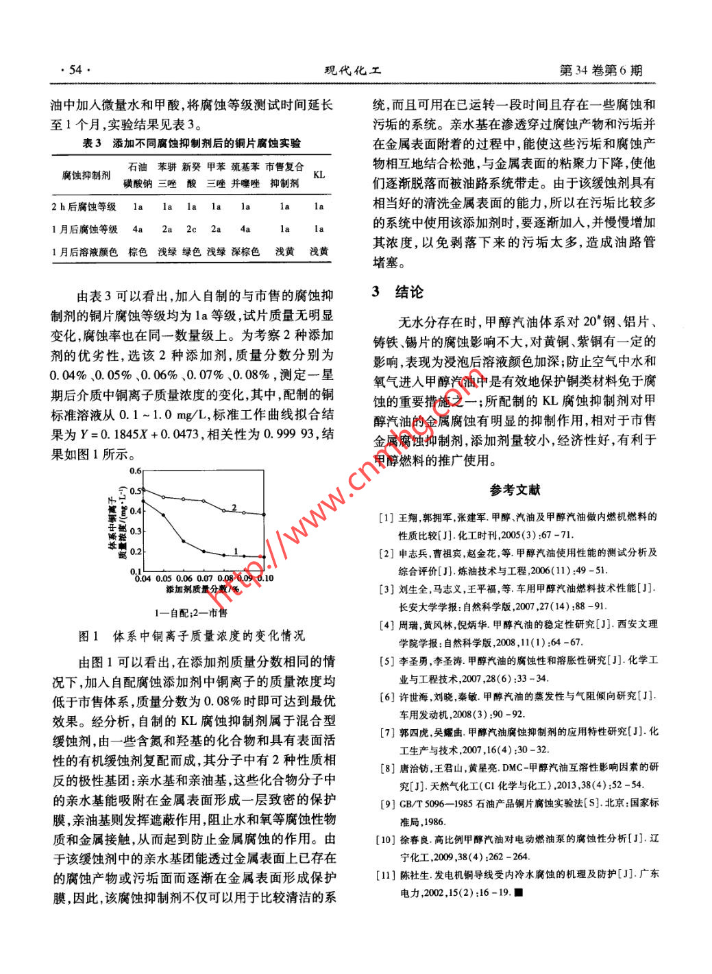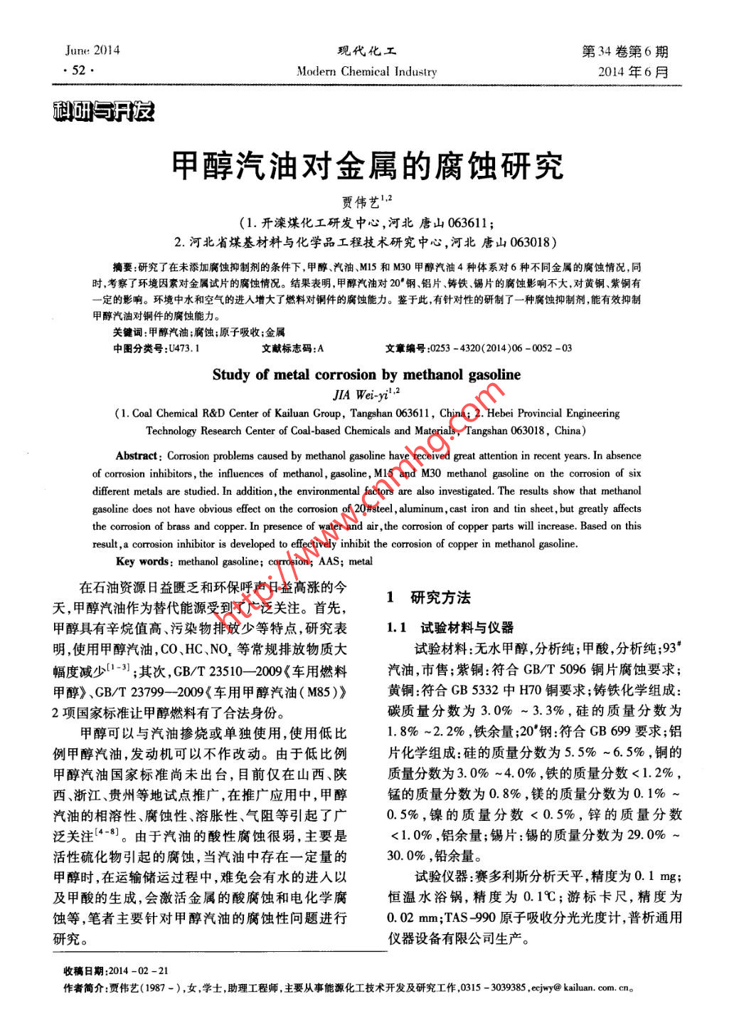 June 2014現(xiàn)代化工第34卷第6期52●Modern Chemical Industry2014年6月御研與開(kāi)潑甲醇汽油對(duì)金屬的腐蝕研究賈偉藝12(1.開(kāi)灤煤化工研發(fā)中心,河北唐山063611;2.河北省煤基材料與化學(xué)品工程技術(shù)研究中心,河北唐山063018)摘要:研究了在未添加腐蝕抑制劑的條件下,甲醇、汽油、M15和M30甲醇汽油4種體系對(duì)6種不同金屬的腐蝕情況,同時(shí),考察了環(huán)境因素對(duì)金屬試片的腐蝕情況。結(jié)果表明,甲醇汽油對(duì)20*鋼、鋁片、鑄鐵、錫片的腐蝕影響不大,對(duì)黃銅、紫銅有一定的影響。 環(huán)境中水和空氣的進(jìn)入增大了燃料對(duì)銅件的腐蝕能力。鑒于此,有針對(duì)性的研制了- -種腐蝕抑制劑,能有效抑制甲醇汽油對(duì)銅件的腐蝕能力。關(guān)鍵詞:甲醇汽油;腐蝕;原子吸收;金屬中圖分類(lèi)號(hào):U473.1文獻(xiàn)標(biāo)志碼:A文章編號(hào):0253 -4320(2014)06 -0052 -03Study of metal corrosion by methanol gasolineJIA Wei-yi.2(1. Coal Chemical R&D Center of Kailuan Group, Tangshan 063611, China; 2. Hebei Provincial EngineeringTechnology Research Center of Coal-based Chemicals and Materials, Tangshan 063018, China)Abstract : Corrosion problems caused by methanol gasoline have received great attention in recent years. In absenceof corrosion inhibitors , the infuences of methanol, gasoline, M15 and M30 methanol gasoline on the corrosion of sixdifferent metals are studied. In addition, the environmental factors are also investigated. The results show that methanolgasoline does not have obvious efect on the corrosion of 20#steel , aluminum, cast iron and tin sheet, but greatly afectsthe corrosion of brass and copper. In presence of water and air , the corrosion of copper parts will increase. Based on thisresult,a corrosion inhibitor is developed to efectively inhibit the corrosion of copper in methanol gasoline.Key words: methanol gasoline; corrosion; AAS; metal在石油資源日益匱乏和環(huán)保呼聲日益高漲的今1研究方法天,甲醇汽油作為替代能源受到了廣泛關(guān)注。首先,甲醇具有辛烷值高、污染物排放少等特點(diǎn),研究表1.1試驗(yàn)材料與儀器明,使用甲醇汽油,CO、HC、NO,等常規(guī)排放物質(zhì)大試驗(yàn)材料:無(wú)水甲醇,分析純;甲酸,分析純;93*幅度減少[1-3] ;其次, GB/T 23510- -2009《車(chē) 用燃料汽油,市售;紫銅:符合GB/T 5096銅片腐蝕要求;甲醇》、GB/T 23799- -2009《 車(chē)用甲醇汽油( M85)》黃銅:符合GB 5332中H70銅要求;鑄鐵化學(xué)組成:2項(xiàng)國(guó)家標(biāo)準(zhǔn)讓甲醇燃料有了合法身份。碳質(zhì)量分?jǐn)?shù)為3.0% ~ 3.3%,硅的質(zhì)量分?jǐn)?shù)為甲醇可以與汽油摻燒或單獨(dú)使用,使用低比1.8% ~2.2% ,鐵余量;20*鋼:符合GB 699要求;鋁例甲醇汽油,發(fā)動(dòng)機(jī)可以不作改動(dòng)。由于低比例片化學(xué)組成:硅的質(zhì)量分?jǐn)?shù)為5.5% ~6. 5% ,銅的甲醇汽油國(guó)家標(biāo)準(zhǔn)尚未出臺(tái),目前僅在山西、陜質(zhì)量分?jǐn)?shù)為3.0% ~4. 0% ,鐵的質(zhì)量分?jǐn)?shù)<1.2%,西、浙江、貴州等地試點(diǎn)推廣,在推廣應(yīng)用中,甲醇錳的質(zhì)量分?jǐn)?shù)為0. 8% ,鎂的質(zhì)量分?jǐn)?shù)為0.1% ~汽油的相溶性.腐蝕性、溶脹性、氣阻等引起了廣0.5%,鎳的質(zhì)量分?jǐn)?shù)< 0.5%,鋅的質(zhì)量分?jǐn)?shù)泛關(guān)注(4-8]。由于汽油的酸性腐蝕很弱,主要是<1. 0% ,鋁余量;錫片:錫的質(zhì)量分?jǐn)?shù)為29. 0%活性硫化物引起的腐蝕,當(dāng)汽油中存在- -定量的30. 0%,鉛余量。甲醇時(shí),在運(yùn)輸儲(chǔ)運(yùn)過(guò)程中,難免會(huì)有水的進(jìn)人以試驗(yàn)儀器:賽多利斯分析天平,精度為0.1 mg;及甲酸的生成,會(huì)激活金屬的酸腐蝕和電化學(xué)腐恒溫水浴鍋,精度為0.1C;游標(biāo)卡尺,精度為蝕等,筆者主要針對(duì)甲醇汽油的腐蝕性問(wèn)題進(jìn)行0.02mm;TAS-990原子吸收分光光度計(jì),普析通用研究。儀器設(shè)備有限公司生產(chǎn)。收稿日期:2014 -02 -21作者簡(jiǎn)介:賈偉藝(1987 -),女,學(xué)士,助理工程師,主要從事能源化工技術(shù)開(kāi)發(fā)及研究工作,0315 - 3039385 ,cjwy@ kailuan. com. cn。.2014年6月賈偉藝:甲醇汽油對(duì)金屬的腐蝕研究●531.2 試驗(yàn)方法表1金屬試片在 4種溶劑中的單位面積質(zhì)量變化值1.2.1腐蝕試片的處理及腐蝕級(jí)別的判斷單位面積質(zhì)量變化值93*汽油甲醇M30試片先用65 μm(240粒度)的碳化硅或氧化鋁W/( mg.cm -2 )砂紙?zhí)幚?除去以前用其他等級(jí)砂紙留下的打磨痕紫銅0.0169 0.0272 0.0423 0. 0460跡后,將銅片浸沒(méi)在洗滌溶劑中,銅片在使用前要進(jìn)黃銅0.0160 0.0240 0.0470 0. 0491行最后磨光。最后磨光時(shí),將試片取出,用無(wú)灰濾紙錫片0.00980. 0240 0. 03350.0353保護(hù)手指來(lái)拿取銅片,用105 μm( 150目)的碳化硅20*鋼0.0122 0.0183 0.0355 0. 0384或氧化鋁砂紙做精細(xì)磨光處理,將夾在夾鉗上的銅鑄鐵0.0139 0.0194 0.0276 0. 0287片表面磨光,直至用--塊新的脫脂棉擦拭時(shí)不再留鋁片0.0058 0.0088 0.0115 0. 0124下污斑為止。當(dāng)試片擦凈后,馬上浸人(或稱(chēng)重后浸人)已準(zhǔn)備好的試樣中。試片腐蝕級(jí)別參照微的加深。其他4種試片并無(wú)明顯變化,可見(jiàn)甲醇GB/T5096- -1985193 。汽油體系對(duì)銅件的影響最為明顯。另外,由于試驗(yàn)1.2.2金 屬試片的表面積用的甲醇試劑為分析純,純度高,所含游離酸性離子金屬試片的表面積S(cm2 )為: .少,腐蝕性也較弱,從而導(dǎo)致其他幾