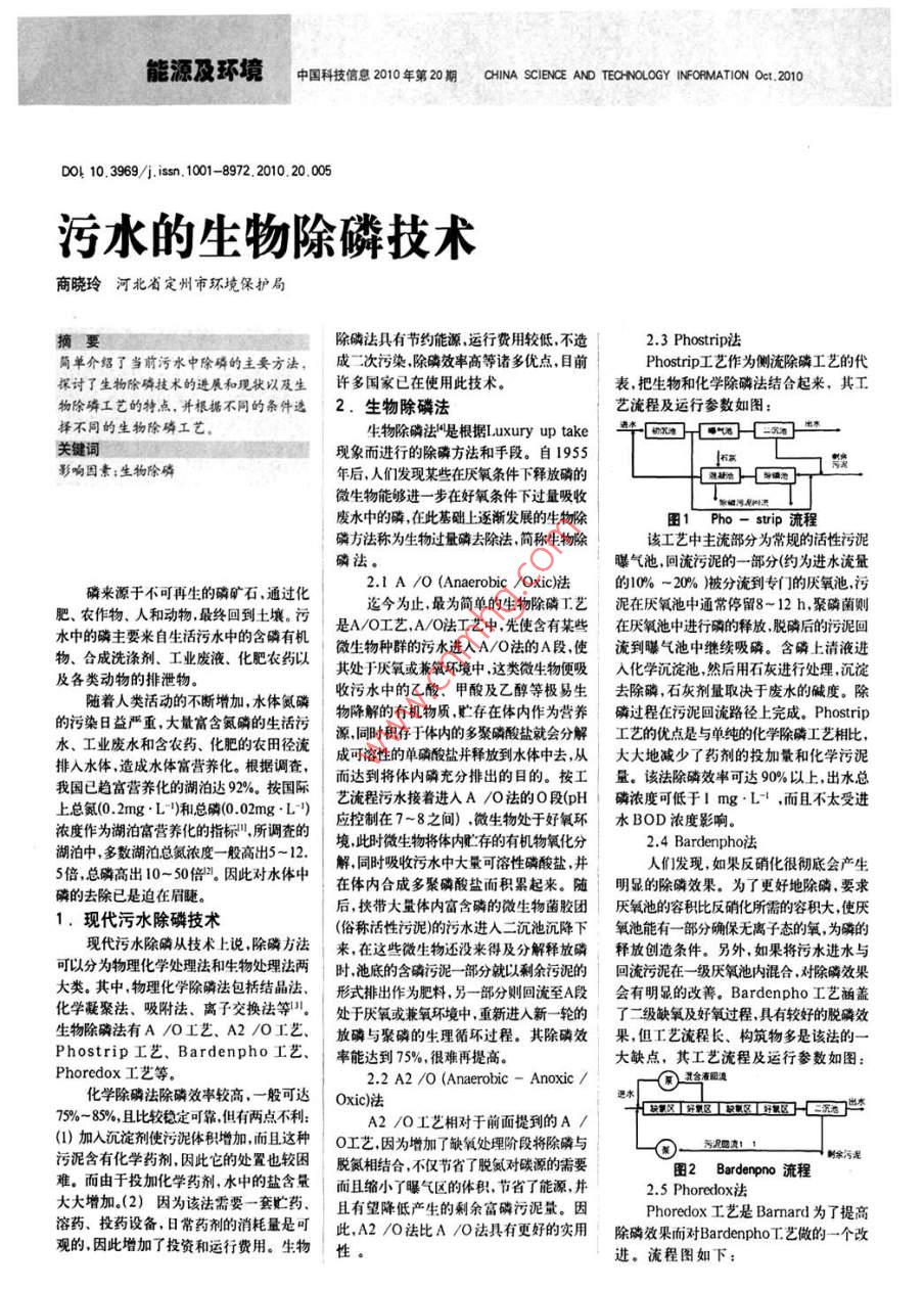 能漂及環(huán)境中國科技息200年第20期 CHINA SCIENCE AND TECHNOLOGY INFORMATION O2o0Do410.3969/jisn.1001-8972.2010.20.005污水的生物除磷技術(shù)商曉玲河北省定州市環(huán)境保護局摘要除磷法具有節(jié)約能源運行費用較低不造2.3 Phostrip法簡單介紹了當(dāng)前污水中除磷的主要方法,成二次污染除磷效率高等諸多優(yōu)點目前Phostrip工藝作為側(cè)流除磷工藝的代探討了生物除磷技術(shù)的進展和現(xiàn)狀以及生許多國家已在使用此技術(shù)。表,把生物和化學(xué)除磷法結(jié)合起來,其工物除磷工藝的特點,并根據(jù)不同的條件選2.生物除磷法藝流程及運行參數(shù)如圖:擇不同的生物除磷工藝生物除磷法“是根據(jù) Luxury up take[x][[8關(guān)鍵詞現(xiàn)象而進行的除磷方法和手段。自1955影響因素;生物除磷后,人們發(fā)現(xiàn)某些在厭氧條件下釋放磷的微生物能夠進一步在好氧條件下過量吸收取蠟污廢水中的磷在此基礎(chǔ)上逐漸發(fā)展的生物除圖1Pho- strip流程磷方法稱為生物過量磷去除法,簡稱生物除該工藝中主流部分為常規(guī)的活性污泥磷法。曝氣池回流污泥的一部分(約為進水流量磷來源于不可再生的磷礦石,通過化2.1A/ O(Anaerobic/oxc法的10-20%)被分流到專門厭氧池,污肥、農(nóng)作物、人和動物最終回到土壤。污迄今為止最為簡單的生物除磷工藝泥在厭氧池中通常停留8-12h,聚磷菌則水中的磷主要來自生活污水中的含磷有機是AO工藝AO法工藝中先使含有某些在厭氧池中進行磷的釋放脫磷后的污泥回物、合成洗滌劑、工業(yè)廢液、化肥農(nóng)藥以微生物種群的污水進入A/O法的A段,使流到曝氣池中繼續(xù)吸磷。含磷上清液進及各類動物的排泄物。其處于厭氧或兼氧環(huán)境中,這類微生物便吸入化學(xué)沉淀池然后用石灰進行處理,沉淀收污水中的乙酸,甲酸及乙醇等極易生去除磷石灰劑量取決于廢水的堿度。除隨著人類活動的不斷增加水體磷物降解的有機物質(zhì)存在體內(nèi)作為營養(yǎng)磷過程在污泥回流路徑上完成P市的污染日益嚴(yán)重大量富含氮磷的生活污源同時積存于體內(nèi)的多聚磷酸鹽就會分解工藝的優(yōu)點是與單純的化學(xué)除磷工藝相比,水、工業(yè)廢水和含農(nóng)藥、化肥的農(nóng)田徑流成可溶性的單磷酸鹽并釋放到水體中去從大大地減少了藥劑的投加量和化學(xué)污泥排入水體造成水體富營養(yǎng)化根據(jù)調(diào)查,而達到將體內(nèi)磷充分排出的日的。按工量.該法除磷效率可達90%以上,出水總我國已趨富營養(yǎng)化的湖泊達92%。按國際上總氮(0.2mg·L)和總磷(0.02mg:·L)藝流程污水接著進入AO法的0段pH磷濃度可低于!mg·L+,而且不太受進濃度作為湖泊富營養(yǎng)化的指標(biāo)叫所調(diào)查的應(yīng)控制在7~8之間),微生物處于好氧環(huán)水BOD濃度影響。湖泊中,多數(shù)湖泊總氮濃度一般高出5~12境此時微生物將體內(nèi)貯存的有機物氧化分2.4 Bardenpho法5倍,總晚高出053倍.因此對水體中在體內(nèi)合成多聚酸鹽而積署起來,隨人們發(fā)現(xiàn),如果反硝化很徹底會產(chǎn)生1.現(xiàn)代污水除磷技術(shù)后挾帶大量體內(nèi)富含磷的微生物菌膠團厭氧池的容積比反硝化所需的容積大,使厭(俗稱活性污泥)的污水進入二沉池沉降下氧池能有一部分確保無離子態(tài)的氧為磷的現(xiàn)代污水除磷從技術(shù)上說除磷方法來,在這些微生物還沒來得及分解釋放磷釋放創(chuàng)造條件。另外如果將污水進水與可以分為物理化學(xué)處理法和生物處理法兩時,池底的含磷污泥部分就以剩余污泥的回流污泥在一級厭氧池內(nèi)混合對除磷效果大類,其中,物理化學(xué)除磷法包括結(jié)品法,形式排出作為肥料,另一部分則回流至A段會有明顯的改善. Bardenpho工藝涵蓋化學(xué)凝聚法、吸附法、離子交換法等處于厭氧或兼氧環(huán)境中,重新進入新輪的了級缺氧及好氧過程,具有較好的脫磷效生物除磷法有AO工藝A2O工藝、放磷與聚磷的生理循環(huán)過程.其除磷效果,但工藝流程長、構(gòu)筑物多是該法的ardenpho率能達到75%很難再提高。大缺點,其工藝流程及運行參數(shù)如圖:Phoredox工藝等。2.2 A2/0(Anaerobic- Anoxic化學(xué)除磷法除磷效率較高,一般可達oxi法1%-8%,且比較穩(wěn)定可靠但有兩點不利:漢好區(qū)區(qū)好匚元A2/O工藝相對于前面提到的A(1)加入沉淀劑使污泥體積增加而且這種O工藝因為增加了缺氧處理階段將除磷與為園責(zé)污泥含有化學(xué)藥劑因此它的處置也較因脫氮相結(jié)合,不僅節(jié)省了脫對碳源的需要圖2 Bardenpno流程難,而由于投加化學(xué)藥劑水中的鹽含量而且縮小了曝氣區(qū)的體積,節(jié)省了能源并2.5 Phoredox法大大增加(2)因為該法需要一套貯藥、且有望降低產(chǎn)生的剩余富磷污泥量,因Phoredox工藝是 Barnard為了提高溶藥、投藥設(shè)備,日常藥劑的消耗量是可此,A2/O法比AO法具有更好的實用除磷效果而對 Bardenpho藝做的一個改觀的因此增加了投資和運行費用。生物性,進。流程圖如下:術(shù)的基礎(chǔ)研究研制開發(fā)適合我國國情的新速120kmh,如何盡快建立適合我國高型除磷工藝速公路強橫風(fēng)監(jiān)測系統(tǒng)和大風(fēng)警報系統(tǒng)及防風(fēng)阻沙柵設(shè)置,保證高速公路不同類型圖3 Phoredo汽車按照大風(fēng)天氣下運行規(guī)則安全行車它在第一缺氧區(qū)前