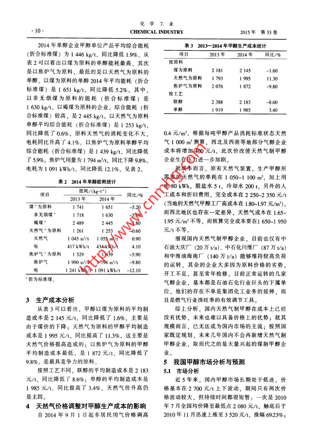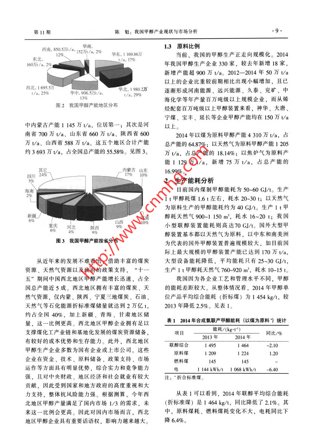 化學(xué)工業(yè)第33卷第11期●8.CHEMICAL INDUSTRY2015年11月我國甲醇產(chǎn)業(yè)現(xiàn)狀與市場分析陳魁(河南能源化工集團(tuán)中原大化公司,濮陽457004)摘要:分析了我國甲醇產(chǎn)能和產(chǎn)量變化、生產(chǎn)布局與原料比例、生產(chǎn)能耗與成本.以及2010年以來國內(nèi)甲醇市場變化。預(yù)計(jì)未來兩年隨著我國甲醇制烯烴、芳烴等新興下游行業(yè)集中開工,屆時(shí)巨大的需求量將使甲醇行業(yè)步人新的發(fā)展機(jī)遇期。關(guān)鍵詞:甲醇;市場調(diào)查;市場需求分析;技術(shù)經(jīng)濟(jì)與企業(yè)管理文章編號(hào): 1673- 9647 (2015) 11-0008-05中圖分類號(hào): TQ223.12*1文獻(xiàn)標(biāo)識(shí)碼: A1我國甲醇產(chǎn) 業(yè)現(xiàn)狀醇產(chǎn)能基數(shù)龐大,但裝置開工率不足60%。尤其1.1 產(chǎn)能、產(chǎn)量自2008年四季度起,在全球金融危機(jī)席卷下,國我國甲醇工業(yè)發(fā)展迅速。2002- 2009 年期間內(nèi)甲醇行情出現(xiàn)大跳水后,使得國內(nèi)甲醇產(chǎn)能出我國甲醇產(chǎn)能的年均增長速度為34%;尤其是現(xiàn)嚴(yán)重閑置。近三年來,隨著產(chǎn)業(yè)結(jié)構(gòu)調(diào)整,國2003年,國家鼓勵(lì)發(fā)展煤化工,國內(nèi)產(chǎn)能暴漲家加大淘汰落后產(chǎn)能力度,甲醇裝置利用率正在66%。甲醇行業(yè)在2007- -2013 年進(jìn)入高速發(fā)展逐步提高,產(chǎn)業(yè)結(jié)構(gòu)趨于合理。見圖1。期,規(guī)?;略黾状冀ㄔO(shè)項(xiàng)目大批涌現(xiàn),我國甲據(jù)統(tǒng)計(jì),2014年我國甲醇產(chǎn)能增加1 030萬白70000.760000.6.5。40000.3哥5 30000.2斗.1¥20000.0曼100nnnDu.n.Ih.h-0.2-0.31997 1999 2001 2003 2005 2007 2009 2011 201 31998200020022004 2006 200820102012 2014口產(chǎn)能;口產(chǎn)量; - -產(chǎn)量增長率;產(chǎn)能增長率圖1 1997- -2014年我國甲醇產(chǎn)能和產(chǎn)量t/a,年底達(dá)到6644萬t/a; 2014 年國內(nèi)甲醇產(chǎn)位居全國第一,占比約29%,西北約占全國產(chǎn)能量共3 740.67萬t,累計(jì)同比增加26.19%。2014的25%,華東占17%,華中則占到了13%。見圖年全年國內(nèi)甲醇開工率在55%左右,相比2013年2。提高4個(gè)百分點(diǎn)。從省市來看,我國甲醇裝置分布廣泛,除北1.2產(chǎn)能分布京、廣東和西藏之外,其他省份均有甲醇裝置。我國甲醇裝置主要分布在煤炭、天然氣資源甲醇年生產(chǎn)能力在百萬噸以上的省市有12個(gè),其豐富的區(qū)域,集中在華北、華東、華中、西北地收稿日期: 2015-09-18區(qū)。2013 年這四個(gè)地區(qū)甲醇裝置的總產(chǎn)能占到全作者簡介:陳魁(1977-). 男.河南省人,經(jīng)濟(jì)學(xué)碩士,經(jīng)濟(jì)國總產(chǎn)能的84%。其中,華北地區(qū)甲醇裝置產(chǎn)能師,現(xiàn)從事煤化工產(chǎn)業(yè)市場研究。第11期東魁:我國甲醇產(chǎn)業(yè)現(xiàn)狀與市場分析.9.西南,85/,,華南,1.3原料比例12%年152萬/a.2%華東,1 169.86萬當(dāng)前,我國的甲醇生產(chǎn)正走向規(guī)?;?。2014東北,t/a, 17%160萬i/a, 2%年我國甲醇生產(chǎn)企業(yè)330家,較去年新增18家,新增產(chǎn)能超900萬t/a。2012- -2014 年50萬t/a .以上的企業(yè)比重較前期相比出現(xiàn)小幅增加,且已西北,1 695.5萬華北, 1980.2萬逐漸形成河南能源、遠(yuǎn)興能源、久泰、兗礦、中t/a, 25%華中, 906.5萬t/a,t/a, 29%?;瘜W(xué)等年產(chǎn)量百萬噸級(jí)以上規(guī)模企業(yè),而從烯圖2我國甲醇產(chǎn) 能地區(qū)分布烴配套百萬噸級(jí)以上甲醇裝置來看,神華、大唐、寧煤、寶豐、延長等企業(yè)甲醇產(chǎn)能均在150萬/a中內(nèi)蒙古產(chǎn)能1 145萬Va,位居第一;其次是河以上。南省700萬t/a、山東省660萬t/a、陜西省6002014年以煤為原料甲醇產(chǎn)能4310萬t/a,占.萬/a、山西省588萬l/a。這五個(gè)地區(qū)合計(jì)產(chǎn)能總產(chǎn)能的64.87%;以天然氣為原料甲醇產(chǎn)能1 205約3693萬V/a,占全國總產(chǎn)能的55.58%。見圖3。萬t/a,占總產(chǎn)能的18.14%; 以焦?fàn)t氣為原料產(chǎn)能1 129萬t/a,新增75萬t/a,占總產(chǎn)能的其它_內(nèi)蒙古山東16.99%。四川24%717% 10%3%2生產(chǎn)能耗分析海南目前國內(nèi)煤制甲醇能耗為50~60 GJ/t。生產(chǎn)1 t甲醇耗煤1.6t左右,耗水20~30t; 以天然氣為原料生產(chǎn)的甲醇能耗約為40 GJ/t。生產(chǎn)1 t甲新疆河南醇耗天然氣900~1 150m', 耗水16~20 t;我國6%重慶9%10%小型聯(lián)醇裝置能耗則高達(dá)70GJ/t。國外大型甲河北陜西醇裝置基本都以天然氣為原料,以中東和南美洲圖3我國甲醇產(chǎn)能按省分布為代表的國外甲醇裝置普遍規(guī)模較大,如目前國際上最大規(guī)模的甲醇裝置產(chǎn)能已達(dá)到170萬Va,從近年來的發(fā)展不難看出,借助豐富的煤炭大型設(shè)備能耗降低,平均能耗只有25~30 GJ/t,資源、天然氣資源以及政府的政策支持,“十一生產(chǎn)1 t甲醇耗天然氣760~920 m,耗水10~15 t。五”期間中國西北地區(qū)甲醇產(chǎn)能增長迅速,占全我國因?yàn)楦髌髽I(yè)工藝和管理水平不同,甲醇國總產(chǎn)能近5成。西北地區(qū)擁有豐富的煤炭、天的能耗差距較大。從整體情況看, 2014 年甲醇單然氣資源,僅內(nèi)蒙、陜西、寧夏三地煤炭、石油、位產(chǎn)品平均綜合能耗(折標(biāo)煤)為1 454kg/t,較天然氣等石化能源折標(biāo)準(zhǔn)煤儲(chǔ)量就達(dá)到2萬億t,2013年降低2.5%。見表1。約占全國40%,加上新疆、青海、甘肅地區(qū)儲(chǔ)表1 2014 年合成