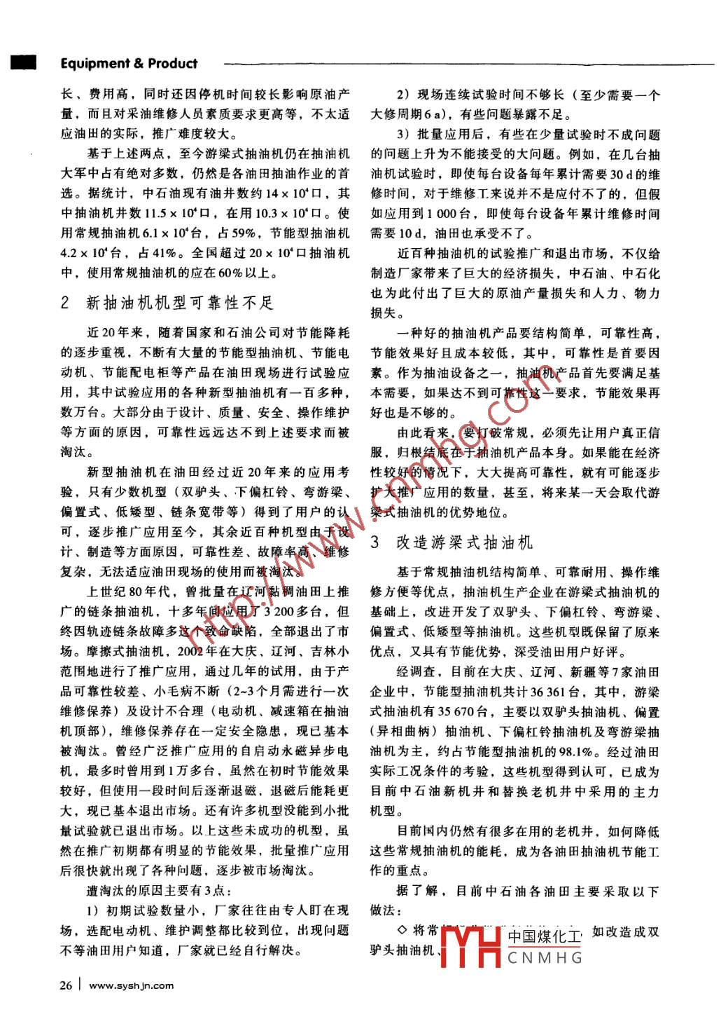 設萏·嚴■油田常規(guī)抽油機節(jié)能改造劉長勝(勝利油田分公司孤東采油廠)摘要常規(guī)游梁式抽油機因可靠性好、操作維護方便、運行成本低等原因成為各油田抽油作業(yè)的首選。新抽油機杋型因可靠性不足,有的遭到了淘汰,而游梁抽油杋通過改進開發(fā)了雙驢頭、下偏杠鈐、彎游梁等杋型抽油杋,可靠性較好,且又具有節(jié)能優(yōu)勢,無游梁式抽油機則在黏稠油開采上具有常規(guī)抽油杋無法比擬的優(yōu)越性,判斷一種抽油機是否節(jié)能,要考慮很多環(huán)節(jié)。選用抽油機時要根據(jù)油井產(chǎn)液量大小、動液面深淺、含水率及原油黏度等因素進行統(tǒng)籌考慮,以達到節(jié)能的目的關鍵詞油田抽油機節(jié)能降耗措施D0:10.3969/j.issn.2095-1493.2011.08.009我國各大油田機械采油抽油機用量大、耗能間分別不超過1d、1.5d高,約占油田總用電量的70%,是影響油田采油能假設以每年停機3d計算,中石油在用的10耗和成本的重要因素。近20年來,國內(nèi)大油田及10臺抽油機,則需要有2460多個維修隊伍365d制造企業(yè)在抽油機的節(jié)能增效上做了各種努力和嘗(8hld)忙于抽油機的維護。目前正在試用的新型試。市場上先后出現(xiàn)了很多類型的抽油機產(chǎn)品及節(jié)抽沖機,可靠性遠遠達不到上述要求,保守一點能裝置,僅試驗、應用的各種新型抽油機就有一百說,這些機型年累計維護時間不會少于10d。多種、數(shù)萬臺。如果在試驗階段,試用的數(shù)量小,這10d的維護時間不是大問題,假如推廣到10×10臺則數(shù)字1常規(guī)抽油機機型的絕對優(yōu)勢令人震驚。即意味著需要有8000個維修隊伍365d通常來說,油田選用什么抽油機設備,用戶說(8hd)忙于抽油機的維護。這不僅使維護的人了算。只有他們最清楚需要什么樣的抽油機。油田力、直接費用難以支撐,同時將意味著每年要影響企業(yè)對抽油機的選用首先是可靠性高,故障率低,300×10t的原油產(chǎn)能(3td)、75×10元收入安全性好(2500元/t)抽油機的工作環(huán)境和條件十分惡劣,要求:無抽油機可靠性對油田的意義由此可見一斑,常人值守地運轉(zhuǎn);除了維護、修井時間以外,1年規(guī)抽油機在耐用方面獨領風騷。僅此一項,就將需365d每天24h不停地工作;在野外露天、嚴寒酷要經(jīng)常維護的機型在市場上一一淘汰出局。暑、風霜雨雪等環(huán)境下全天候地工作。為帶動抽油另外,常規(guī)抽油機的操作維護方便、運行成本桿上下抽油,抽油機每天要換向數(shù)千至數(shù)萬次,隨低。調(diào)查結(jié)果顯示,目前常規(guī)抽油機及在其基礎上著換向其載荷不斷地大幅度正負變化。正因為嚴酷革新的新機型,即游梁式節(jié)能抽油機每年維修成本的工作條件要求抽油機有高度的可靠性。般在2000元左右。市場上的新品,即無游梁式目前國內(nèi)對抽油機的“可靠性”要求,暫時還節(jié)能抽油機的維修成本通常在8000~10000元之沒有明確的標準。據(jù)統(tǒng)計,中石油抽油井平均有效間,是游梁式抽油機的4-5倍;維修時間因各種機開機時率約95%,即平均每口井每年有1825d處于型有所不同,大致上無游梁式抽油機維護時間是游停機狀態(tài)。而加拿大、印尼要求抽油機每年停機時梁式抽油機的2倍以上,且對維修人員素質(zhì)要求較高作者簡介:劉長勝,1994年畢業(yè)于勝利石油學校,2005年畢業(yè)于目前由于各油田采油公司成本壓力均較大,維中國石油大學(東營),高級I程師,從事采油技術管理工作,E-mal:liuchangsheng.slyt(esinoper.com,地址:山東東營勝利油修人員較為王游式抽油機節(jié)能效果不中國煤化分公司孤東采油廠,257237錯,但與游僅維修時間CNMHGe0年第日期石油石化節(jié)能25Equipment Product長、費用高,同時還因停機時間較長影響原油產(chǎn)2)現(xiàn)場連續(xù)試驗時間不夠長(至少需要一個量,而且對采油維修人員素質(zhì)要求更高等,不太適大修周期6a),有些問題暴露不足應油田的實際,推廣難度較大。3)批量應用后,有些在少量試驗時不成問題基于上述兩點,至今游梁式抽油機仍在抽油機的問題上升為不能接受的大問題。例如,在幾臺抽大軍中占有絕對多數(shù),仍然是各油田抽油作業(yè)的首油機試驗時,即使每臺設備每年累計需要30d的維選。據(jù)統(tǒng)計,中石油現(xiàn)有油井數(shù)約14×10°口,其修時間,對于維修工來說并不是應付不了的,但假中抽油機井數(shù)1.5×10′口,在用10.3×10口。使如應用到1000臺,即使每臺設備年累計維修時間用常規(guī)抽油機6.1×10′臺,占59%,節(jié)能型抽油機需要10d,油田也承受不了。4.2×10‘臺,占41%。全國超過20x10口抽油機近百種抽油機的試驗推廣和退出市場,不僅給中,使用常規(guī)抽油機的應在60%以上。制造廠家?guī)砹司薮蟮慕?jīng)濟損失,中石油、中石化2新抽油機機型可靠性不足也為此付出了巨大的原油產(chǎn)量損失和人力、物力損失。近20年來,隨著國家和石油公司對節(jié)能降耗種好的抽油機產(chǎn)品要結(jié)構(gòu)簡單,可靠性高的逐步重視,不斷有大量的節(jié)能型抽油機、節(jié)能電節(jié)能效果好且成本較低,其中,可靠性是首要因動機、節(jié)能配電柜等產(chǎn)品在油田現(xiàn)場進行試驗應素。作為抽油設備之一,抽油機產(chǎn)品首先要滿足基用,其中試驗應用的各種新型抽油機有一百多種,本需要,如果達不到可靠性這一要