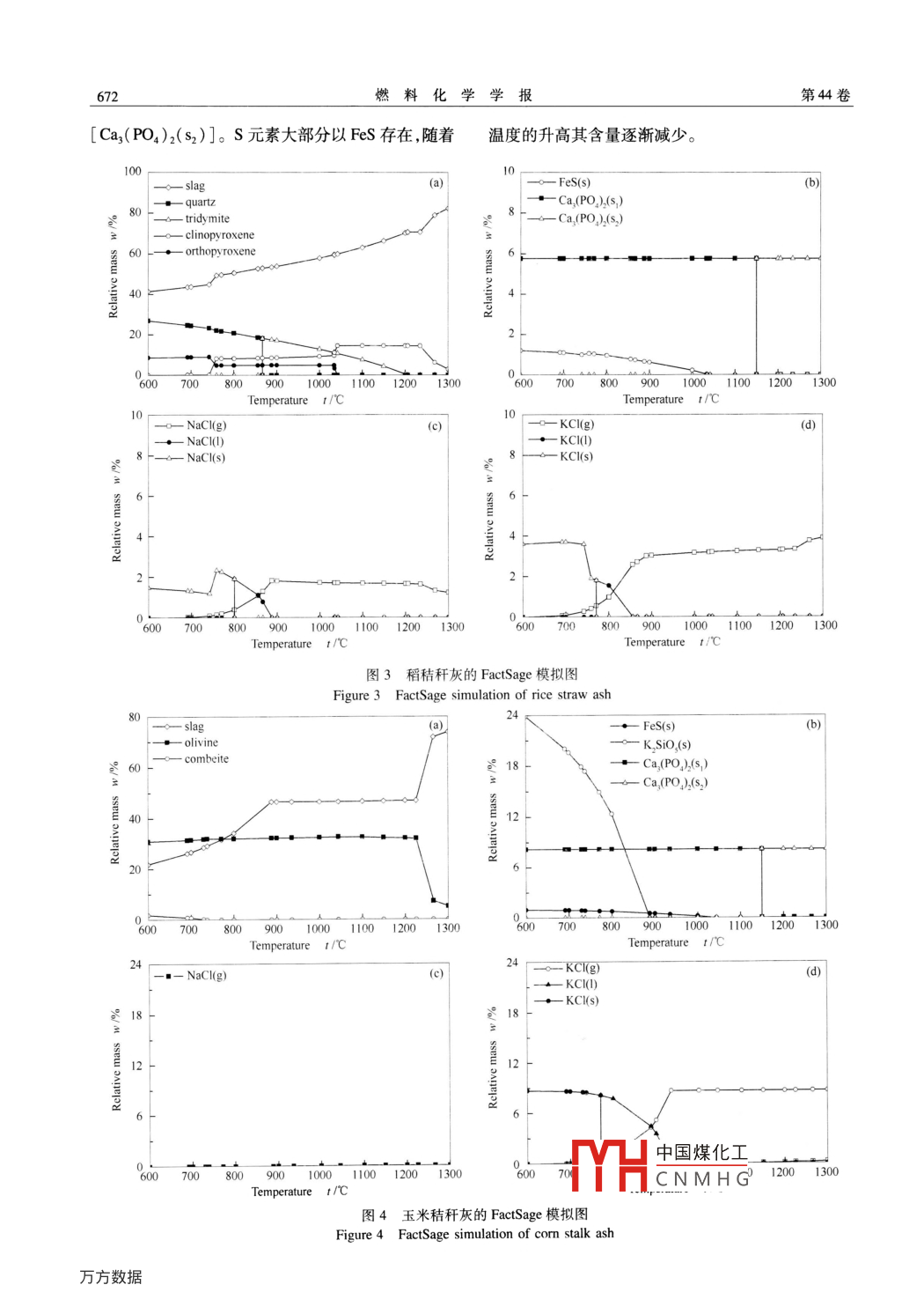 第44卷第6期然料化學(xué)學(xué)報Vol 44 No 62016年6月oumal of Fuel Chemistry and TechnologyJun.2016文章編號:0253-2409(2016)06066806生物質(zhì)中礦物質(zhì)在氣化條件下的演變行為研究曹琴,黃勝,吳詩勇,吳幼青,高晉生(華東理工大學(xué)資源與環(huán)境T程學(xué)院煤氣化及能源化工教育部重點實驗室,上海200237)摘要:以稻秸稈和玉米秸稈為原料,考察了弱還原性氣氛以及550-1300℃生物質(zhì)中礦物質(zhì)的變化,并采用 FactSage軟件對生物質(zhì)中礦物質(zhì)在高溫下的演變行為進行了模擬。結(jié)果表明,生物質(zhì)灰中Na和K元素的存在形式相對穩(wěn)定,部分以氣態(tài)氯化物的形式揮發(fā)出去,部分存在于低熔點硅酸鹽或硫酸鹽中;Si元素與Ca、Fe、Mg和Al四種元素形成的硅酸鹽的變化形式較多,主要形成輝石[(Ca,Mg,Fe)Si2O。]、橄欖石[(Ca,Mg,Fe)2SO.]和黃長石[Ca2(A1,Mg)(Si,AI)SO,]三類物質(zhì),隨著溫度的升高,部分輝石會轉(zhuǎn)化為橄欖石與黃長石,此三類物質(zhì)相互作用易形成熔點較低的共熔體而導(dǎo)致礦物質(zhì)的熔融。方石英和莫來石[ALSi2O1]是導(dǎo)致稻秸稈流動溫度高于玉米秸稈的主要原因,莫來石最終轉(zhuǎn)化為斜鐵輝石[ FeSi3]、鐵尖晶石FeAl2O4]和鈣長石[CaA2Si2O]等熔點較低的礦物質(zhì)關(guān)鍵詞:生物質(zhì);礦物質(zhì);熔融特征溫度;XRD; FactSage中圖分類號:TQ53文獻標(biāo)識碼Evolution behaviors of mineralmatters in biomass under gasification conditionsCAO Qin, HUANG Sheng, wU Shi-yong, wU You-qing, GAO Jin-shengResources and Environment Engineering Institute, Key Laboratory of Coal Gasification and EnergyChemical of Ministry of Education, East China Universiry of Science and Technology, Shanghai 200237, China)Abstract: The composition and reaction of mineral matters in rice straw and corn stalk were investigated inweak reducing atmosphere at temperature range of 550-1 300 C. The FactSage was also used to simulate theevolution behaviors of mineral matters under high temperatures. The results show that the existing form of Na andK in biomass is relatively stable, including volatilized chlorides, silicates and sulphates with a lower meltingpoint. The silicates made up of Si, Ca, Mg, Fe and Al have various forms, mainly including pyroxene[(CaMg, Fe ) Si, O], olivine [( Ca, Mg, Fe), Sio. and melilite Ca,(Al, Mg )( Si, Al)SiO,]. Pyroxene istransformed into olivine and melilite with the increasing of temperature. The interaction of the three kinds ofmaterials could result in the generation of eutectics which could lead to the melting of mineral matters in biomassThe formation of cristobalite and mullite Al Si, O, leads to a higher flow temperature of rice straw ash thancorn stalk ash, the mullite ultimately is transformed into low melting point materials like clinoferrosiliteFeSiO,, iron spinel[ FeAl, 0] and anorthite[ CaAl, Si, OgKey words: biomass; mineral matter; ash fusion temperature; XRD; FactSage生物質(zhì)作為一種清潔的可再生能源,儲量豐富,化行為,發(fā)現(xiàn)高溫下淮南煤中主要存在的晶體是莫低硫低氮,且可以實現(xiàn)CO2的零排放,因此,受到廣來石和石英,且隨著溫度的升高莫來石的含量增加,泛關(guān)注。氣化技術(shù)可將低品位的生物質(zhì)轉(zhuǎn)化為石英的含量減少,其他無定形硅鋁酸鹽均發(fā)生熔融。高品位的合成氣,是生物質(zhì)清潔高效利用的主要方 Natale等‘研究了南非煤氣化技術(shù)中的一種典型原式之一。生物質(zhì)氣化過程中礦物質(zhì)的演變行為直接料煤中礦物質(zhì)在高溫下的變化行為,發(fā)現(xiàn)煤的氣化決定了氣化爐的排灰方式、氣化技術(shù)能否長周期滿灰渣中主要含有石英、方石英、莫來石鈣長石和透負荷的穩(wěn)定運行以及生物質(zhì)中礦物質(zhì)所引起的管道輝石等礦物質(zhì),其中,方石英是由高齡石和伊利石在腐蝕等問題,進而決定了生物質(zhì)氣化技術(shù)的可行性高溫下轉(zhuǎn)化而來,透輝石是由CaO、MgO和SiO2在和原料的適應(yīng)性2。目前,許多學(xué)者對煤中礦物質(zhì)高溫下反應(yīng)生成。然而,有關(guān)生物質(zhì)中礦物質(zhì)的研在高溫下的演變行為進行了深入的研究,如白進究報道還比較少,Du等”通過研究生物質(zhì)灰中無等3考察了淮南煤中礦物質(zhì)在11041500℃的變機組分的演變行為發(fā)現(xiàn)生物質(zhì)灰中大量共熔體的中國煤化工Received: 2015-12-02: Revised: 2016-03-01CNMHGCorresponding author. Tel: 021-64252037, E-mail: wyqe ecust. edu. cnThe project was supported by the National Natural Science Foundation of China(21506060國家自然科學(xué)基金(21506060)資助第6期曹琴等:生物質(zhì)中礦物質(zhì)在氣化條件下的演變行為研究產(chǎn)生會顯著降低其灰熔融溫度。實驗部分實驗選取中國常見的兩種生物質(zhì)作為研究對1.1實驗原料象,利用XRD和AFr(灰熔融特征溫度)分析等手研究選用稻秸稈(DJG)和玉米秸稈(YMJG)作段,并結(jié)合 FactSage模擬計算,考察了氣化條件下為原料,其工業(yè)分析和元素分析見表1。由表!可兩種生物質(zhì)中礦物質(zhì)的演變行為,以期能夠為生物知,與煤相比,生物質(zhì)的揮發(fā)分含量較高,C、S和N質(zhì)氣化技術(shù)的大規(guī)模工業(yè)化應(yīng)用提供基礎(chǔ)數(shù)據(jù)和理含量較低論依據(jù)。表1生物質(zhì)的工業(yè)分析與元素分析Table I Proximate and ultimate analysis of biomassProximate analysis wo/%Ultimate analysis wa/%SampleAHDJG20.1472.87.0543.90.15YMG4.2772.0023.7346.95.240.121.281.2實驗樣品的制備質(zhì)灰及其高溫灰樣中的礦物