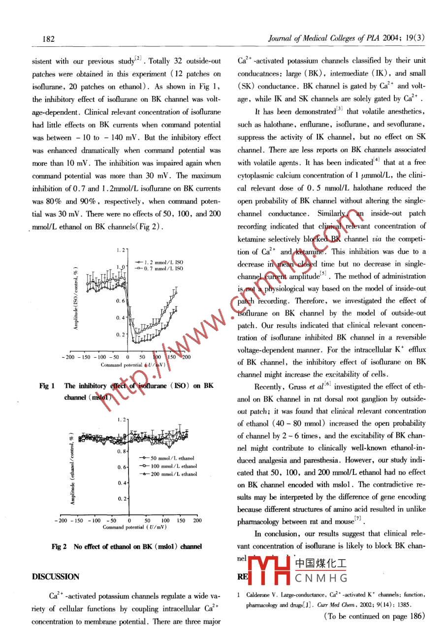 Journal of Medical Colleges of PLA 2004; 19(3)Effects of isoflurane and ethanol on large conductance Ca2+-activated KchanneeIsWANG Ying-wei(王英偉),Ⅺ IONG Yuan-chang(熊源長), DENG Xiao-ming(鄧小明)DetSecond Military Medical University, Shanghai 200433, ChinaAbstract Objective To study the effect of isoflurane and ethanol on large conductance Ca-activated K channe(BK channels). Methods: The cRNA of mslol encoding BK channels was injected into Xenopuscubated in ND96(96 mmol/L NaCl, 2.0 mmol/L KCl, 1.8 mmol/L CaCI,, 1. 0 mmol/L MgCl,no∥/ L HEPES,pH 7.4)at 4C. Patch clamp recording(outside-out )were performed after 2-3 d. Isoflurane was administrated by the vaporizer driven by air, ethanol was applied by a closed, manual-controlled administration system. Different test potentials from0 to 10 mv were given to observe changes of currents. Results: 0. 7 mmol/L and 1. 2 mmol/L of isoflurane could inhibit BKcurrents obviously at different command potentials, but 50 mmol/L, 100 mmol/L, or 200 mmol/L of ethanol had no any ef.fect on BK currents. Conclusion: Clinical concentration of isoflurane can distinctly inhibit isolating BK currentsKey words isoflurane; ethanol; patch clamp: large conductance Ca-activated K channelsLarge conductance Ca-activated K channel( BK Macroscopic currents were induced by Ag/AgCl pipetlechannel)is widely located in neurons, vascular smooth which were maximum frequency at 10 kHz with analog fil-muscles, and endothelial cells. It is believed that BK tering during acquisition, and recorded in computer bychannel plays an important role in excitability of cells. Digidata 1200 AD/DA transfer panel and pclamp 8. 0 softWhen BK channels were activated, intracellular K* efflux ware. Extracellular solution included 140 mmol/L potassilead to hyperpolarization. It has been indicated that vol- um methanesulfonate, 20 mmol/L KOH, 10 mmol/Latile agents might contribute to general anesthesia by acting HEPES, and 2 mmol/L MgCI, pH7.0. The pipette soluon potassium channels. Therefore, we designed this exper- tion contained ND96 and 0. 5 umol/L CaCI. Pclamp 8.0iment to study the effect of clinical relevant concentration of for Windows was used to generate voltage commands and tosoflurane on bK channeldigitize currents. Holding potential was 0 mV, commanMATERIALS AND METHODSpotential was from 170 to- 140 mV with 10 mV incre-mentsExpression in Xenopus oocytes All Xenopus(pro-Method of administration The isoflurane vaporizerof Washington university in St. Lou- was checked and adjusted before experiments. The inputis)were anesthetized with dry CO2. Oocytes were taken out terminal of vaporizer was connected to air in the wall, theand maintained in ND96 solution( NaCl 96.0 mmol/L, output teminal was connected to recording chamber whichKCI 2.0 mmol/L, CaCI2 1. 8 mmol/L, MgCI, 1. 8 mmol/ L, contained oocytes in a glass tube. When isoflurane was ap-and HEPES 5.0 mmol/L, pH 7. 4)supplemented with plied to patches, the extracellular solutions were sealedpenicillin(100 U/ml), streptomycin(100 mg/ml), and tightly and measured by gas chromatography after recordgentamycin(50 mg/ml), and reserved in refrigerator at 17 ing. Ethanol was diluted into 50, 100, and 200 mmol/L byC. The cRNA(10-50 nl)of mslol which would express extracellular solution, and applied to patches by gravityBK channels was injected into cytoplasm of Xenopus oo-Statistical analysisdata were expressed withcytes by microinjection. The oocytes were incubatedMean SD, and analyzed by Clampfit 8.0 software. PeakND96, and used for electrophysiological experiments 2-3 current中國煤化工at different commandd after injectionpotentiCNMHGElectrophysiological recording For this experiment, REsULTscurrents were recorded in the outside-out patch modeThe typical BK currents were obtained from outside-*ComespondingauthorDFNGXiao-ming.E-mail:Deng-x@yahoo.comoutpatchbydifferentcommandpotentials,whichwascon-182Journal of Medical Colleges of PLA 2004; 19(3)sistent with our previouivated potassium channels classified by their unitpatches were obtained in this experiment(12 patches on conducatnces: large(BK), intermediate( IK), and smallisoflurane, 20 patches on ethanol). As shown in Fig 1,( SK)conductance. BK channel is gated by Ca and volt-the inhibitory effect of isoflurane on BK channel was volt- age, while IK and SK channels are solely gated by Caage-dependent. Clinical relevant conceIt has been demonstrated,that volatile anestheticshad little effects on BK currents when command potential such as halothane, enflurane, isoflurane, and sevoflurane,was between -10 to-140 mv. But the inhibitory effect suppress the activity of IK channel, but no effect on SKwas enhanced dramatically when command potential was channel. There are less reports on BK channels associatedmore than 10 mV. The inhibition was impaired again when with volatile agents. It has been indicated that at a freecommand potential was more than 30 mV. The maximum cytoplasmic calcium concentration of I pmmol/L, the clininhibition of 0.7 and 1.2 mmol/L isoflurane on BK currents cal relevant dose of 0. 5 mmol/L halothane reduced thwas 80% and 90%, respectively, when command poten- open probability of BK channel without altering the single-tial was 30 mV. There were no effects of 50, 100, and 200 channel conductance. Similarly, an inside-out patchmmol/L ethanol on BK channels( Fig 2)recording indicated that clinical relevant concentration ofketamine selectively blocked BK channel via the competition of Ca+ and ketamine. This inhibition was due to a-e-1. 2 mmol/L Iso-o-0. 7 mmol/L IsOdecrease in mean closed time but no decrease in singli政政channel current amplitude. The method of administrationis not a physiological way based on the model of inside-outpatch recording. Therefore, we investigated the effect ofIsoflurane onby the model of outside-outpatch. Our results indicated that clinical relevant concen-tration of isoflurane inhibited BK channel in a reversibleoltage-dependent m