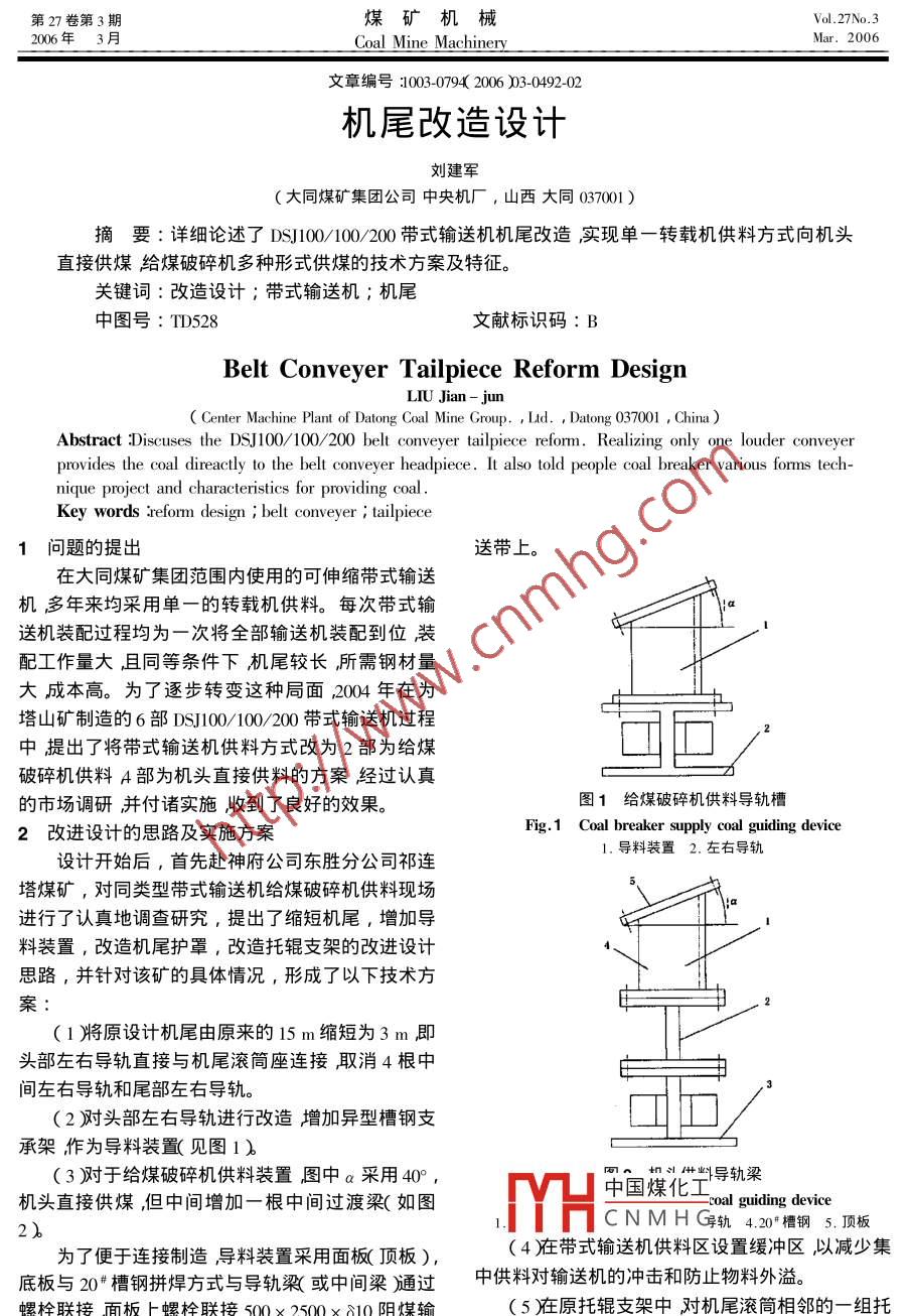 第27卷第3期煤礦機(jī)械Vol. 27No 32006年3月Coal Mine machineryMar.2006文章編號(hào):1003-079(2006)3-049機(jī)尾改造設(shè)計(jì)劉建軍大同煤礦集團(tuán)公司中央機(jī)廠,山西大同037001摘要:詳細(xì)論述了 DS.J100/100/200帶式輸送機(jī)機(jī)尾改造實(shí)現(xiàn)單一轉(zhuǎn)載機(jī)供料方式向機(jī)頭直接供煤給煤破碎機(jī)多種形式供煤的技術(shù)方案及特征。關(guān)鍵詞:改造設(shè)計(jì);帶式輸送機(jī);機(jī)尾中圖號(hào):TD528文獻(xiàn)標(biāo)識(shí)碼:BBelt Conveyer Tailpiece Reform DesignLiu Jian-junCenter Machine Plant of Datong Coal Mine Group. Ltd., Datong 037001, ChinaAbstract Discuses the DSJ100/100/200 belt conveyer tailpiece reform. Realizing only one louder conveyerprovides the coal direactly to the belt conveyer headpiece. It also told people coal breaker various forms technique project and characteristics for providing coalKey words reform design i belt conveyer tailpiece問(wèn)題的提出送帶上。在大同煤礦集團(tuán)范圍內(nèi)使用的可伸縮帶式輸送機(jī)多年來(lái)均采用單一的轉(zhuǎn)載機(jī)供料。每次帶式輸送機(jī)裝配過(guò)程均為一次將全部輸送機(jī)裝配到位裝配工作量大且同等條件下機(jī)尾較長(zhǎng)所需鋼材量大成本高。為了逐步轉(zhuǎn)變這種局面2004年在為塔山礦制造的6部DSJ00/100/200帶式輸送機(jī)過(guò)程中提出了將帶式輸送機(jī)供料方式改為2部為給煤破碎機(jī)供料A部為機(jī)頭直接供料的方案經(jīng)過(guò)認(rèn)真的市場(chǎng)調(diào)研并付諸實(shí)施收到了良好的效果。圖1給煤破碎機(jī)供料導(dǎo)軌槽2改進(jìn)設(shè)計(jì)的思路及實(shí)施方案Fig. 1 Coal breaker supply coal guiding device1.導(dǎo)料裝置2.左右導(dǎo)軌設(shè)計(jì)開(kāi)始后,首先赴神府公司東勝分公司祁連塔煤礦,對(duì)同類(lèi)型帶式輸送杋給煤破碎杋供料現(xiàn)場(chǎng)進(jìn)行了認(rèn)真地調(diào)查研究,提出了縮短機(jī)尾,增加導(dǎo)料裝置,改造機(jī)尾護(hù)罩,改造托輥支架的改進(jìn)設(shè)計(jì)思路,并針對(duì)該礦的具體情況,形成了以下技術(shù)方案(1將原設(shè)計(jì)機(jī)尾由原來(lái)的15m縮短為3m即頭部左右導(dǎo)軌直接與機(jī)尾滾筒座連接取消4根中間左右導(dǎo)軌和尾部左右導(dǎo)軌。(2頭部左右導(dǎo)軌進(jìn)行改造增加異型槽鋼支承架作為導(dǎo)料裝置見(jiàn)圖13尉對(duì)于給煤破碎機(jī)供料裝置圖中α采用40°導(dǎo)軌梁機(jī)頭直接供煤但中間增加一根中間過(guò)渡梁(如圖凵中國(guó)煤化coal guiding device2)CNMHG軌420°糟鋼5.頂板為了便于連接制造導(dǎo)料裝置采用面板(頂板)(4在帶式輸送機(jī)供料區(qū)設(shè)置緩沖區(qū)以減少集底板與20°槽鋼拼焊方式與導(dǎo)軌梁或中間梁通過(guò)中供料對(duì)輸送機(jī)的沖擊和防止物料外溢螺栓聯(lián)接釃板上螺栓聯(lián)接500×2500×δ10阻煤輸5在原托輥支架中對(duì)機(jī)尾滾筒相鄰的一組托送帶用3塊壓板固定壓緊,保證了煤炭順利流入輸輥支架進(jìn)行改造設(shè)計(jì)以保證供料緩沖區(qū)幾何尺寸第27卷第3期煤礦機(jī)械Vol. 27No 32006年3月Coal Mine machineryMar.2006文章編號(hào)1003-079(2006)30493-03齒輪齒距儀的改造及檢測(cè)系統(tǒng)設(shè)計(jì)潘寧,楊雪鋒中國(guó)礦業(yè)大學(xué)機(jī)電工程學(xué)院,江蘇徐州221008摘要:針對(duì)上置式齒輪齒距儀定位不準(zhǔn)確測(cè)量力不恒定,人工讀數(shù)誤差較大數(shù)據(jù)處理麻煩裝配調(diào)整不便測(cè)量效率較低等。通過(guò)改造重新設(shè)計(jì)了調(diào)整螺母、輔助彈性定位爪、可調(diào)式支腳等洴采用容柵傳感器代替原機(jī)械式千分表冋時(shí)研制岀具有數(shù)據(jù)采集液晶顯示煒行通訊的轉(zhuǎn)換接口。對(duì)改造后的齒距儀進(jìn)行了重復(fù)實(shí)驗(yàn)結(jié)果表明不僅測(cè)量效率有了極大地提高同時(shí)也提高了測(cè)量精度改善了性能關(guān)鍵詞:上置式齒距測(cè)量?jī)x;容柵傳感器;智能接口中圖號(hào):TP216.1文獻(xiàn)標(biāo)識(shí)碼:AImprovement of Portable Gear Pitch Tester and Design ofMeasurement SystemPAN Ning, YANG Xue-fengChina University of Mining Technology Mechitrone Engineering College, Xuzhou 221008, ChinaAbstract There are many shortages in the portable gear pitch tester we using at present when we check gearSuch as fixed position is not accurate strength can t keep invariableness reading existed artificial error,asmble is not convenience etc.. Aims at the above shortages reform this tester. Redesigned the adjusting springhine micrometer with thelectronic digital indicator and designed an intelligent interface to PC. A series of experiment indicate this newtester is completely up to the mustard and can increase the work efficiencKey words portable gear pitch tester capacitance grating sensor i intelligent interface0引言基本可以滿(mǎn)足各種測(cè)量精度的要求但是卻不能滿(mǎn)目前齒輪精密測(cè)量?jī)x器的種類(lèi)很多,可綜合測(cè)足高效率檢測(cè)要求如:上置式齒輪齒距測(cè)量?jī)x即屬量也可單項(xiàng)測(cè)量齒輪的各項(xiàng)精度指標(biāo)。一些儀器這一類(lèi)儀器,其中手持式可在車(chē)間條件下使用的儀《《常第某《?!秾⒉凵罴哟?0~80mm使輸送帶在緩沖區(qū)形成V"帶彎曲加劇煤料外溢。204年10月6部帶式輸送形機(jī)全部一次性通過(guò)塔山礦的驗(yàn)收在礦方使用過(guò)程6肘機(jī)尾護(hù)