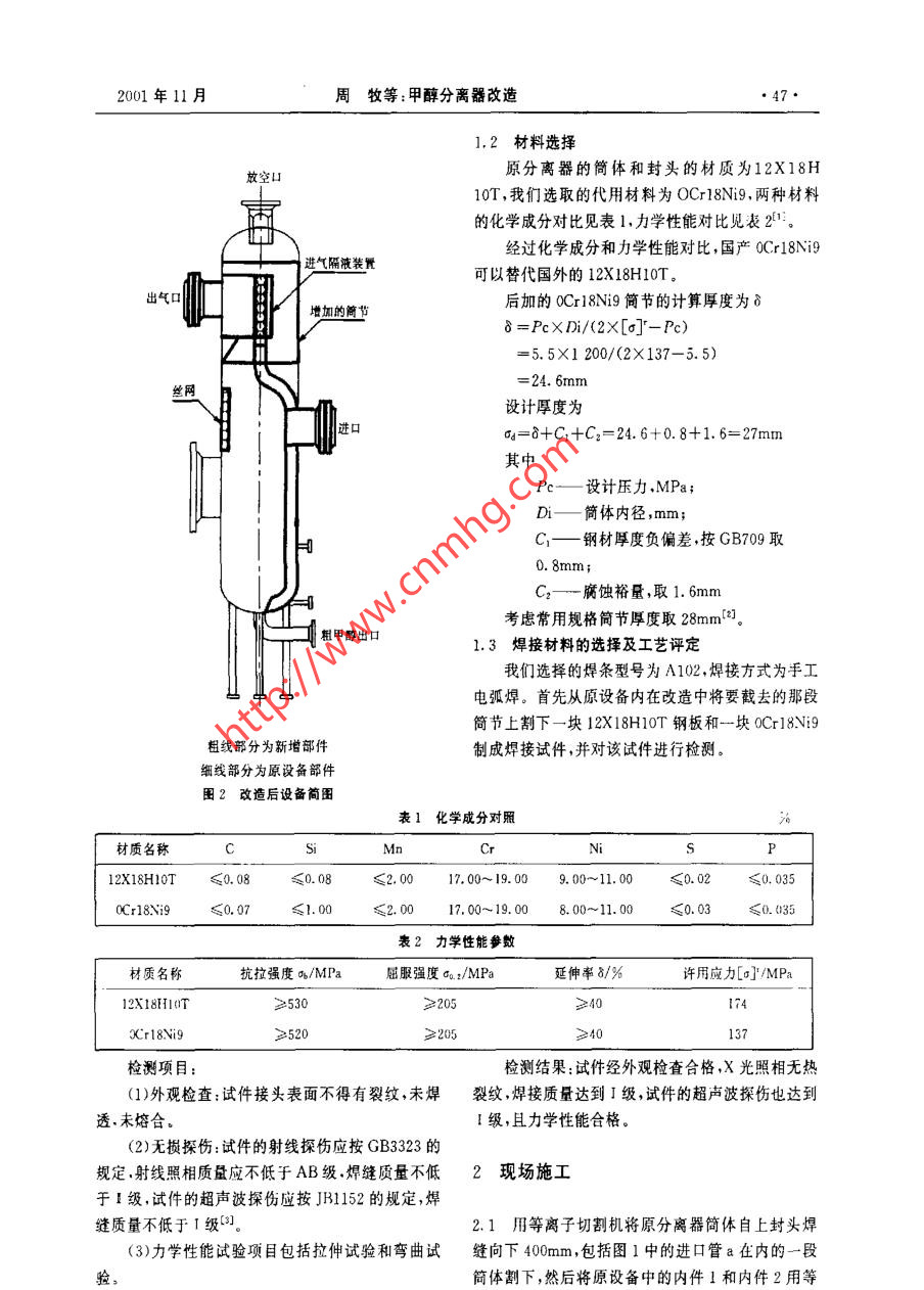 第1期(總第97期)煤化工No.4(Total .No. 97)2001年11月Coal Chemical IndustryNov. 2001甲醇分離器改造周牧徐罡王軍白玉學(xué)哈爾濱氣化廠 154854摘要本文介紹俄羅斯制造的甲醇分離器的改造。關(guān)鍵詞甲醇分離器 旋風(fēng)式 普滴式改造文章編號1005-9812001)04-0046-03中圈分類號:TQ051文獻(xiàn)標(biāo)識碼:A .氣隔液裝置是由40~100目的絲網(wǎng),989X4回流管引言和集液槽組成)。改造后設(shè)備的進(jìn)氣口由原來的切向改為徑向,出氣口原來的位于分離器頂端改為簡體甲醇分離器是合成甲醇生產(chǎn)過程中的重要設(shè)備。側(cè)面徑向出口,在原出氣管上加法蘭蓋,并在法蘭蓋我廠原甲醇分離器是1992年由前蘇聯(lián)引進(jìn)的,分離能中心開口焊接-一個中76X3的帶法蘭和法蘭蓋的接力可滿足生產(chǎn)4萬1/a精甲醇之需。分離形式為旋風(fēng)管,以備停車檢修時放空,設(shè)備的其它接管和支座式分離器,簡體規(guī)格為91 200X22, 簡體長為2400,(經(jīng)計算)保持不變,改造后的設(shè)備如圖2。材質(zhì)為12X18H10T ,封頭規(guī)格為虹200X 22.材質(zhì)為12X18H10T,介質(zhì)為反應(yīng)氣和粗甲醇,設(shè)計壓力出氣口為5. 5MPa,設(shè)計溫度為100C。2000年3月,我廠甲醇生產(chǎn)精甲醇由4萬t/a擴(kuò)建為6萬t/a,經(jīng)測算原甲醇分離器的分離能力達(dá).不到6萬t/a精甲醇生產(chǎn)之需。由于原設(shè)備是用不內(nèi)件」銹鋼制造的,設(shè)備造價高達(dá)80余萬元,為了給工廠節(jié)約資金.決定對原分離器進(jìn)行現(xiàn)場改造,分離器的形式由原旋風(fēng)式改為普滴式。1改造方案1.1 結(jié)構(gòu)改造內(nèi)件2將原設(shè)備(見圖1)自上封頭焊縫向下截去包括進(jìn)氣管在內(nèi)的400 mm簡體,并將原設(shè)備的內(nèi)件1(包括原設(shè)備的內(nèi)部上端的錐體和與它及頂端出氣.管相連的接管)和內(nèi)件2(包括原設(shè)備內(nèi)部下端的鍋形蓋、中心堵板、短簡節(jié)、旋流板、中心管、支架等)從.設(shè)備中割下。增加一段1 600 mm長的簡節(jié),在此簡相甲醉出口節(jié)上焊接出氣管。在分離器內(nèi)安裝進(jìn)氣隔液裝置(進(jìn)收績?nèi)掌?2001-03-17⊥ψ⊥作者簡介:周牧.男.1972 年出生,工程師.畢業(yè)于大連理工學(xué)院.從事壓力容器設(shè)計工作。圖1改造前的設(shè)備簡圄2001年11月周牧等:甲醇分離器改造●47●1.2 材料選擇原分離器的簡體和封頭的材質(zhì)為12X18H放空U10T,我們選取的代用材料為OCr18Ni9,兩種材料的化學(xué)成分對比見表1.力學(xué)性能對比見表2t1。毒經(jīng)過化學(xué)成分和力學(xué)性能對比,國產(chǎn)0Cr18Ni9進(jìn)氣隔液裝咒可以替代國外的12X18H10T。出氣口后加的0Cr18Ni9簡節(jié)的計算厚度為δ增加的簡節(jié)δ = PcX Di/(2X[o]°-Pc)=5.5X1200/(2X137-5. 5)= 24.6mm絲網(wǎng)設(shè)計厚度為σg=δ+C:+C2=24.6+0. 8+1.6= 27mm其中.Pc-設(shè)計壓力,MPa; .Di-筒體內(nèi)徑,mm;鋼材厚度負(fù)偏差,按GB709取0. 8mm;C2--腐蝕裕量,取1. 6mm考慮常用規(guī)格筒節(jié)厚度取28mm[c。粗甲醇出口1.3焊接材料 的選擇及工藝評定我們選擇的焊條型號為A102,焊接方式為手工馬中口電弧焊。首先從原設(shè)備內(nèi)在改造中將要截去的那段簡節(jié)上割下一塊12X18H10T鋼板和一塊0Cr18Ni9粗線部分為新增部件制成焊接試件,并對該試件進(jìn)行檢測。細(xì)線部分為原設(shè)備部件圍2改造后設(shè)備簡圍表1化學(xué)成分對照材質(zhì)名稱siMCrNiP12X18H10T≤0.08≤0. 08≤2. 0017. 00~19.009.00~11. 00≤0.02.≤0. 0350Cr18Ni9≤0.07≤1. 00≤2.00.8. 00~11.00≤0. 03≤0. (035表2力學(xué)性能參數(shù)抗拉強(qiáng)度a%/MPa屈服強(qiáng)度Co x/MPa延伸率8/%許用應(yīng)力[J]/MPa12X18HI0T≥530≥205≥40174XCr18Ni9≥520檢測項(xiàng)目:檢測結(jié)果:試件經(jīng)外觀檢查合格,X光照相無熱(1)外觀檢查;試件接頭表面不得有裂紋,未焊裂紋,焊接質(zhì)量達(dá)到I級,試件的超聲波探傷也達(dá)到透.未熔合。I級,且力學(xué)性能合格。(2)無損探傷:試件的射線探傷應(yīng)按GB3323的規(guī)定.射線照相質(zhì)量應(yīng)不低于AB級.焊縫質(zhì)量不低2現(xiàn)場施工于I級,試件的超聲波探傷應(yīng)按JB1152的規(guī)定,焊縫質(zhì)量不低于1級”。2.1用等離子切割機(jī)將原分離器簡體自 上封頭焊(3)力學(xué)性能試驗(yàn)項(xiàng)目包括拉伸試驗(yàn)和彎曲試縫向下400m,包括圖1中的進(jìn)口管a在內(nèi)的一段驗(yàn)。簡體割下,然后將原設(shè)備中的內(nèi)件1和內(nèi)件2用等●48.煤化工2001年第4期離子切割機(jī)割下。測合格。2.2在下半段簡體側(cè)面開孔,打坡口焊接進(jìn)口管,2.7做水壓試驗(yàn), 試驗(yàn)壓力6. 785MPa,試驗(yàn)結(jié)果在它的對面焊上半圈角鋼托架,將800mm高、合格4。1900mm長的40~100目絲網(wǎng)組成厚為20mm的半圓簡固定在托架上,使其中心與進(jìn)口管中心對齊。3結(jié)論2.3將長為1 600mm、規(guī)格為中1200X28的0Cr18Ni9簡節(jié)打坡口,與原設(shè)備筒體連接的部分打我廠甲醇裝置從2000年5月改造完成投入生雙面坡口,與上端封頭連接部分打單面坡口.這段筒產(chǎn),系統(tǒng)運(yùn)行穩(wěn)定,平均日產(chǎn)精甲醇188t, 年產(chǎn)可以節(jié)提前焊上出氣管(出氣管距管節(jié)與封頭連接處超過6萬t精甲醇,改造的甲醇分離器各項(xiàng)參數(shù)穩(wěn)400mm),將這段筒節(jié)與原設(shè)備下段采用雙面焊。定,運(yùn)行良好。總之,