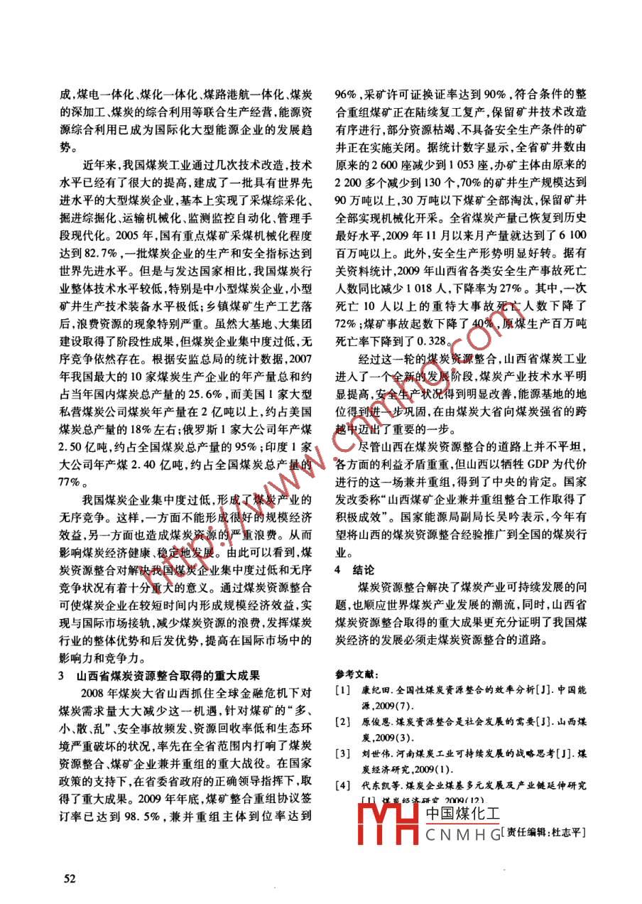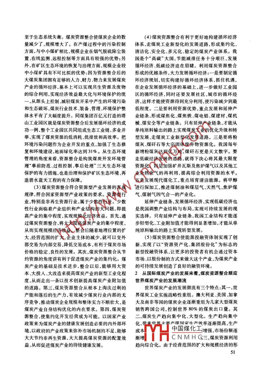 2010年9月山西經(jīng)濟(jì)管理干部學(xué)院學(xué)報(bào)Sept. 2010第18卷第3期JOURNAL OF SHANXI ECONOMIC MANAGEMENT ITTTETVol.18 No.3煤炭資源整合是煤炭經(jīng)濟(jì)發(fā)展的必然選擇.口崔潤(rùn)花(大同煤炭職業(yè)技術(shù)學(xué)院,山西大同037003)[摘要]煤炭資源是我國(guó)戰(zhàn)略上最安全和最可靠的能源,它的重要戰(zhàn)略資源地位無(wú)法動(dòng)搖。然而,煤炭行業(yè)長(zhǎng)期以來(lái)存在“多、小、散、亂、差”的局面,隨之帶來(lái)的資源浪費(fèi)、生態(tài)環(huán)境破壞和安全事故頓發(fā)等問(wèn)題嚴(yán)重制約著煤炭經(jīng)濟(jì)的健康發(fā)展。本文從三個(gè)方面來(lái)論述煤炭資源整合是煤炭經(jīng)濟(jì)發(fā)展的必然選擇。[關(guān)鍵詞]煤炭資源整合;可持續(xù)發(fā)展;煤炭產(chǎn)業(yè);安全;循環(huán)經(jīng)濟(jì)[中圖分類(lèi)號(hào)] F407.21[文獻(xiàn)標(biāo)識(shí)碼] A(文章編號(hào)] 1008 -9101 (2010)03 -0050 -03被譽(yù)為“黑色郁金香”的煤炭,是我國(guó)最主要的上解決了煤炭企業(yè)的安全問(wèn)題。按照《國(guó)務(wù)院關(guān)于- -次性能源, 是我國(guó)戰(zhàn)略上最安全、可靠的能源,它預(yù)防煤礦生產(chǎn)安全事故的特別規(guī)定》,煤炭資源整的重要戰(zhàn)略資源地位無(wú)法動(dòng)搖。煤炭在世界- - 次能合對(duì)于不具備安全生產(chǎn)條件、非法經(jīng)營(yíng)破壞浪費(fèi)資源消費(fèi)結(jié)構(gòu)中占20%以上,低于石油(40%)和天然源的煤礦,堅(jiān)決予以關(guān)閉;對(duì)年生產(chǎn)能力在3萬(wàn)噸以氣(23%)。而我國(guó)是典型的多煤少油國(guó)家,以熱值下的煤與瓦斯突出礦井,一律不得納人煤炭資源整算煤炭要占到全國(guó)能源儲(chǔ)量的97.8%,從目前能源合范圍;同時(shí),對(duì)礦井的規(guī)模進(jìn)行了嚴(yán)格的規(guī)定,如:消費(fèi)結(jié)構(gòu)來(lái)看,煤炭占據(jù)絕對(duì)主導(dǎo)地位,比例- -直超山西、內(nèi)蒙古、陜西不得低于30萬(wàn)噸/年;新疆、甘過(guò)65%。然而,煤炭行業(yè)長(zhǎng)期以來(lái)存在“多、小、散.肅.青海寧夏北京河北、東北及華東地區(qū)不得低亂、差”的局面,隨之帶來(lái)的資源浪費(fèi)、生態(tài)環(huán)境破于15萬(wàn)噸/年;西南和中南地區(qū)不得低于9萬(wàn)噸/壞和安全事故頻發(fā)等問(wèn)題嚴(yán)重制約著煤炭經(jīng)濟(jì)的健年;經(jīng)過(guò)資源整合形成的礦井必須采用正規(guī)的開(kāi)采康發(fā)展。煤炭資源整合是合法礦井之間對(duì)煤炭資方法,確定政府安全監(jiān)管和企業(yè)安全生產(chǎn)兩個(gè)責(zé)任源、資金、資產(chǎn)、技術(shù)、管理.人才等生產(chǎn)要素的優(yōu)化主體,實(shí)行安全質(zhì)量的標(biāo)準(zhǔn)化管理和瓦斯綜合治理重組,及合法礦井對(duì)已關(guān)閉煤礦尚有開(kāi)采價(jià)值資源體系。因而,大大減少了小煤礦的數(shù)量,提高辦礦規(guī)的整合。煤炭資源整合是煤炭經(jīng)濟(jì)健康發(fā)展的必然模,提升了煤礦的安全裝備、技術(shù)管理水平,從源頭選擇,也順應(yīng)世界煤炭經(jīng)濟(jì)發(fā)展的潮流。煤炭資源上減少和控制了煤礦事故發(fā)生,使煤礦安全保障能整合對(duì)于提高煤炭產(chǎn)業(yè)集中度,加快煤炭企業(yè)的現(xiàn)力明顯增強(qiáng)。同時(shí),通過(guò)煤炭資源整合,提高了煤礦代化建設(shè)具有重要意義,是實(shí)現(xiàn)煤炭安全生產(chǎn)根本安全的整體水平,確保了煤炭資源的合理開(kāi)發(fā),是煤好轉(zhuǎn)的必由之路,是煤炭產(chǎn)業(yè)實(shí)現(xiàn)可持續(xù)發(fā)展的必炭產(chǎn)業(yè)節(jié)約發(fā)展、安全發(fā)展、實(shí)現(xiàn)可持續(xù)發(fā)展的重大由之路,是提高煤炭利用率,保障國(guó)家能源安全的必舉措。由之路。(2)煤炭資源整合.煤炭企業(yè)兼并重組有效地1煤炭資源整合是煤炭經(jīng)濟(jì)可持續(xù)發(fā)展必由之路保護(hù)了生態(tài)環(huán)境。長(zhǎng)期以來(lái),煤炭資源大面積、高強(qiáng)的具體表現(xiàn)度的無(wú)序開(kāi)采,導(dǎo)致了不少采煤區(qū)資源枯竭、環(huán)境污(1)煤炭資源整合和煤炭企業(yè)兼并重組從源頭染、地表沉陷、水資源被破壞,進(jìn)而引發(fā)生態(tài)退化以中國(guó)煤化工收稿日期:2010-04-10作者簡(jiǎn)介:崔潤(rùn)花(1968 -),女,山西大同人,學(xué)士,現(xiàn)工作于大同煤炭職.MYHCNMHG,研究方向:財(cái)務(wù)管理。50至于生態(tài)系統(tǒng)失衡。煤炭資源整合使煤炭企業(yè)的數(shù)(4)煤炭資源整合有利于更好地構(gòu)建循環(huán)經(jīng)濟(jì)量減少了,規(guī)模增大了。在產(chǎn)煤過(guò)程中的污染控制體系,走煤炭工業(yè)新型化的發(fā)展道路,形成集約化、方面,與中小煤礦相比,規(guī)模企業(yè)在煙氣脫硫除塵裝清潔化、安全化、多元化、穩(wěn)定的煤炭產(chǎn)業(yè)體系。我置,在線(xiàn)監(jiān)測(cè)、遠(yuǎn)程控制等方面具有較強(qiáng)的優(yōu)勢(shì);另國(guó)是個(gè)“高碳"大國(guó),節(jié)能減排任務(wù)十分艱巨,發(fā)展外,在礦區(qū)生態(tài)環(huán)境的恢復(fù)與治理方面,規(guī)模企業(yè)較循環(huán)經(jīng)濟(jì)、低碳經(jīng)濟(jì)迫在眉睫。利用煤炭資源整合中小煤礦具有不可比擬的優(yōu)勢(shì):因?yàn)橘Y源整合后的形成的優(yōu)越