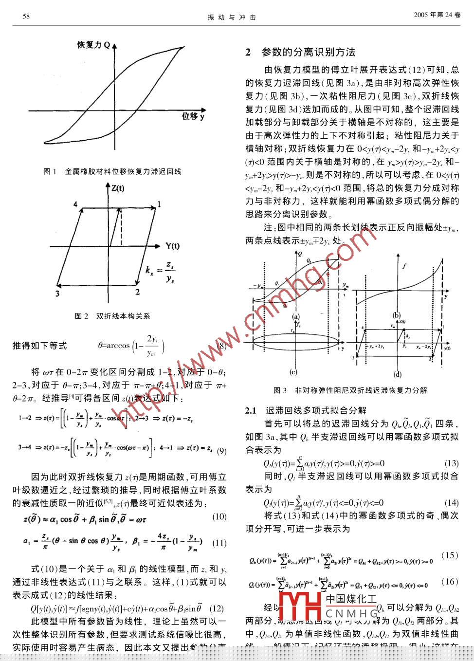 振動(dòng)與沖擊第24卷第6期JOURNAL OF VIBRATION AND SHOCKVol.24No.62005金屬橡膠動(dòng)力學(xué)建模及參數(shù)識(shí)別李冬偉白鴻柏楊建春劉英杰(軍械工程學(xué)院自行火炮教研室,石家莊050003摘要根據(jù)金屬橡膠材料的作用機(jī)理,提出了一種非對(duì)稱彈性粘性阻尼雙折線遲滯恢復(fù)力的模型,利用材料試驗(yàn)機(jī)的位移加載控制原理,對(duì)其進(jìn)行了傳立葉級(jí)數(shù)展開(kāi),并設(shè)計(jì)了一種分離參數(shù)的識(shí)別算法,經(jīng)過(guò)對(duì)實(shí)測(cè)數(shù)據(jù)的計(jì)算,識(shí)別精度較高,能滿足工程上分析金屬橡膠彈性元件動(dòng)態(tài)特性的需要關(guān)鍵詞:金屬橡膠,遲滯模型,參數(shù)識(shí)別中圖分類號(hào):TB535,TH113.1文獻(xiàn)標(biāo)識(shí)碼:A恢復(fù)力與變形歷史之間具有所謂的記憶特性,且其彈0引言性恢復(fù)力是正反不對(duì)稱的,因此本文提出非對(duì)稱彈性金屬橡膠材料是以不同規(guī)格的金屬絲為原材料,粘性阻尼雙折線遲滯恢復(fù)力模型。經(jīng)螺旋纏繞、拉伸、模壓等特殊制備工藝成型的,該種此模型認(rèn)為金屬橡膠彈性阻尼元件的恢復(fù)力由記材料在高低溫、腐蝕環(huán)境等特種工況下具有良好的阻憶環(huán)節(jié)和無(wú)記憶環(huán)節(jié)并聯(lián)而成尼隔振性能,因此,建立一套反映金屬橡膠材料作用Q0(t), y()=f(sony(t), y())+cy(t)+(t)機(jī)理,精度高、適用性強(qiáng)的理論與實(shí)驗(yàn)方法是十分必要()——彈性元件的位移的彈性元件的速度常規(guī)的研究阻尼材料動(dòng)態(tài)特性的自由衰減法、半其中,無(wú)記憶恢復(fù)力又由僅與位移有關(guān)的非對(duì)稱功率法主要用于系統(tǒng)近似為線性的情況,而金屬橡膠高次彈性力f(sgmy(,y()和僅與速度有關(guān)的粘性阻尼力材料為大阻尼非線性材料,故不易采用此類方法測(cè)cy()兩部分構(gòu)成,前者為關(guān)于各階正反向剛度系數(shù)k,k試。另一方面,一些學(xué)者對(duì)具有類似金屬橡膠的干摩的線性模型擦阻尼特性材料進(jìn)行了探討,并建立了相應(yīng)的數(shù)學(xué)模型,如文獻(xiàn)[提出了基于曲線擬合分解的復(fù)合型阻尼八(gn()y()=-2(1+sgn0y02力模型以,對(duì)于大位移時(shí)的鋼絲繩等遲滯系統(tǒng)有比較高(2)的精度,但此模型中提出的復(fù)合型阻尼力概念有些模+(1-sgmy(O)k2-y2+(糊,不能滿足需要精確得到各種阻尼成分的要求,且從z()表示與整個(gè)變形歷史有關(guān)的雙折線關(guān)系記憶恢實(shí)測(cè)結(jié)果可知金屬橡膠元件的恢復(fù)力-位移遲滯回線復(fù)力,其增量方程為是上下不對(duì)稱的,即高次彈性力是正反不對(duì)稱的,故不能用此模型來(lái)描述。文獻(xiàn)[2]應(yīng)用 Masing模型,通過(guò)對(duì)dz(0)=m[1+sgn(e-z(olly()金屬橡膠隔振器的最初加載曲線進(jìn)行坐標(biāo)變換,得到了變形與力的非線性關(guān)系,但這種建模方法不適于分k,=—是未產(chǎn)生滑移時(shí)的線性剛度;z是滑移時(shí)析金屬橡膠彈性元件承受動(dòng)態(tài)載荷時(shí),恢復(fù)力與振幅和振動(dòng)頻率的關(guān)系的記憶恢復(fù)力;y.是金屬絲間發(fā)生宏觀滑移的變形極利用電液伺服材料試驗(yàn)杋精確的位移加載控制,限,簡(jiǎn)稱滑移極限,圖2是雙折線本構(gòu)關(guān)系。依據(jù)雙折線遲滯模型的傅立葉展開(kāi)形式,設(shè)計(jì)了一種設(shè)y為材料試驗(yàn)機(jī)位移控制下彈性元件的變形分離參數(shù)的識(shí)別算法,識(shí)別精度較高,能滿足工程上分量析金屬橡膠彈性元件動(dòng)態(tài)特性的需要。y=sin(at+o)雙折線遲滯模型的傅立葉級(jí)數(shù)展開(kāi)引入坐標(biāo)變換Tl-l6 ls理論與實(shí)驗(yàn)分析表明,由于用于制作金屬橡膠的鋼絲間的摩擦、擠壓、滑移等細(xì)觀力學(xué)作用,這種材料則(4)式EACH中國(guó)煤化工宏觀上會(huì)呈現(xiàn)出類似彈塑性的本構(gòu)關(guān)系,如圖1,導(dǎo)致根據(jù)關(guān)CNMHG(7)國(guó)家自然科學(xué)基金(項(xiàng)目批準(zhǔn)號(hào):50105021),國(guó)家教育部《高等學(xué)校骨干教師資助計(jì)劃》以及軍械工程學(xué)院創(chuàng)新人才啟動(dòng)基金聯(lián)合資助項(xiàng)目收稿日期:2004-08-23修改稿收到日期:2004-11-12第一作者秀務(wù)鬟數(shù)據(jù)博士生,1979年生振動(dòng)與沖擊2005年第24卷恢復(fù)力Q2參數(shù)的分離識(shí)別方法由恢復(fù)力模型的傅立葉展開(kāi)表達(dá)式(12)可知,總的恢復(fù)力遲滯回線(見(jiàn)圖3a),是由非對(duì)稱高次彈性恢復(fù)力(見(jiàn)圖3b),一次粘性阻尼力(見(jiàn)圖3c),雙折線恢位移y復(fù)力(見(jiàn)圖3d)迭加而成的。從圖中可知,整個(gè)遲滯回線加載部分與卸載部分關(guān)于橫軸是不對(duì)稱的,這主要是由于高次彈性力的上下不對(duì)稱引起;粘性阻尼力關(guān)于橫軸對(duì)稱;雙折線恢復(fù)力在0