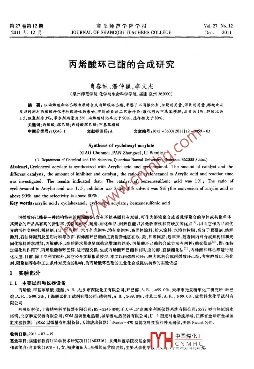 第27卷第12期商丘師范學(xué)院學(xué)報(bào)Vol. 27 No. 122011年12月JOURNAL OF SHANGQIU TEACHERS COLLEGEDec.2011丙烯酸環(huán)己酯的合成研究肖春妹,潘仲巍,李文杰(泉州師范學(xué)院化學(xué)與生命科學(xué)學(xué)院福建泉州362000摘要:以丙烯酸和環(huán)己醇為原料合成丙烯酸環(huán)己酯,考察了不同催化劑、阻聚劑用量、催化劑用量、醇酸比及反應(yīng)時(shí)間對(duì)丙烯酸轉(zhuǎn)化率和選擇性的影響,得到的最佳工藝條件為:催化劑為甲基苯磺酸,用量為1%,醇酸比為1.5,阻聚劑為3‰,帶水劑用量為5%,丙烯酸轉(zhuǎn)化率大于90%,選擇性大于80%關(guān)鍵詞:丙烯酸;環(huán)己醇;丙烯酸環(huán)己酯;甲基苯磺酸中圖分類號(hào):TQ643.1文獻(xiàn)標(biāo)識(shí)碼:A文章編號(hào):1672-3600(2011)12-0059-03Synthesis of cyclohexyl acrylateXIAO Chunmei, PAN Zhongwei, LI Wenjie(1. Department of Chemical and Life Sciences, Quanzhou Normal University, Quanzhou 362000, China)Abstract: Cyclohexyl acrylate is synthesized with Acrylic acid and cyclohexanol. The amount of catalyst and thedifferent catalysts, the amount of inhibitor and catalyst, the ratio of cyclohexanol to Acrylic acid and reaction timewas investigated. The results indicated that: The catalyst of benzenesulfonic acid was 1%0; The ratio ofcyclohexanol to Acrylic acid was 1. 5, inhibitor was 3 %0, the solvent was 5%; the conversion of acrylic acid isabove 90% and the selectivity is above 80%0Key words: acrylic acid; cyclohexanol; cyclohexyl acrylate; benzenesulfonic acid丙烯酸環(huán)己酯是一種結(jié)構(gòu)特殊的丙烯酸酯,含有環(huán)狀基團(tuán)且有雙鍵,可作為溶液聚合或者懸浮聚合的單體或共聚單體其聚合的產(chǎn)品具有高的折射率、優(yōu)良的耐水、耐磨、耐化學(xué)品耐熱性能以及低收縮性和高硬度等優(yōu)點(diǎn)口.因而它作為品質(zhì)優(yōu)異的活性交聯(lián)劑、稀釋劑,已廣泛應(yīng)用于汽車外殼涂料、溶劑型涂料、高固體涂料、粉末涂料、水溶性樹脂、高分子絮凝劑紡織助劑、石油降凝劑及醫(yī)用材料等方面丙烯酸環(huán)己酯的主要消費(fèi)地區(qū)在歐美、日等國家,近年來,隨著國內(nèi)對(duì)合成氟樹脂和光固化涂料需求增加,丙烯酸環(huán)己酯的需求量也呈現(xiàn)穩(wěn)定增加的趨勢丙烯酸環(huán)已酯的合成方法有兩種酯交換法2,即:在特定催化劑作用下,丙烯酸酯和環(huán)己醇,進(jìn)行酯交換,生成丙烯酸環(huán)己酯和相對(duì)應(yīng)的醇;直接酯化法,丙烯酸和環(huán)已醇進(jìn)行酯化反應(yīng).目前除了專利文獻(xiàn)外,其它公開文獻(xiàn)報(bào)道較少本文以丙烯酸和環(huán)己醇為原料合成丙烯酸環(huán)己酯,考察醇酸比、催化劑阻聚劑等各種工藝條件對(duì)反應(yīng)的影響,為丙烯酸環(huán)己酯的工業(yè)化合成提供初步的實(shí)驗(yàn)依據(jù)1實(shí)驗(yàn)部分11主要試劑和儀器設(shè)備丙烯酸,甲基苯磺酸,硫酸,A.R.,汕頭市西隴化工有限公司;環(huán)己醇,A.R.,≥99.0%,天津市光復(fù)精細(xì)化工研究所;環(huán)己烷,A.R.,≥99.5%,上海聯(lián)試化工試劑有限公司;磷鎢酸,A.R,≥99.0%,對(duì)苯二酚,A.R.,≥99.0%,成都科龍化學(xué)試劑有限公司阿貝折射儀,上海精密科學(xué)儀器有限公司;BS-224S型電子天平,北京塞多利斯儀器系統(tǒng)有限公司;SsY2型電熱恒溫水浴鍋,北京泰克儀器有限公司;KDM型調(diào)溫電熱套,城華魯電熱儀器有限公司;J-1型定時(shí)電動(dòng)攪拌器,江蘇省金壇市金城國勝實(shí)驗(yàn)儀器廠;MZZ型微量有機(jī)制備儀,天津玻璃儀器廠; Nexus-470型傅立葉變換紅外光譜儀,美國 Nicolet公司收稿日期:2011-07-19中國煤化工基金項(xiàng)目:福建省教育廳科學(xué)技術(shù)研究項(xiàng)目(JA0536);泉州師范學(xué)院?;鹳YHCNMHG作者簡介:肖春妹(1978-),女福建莆田人,泉州師范學(xué)院講師,主要從事化學(xué)及高力啊力面腳宄商丘師范學(xué)院學(xué)報(bào)2011年1.2實(shí)驗(yàn)過程在500mL的三口燒瓶上安裝冷凝管、磁力攪拌、分水器、溫度計(jì),加入丙烯酸,環(huán)己醇,催化劑、脫水劑,開始加熱攪拌至回流然后放出水層,冷卻,取樣備用分析1.3分析方法采用 Agilent7890A及其工作站進(jìn)行樣品分析色譜柱:SE-54,60m×0.53mm×0.50μm;色譜條件:采用恒溫分析,柱箱溫度:180℃;終止時(shí)間:10min;進(jìn)樣器溫度:260℃;檢測器:FID,260℃;載氣He:40mL/min;柱前壓:5.734psi;空氣:350ml min;氫氣:40m/min;進(jìn)樣量0.5μL2結(jié)果與討論2.1不同催化劑對(duì)酯化反應(yīng)的影響按照1.2項(xiàng)試驗(yàn)步驟,釆用環(huán)己醇丙烯酸=1.5:1(物質(zhì)的量比),催化劑投加量為丙烯酸和環(huán)已醇總質(zhì)量的1%(下同)阻聚劑投加量為丙烯酸和環(huán)己醇總質(zhì)量的3%o(下同),帶水劑環(huán)已烷為丙烯酸和環(huán)已醇總質(zhì)量的5%(下同),控制反應(yīng)溫度100℃,分別考察硫酸、甲基苯磺酸和磷鎢酸為催化劑時(shí)對(duì)丙烯酸轉(zhuǎn)化率和選擇性的影響,實(shí)驗(yàn)結(jié)果如圖1所示.從圖1可以看出,以硫酸為催化劑時(shí)丙烯酸轉(zhuǎn)化率達(dá)到91%,選擇性78%,此時(shí)產(chǎn)物外觀顏色較深,色譜上雜質(zhì)峰很多,表明副反應(yīng)較多;以甲基苯磺酸為催化劑時(shí)丙烯酸轉(zhuǎn)化率90%,選擇性為81%,產(chǎn)物質(zhì)外觀為無色液體,色譜上雜質(zhì)峰較少,表明副反應(yīng)較少;以磷鎢酸為催化劑時(shí)丙烯酸轉(zhuǎn)化率為60%,選擇性為60%,產(chǎn)物