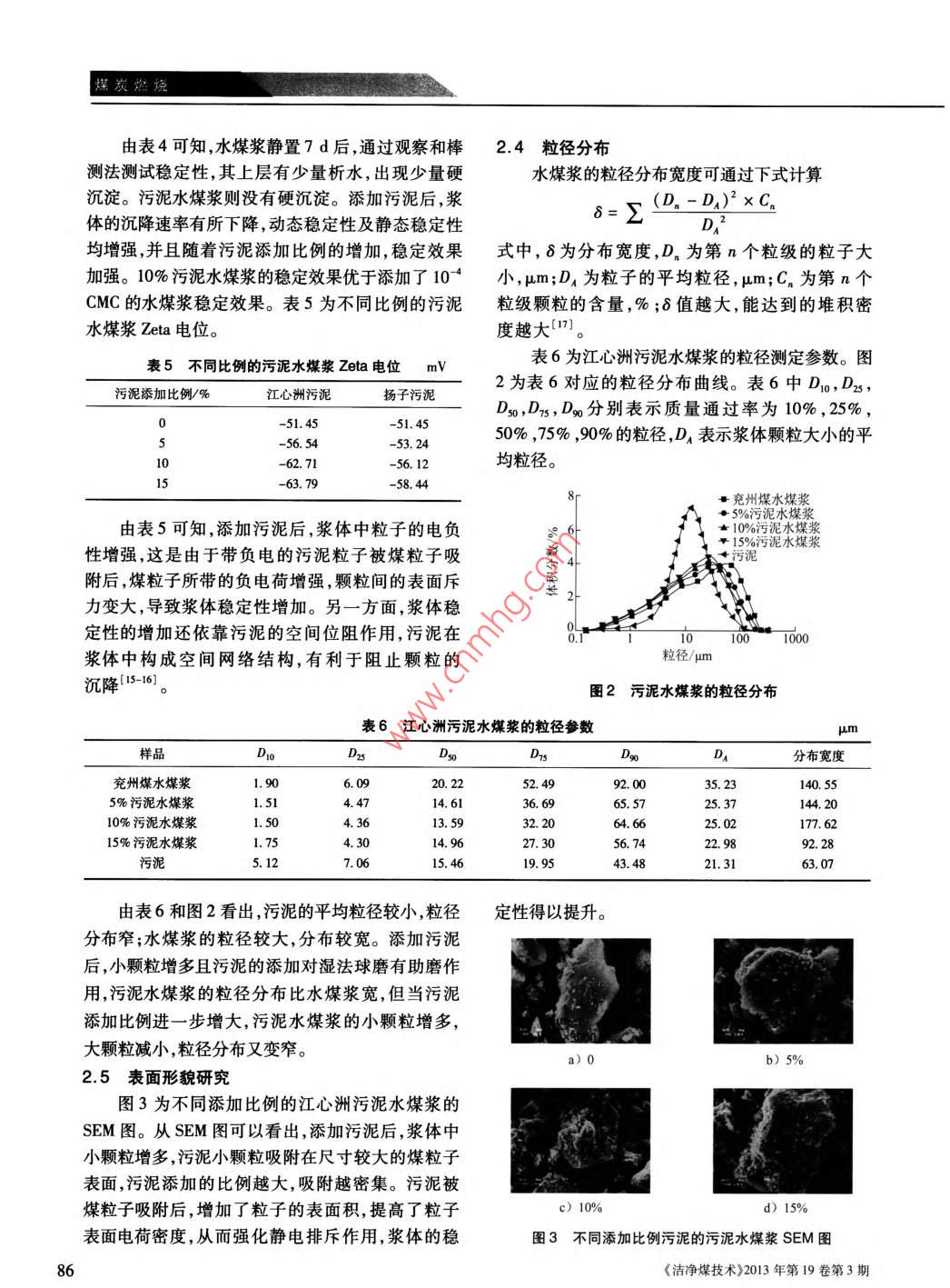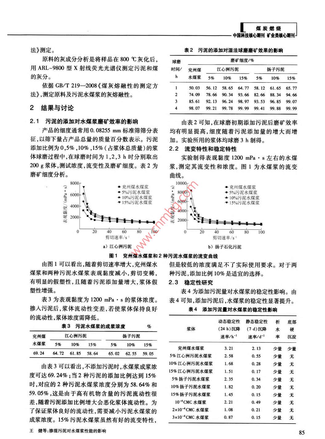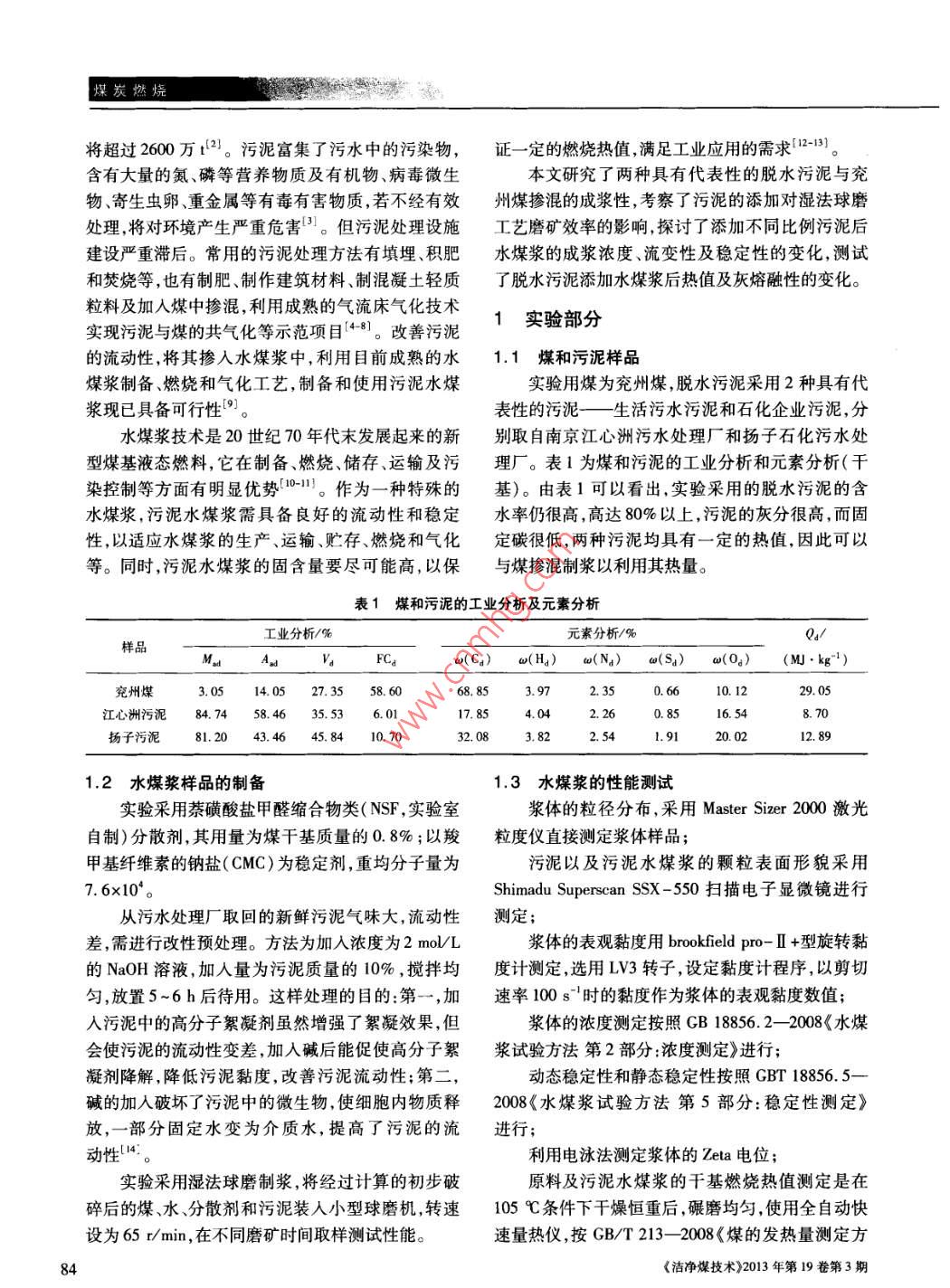 煤炭燃燒中國科技核心期刊礦業(yè)類核心期刊摻混污泥對(duì)水煤漿性能的影響王健,何其慧,許仁富,胡柏星(南京大學(xué)化學(xué)化工學(xué)院,江蘇南京210093)摘要:將兩種高含水率的脫水污泥與兗州煤摻混,采用濕法球磨工藝制備污泥水煤漿??疾煳勰嗟奶砑訉?duì)磨礦效率的影響,研究不同比例污泥摻混水煤漿后,漿體的成漿性、燃燒熱值及灰熔融性變化,并通過粒徑分布、表面形貌、灰成分等分析了原因。結(jié)果表明:水煤漿摻混污泥濕法球磨時(shí),能提高磨礦效率;污泥水煤漿呈現(xiàn)更強(qiáng)的假塑特性,污泥的添加可以提高水煤漿的穩(wěn)定性;污泥水煤漿的燃燒熱能滿足燃燒需求。當(dāng)兩種污泥的添加比例為10%時(shí),水煤漿的成漿濃度達(dá)到60%以上,且各性能均滿足工業(yè)要求關(guān)鍵詞:脫水污泥;水煤漿;磨礦效率;成漿性;燃燒特性中圖分類號(hào):TD849;TQ536文獻(xiàn)標(biāo)識(shí)碼:A文章編號(hào):1006-6772(2013)03-0083-06Effect of sewage sludge addition on coal water slurry propertiesWANG Jian, HE Qihui, XU Renfu, HU BaixingSchool of Chemistry and Chemical Engineering, Nanjing University, Nanying 210093, ChinaAbstract: Blend two kinds of high-moisture dewatered sludge with Yanzhou coal to prepare coal-sludge slurry bywet milling process. Investigate the influence of sludge addition on wet milling grinding efficiency. By changingadditive amount of sludge, analyse the slurryability, combustion enthalpy and ash fusion temperatures of preparedcoal water slurry. Analyse the reasons from the aspects of particle size distribution, surface morphology and ash com-position etcetera. The results show that, the addition of dewatered sludge can improve the grinding efficiency andstability of coal-sludge slurry in the wet milling process. The coal-sludge slurry present better pseudoplasticcharacteristic. The combustion enthalpy of sludge coal-water slurry value is slightly lower than that of coal-waterslurry, but still meet the requirement of combustion. The suitable sludge blending ratio is 10 percent, when the slurryconcentration of coal-sludge slurry can reach up to 60 percent, and all properties can meet industrial requirementsKey words: dewatered sludge; coal water slurry; grinding efficiency; slurry properties; combustion characteristic隨著工業(yè)化和城市化的迅速發(fā)展,由污水處理底,全國城鎮(zhèn)污水年處理量達(dá)到343億m3,脫水污廠排放的污泥量日益增多。據(jù)《中國污泥處理處泥年產(chǎn)生量接近2200萬t,其中有80%未得到妥善置市場(chǎng)分析報(bào)告(201版)》數(shù)據(jù)顯示,截止2010年處理。據(jù)預(yù)測(cè),到2015年末中國脫水污泥年產(chǎn)量收稿日期:2013-05-06責(zé)任編輯:宮在芹作者簡(jiǎn)介:王健(1989—),男,安徽安慶人,在讀碩士硏究生,主要從事潔凈能源方面的工作。通訊作者:胡柏星教授,從事煤炭、石油等潔凈能源方面的研究。Emil:hubx@nu. edu cn。引用格式:王健何其慧許仁富等擲彩污泥對(duì)水煤漿性能的影響[J潔凈煤技術(shù),2013,9(3):83-88王健等:摻混污泥對(duì)水煤漿性能的影響3將超過2600萬t2。污泥富集了污水中的污染物,證一定的燃燒熱值,滿足工業(yè)應(yīng)用的需求2含有大量的氮、磷等營養(yǎng)物質(zhì)及有機(jī)物、病毒微生本文研究了兩種具有代表性的脫水污泥與兗物、寄生蟲卵、重金屬等有毒有害物質(zhì),若不經(jīng)有效州煤摻混的成漿性,考察了污泥的添加對(duì)濕法球磨處理,將對(duì)環(huán)境產(chǎn)生嚴(yán)重危害。但污泥處理設(shè)施工藝磨礦效率的影響探討了添加不同比例污泥后建設(shè)嚴(yán)重滯后。常用的污泥處理方法有填埋、積肥水煤漿的成漿濃度、流變性及穩(wěn)定性的變化,測(cè)試和焚燒等,也有制肥、制作建筑材料、制混凝土輕質(zhì)了脫水污泥添加水煤漿后熱值及灰熔融性的變化。粒料及加入煤中摻混,利用成熟的氣流床氣化技術(shù)實(shí)現(xiàn)污泥與煤的共氣化等示范項(xiàng)目481。改善污泥1實(shí)驗(yàn)部分的流動(dòng)性,將其摻入水煤漿中,利用目前成熟的水1.1煤和污泥樣品煤漿制備、燃燒和氣化工藝,制備和使用污泥水煤實(shí)驗(yàn)用煤為兗州煤,脫水污泥采用2種具有代漿現(xiàn)已具備可行性9。表性的污泥——生活污水污泥和石化企業(yè)污泥,分水煤漿技術(shù)是20世紀(jì)70年代末發(fā)展起來的新別取自南京江心洲污水處理廠和揚(yáng)子石化污水處型煤基液態(tài)燃料,它在制備、燃燒、儲(chǔ)存、運(yùn)輸及污理廠。表1為煤和污泥的工業(yè)分析和元素分析(干染控制等方面有明顯優(yōu)勢(shì)10作為一種特殊的基)。由表1可以看出,實(shí)驗(yàn)采用的脫水污泥的含水煤漿,污泥水煤漿需具備良好的流動(dòng)性和穩(wěn)定水率仍很高,高達(dá)80%以上,污泥的灰分很高,而固性,以適應(yīng)水煤漿的生產(chǎn)、運(yùn)輸、貯存、燃燒和氣化定碳很低,兩種污泥均具有一定的熱值,因此可以等。同時(shí),污泥水煤漿的固含量要盡可能高,以保與煤摻混制漿以利用其熱量。表1煤和污泥的工業(yè)分析及元素分析工業(yè)分析/%元素分析%Qd/樣品H4)Na))a(0)(M·kg-1)兗州煤3.27.3558.6068.852.350.666610.12江心洲污泥84.58.4635.536.016.54揚(yáng)子污泥81.2043.4645.8410.701.9120.0212.891.2水煤漿樣品的制備1.3水煤漿的性能測(cè)試實(shí)驗(yàn)釆用萘磺酸鹽甲醛縮合物類(NSF,實(shí)驗(yàn)室漿體的粒徑分布,采用 Master sizer2000激光自制)分散劑,其用量為煤干基